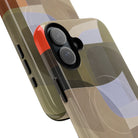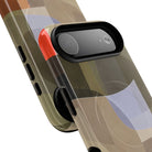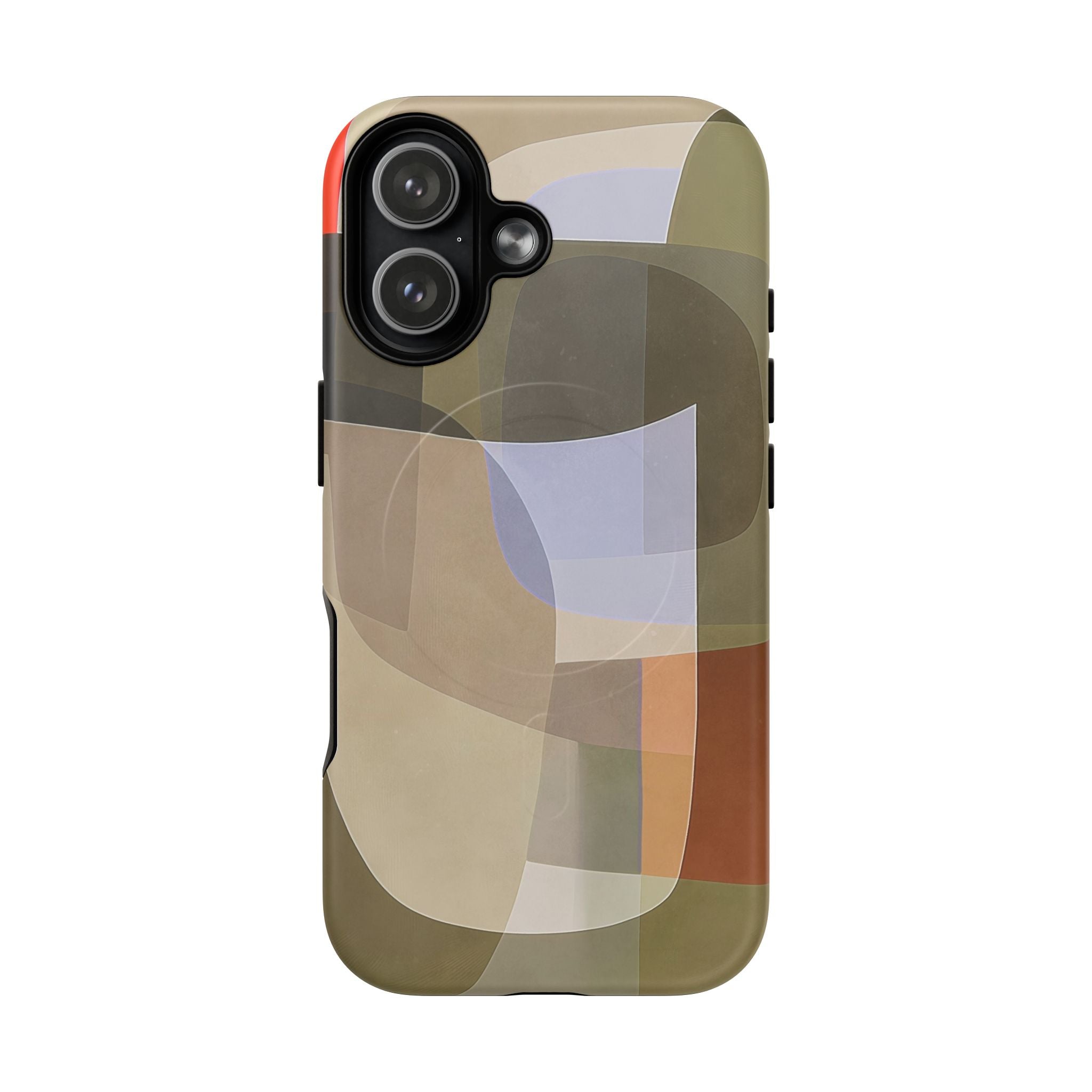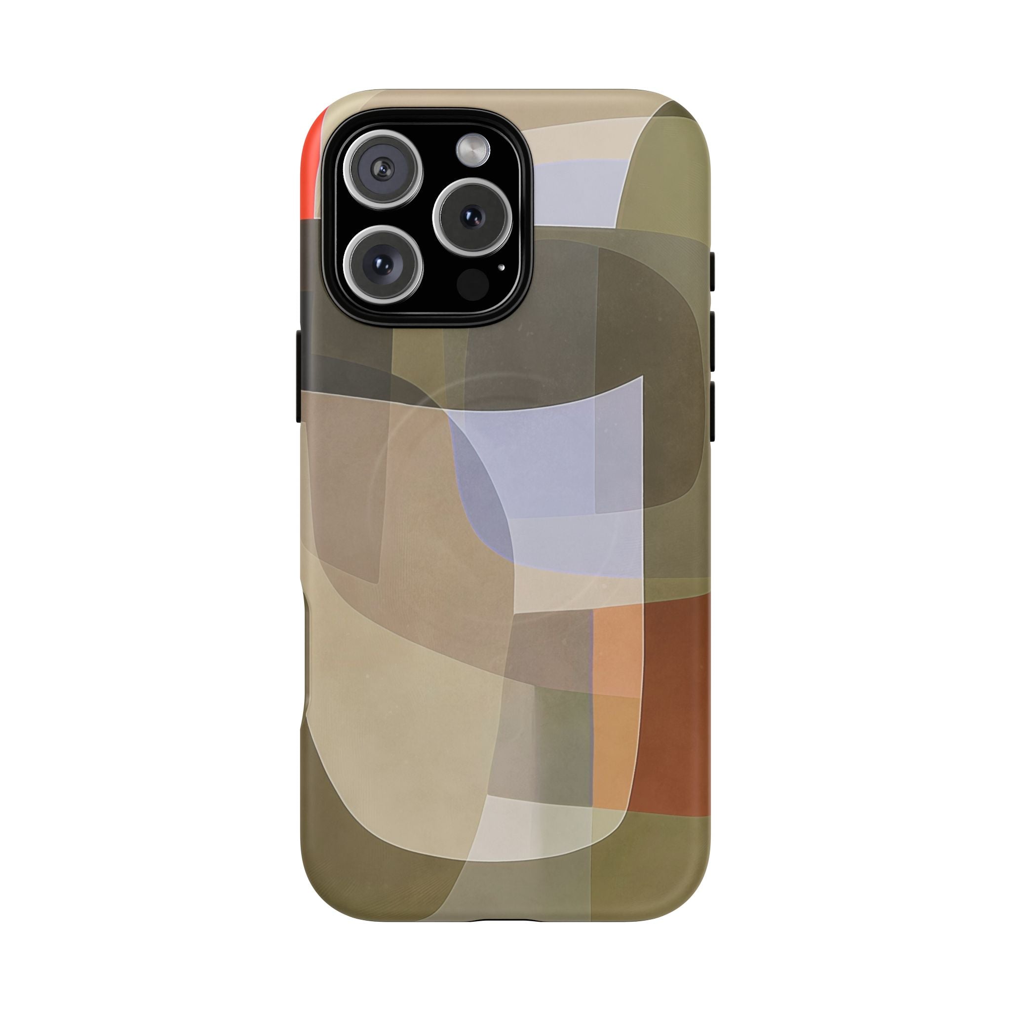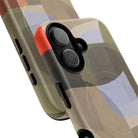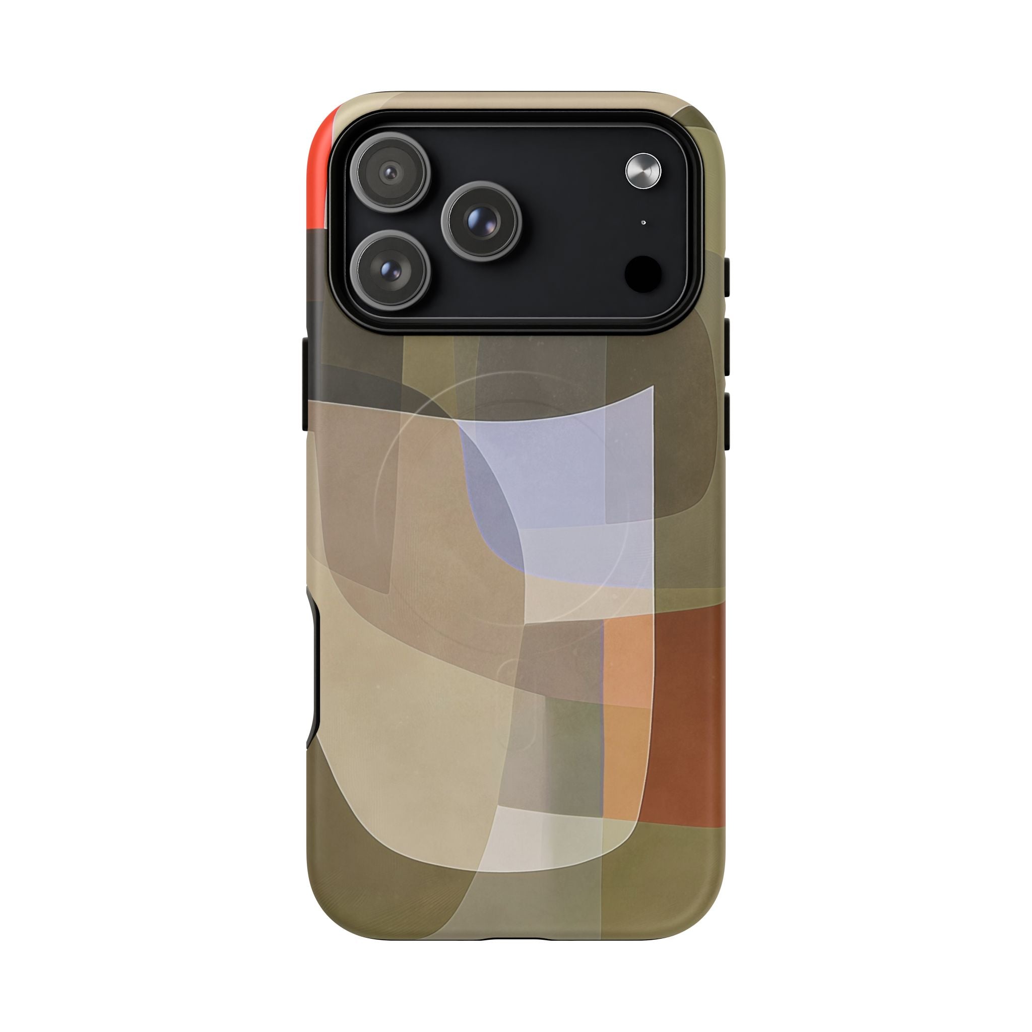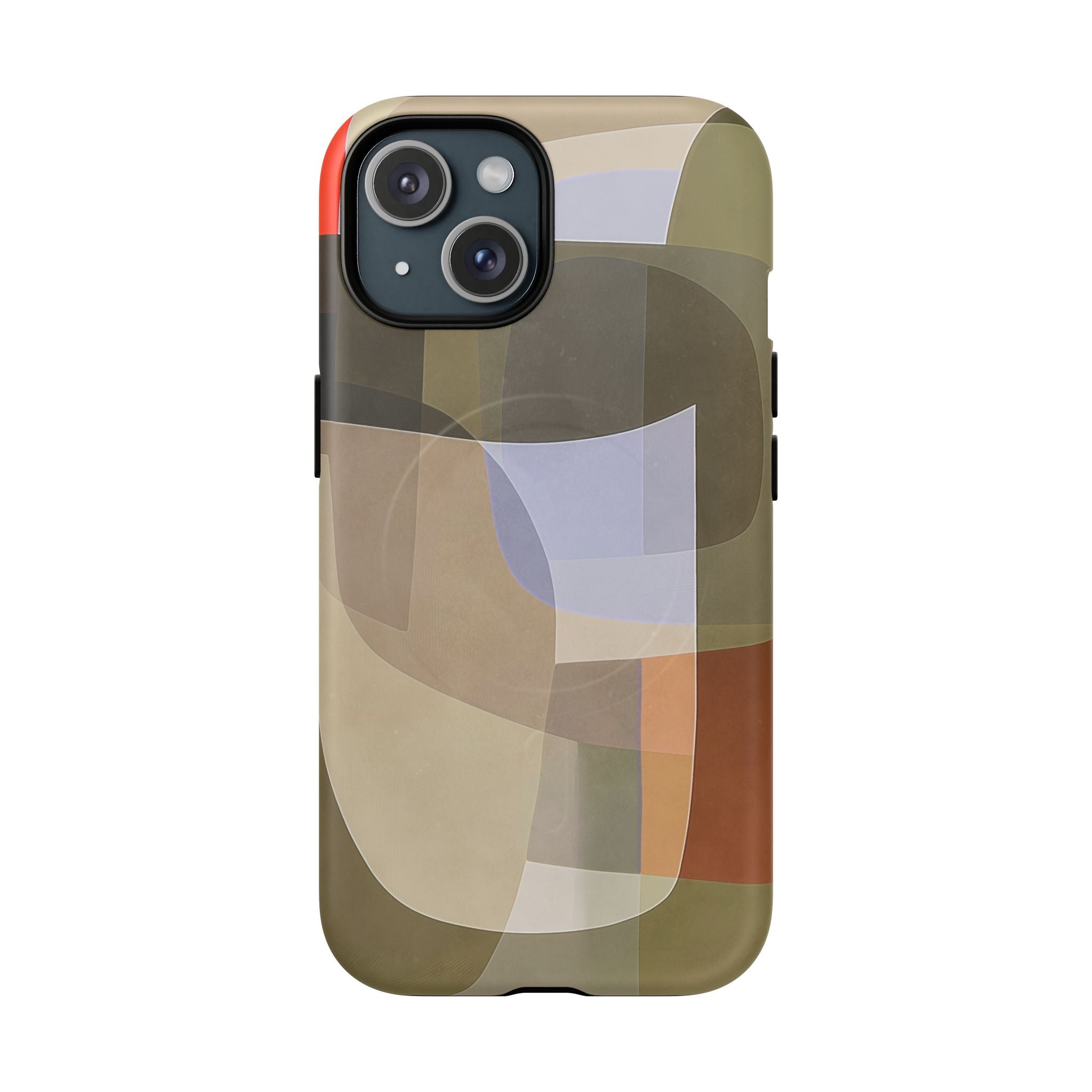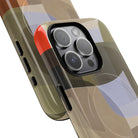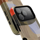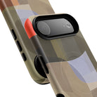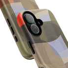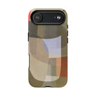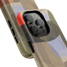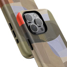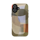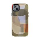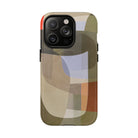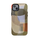 Bring modern design into your everyday carry with this abstract art iPhone case. This warm-tone geometric design uses overlapping shapes in olive green, clay, charcoal, beige, and soft lavender to create a layered, contemporary composition. The artwork feels organic and calm, with translucent colour fields that resemble soft glass reflections or gallery-grade modernist forms.