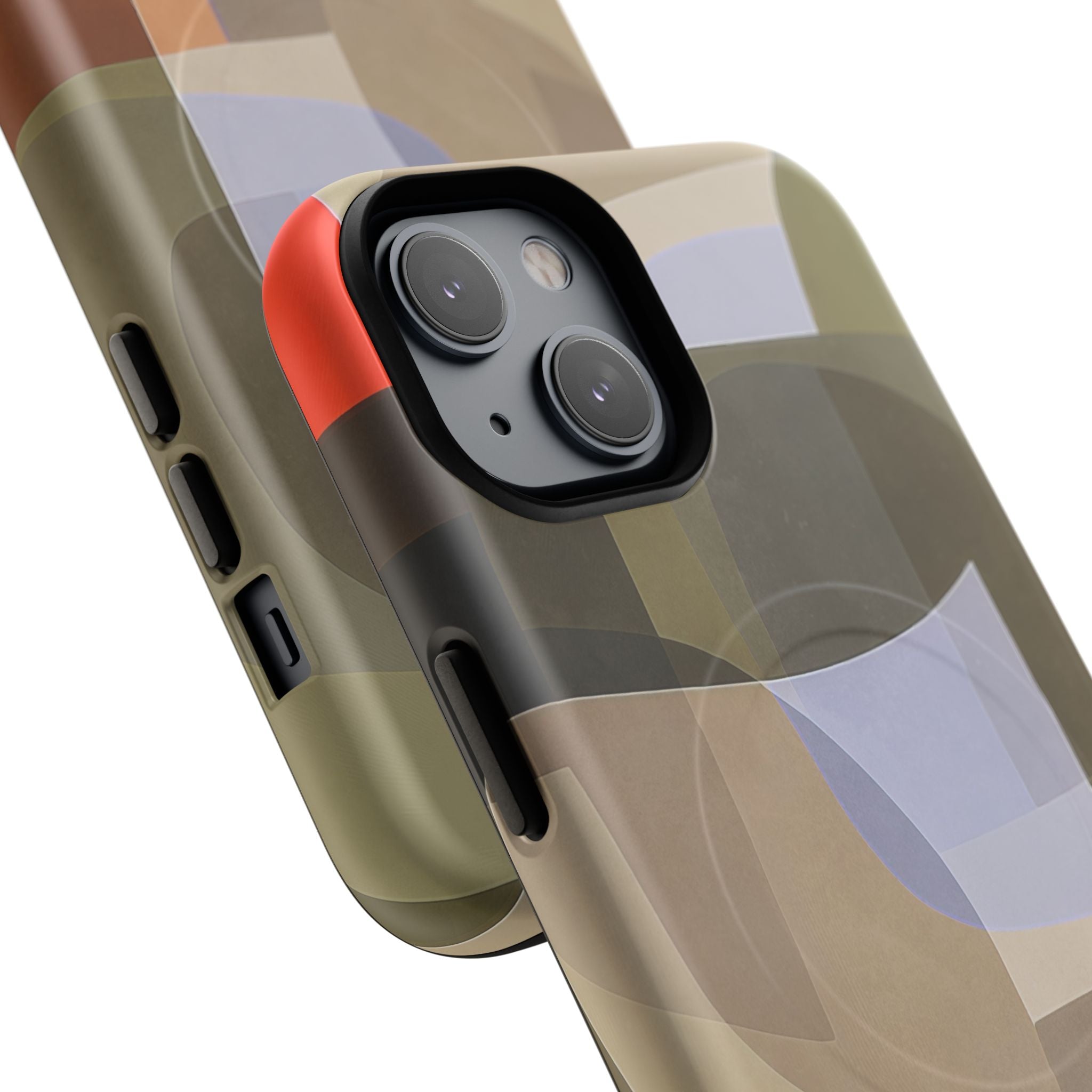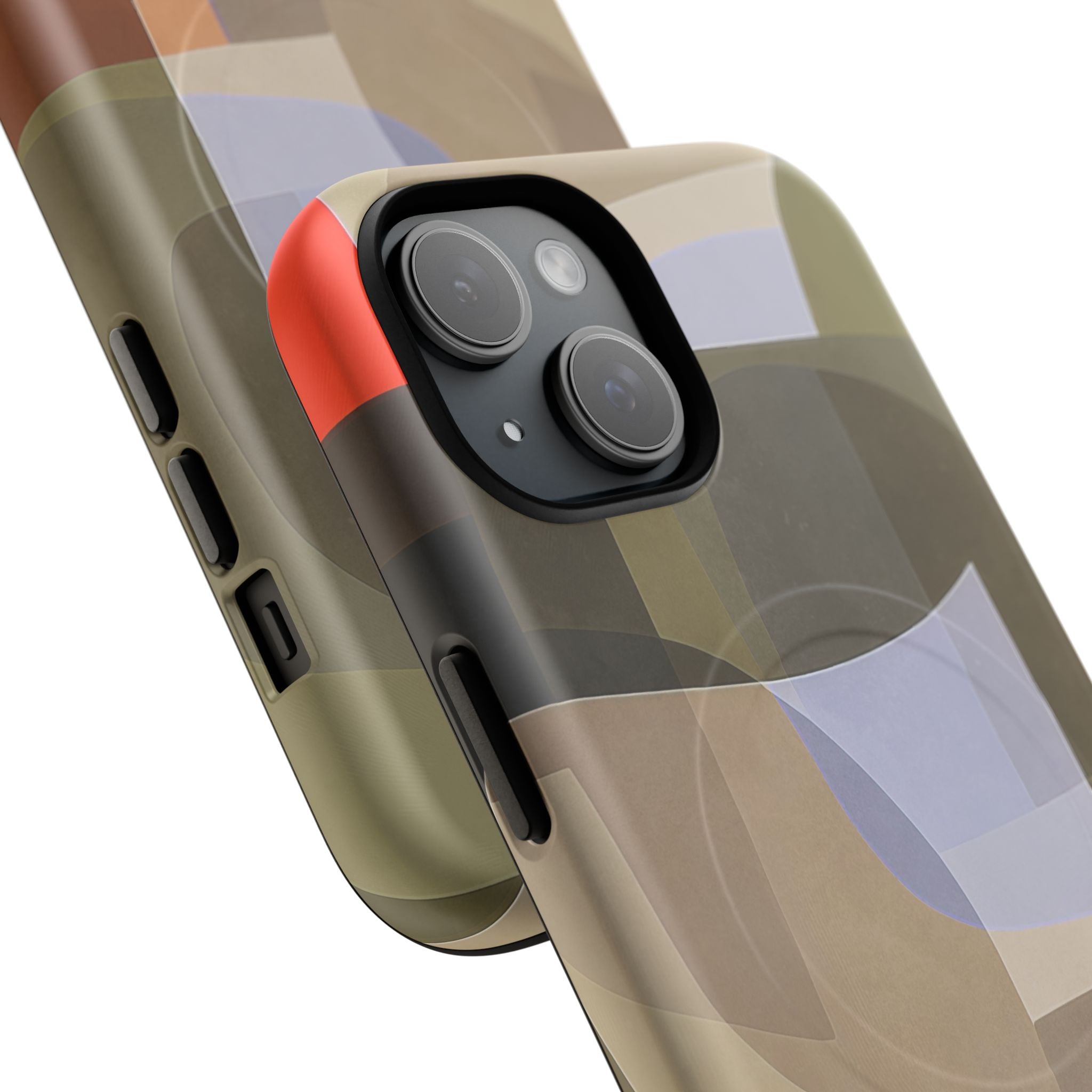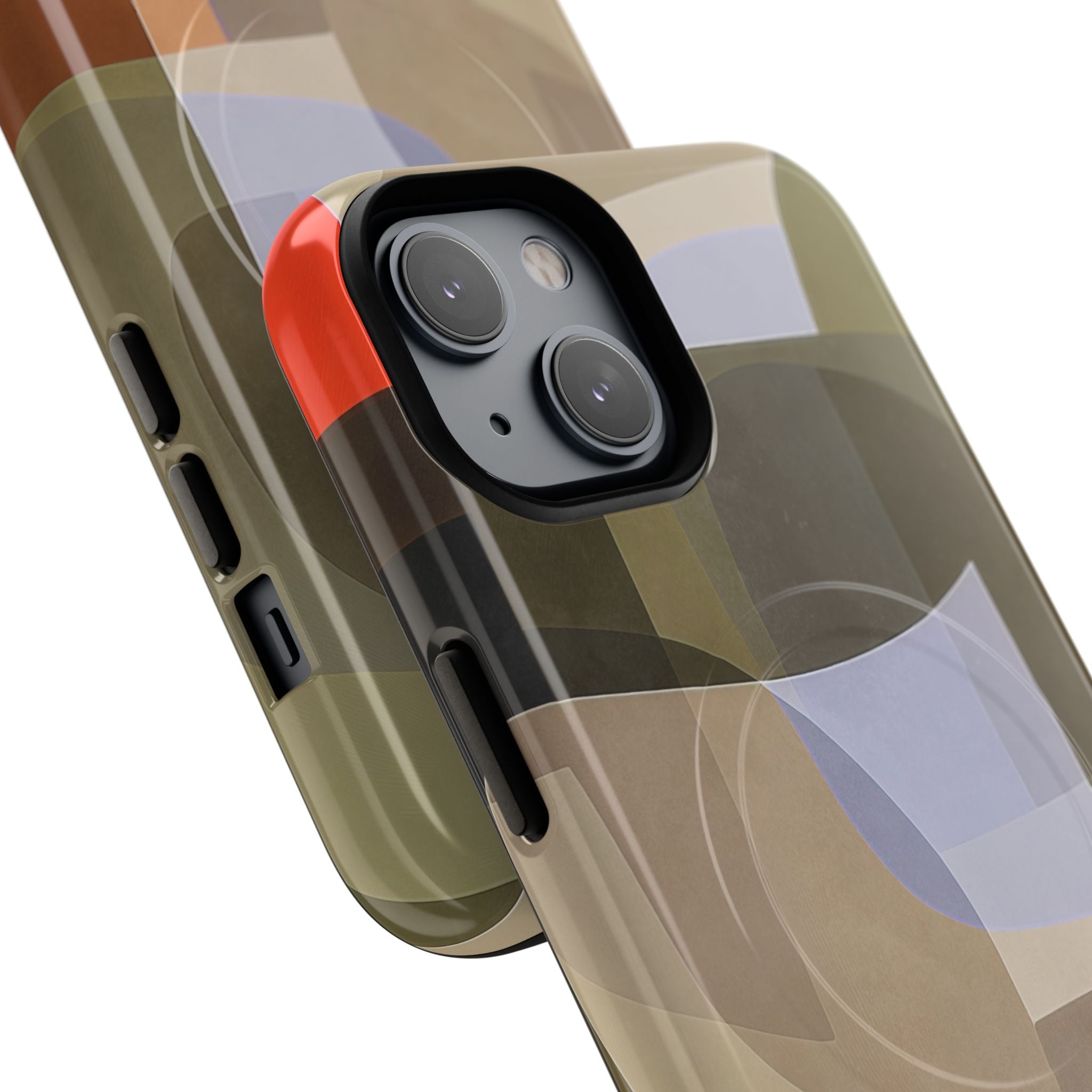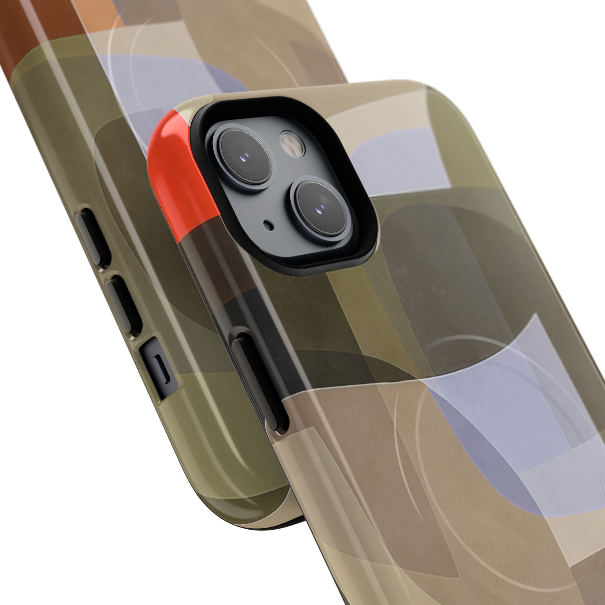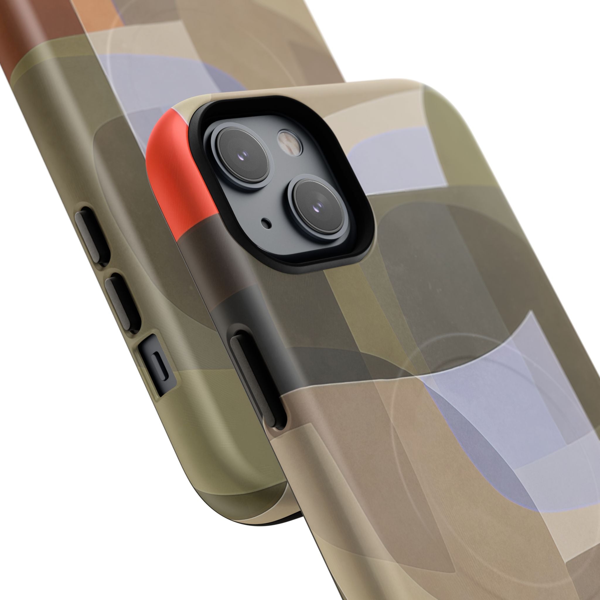 Bring modern design into your everyday carry with this abstract art iPhone case. This warm-tone geometric design uses overlapping shapes in olive green, clay, charcoal, beige, and soft lavender to create a layered, contemporary composition. The artwork feels organic and calm, with translucent colour fields that resemble soft glass reflections or gallery-grade modernist forms.