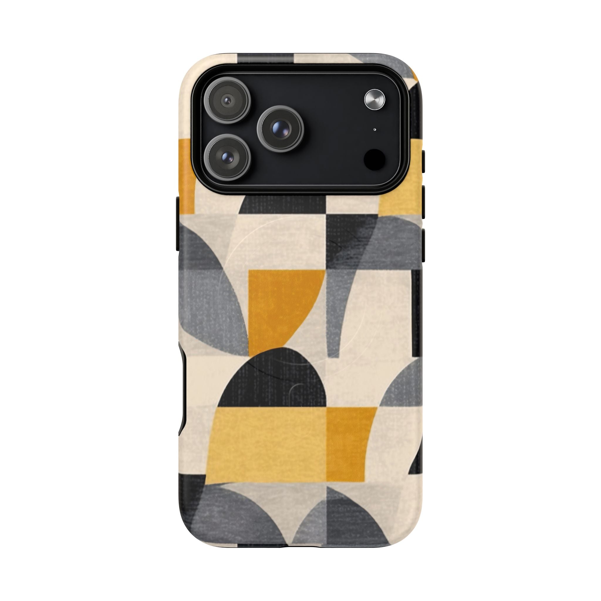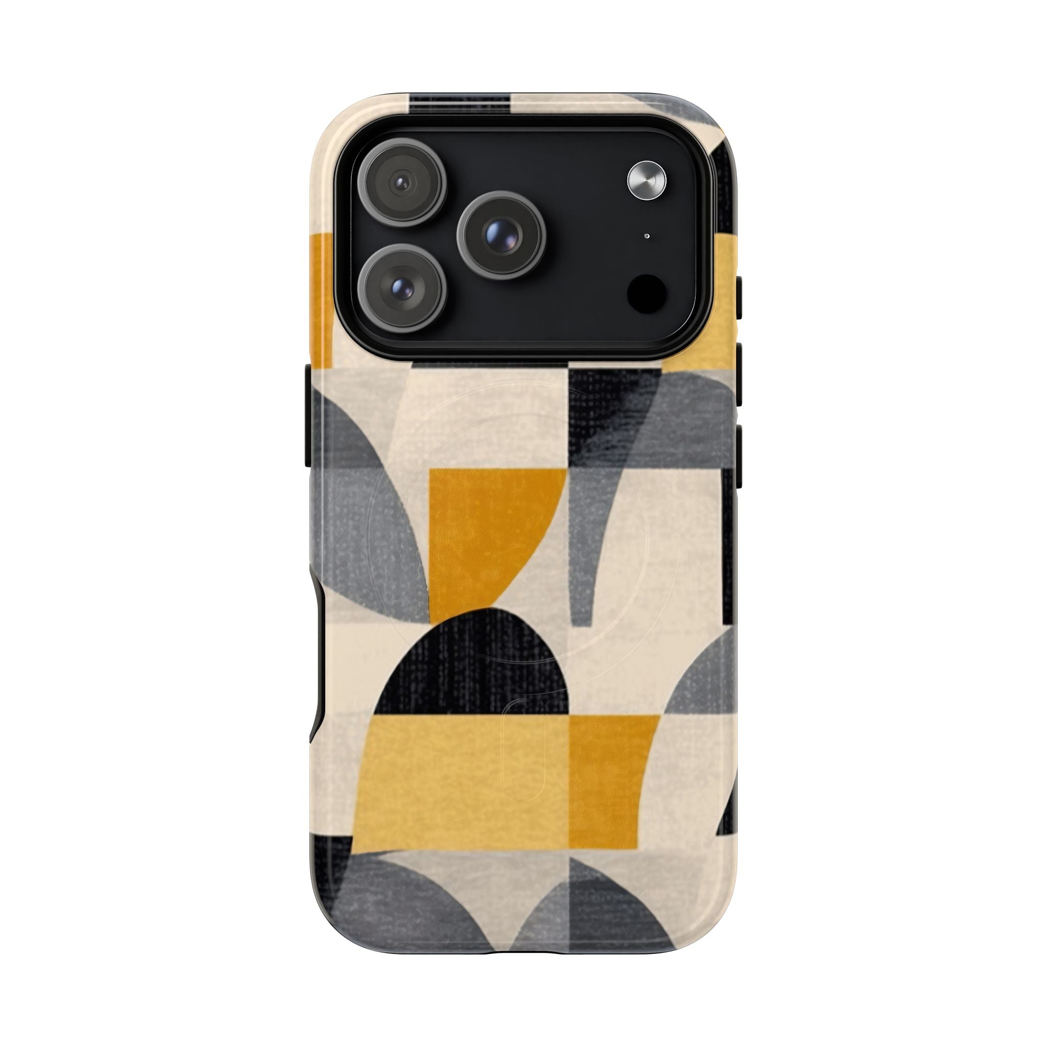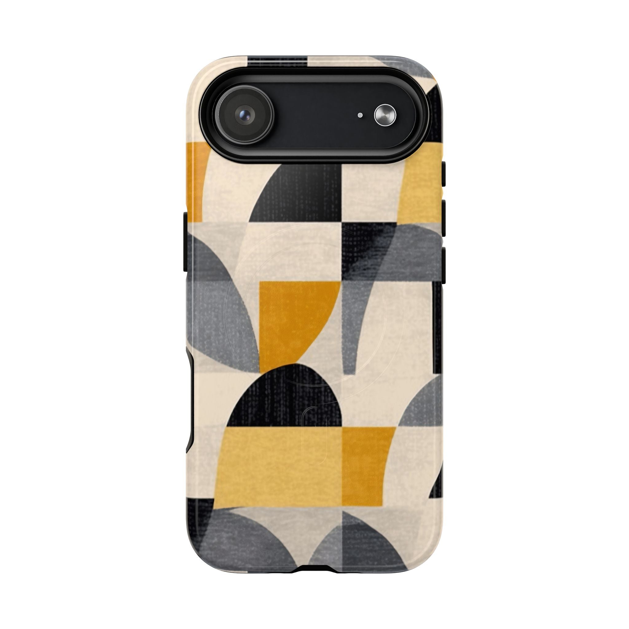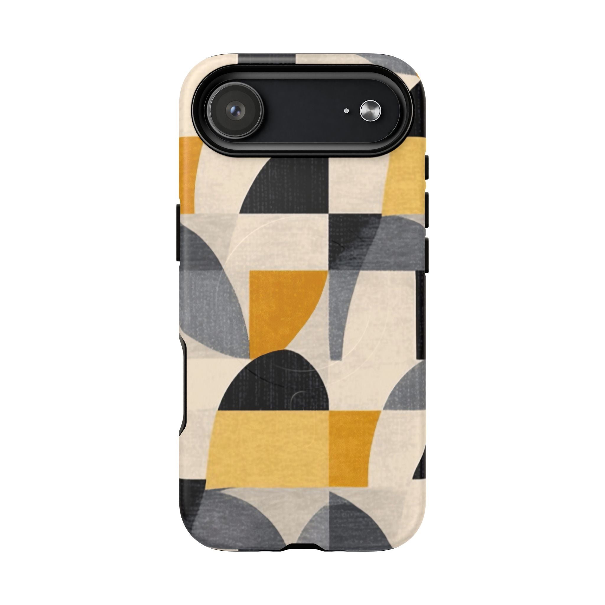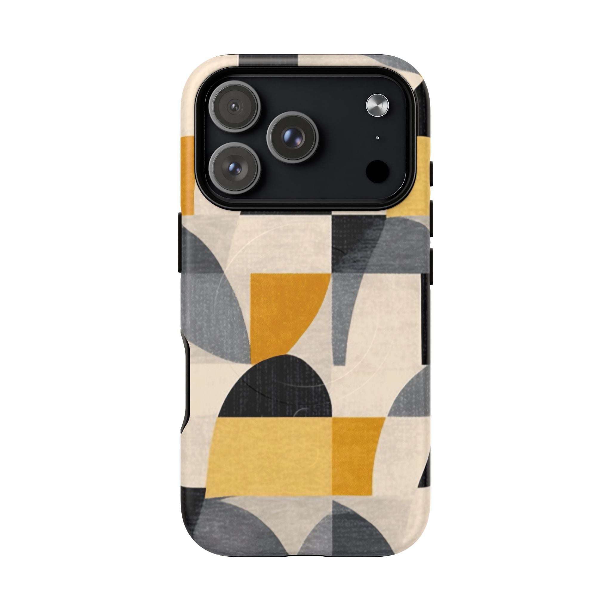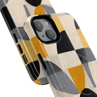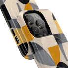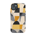 This ANTIPODE Abstract Phone Case from the Geometric Series features layered arcs, angled blocks, and curved panels in tones of ochre, charcoal, cream, and soft grey. The composition blends modernist shapes with subtle textured surfaces, creating a balanced, architectural rhythm that feels both graphic and handcrafted. The warm palette and repeated arch motifs give the design a timeless, mid-century sensibility.