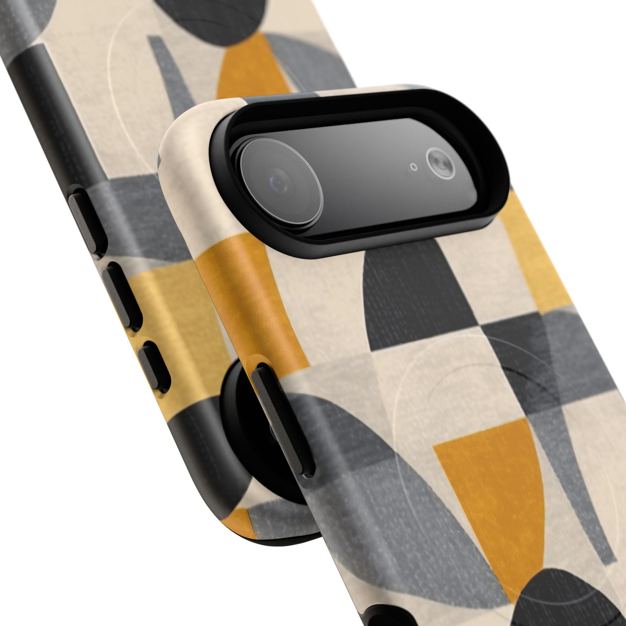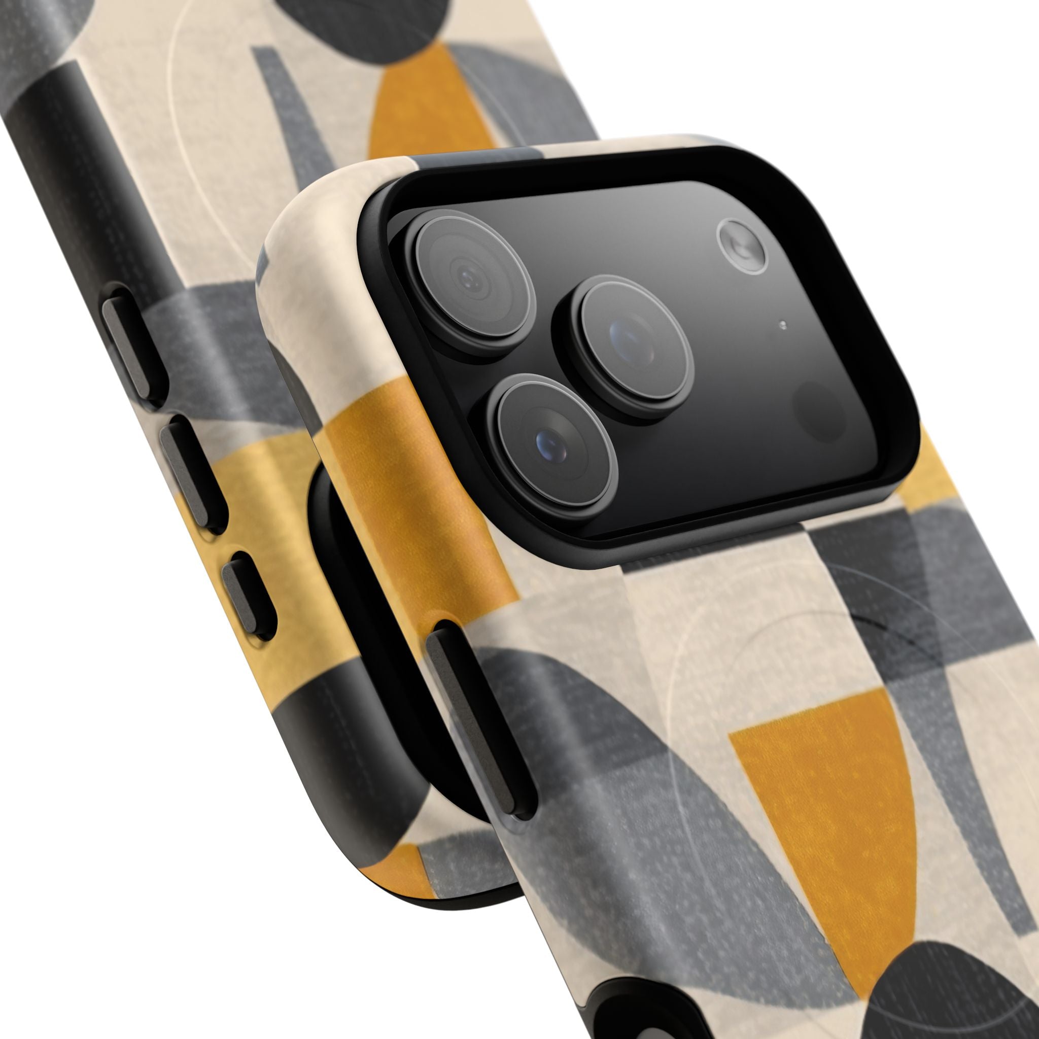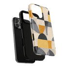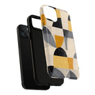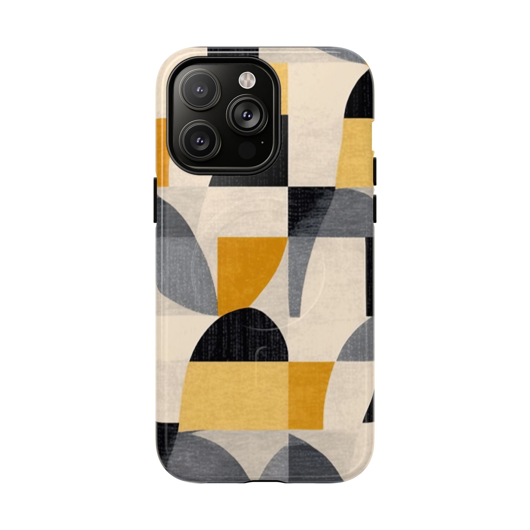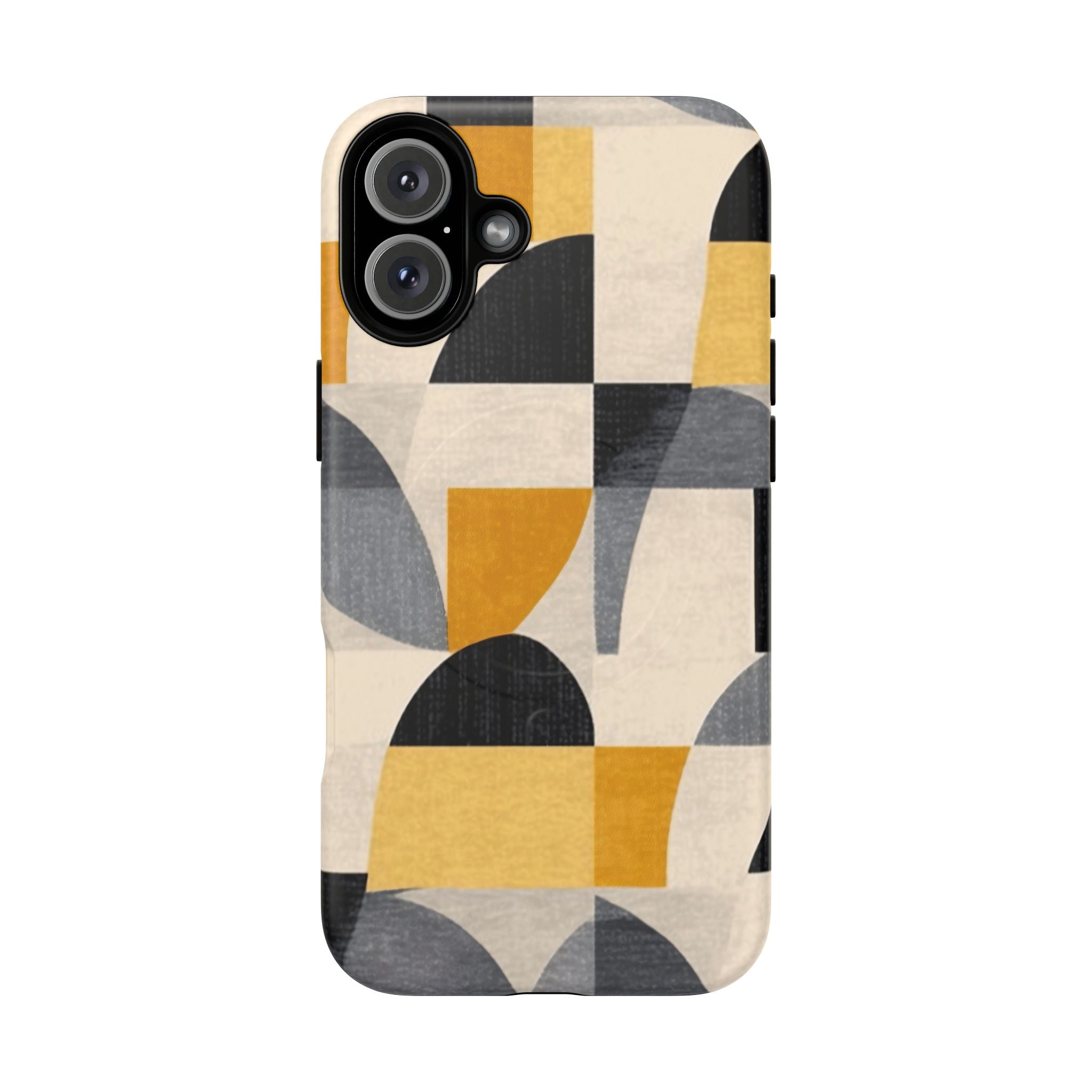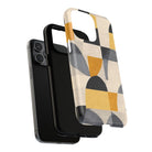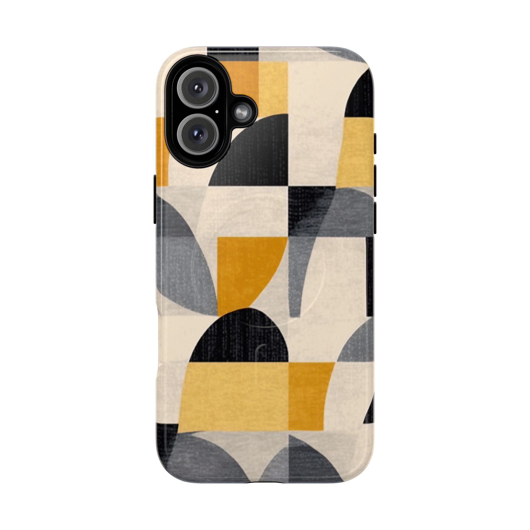 This ANTIPODE Abstract Phone Case from the Geometric Series features layered arcs, angled blocks, and curved panels in tones of ochre, charcoal, cream, and soft grey. The composition blends modernist shapes with subtle textured surfaces, creating a balanced, architectural rhythm that feels both graphic and handcrafted. The warm palette and repeated arch motifs give the design a timeless, mid-century sensibility.