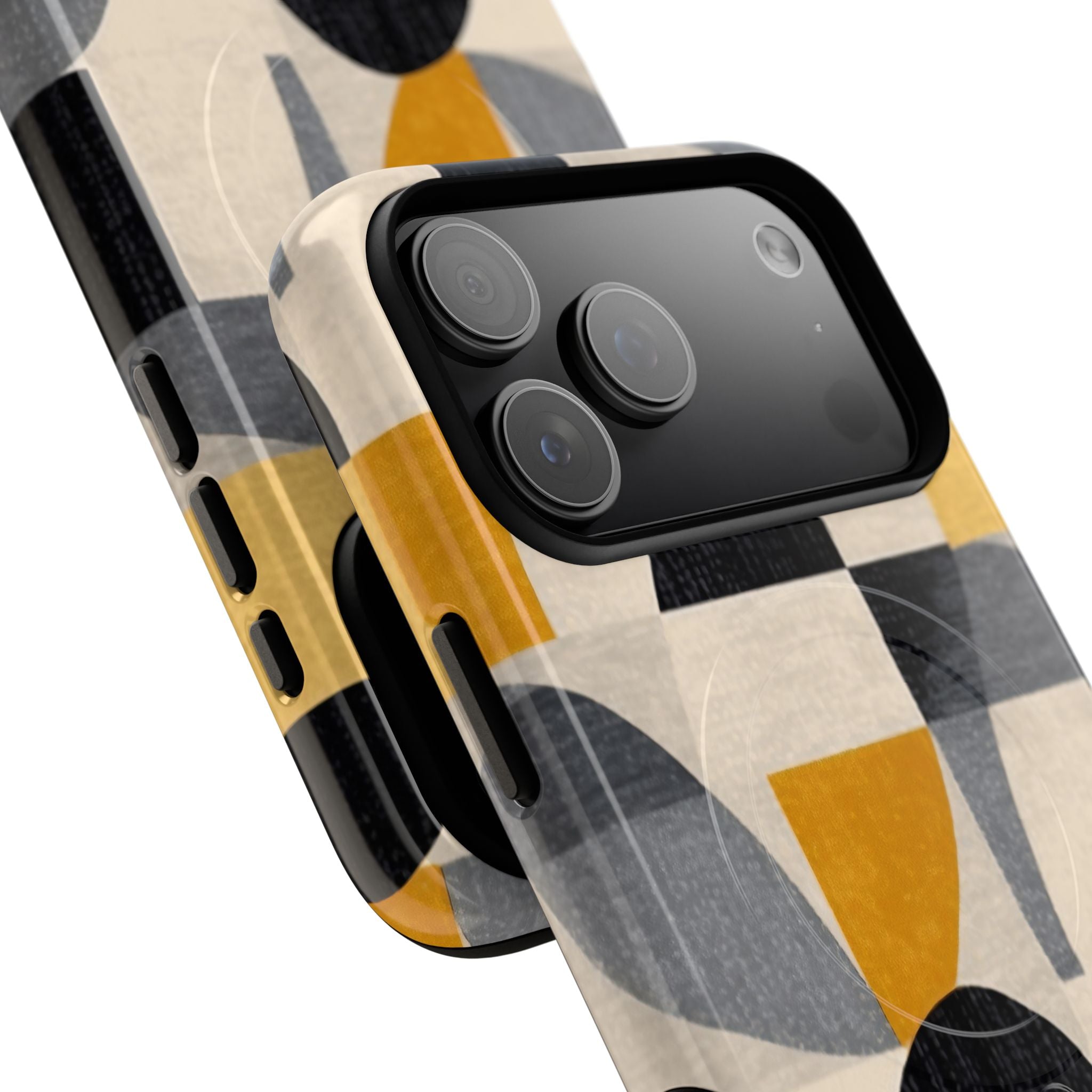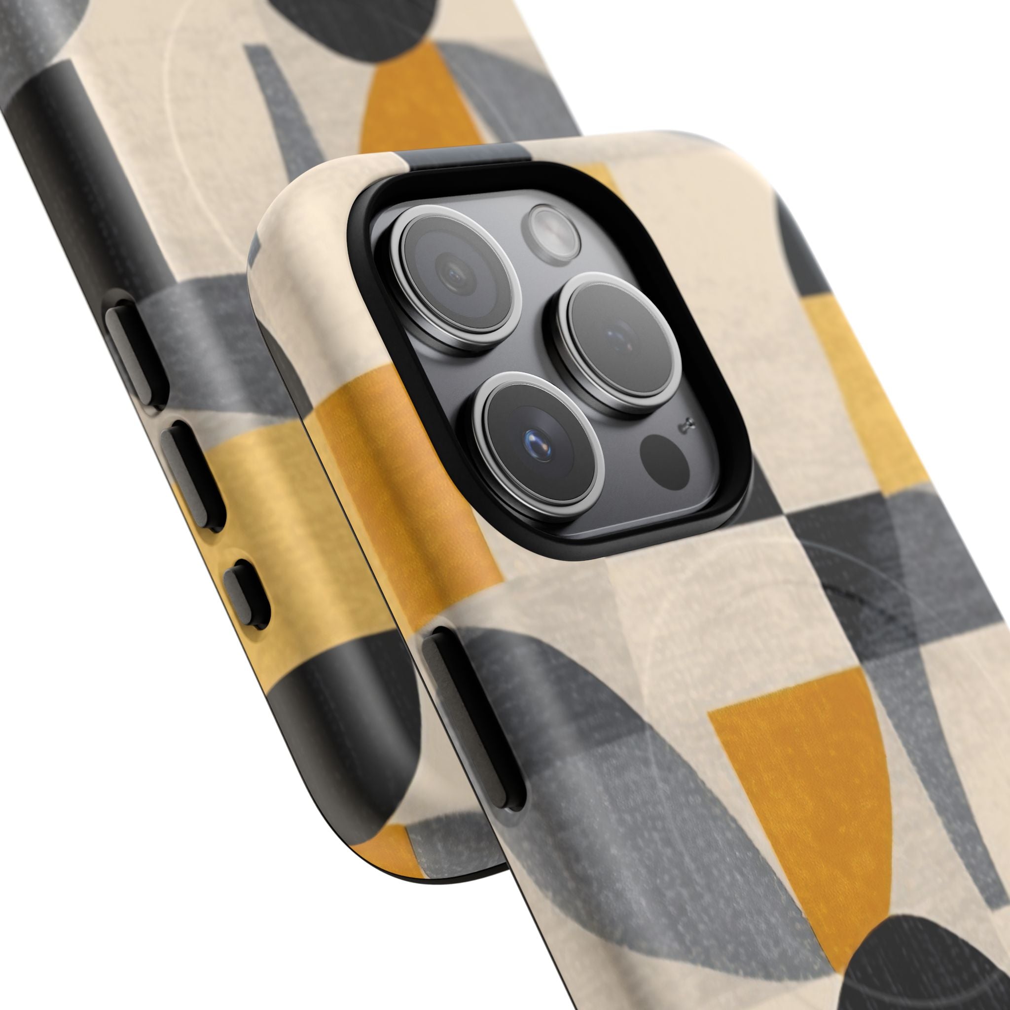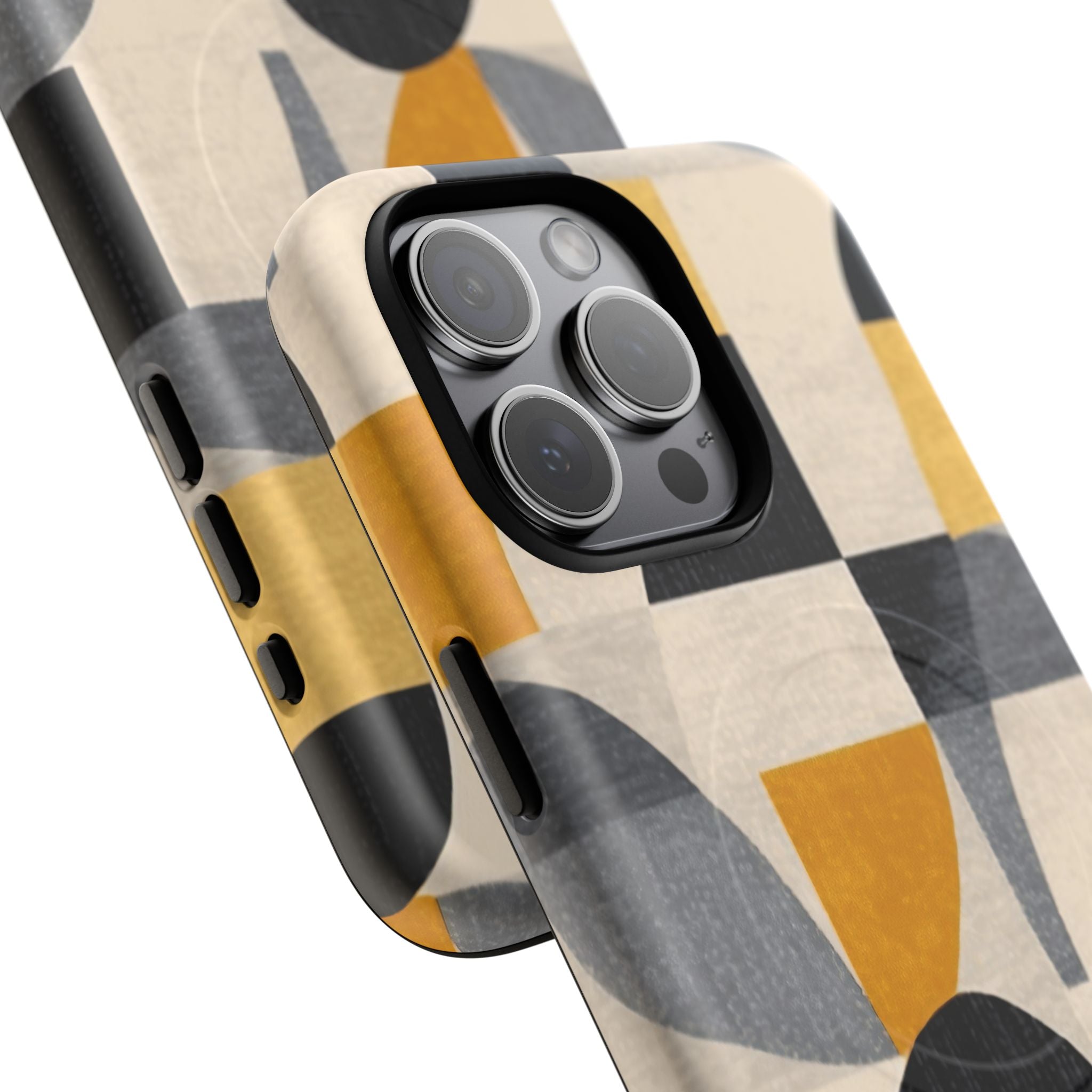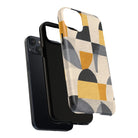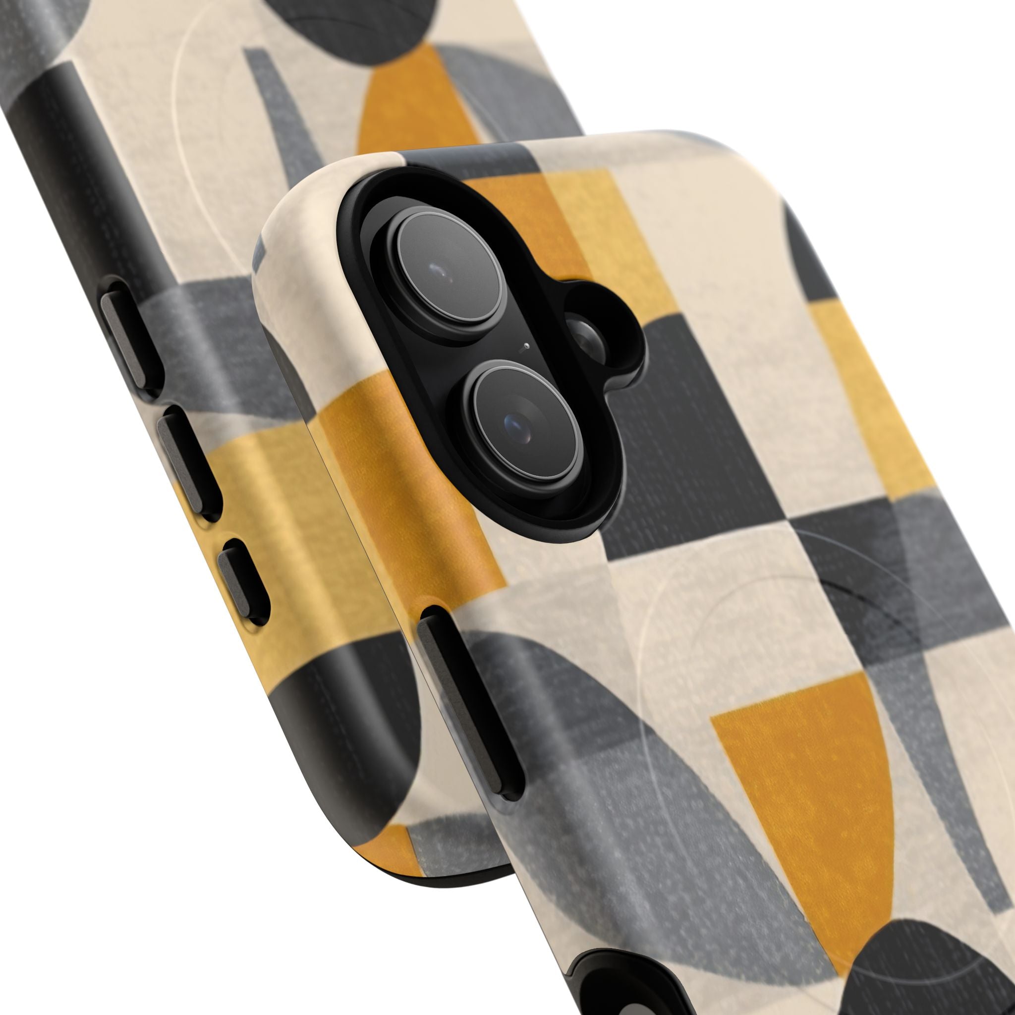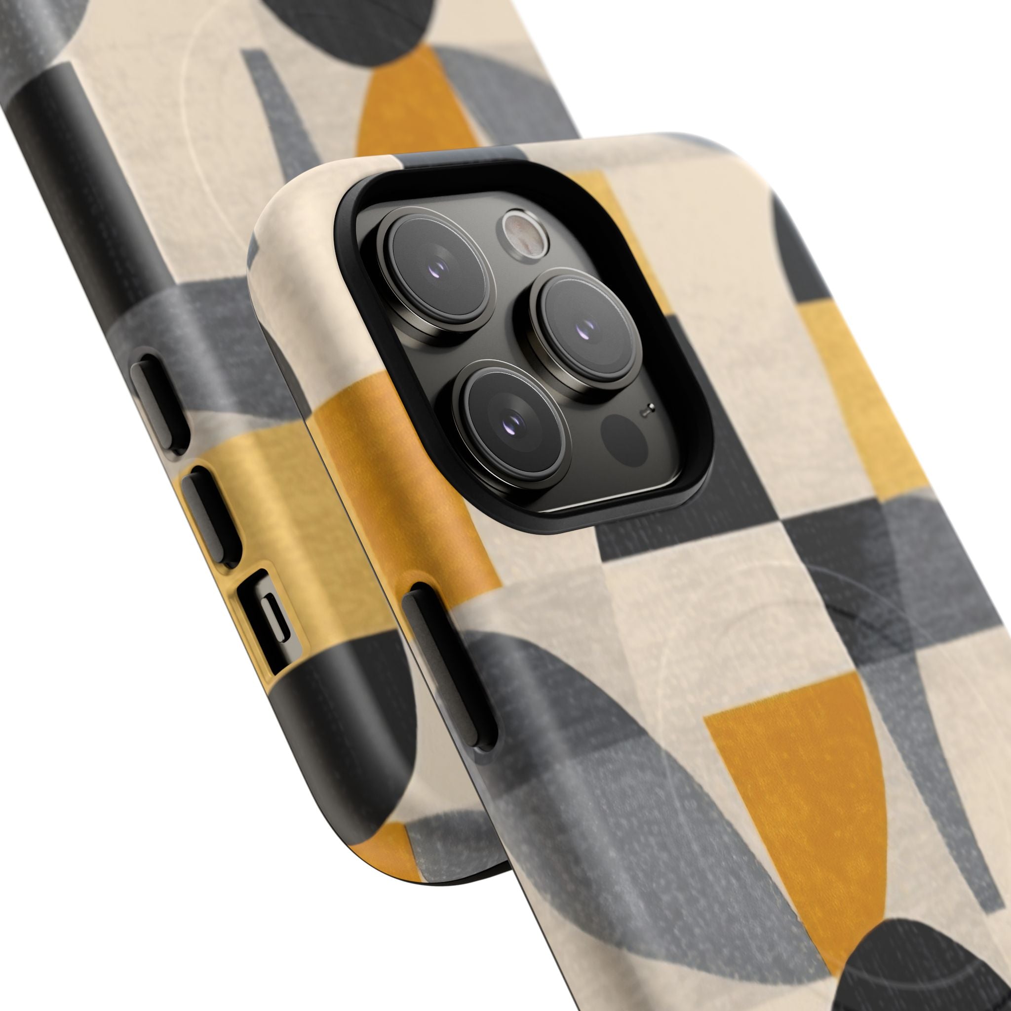 This ANTIPODE Abstract Phone Case from the Geometric Series features layered arcs, angled blocks, and curved panels in tones of ochre, charcoal, cream, and soft grey. The composition blends modernist shapes with subtle textured surfaces, creating a balanced, architectural rhythm that feels both graphic and handcrafted. The warm palette and repeated arch motifs give the design a timeless, mid-century sensibility.
