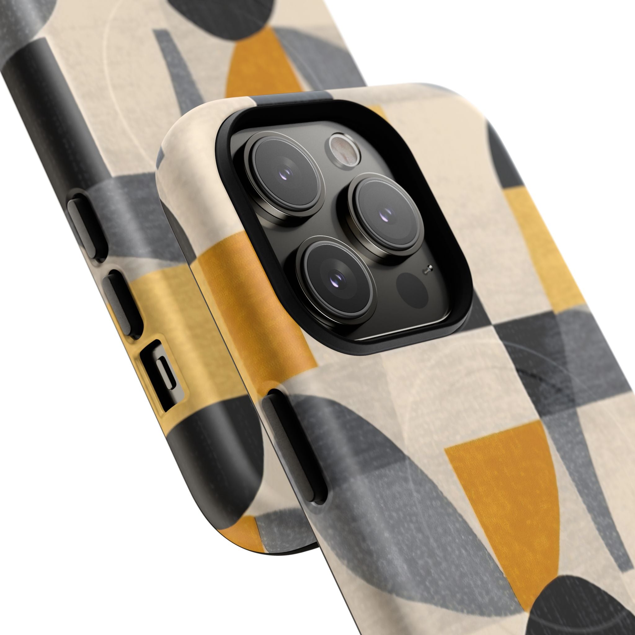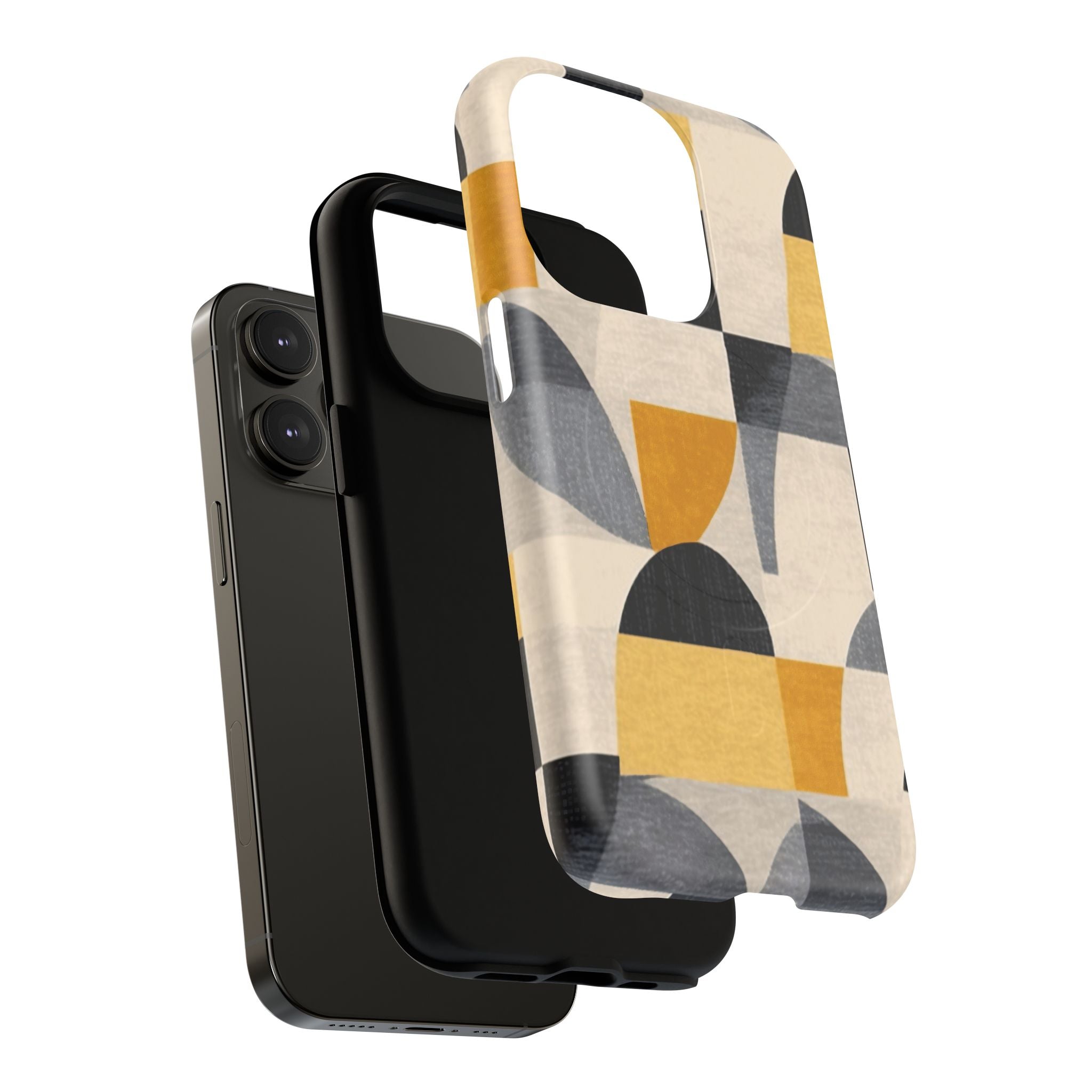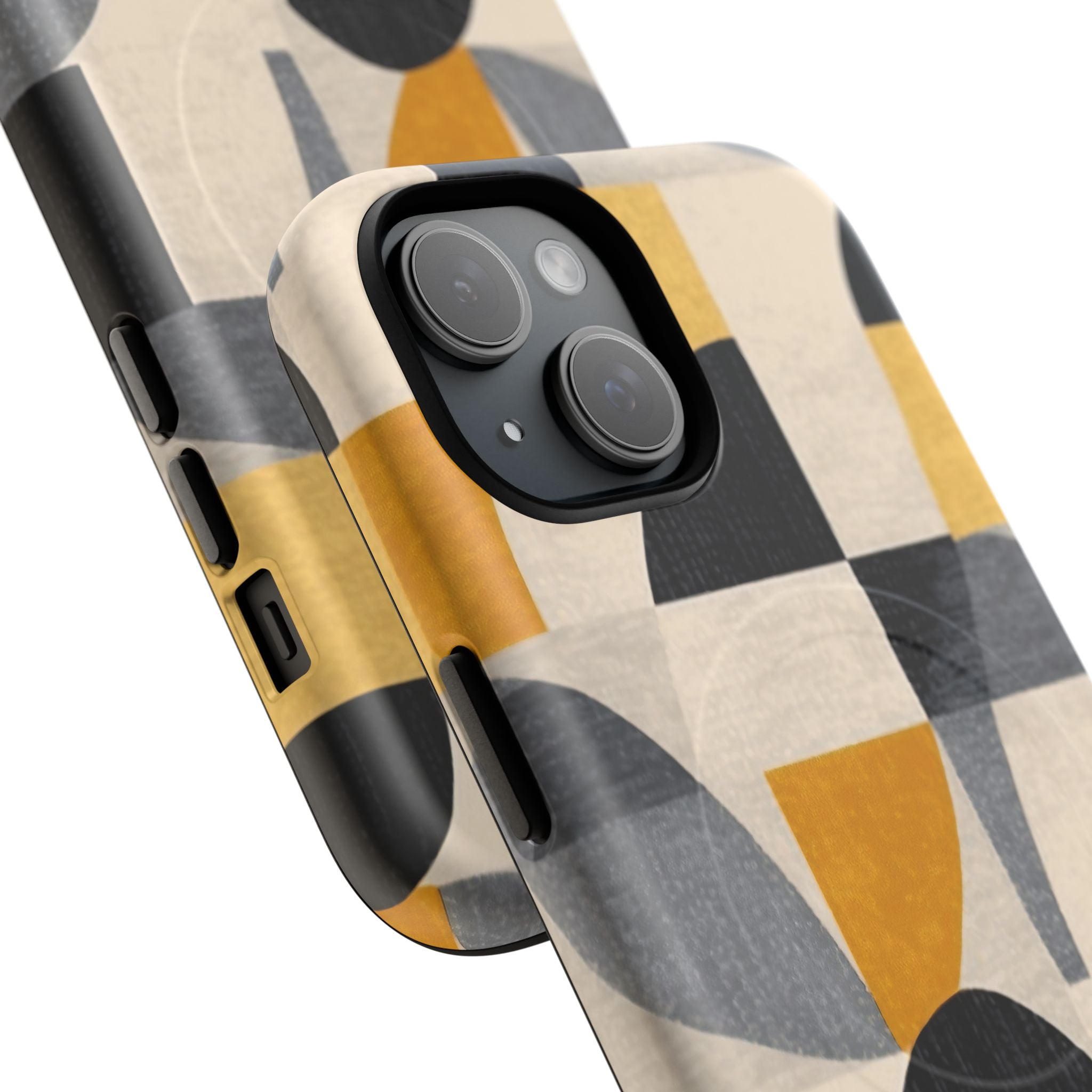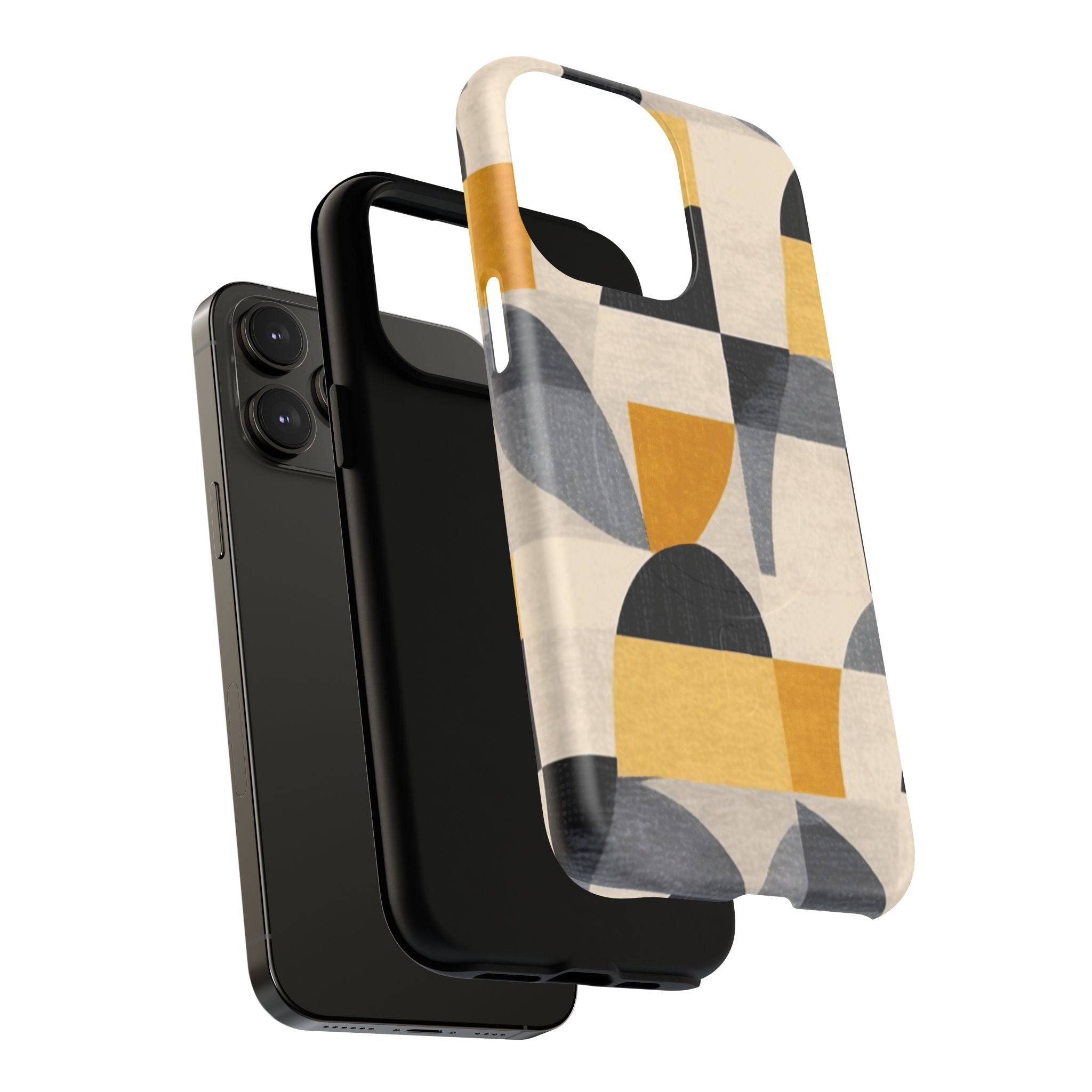 This ANTIPODE Abstract Phone Case from the Geometric Series features layered arcs, angled blocks, and curved panels in tones of ochre, charcoal, cream, and soft grey. The composition blends modernist shapes with subtle textured surfaces, creating a balanced, architectural rhythm that feels both graphic and handcrafted. The warm palette and repeated arch motifs give the design a timeless, mid-century sensibility.