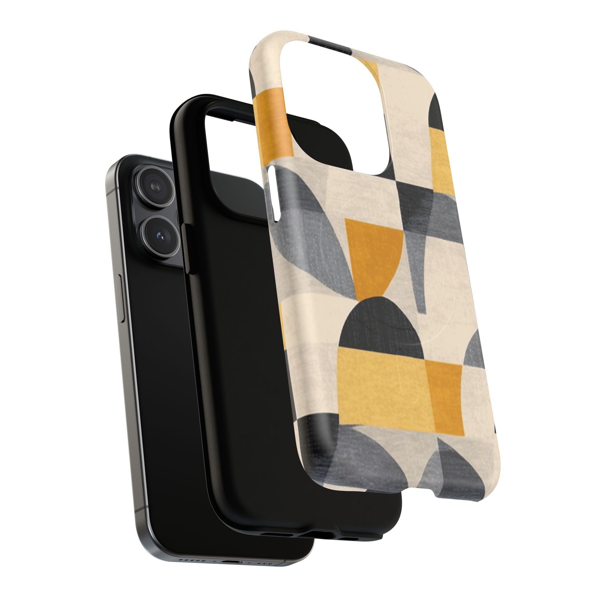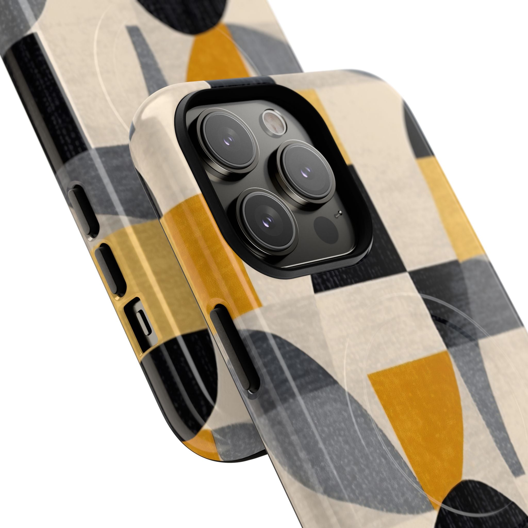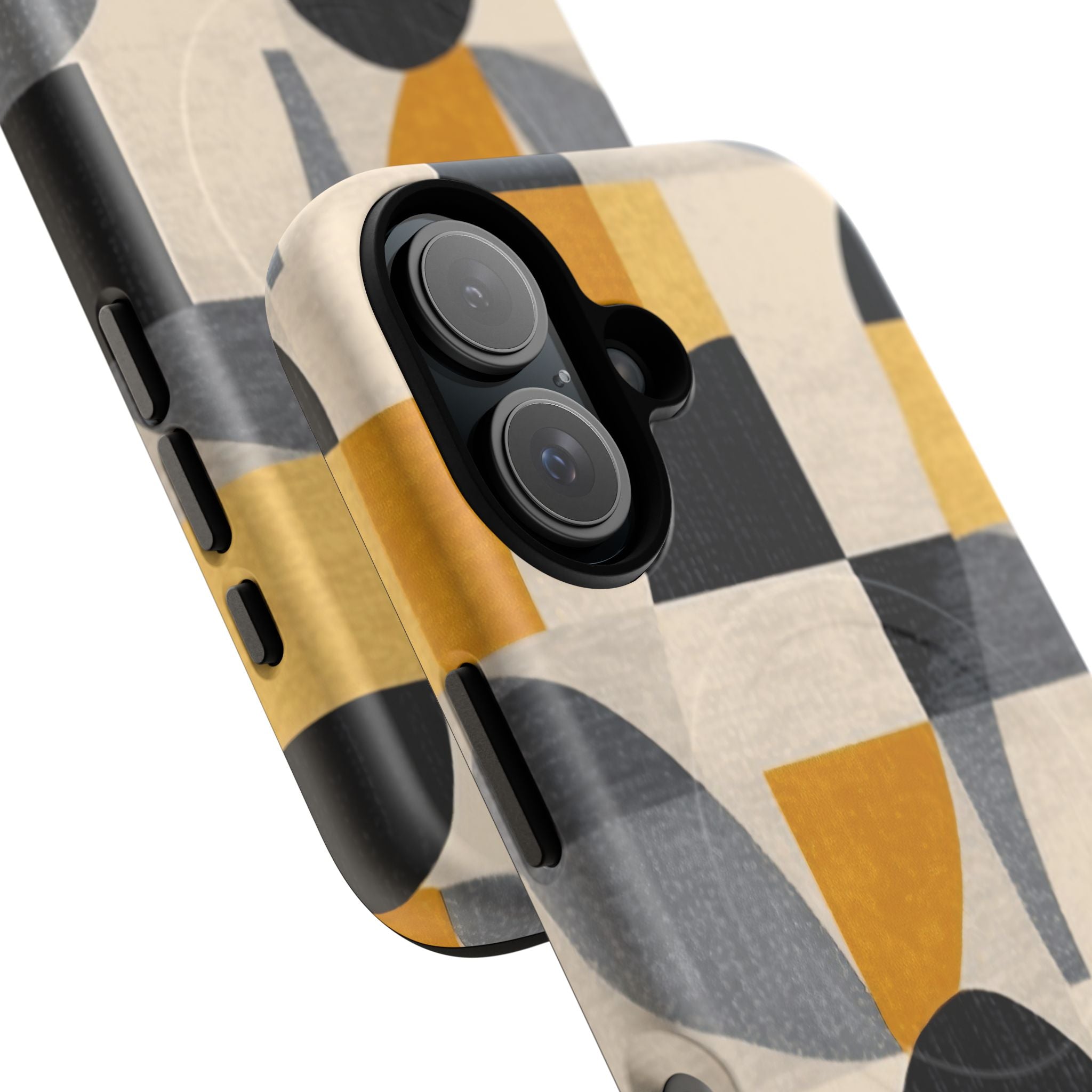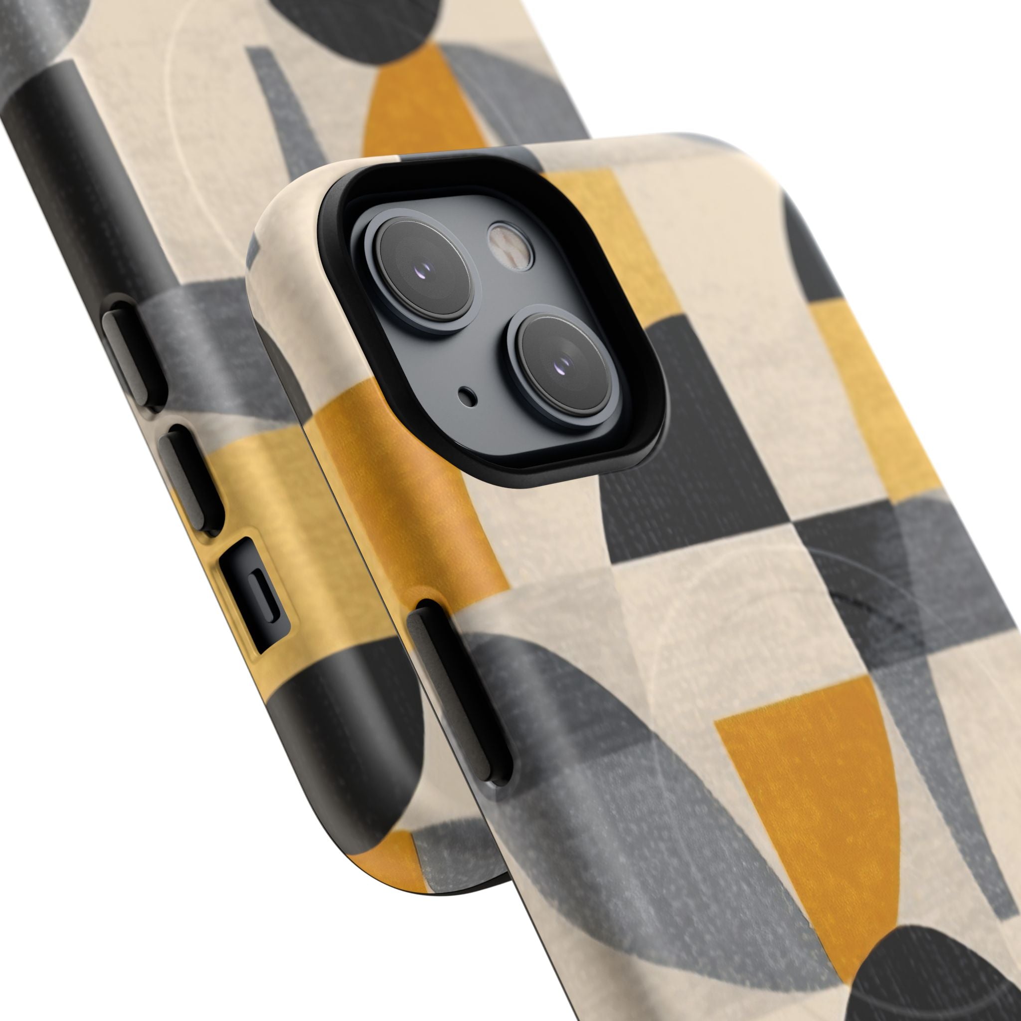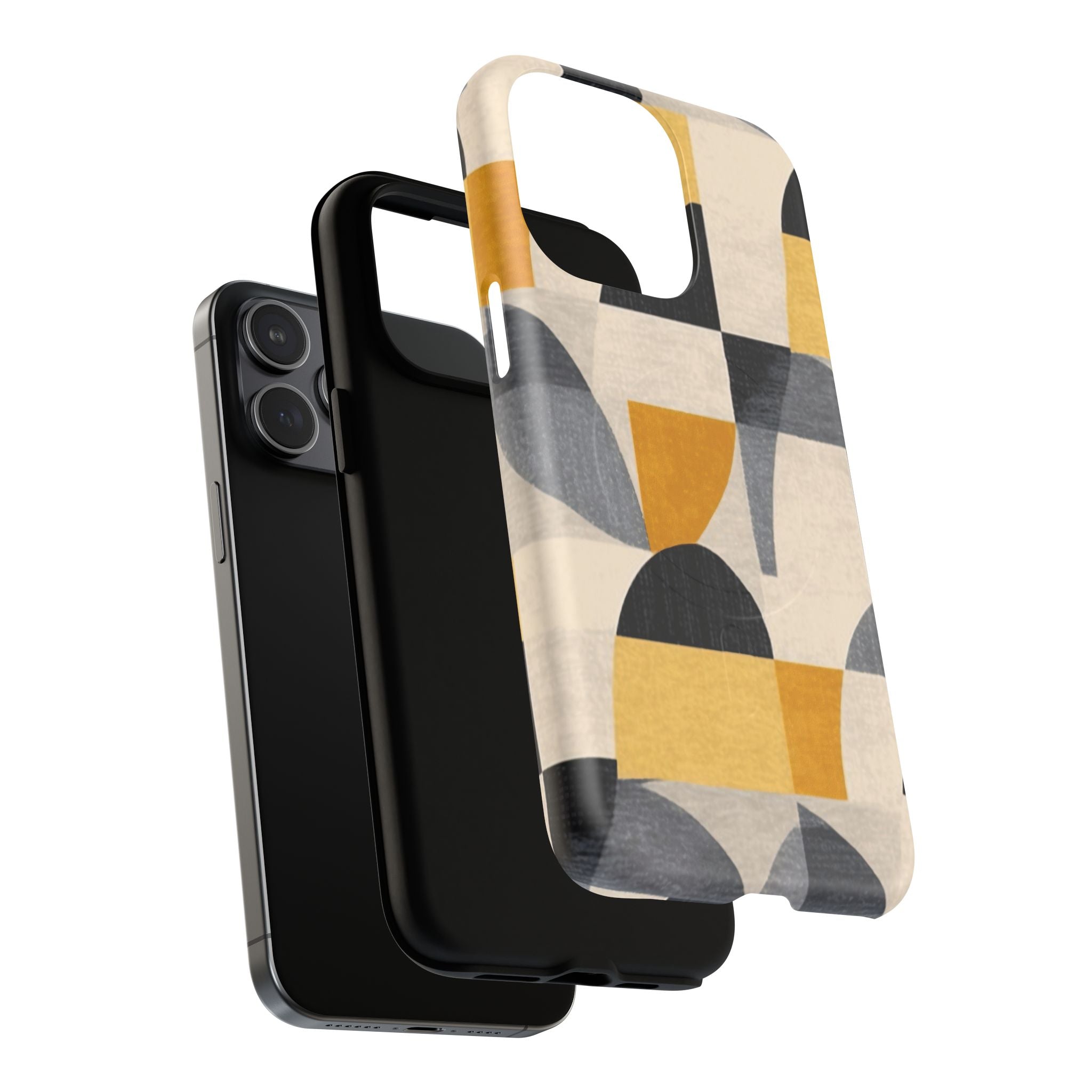 This ANTIPODE Abstract Phone Case from the Geometric Series features layered arcs, angled blocks, and curved panels in tones of ochre, charcoal, cream, and soft grey. The composition blends modernist shapes with subtle textured surfaces, creating a balanced, architectural rhythm that feels both graphic and handcrafted. The warm palette and repeated arch motifs give the design a timeless, mid-century sensibility.