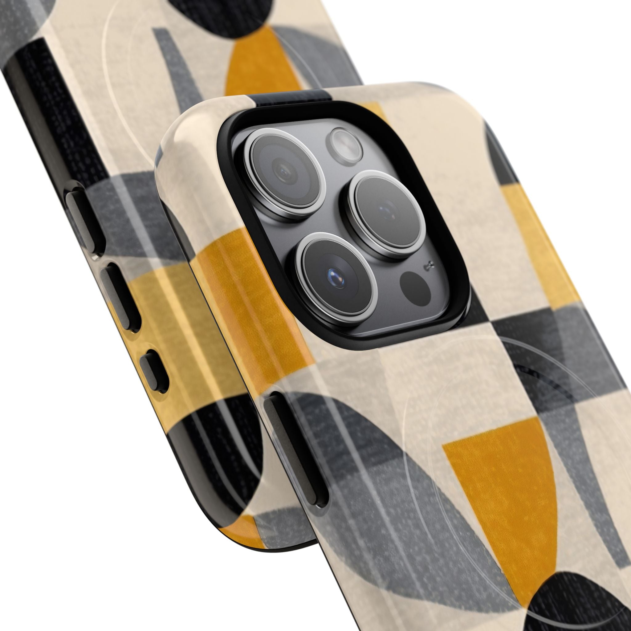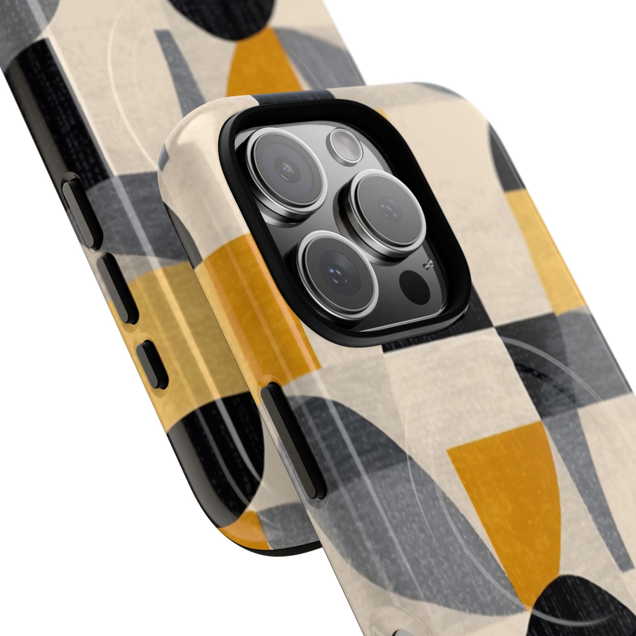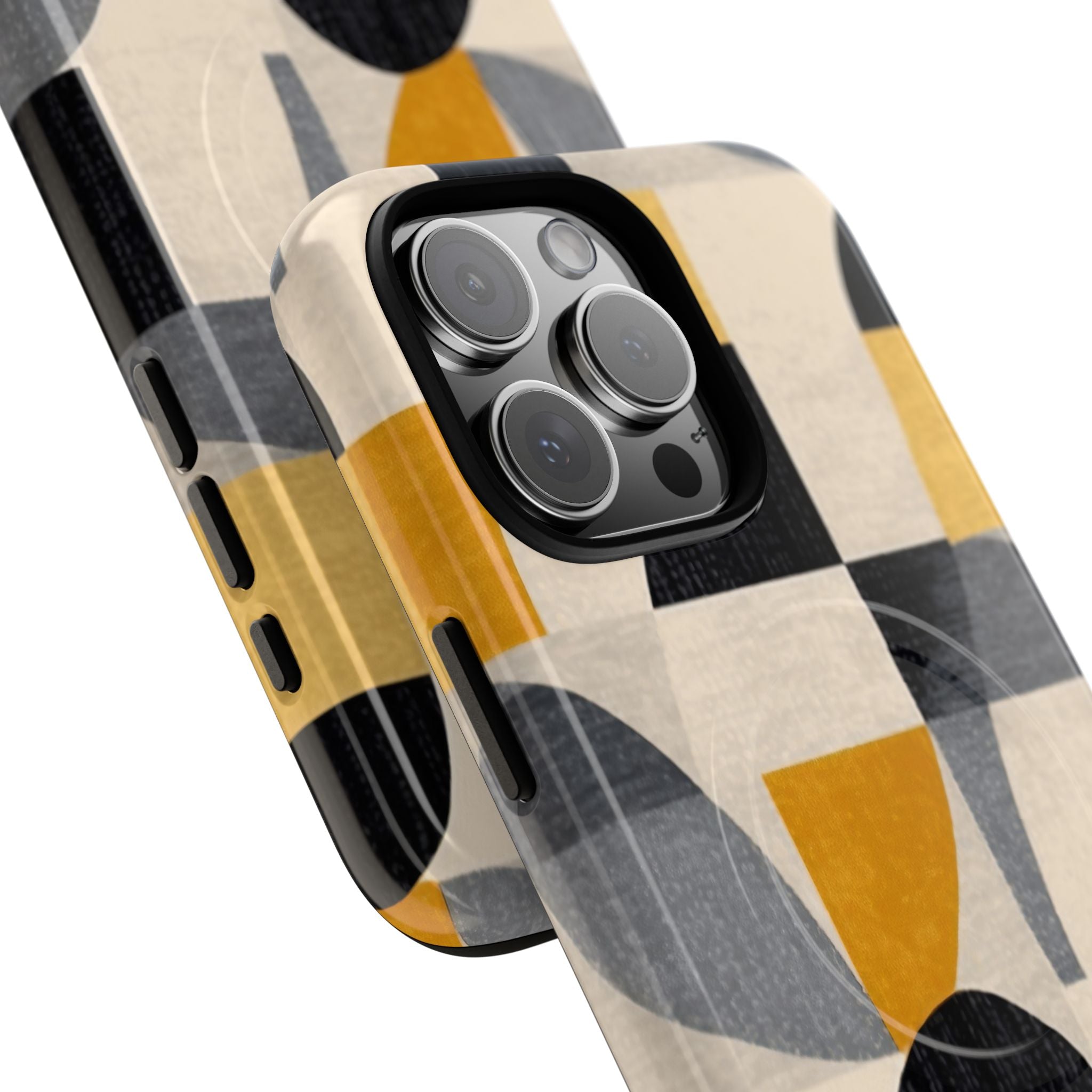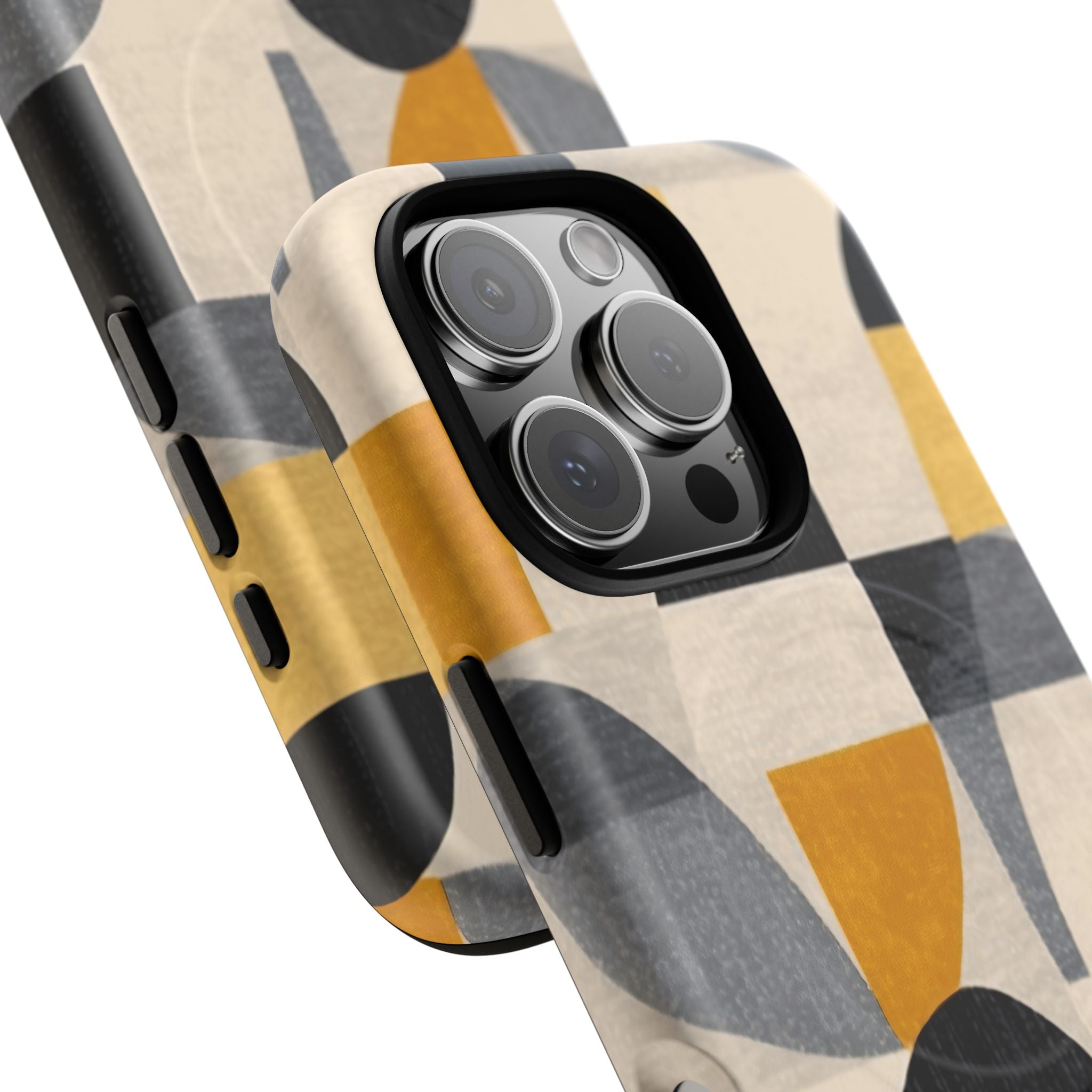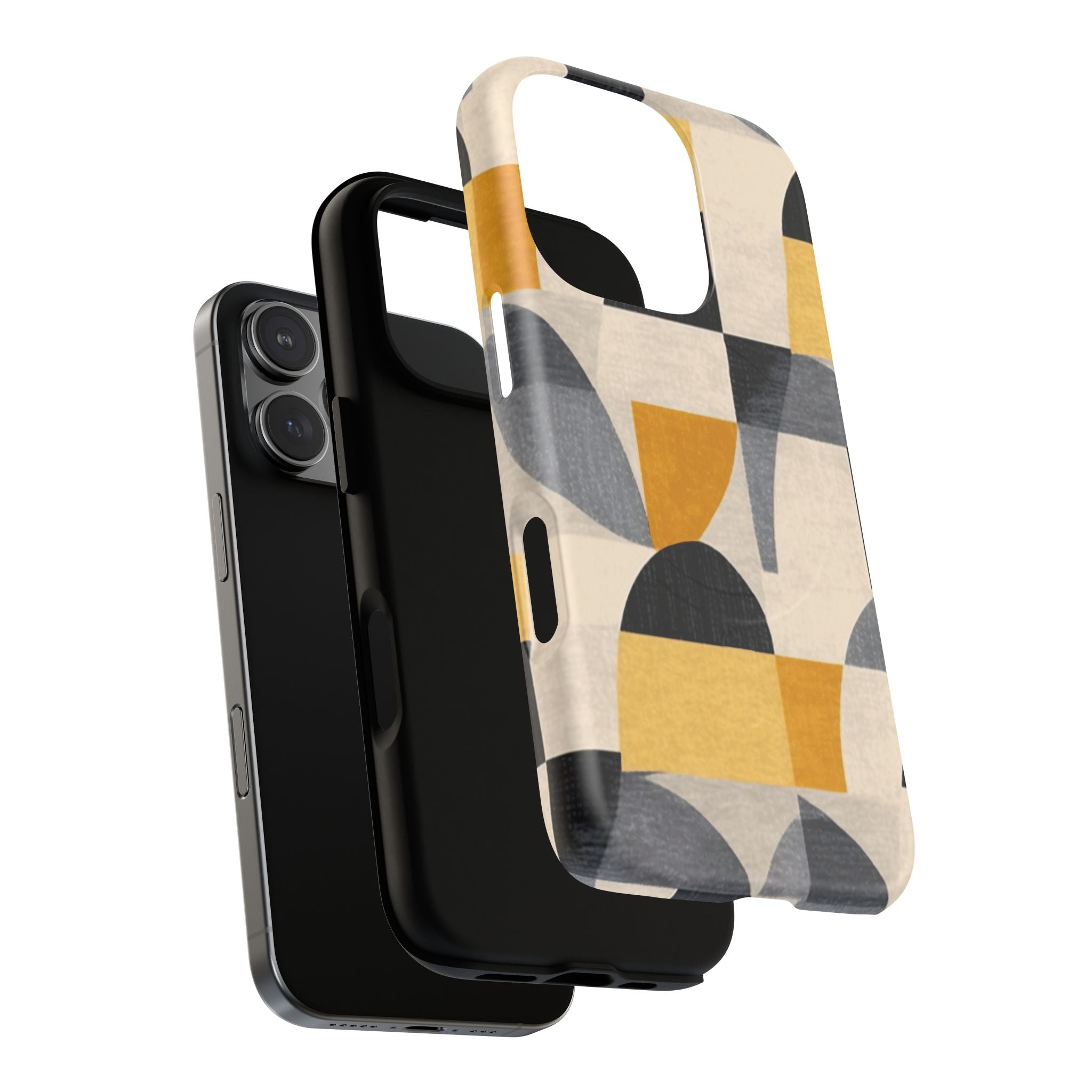 This ANTIPODE Abstract Phone Case from the Geometric Series features layered arcs, angled blocks, and curved panels in tones of ochre, charcoal, cream, and soft grey. The composition blends modernist shapes with subtle textured surfaces, creating a balanced, architectural rhythm that feels both graphic and handcrafted. The warm palette and repeated arch motifs give the design a timeless, mid-century sensibility.