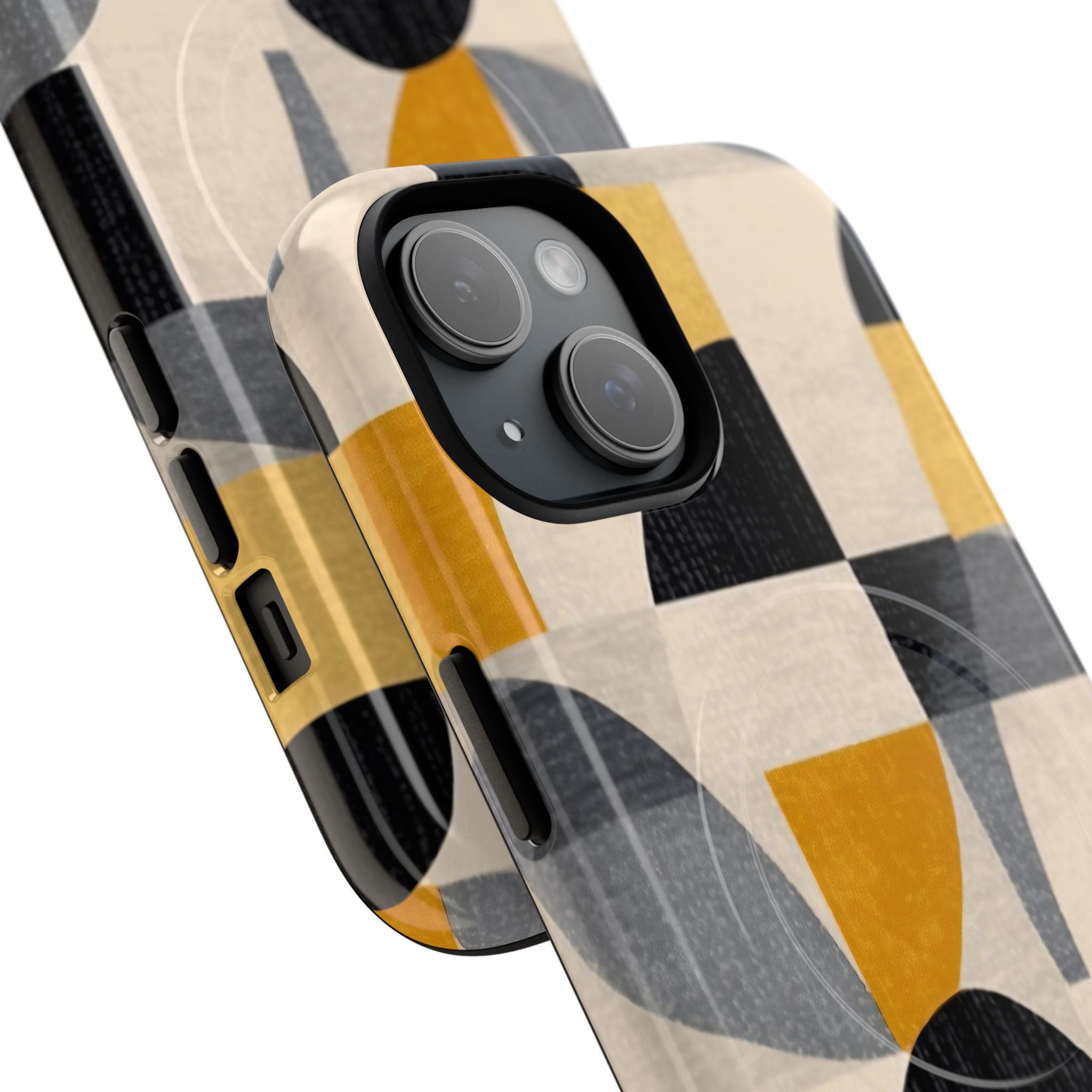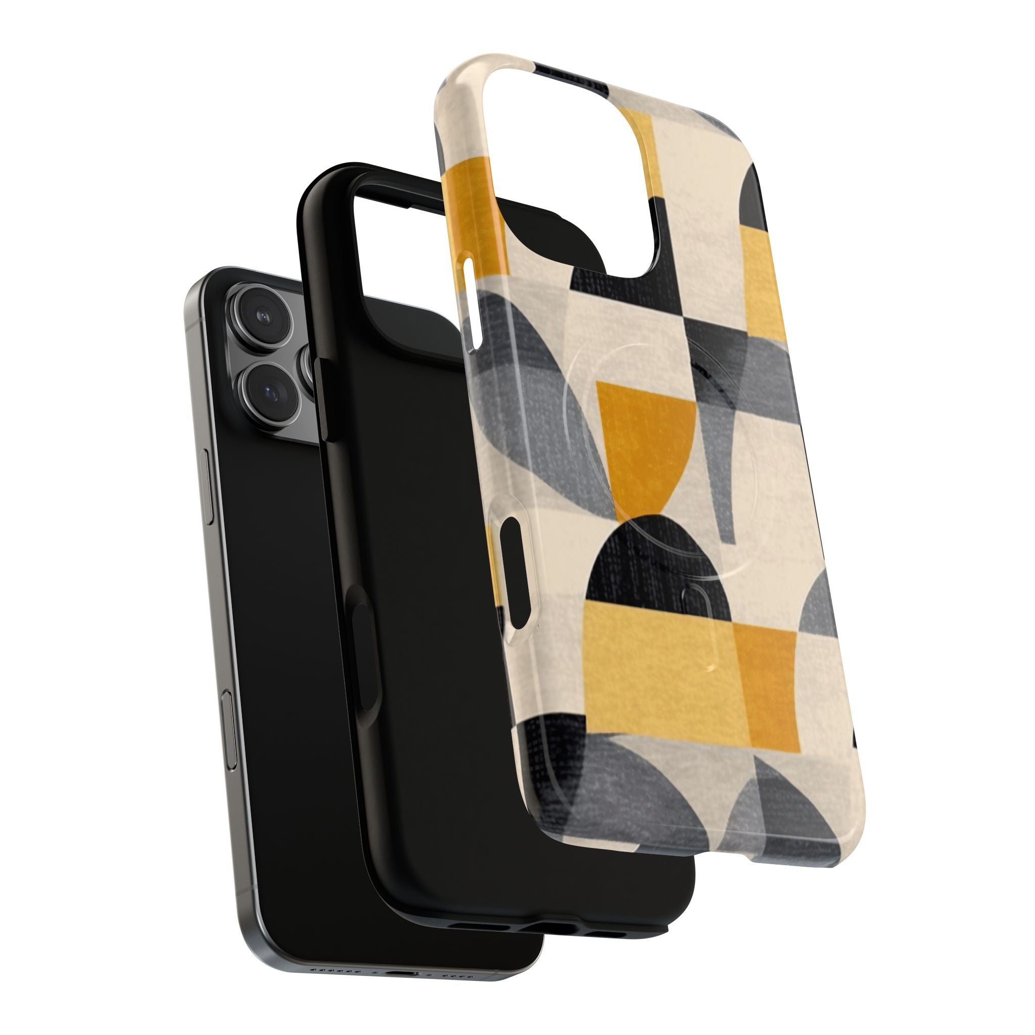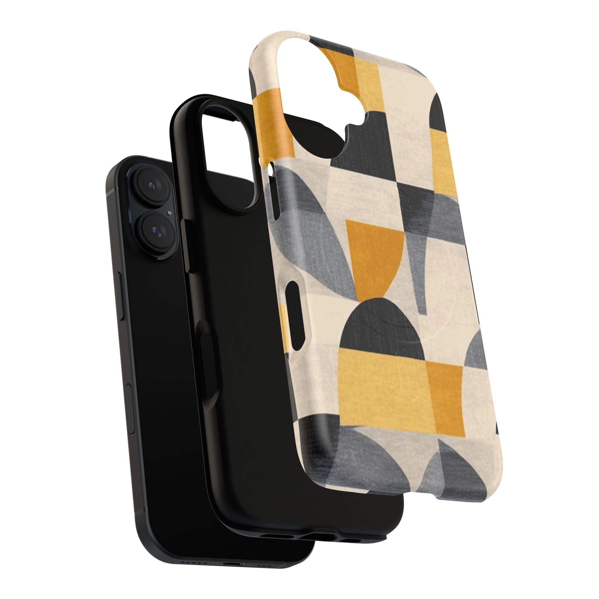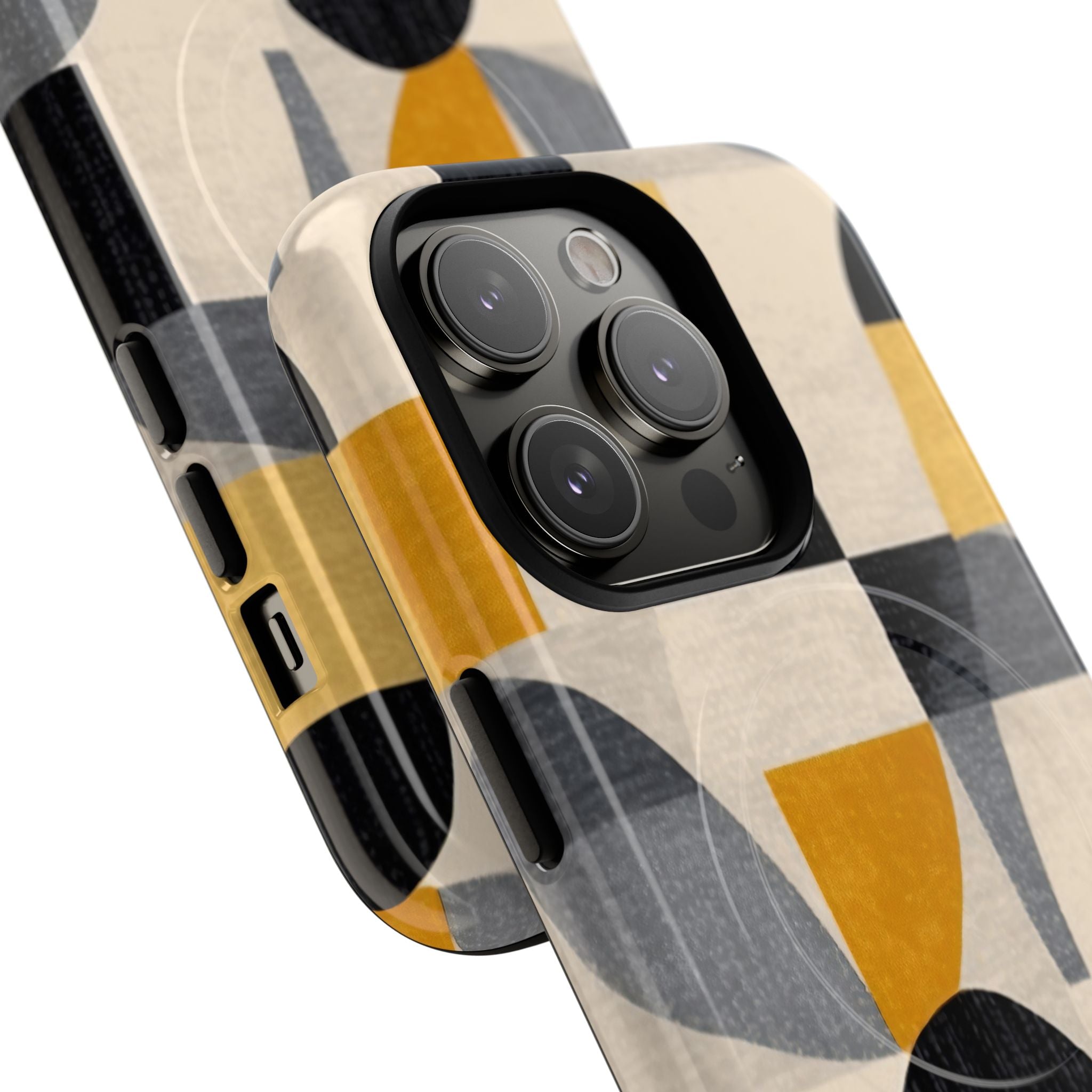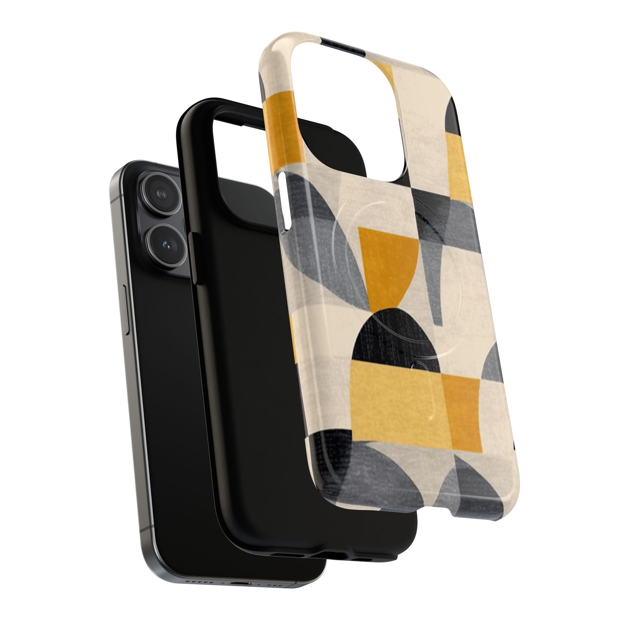 This ANTIPODE Abstract Phone Case from the Geometric Series features layered arcs, angled blocks, and curved panels in tones of ochre, charcoal, cream, and soft grey. The composition blends modernist shapes with subtle textured surfaces, creating a balanced, architectural rhythm that feels both graphic and handcrafted. The warm palette and repeated arch motifs give the design a timeless, mid-century sensibility.