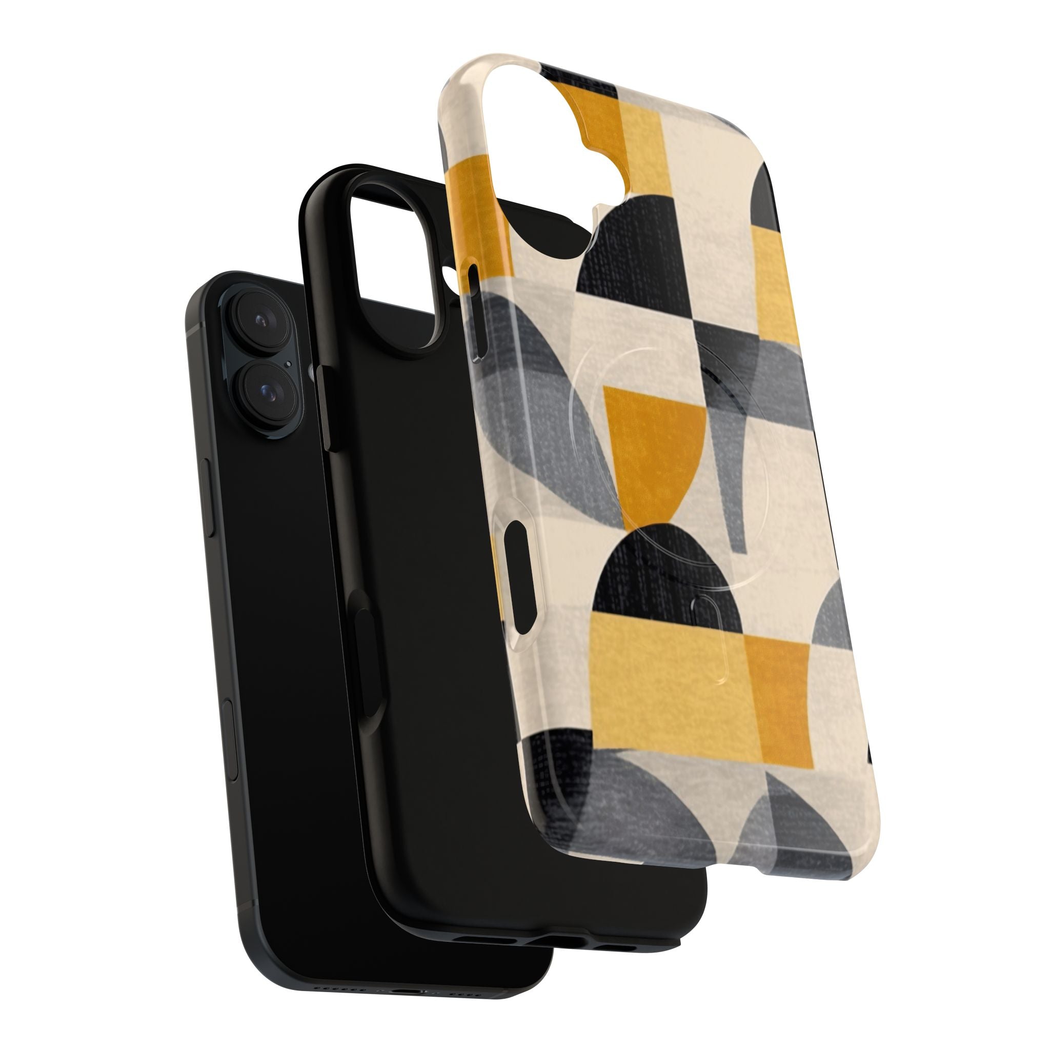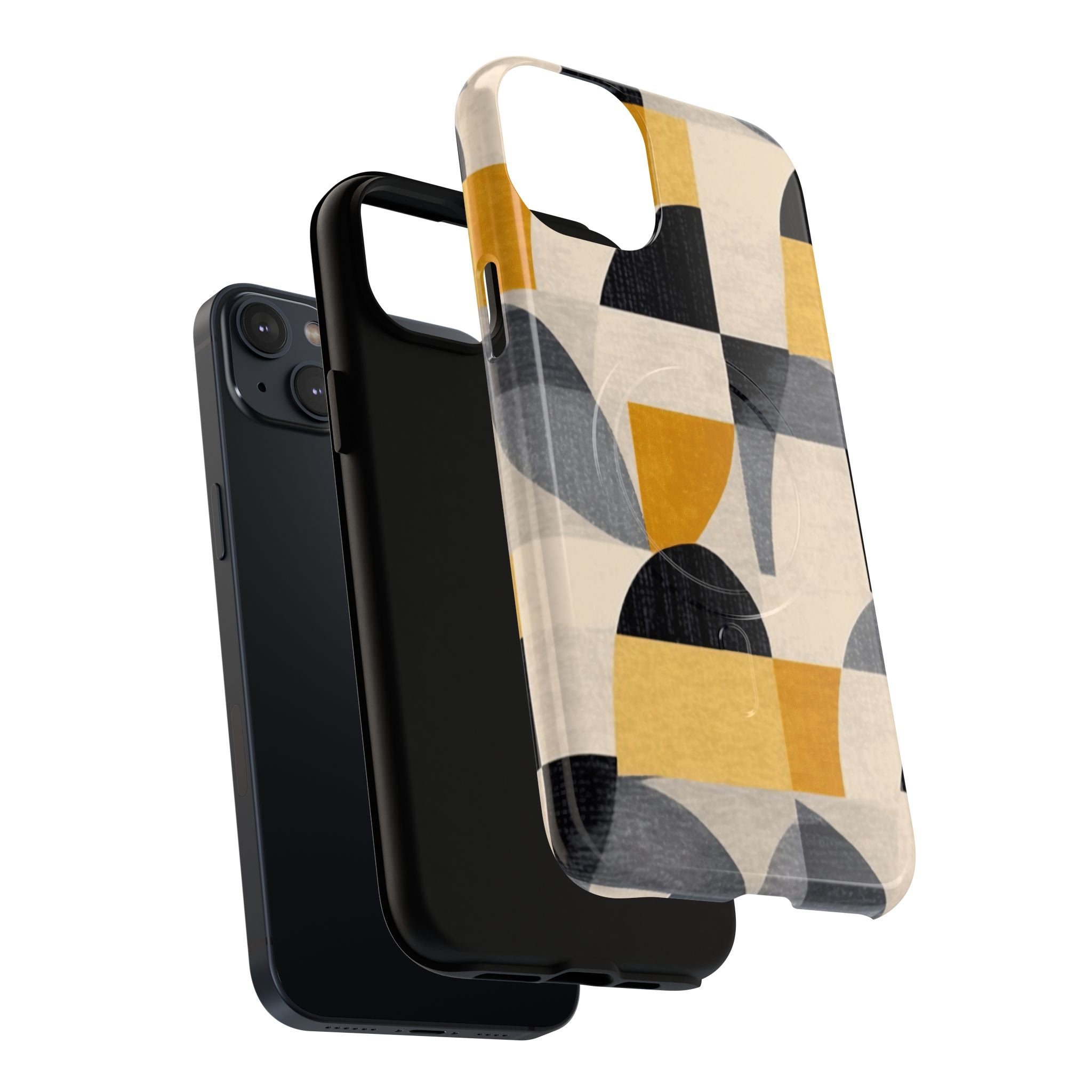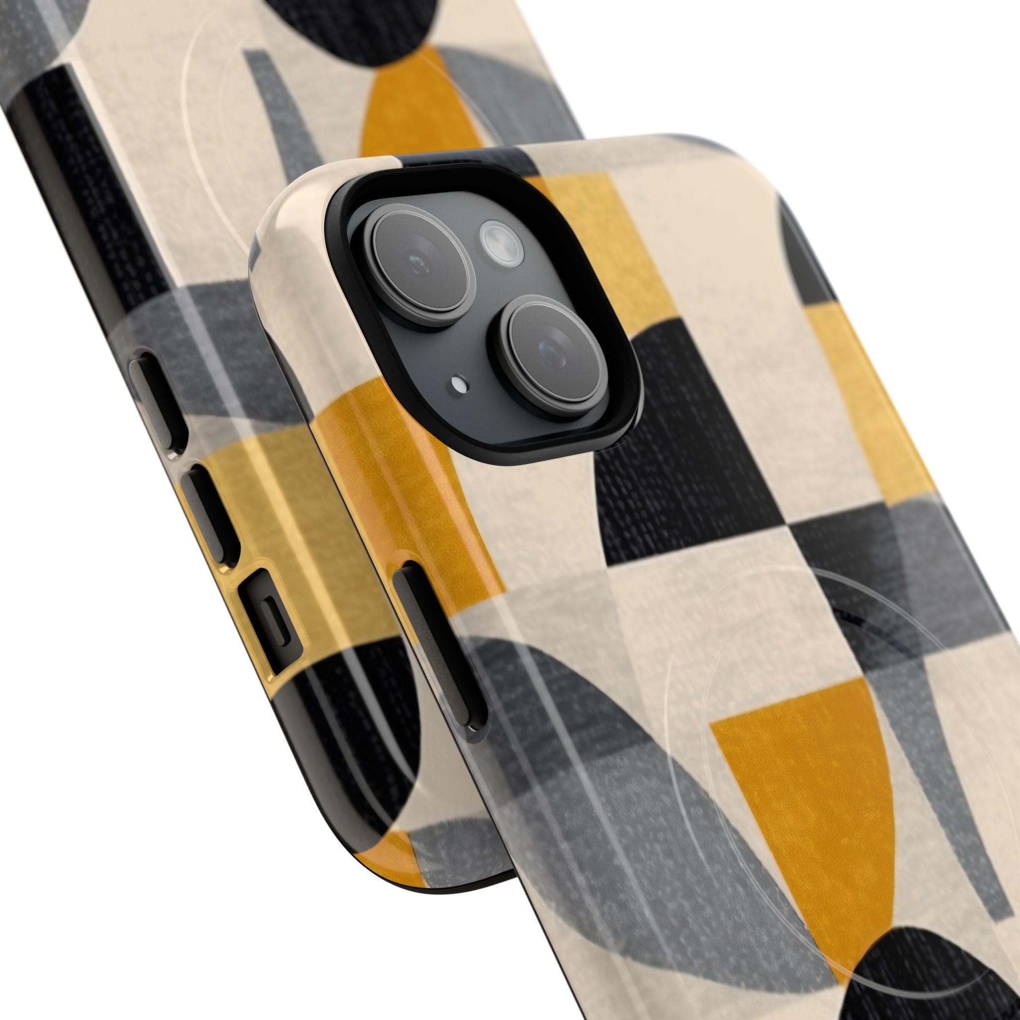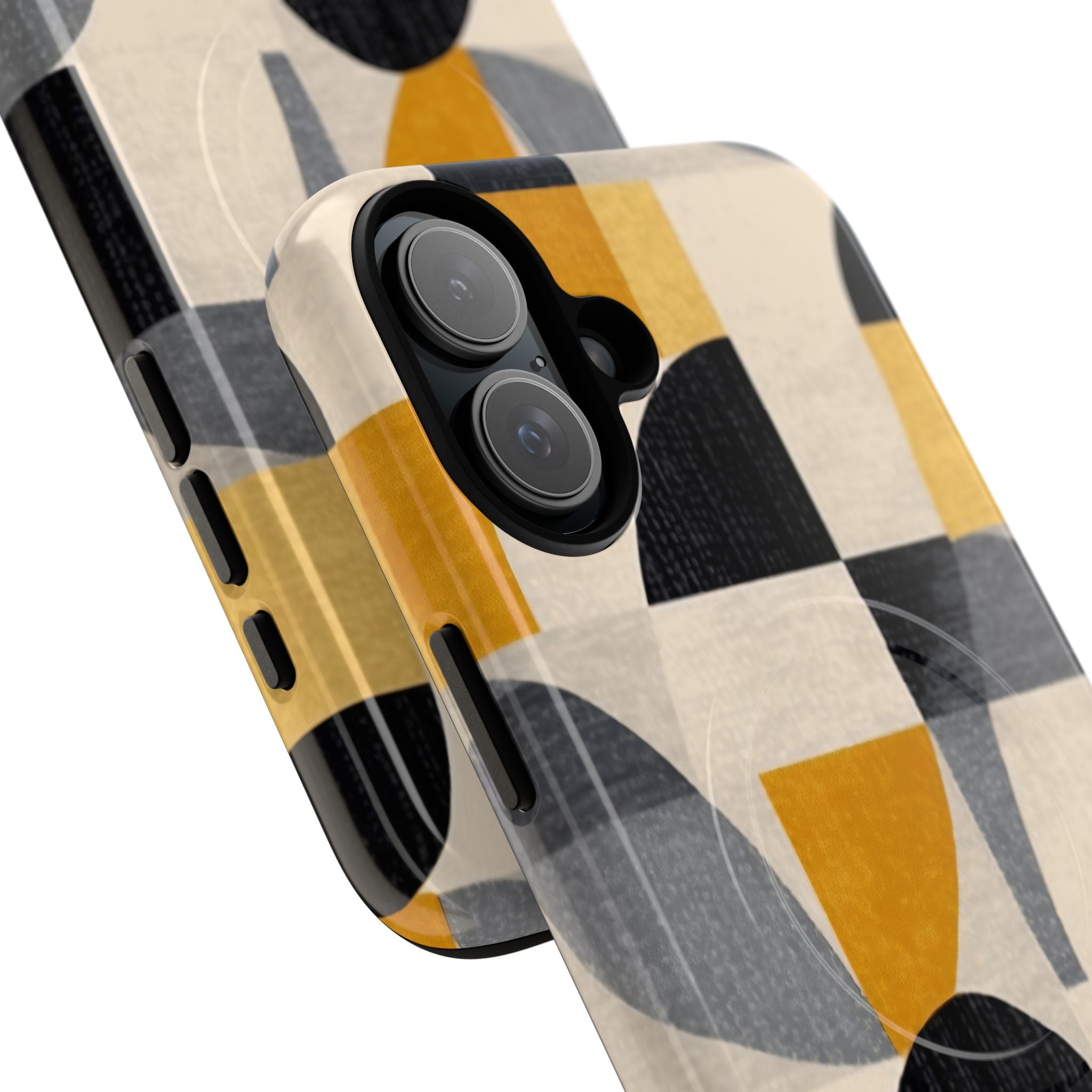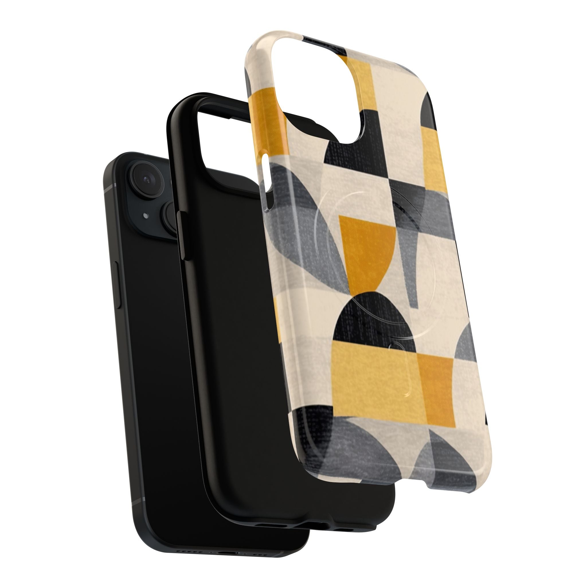 This ANTIPODE Abstract Phone Case from the Geometric Series features layered arcs, angled blocks, and curved panels in tones of ochre, charcoal, cream, and soft grey. The composition blends modernist shapes with subtle textured surfaces, creating a balanced, architectural rhythm that feels both graphic and handcrafted. The warm palette and repeated arch motifs give the design a timeless, mid-century sensibility.