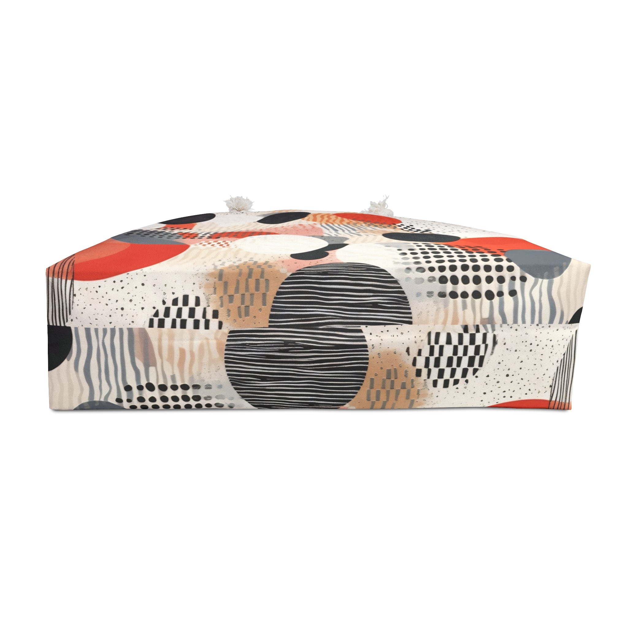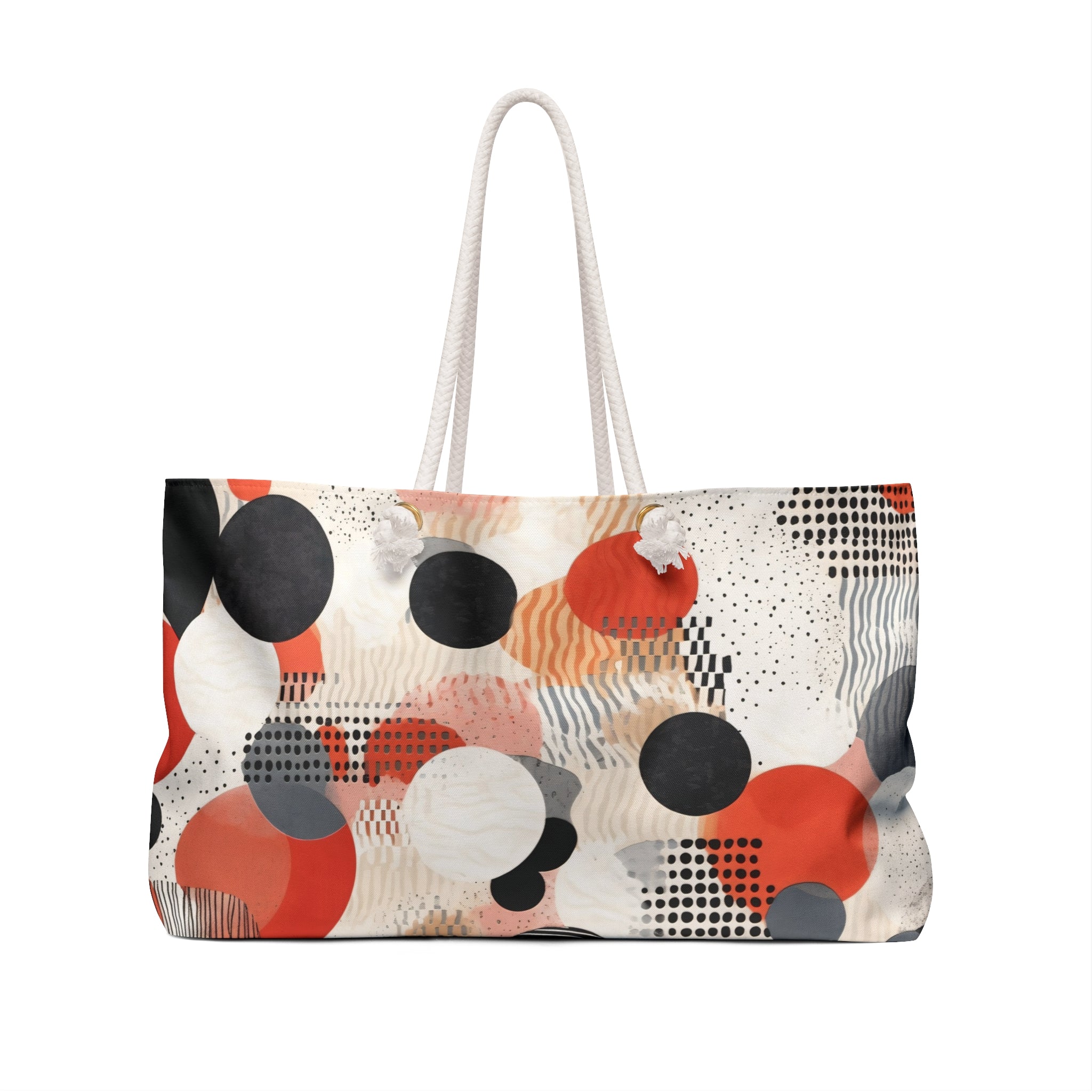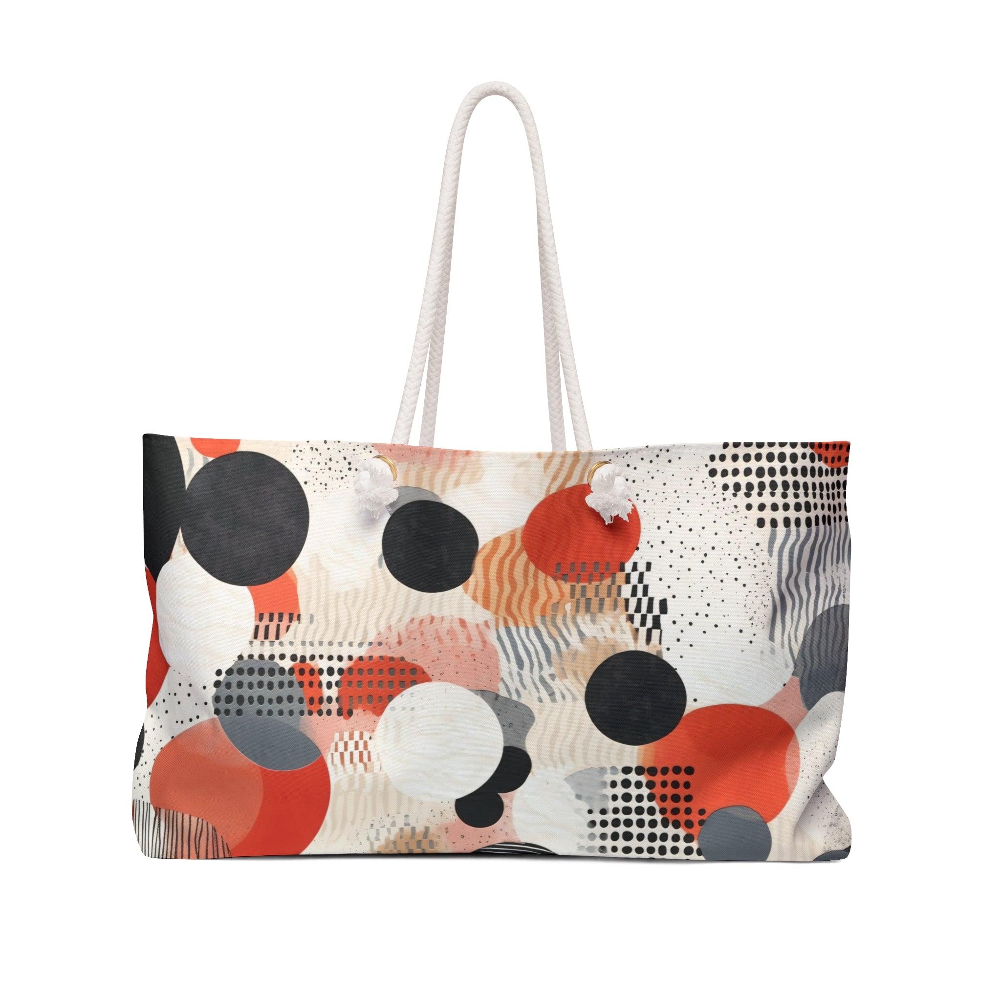 This ANTIPODE weekender from the Geometric Art Edition features a lively wraparound pattern of circles, dots, and layered textures in warm coral, charcoal, cream, and soft greys. The design feels like a collage of graphic forms — playful yet deliberate, contemporary yet deeply tactile. Its vivid surface brings a sense of energy and personality to your travels, while the structured 24" × 13" silhouette keeps everything practical and easy to pack.