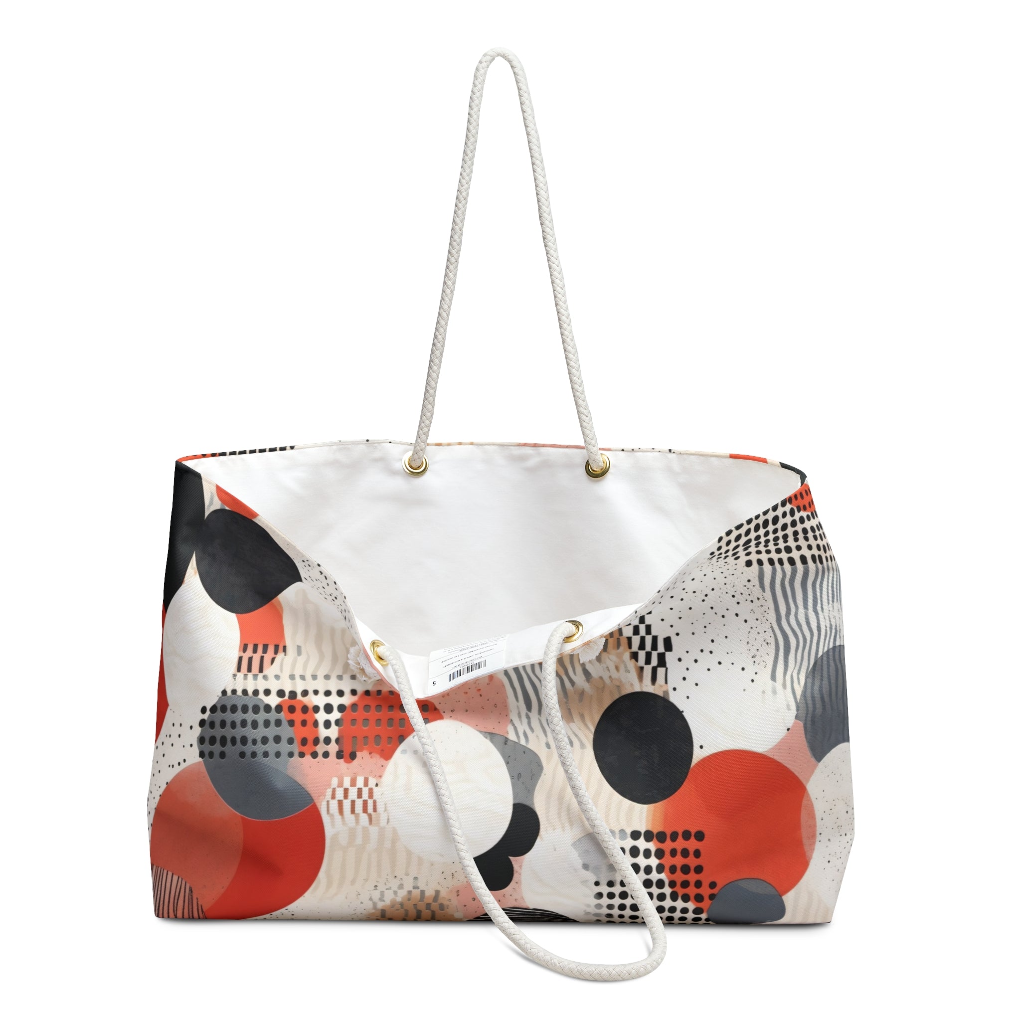 The wrinkle-resistant spun polyester exterior keeps the artwork crisp from car boot to cabin luggage. Thick cream rope handles threaded through gold-tone grommets add a nautical touch, balancing the modern print with soft tactility. Inside, a cream cotton-poly lining protects clothing and essentials while giving the bag a light, airy interior finish. Lightweight but substantial, it’s the ideal companion for market mornings, coastal getaways, overnight stays, or slow weekends lived fully and simply.
