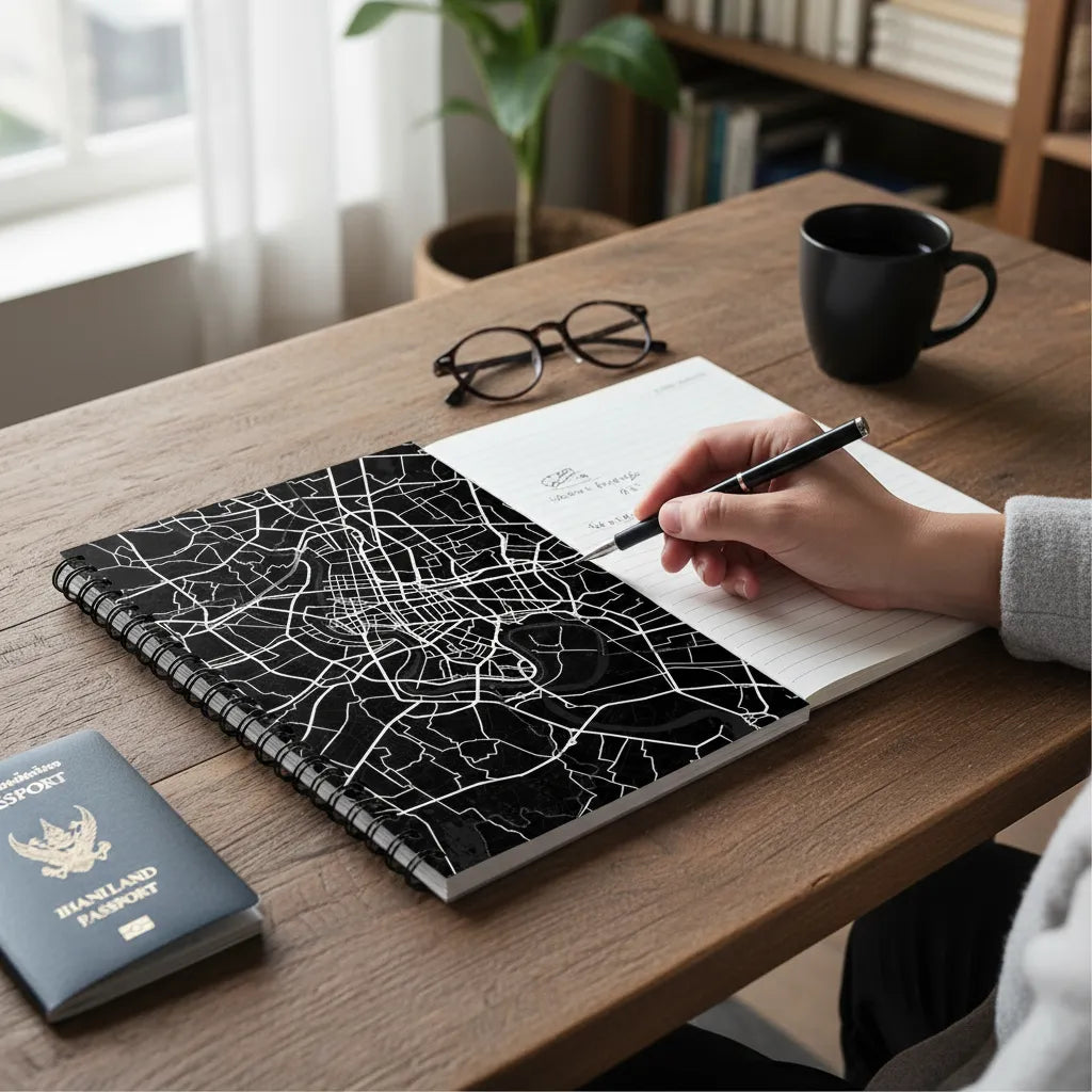 This compact, travel-ready spiral notebook features a custom map of Bangkok, designed around a real location you choose — from busy streets and neighbourhoods to places tied to meaningful memories. Generated from authentic map data, the full-colour city map cover turns Bangkok’s layered street grid into a refined, personal design.