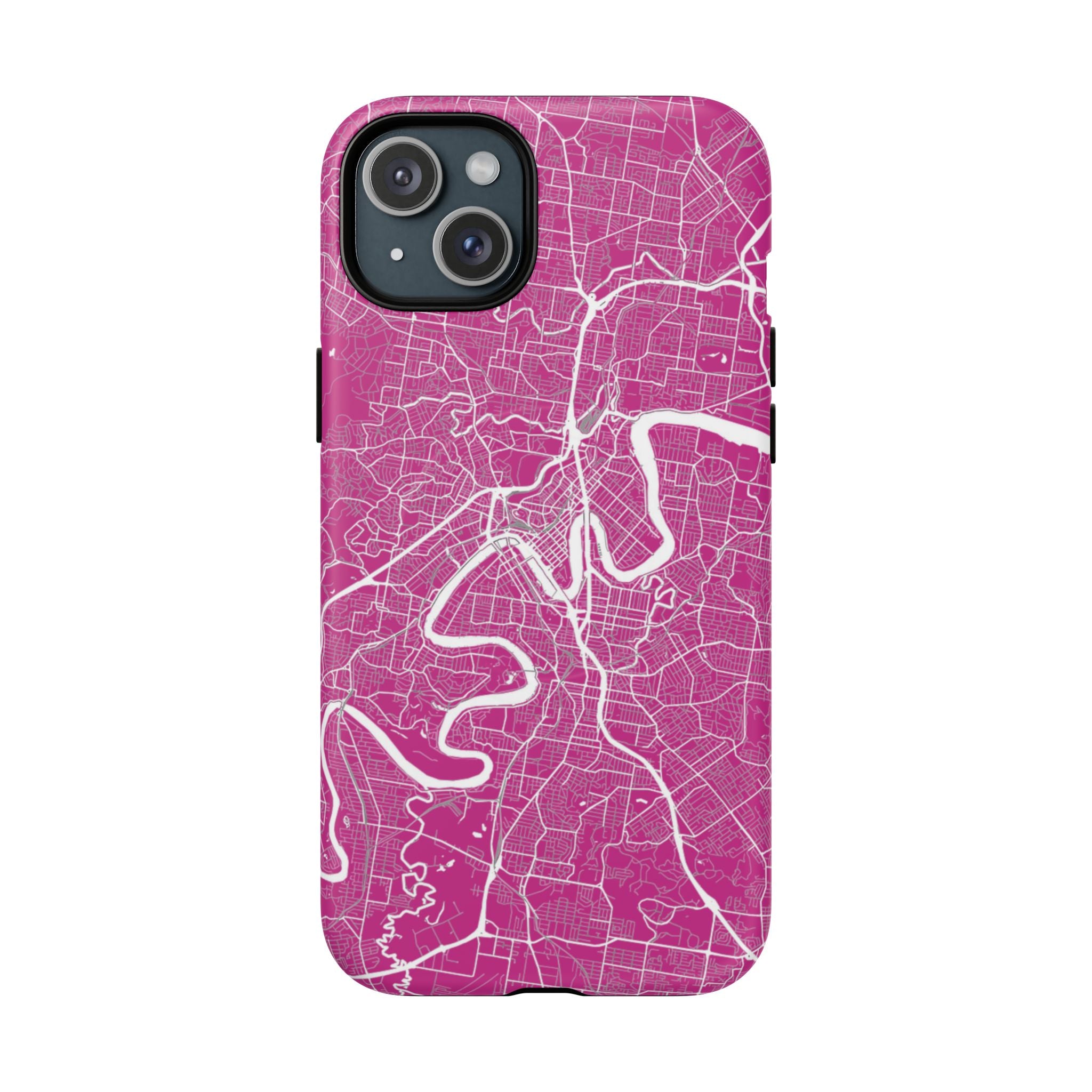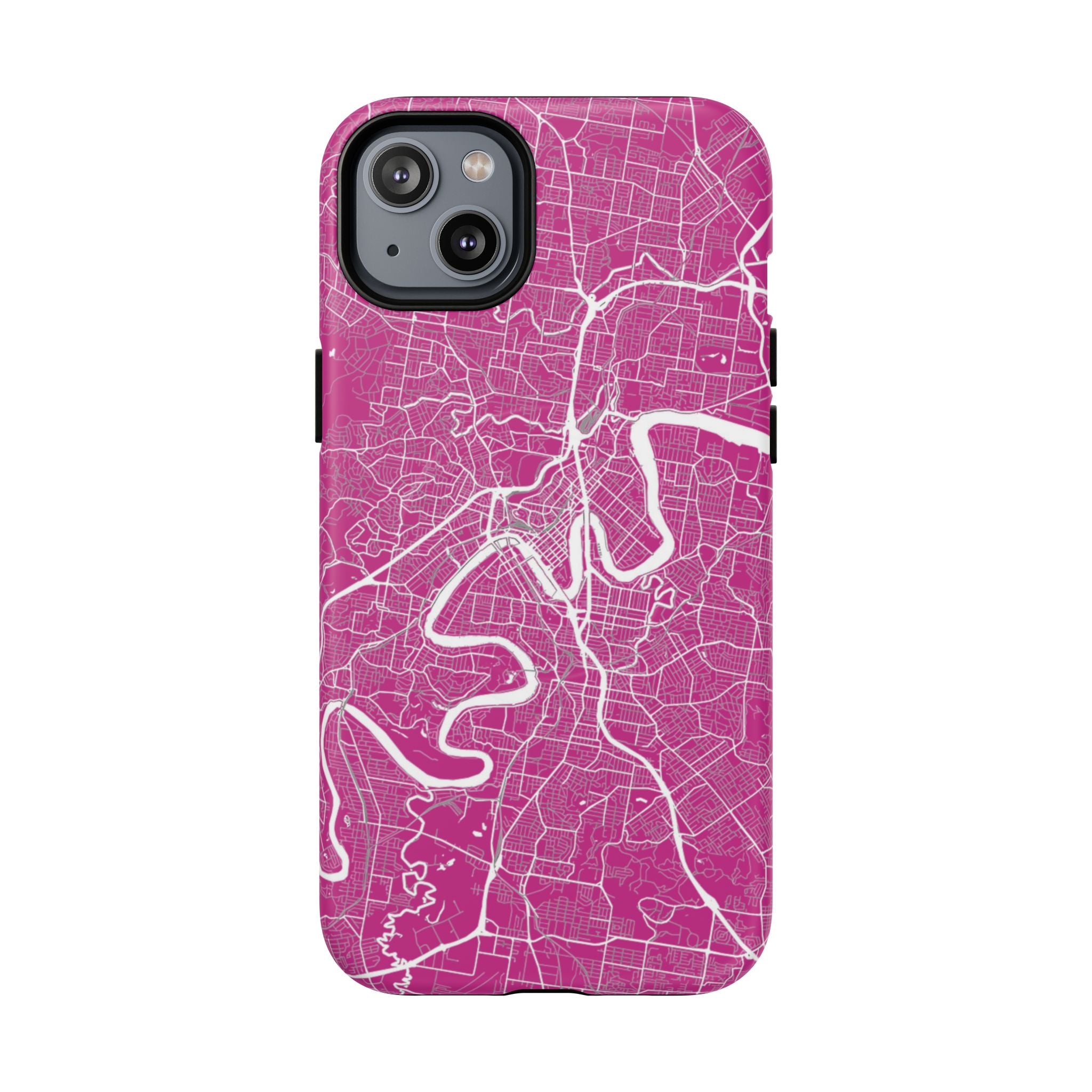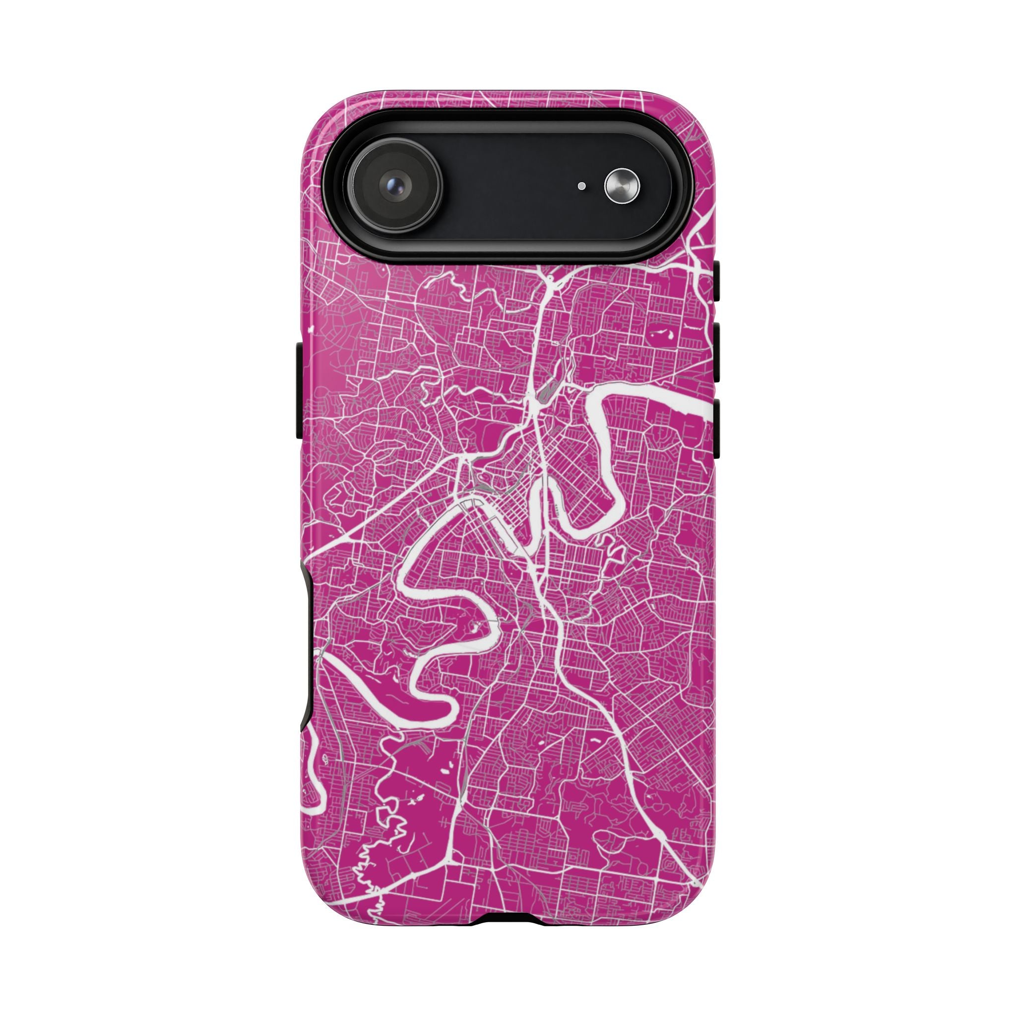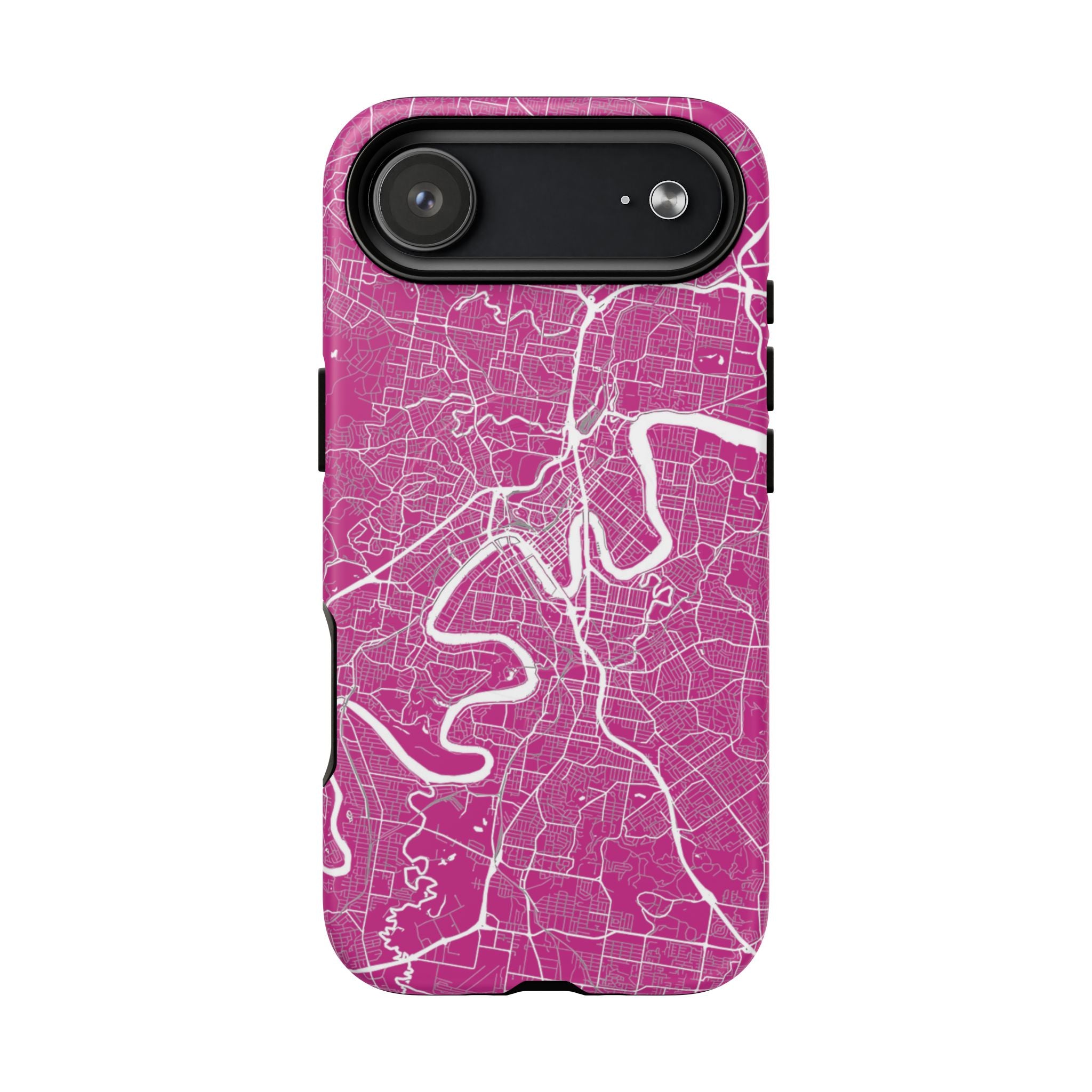 This Brisbane map phone case features a vibrant pink backdrop with crisp white linework tracing the winding Brisbane River and surrounding street grid. The dramatic curves of the river define the city’s layout, creating a bold, energetic design that feels instantly recognisable.