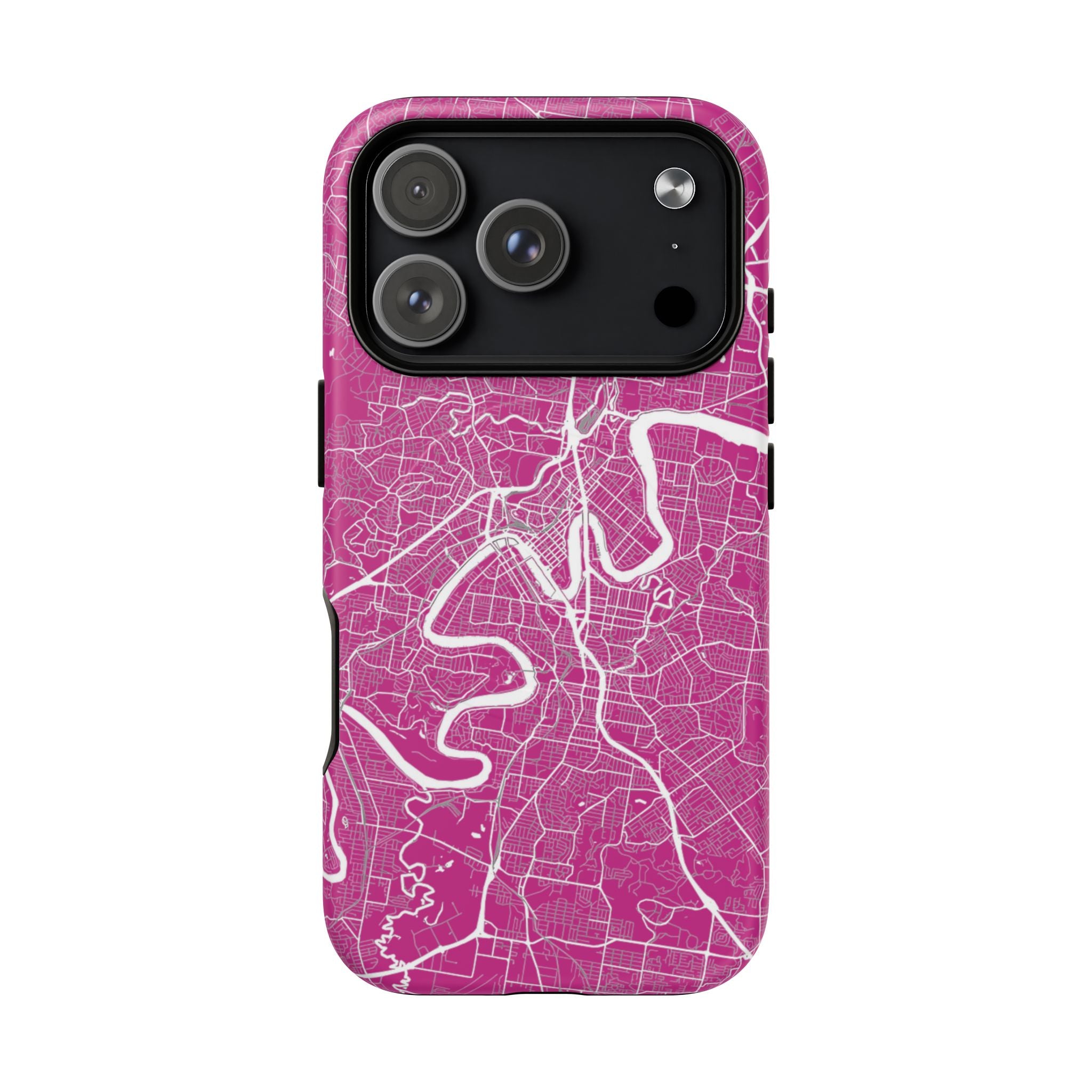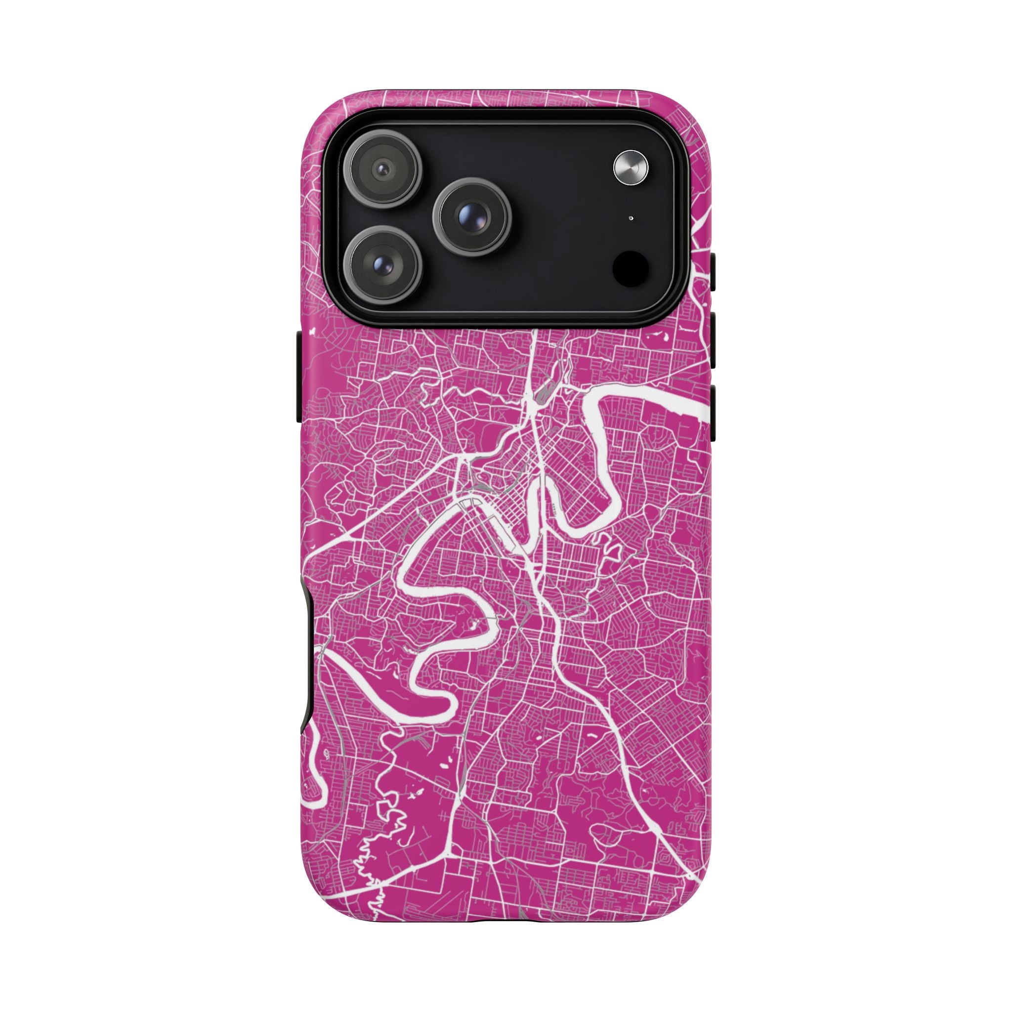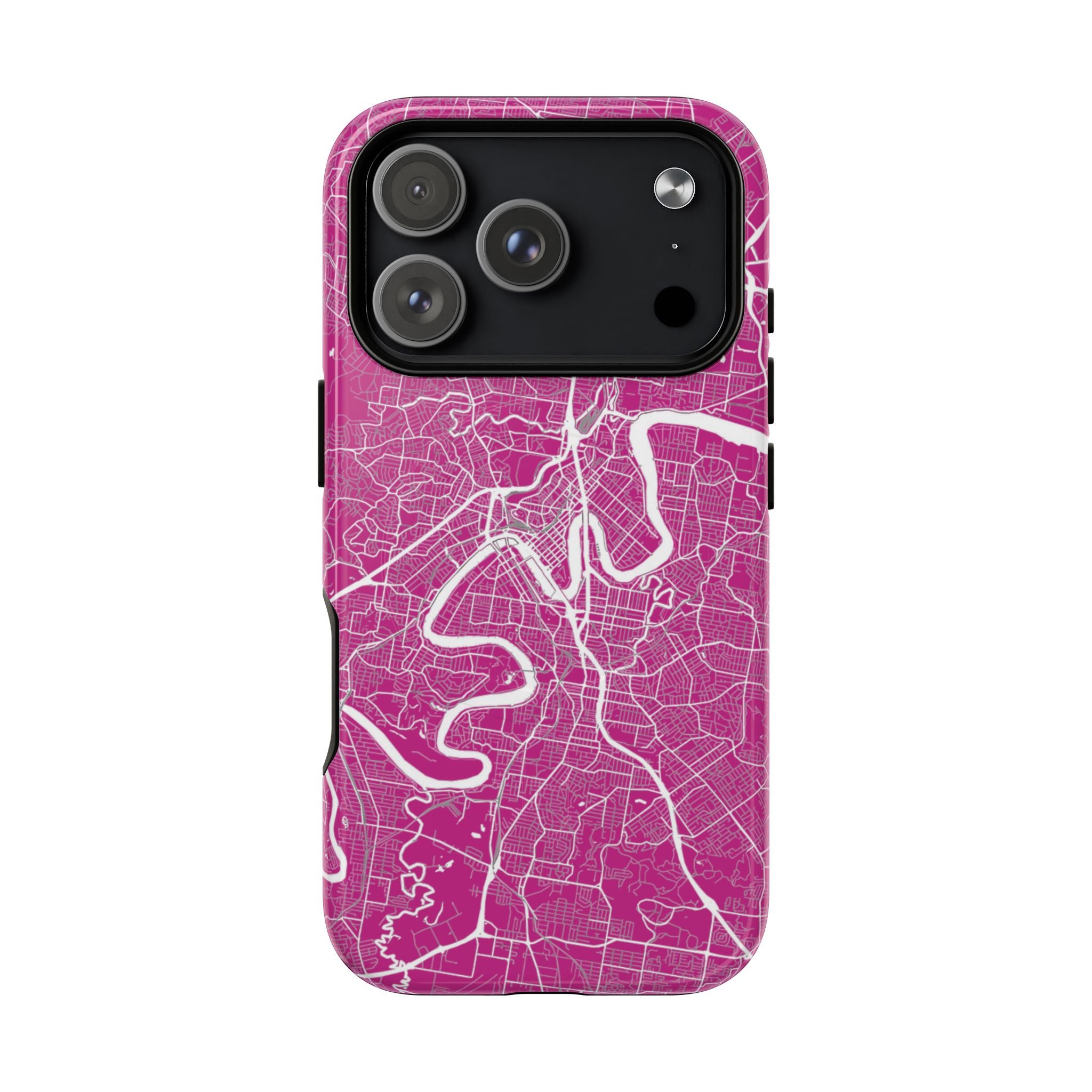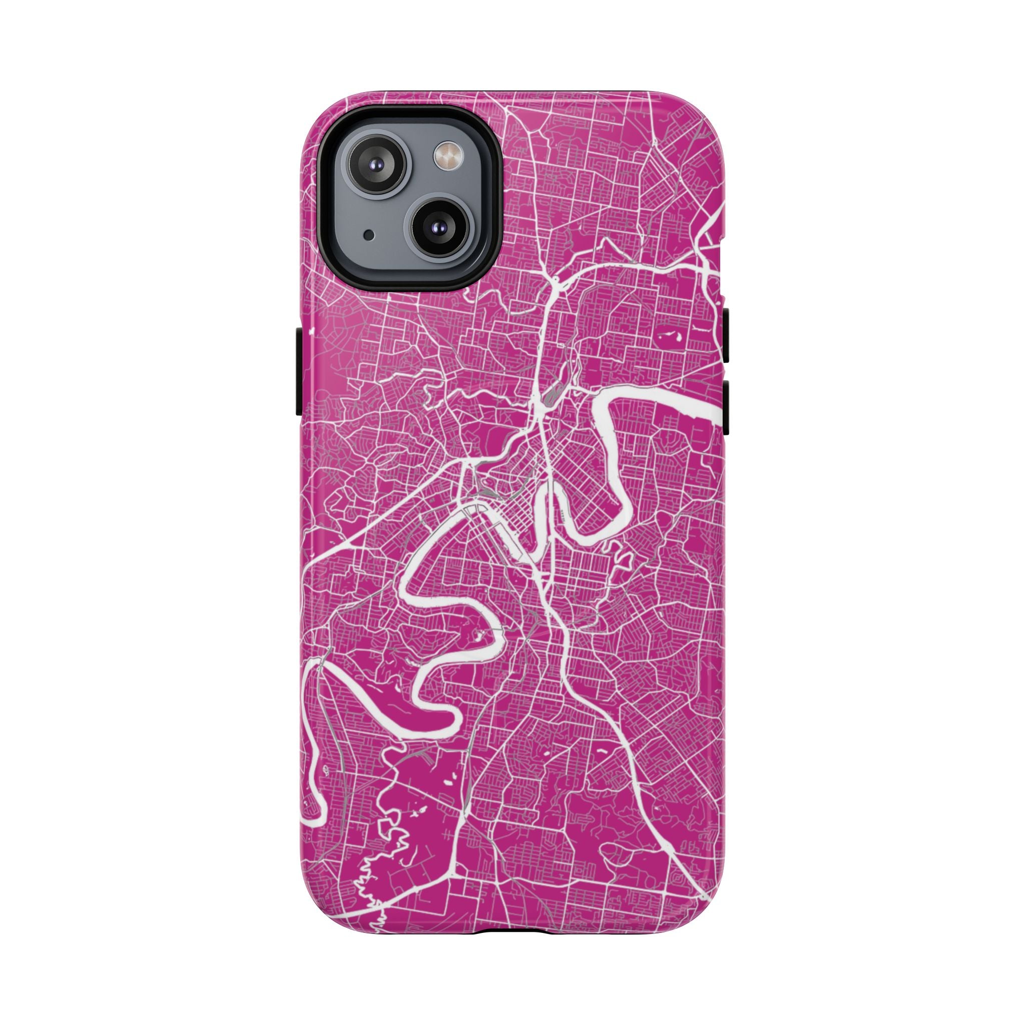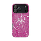 This Brisbane map phone case features a vibrant pink backdrop with crisp white linework tracing the winding Brisbane River and surrounding street grid. The dramatic curves of the river define the city’s layout, creating a bold, energetic design that feels instantly recognisable.