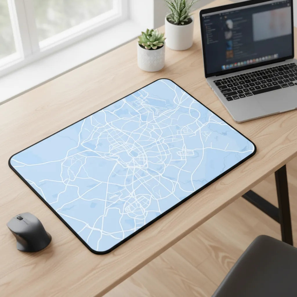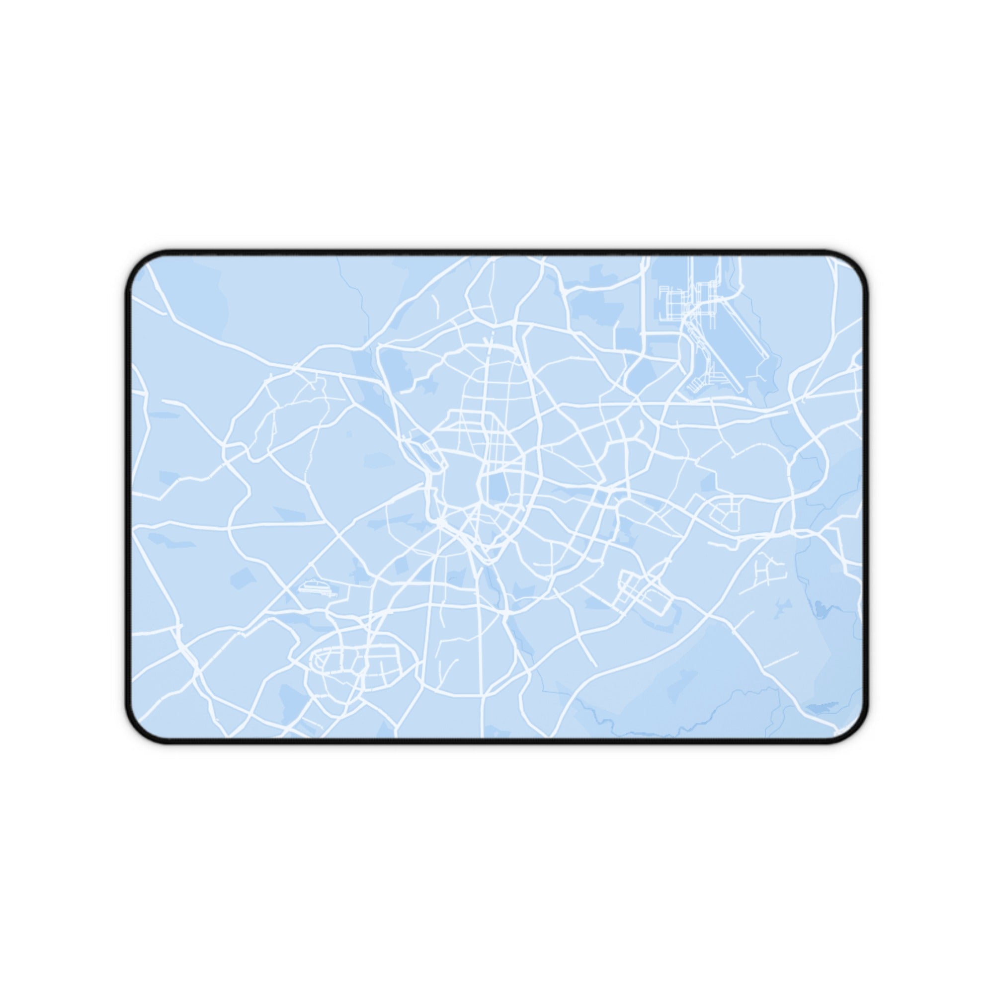 The map is printed in high resolution onto a smooth neoprene surface that feels comfortable under keyboard, mouse, and pen, making it ideal for long work sessions or creative projects. The stitched, hemmed edges help the mat hold its shape over time, while the durable neoprene core absorbs everyday wear without losing its clean appearance.
