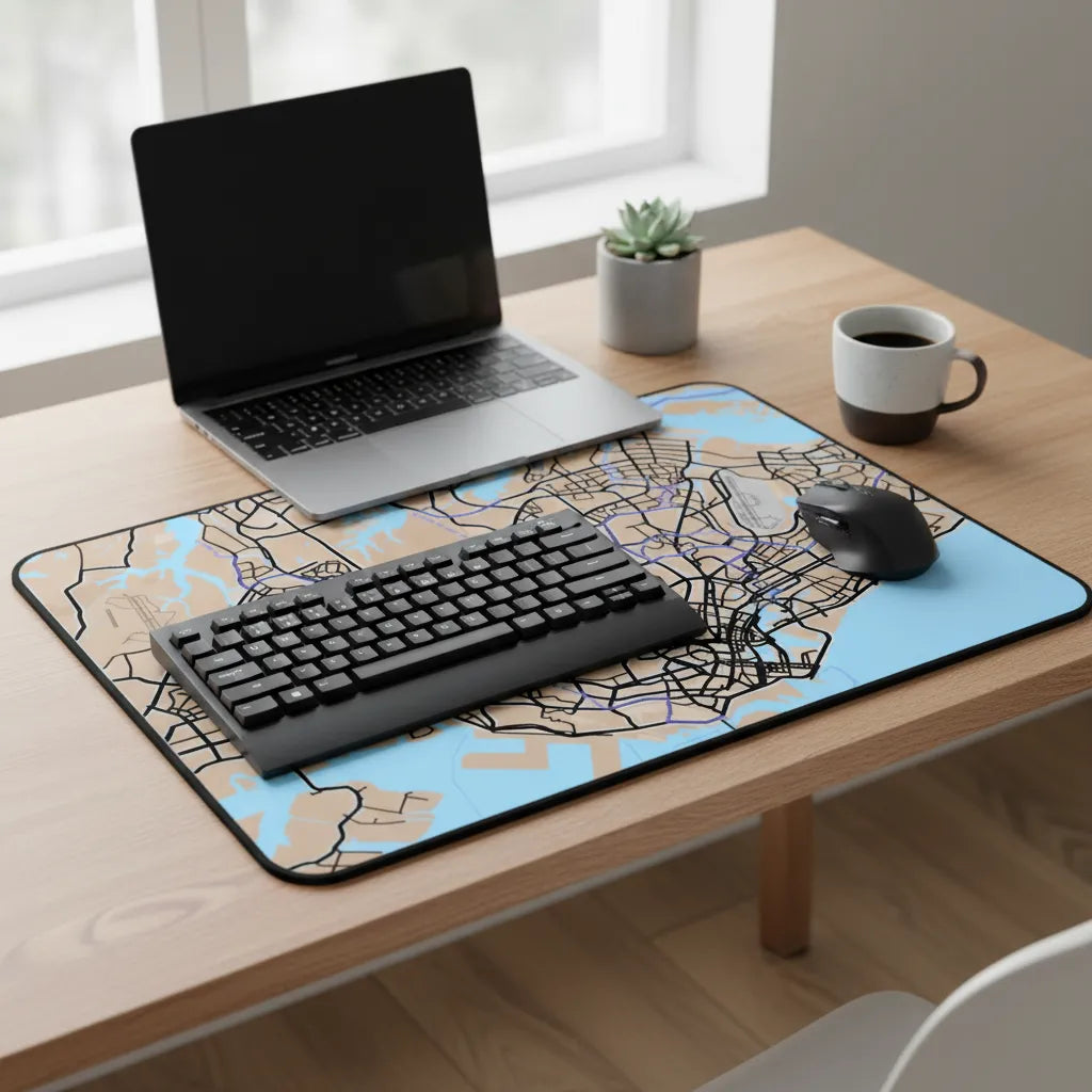 Bring Singapore to your workspace. This custom Singapore map desk mat transforms a real Singapore location into a refined, functional surface designed for everyday work, creativity, and focus. Generated from authentic street-level map data, the design captures Singapore’s precise urban grid, waterfront edges, and green corridors — turning a familiar place into a calm, visually engaging backdrop for your desk.