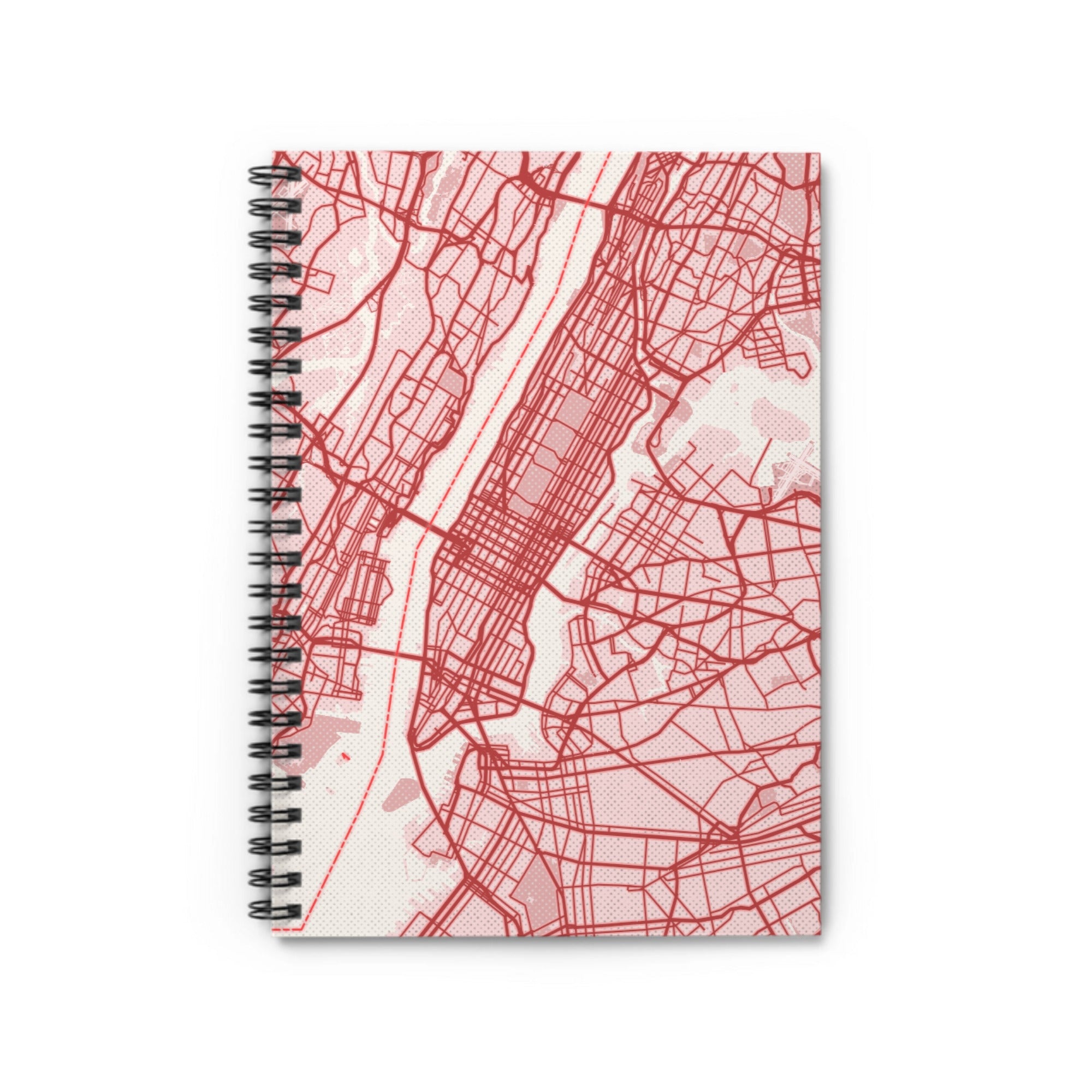 This compact, travel-ready spiral notebook features a custom map of New York, designed around a real location you choose — from Manhattan blocks and Brooklyn neighbourhoods to places tied to important moments. Created using authentic map data, the full-colour city map cover captures New York’s distinctive grid, density, and movement in a refined, personal design.