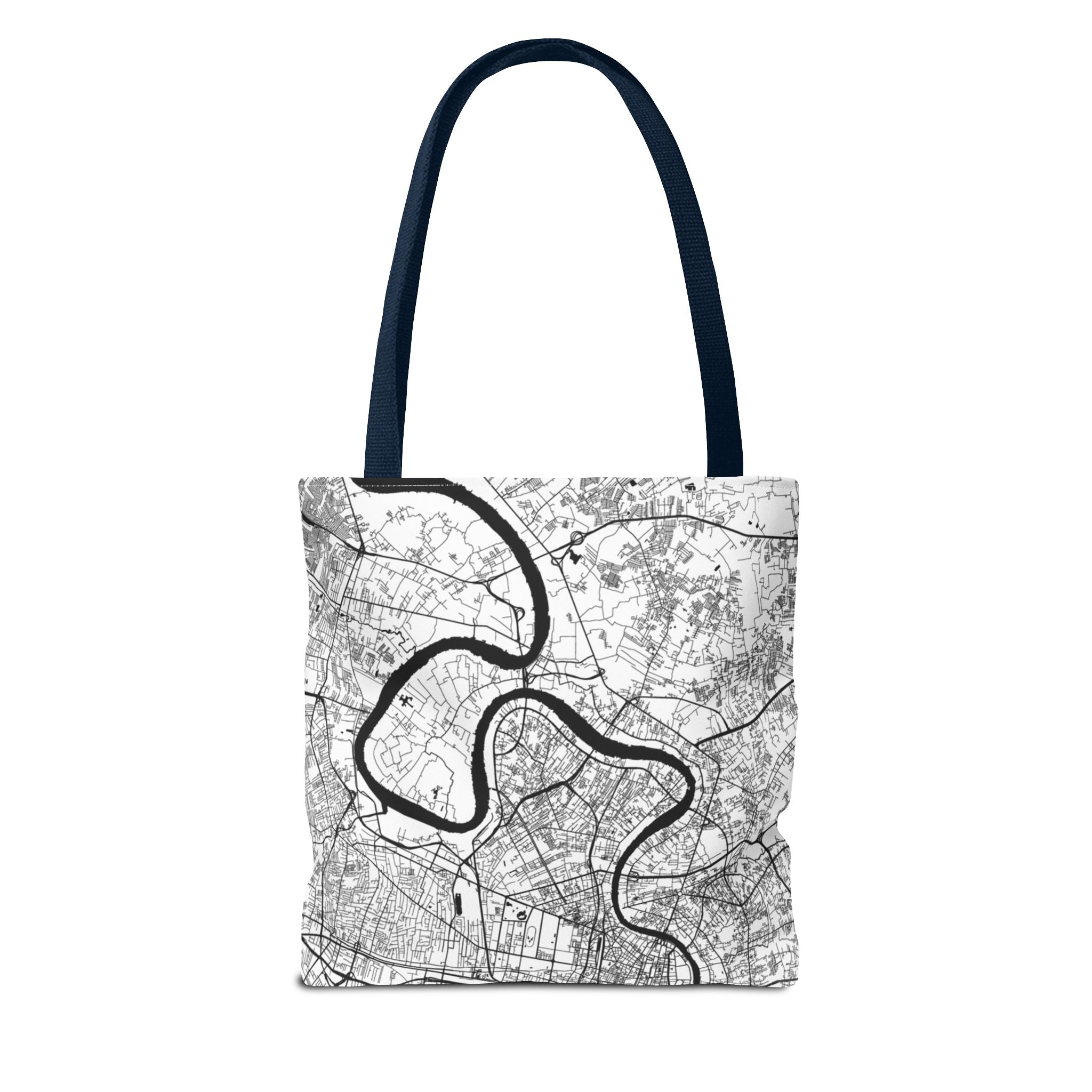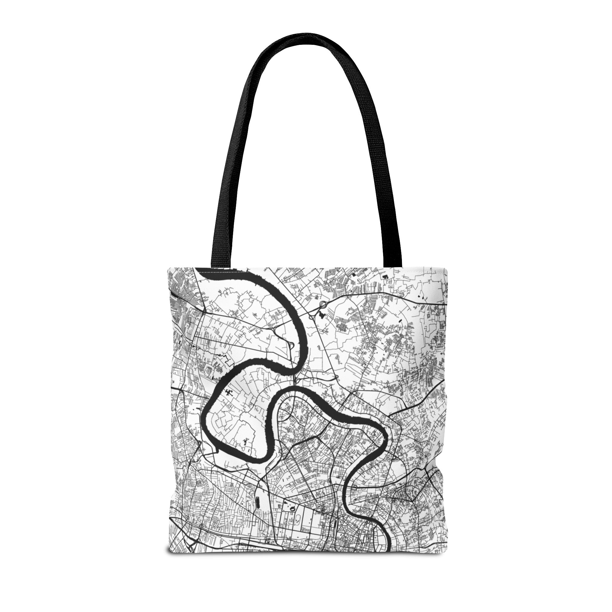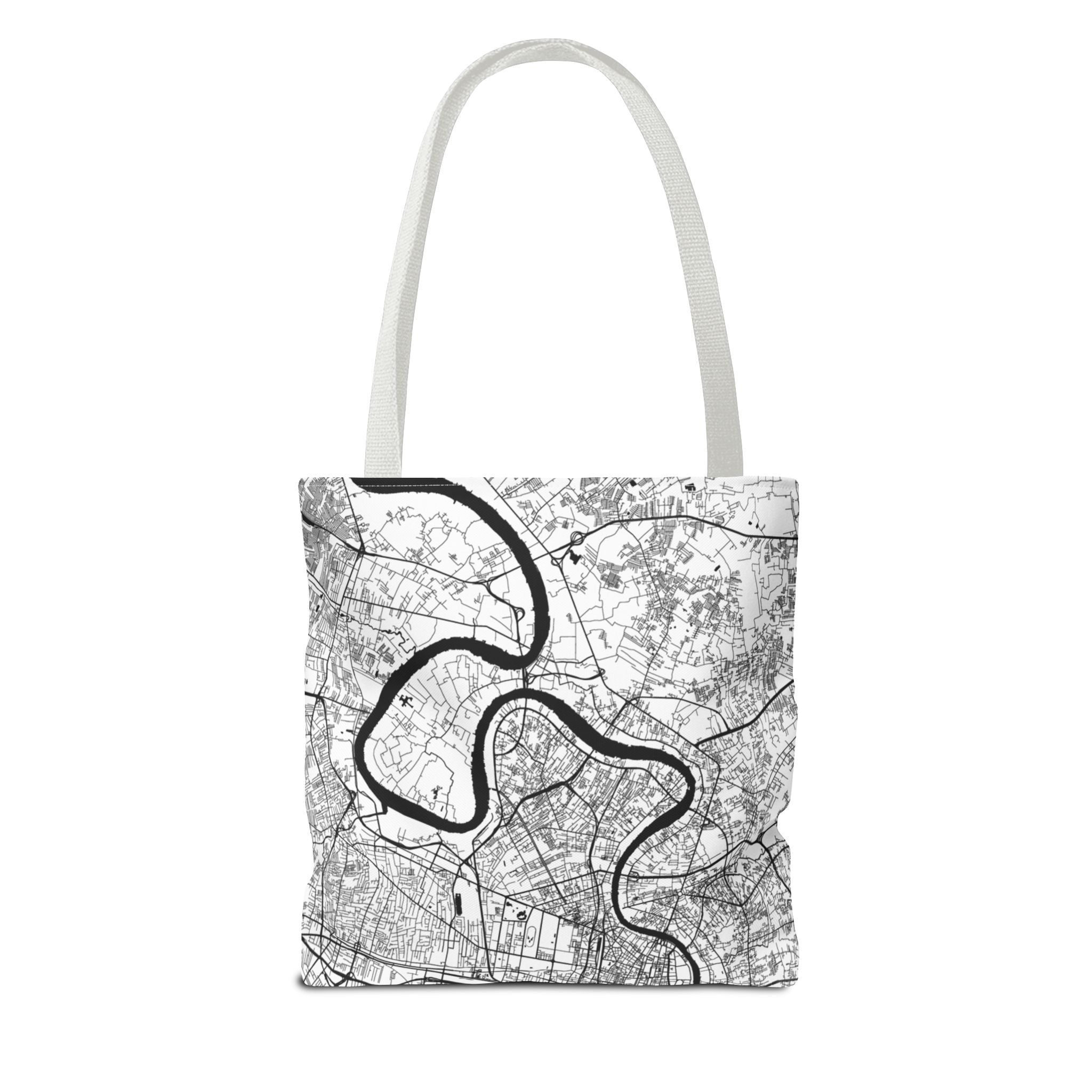 This lightweight yet durable tote is wrapped in a soft monochrome map of Bangkok—its winding canals, river curves, and layered neighborhoods distilled into clean, architectural linework. Subtle from afar yet richly detailed up close, the design pairs effortlessly with denim, outerwear, or weekend casual, while offering a quiet nod to anyone who knows the city’s rhythm.
