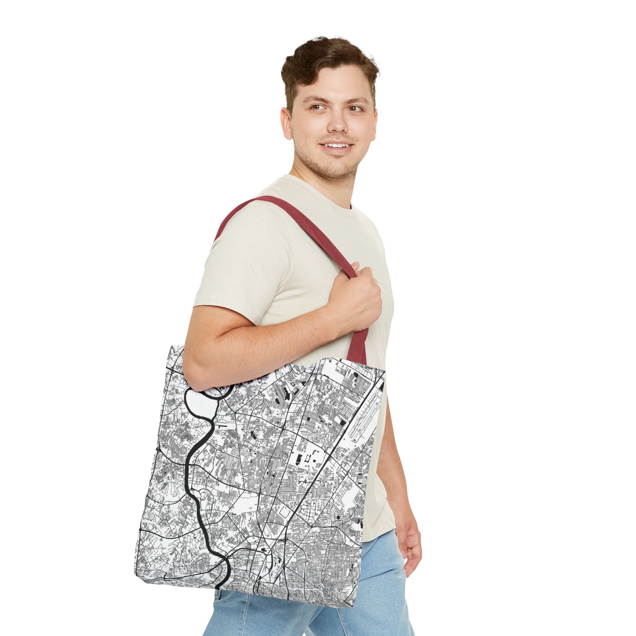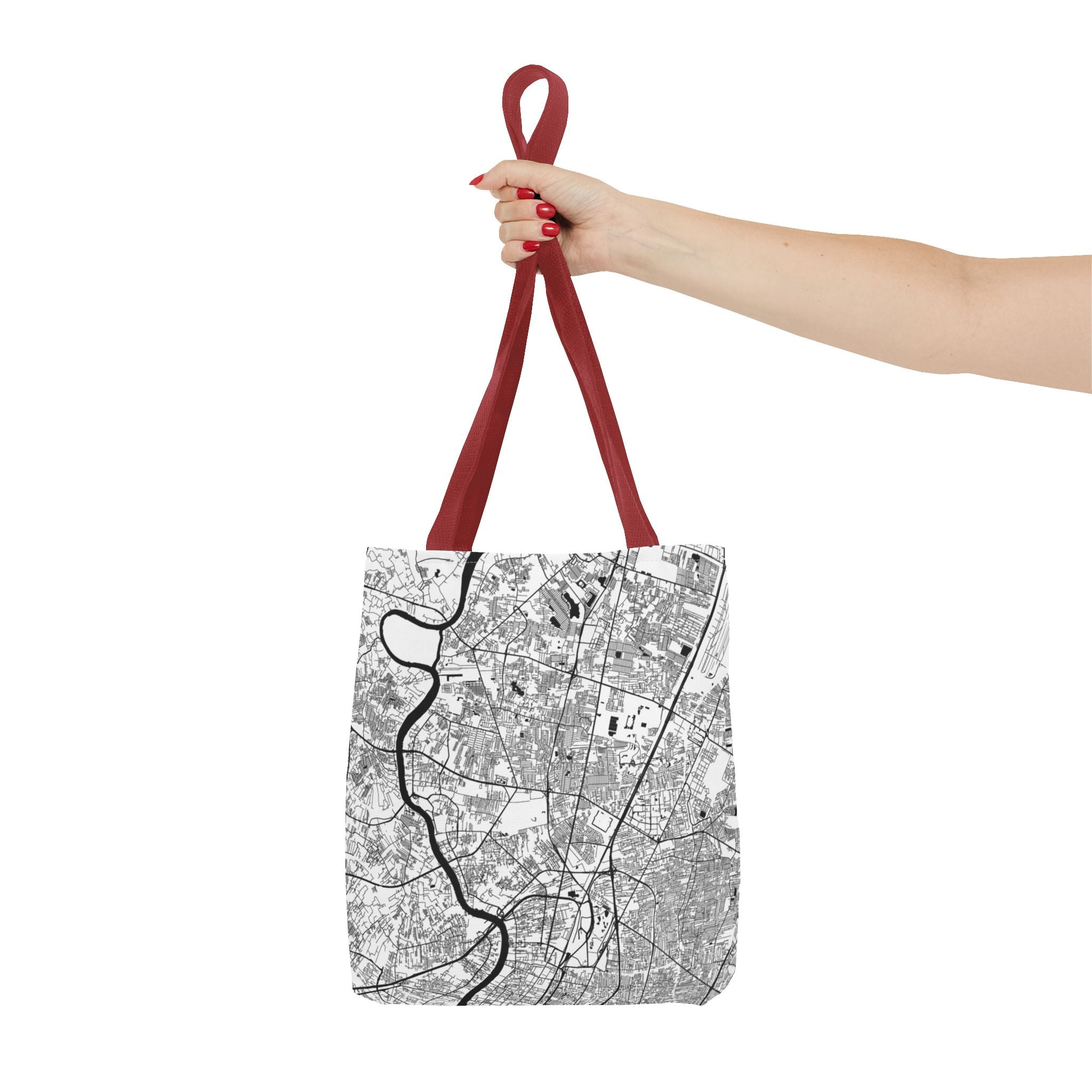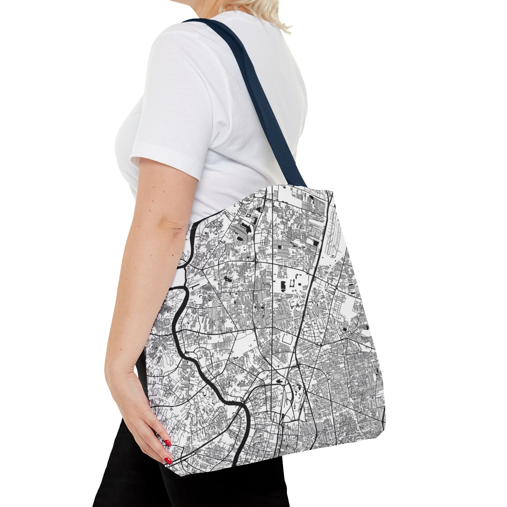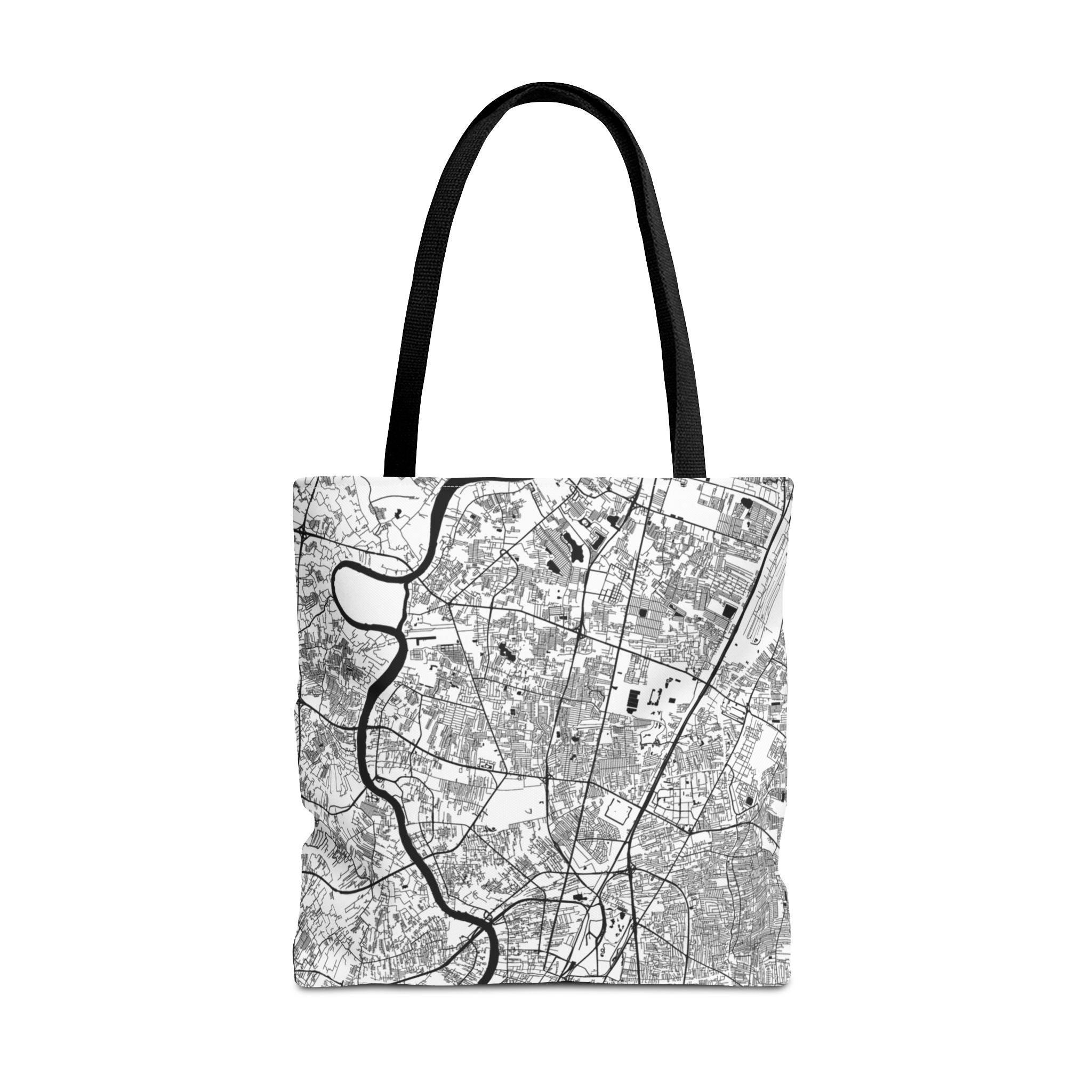 This lightweight yet durable tote is wrapped in a soft monochrome map of Bangkok—its winding canals, river curves, and layered neighborhoods distilled into clean, architectural linework. Subtle from afar yet richly detailed up close, the design pairs effortlessly with denim, outerwear, or weekend casual, while offering a quiet nod to anyone who knows the city’s rhythm.