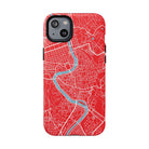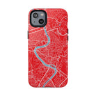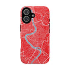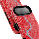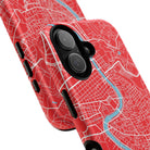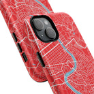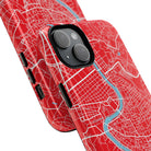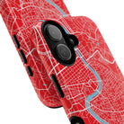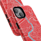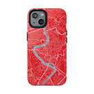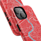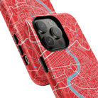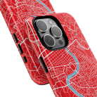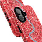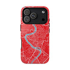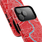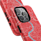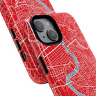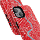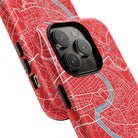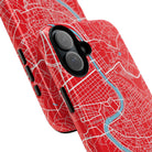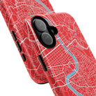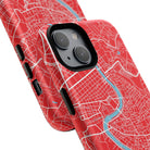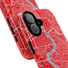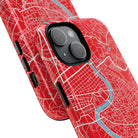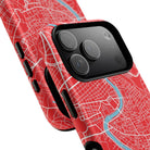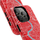 The Rome City Map Magnetic Tough iPhone Case — Red Edition features a detailed street map of Rome rendered in crisp white linework across a vivid red backdrop. The Tiber River winds through the centre of the design, dividing neighbourhoods and historic districts while anchoring the city’s complex network of streets. Ancient pathways, modern avenues, and dense urban blocks intersect across the surface, creating a composition that feels architectural, dynamic, and unmistakably Roman.