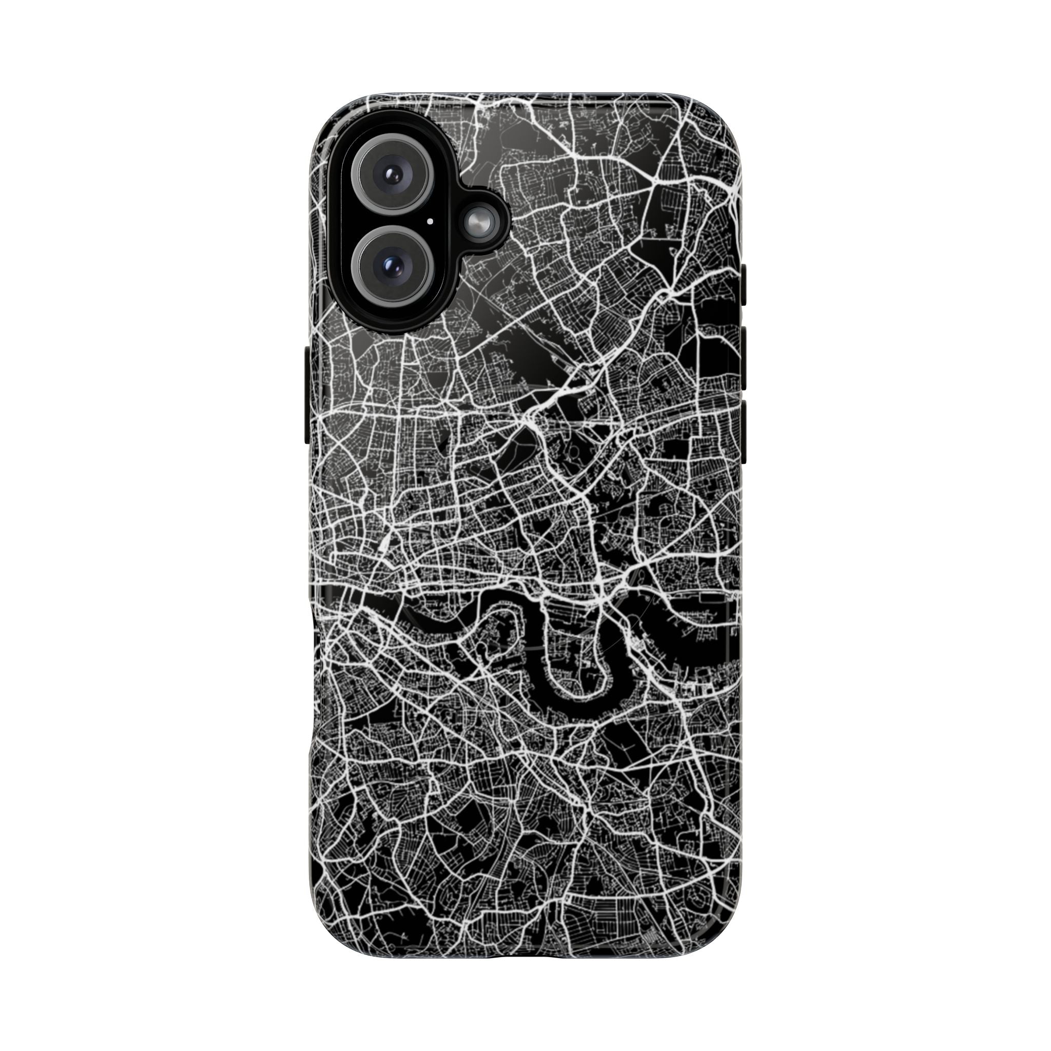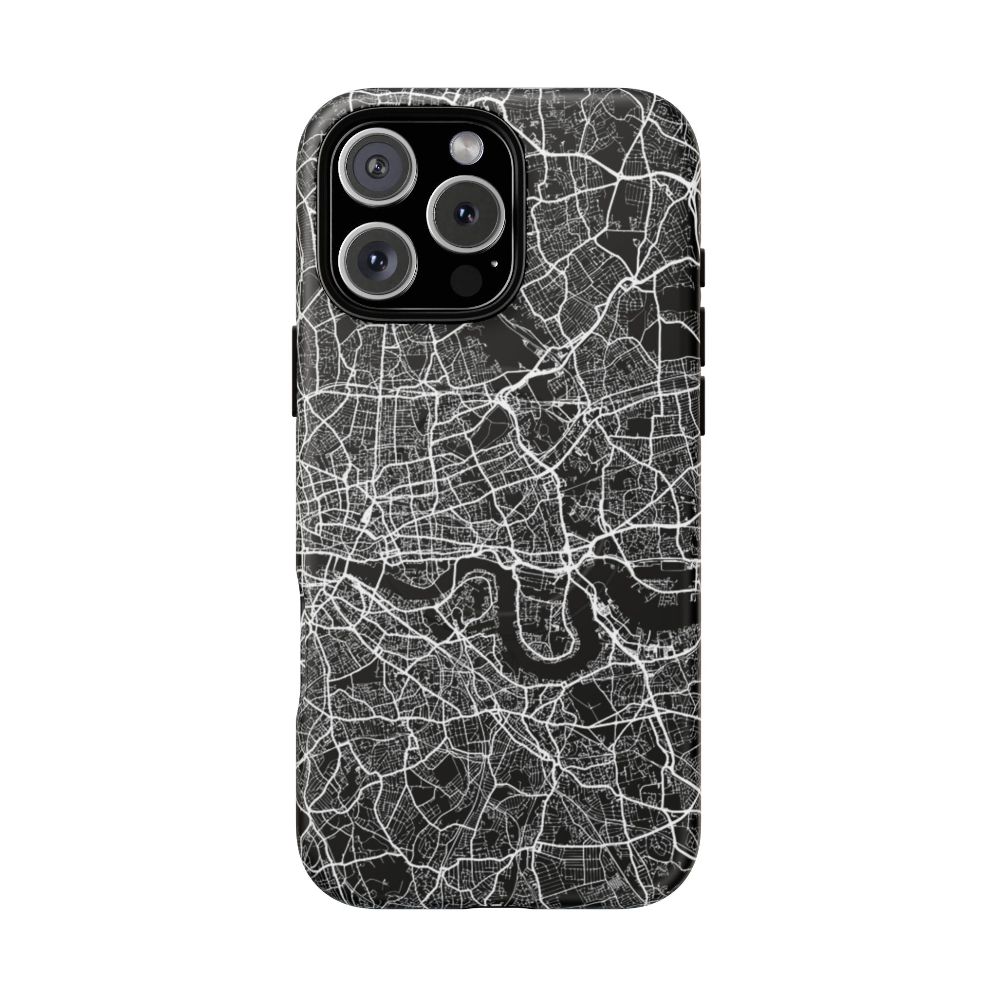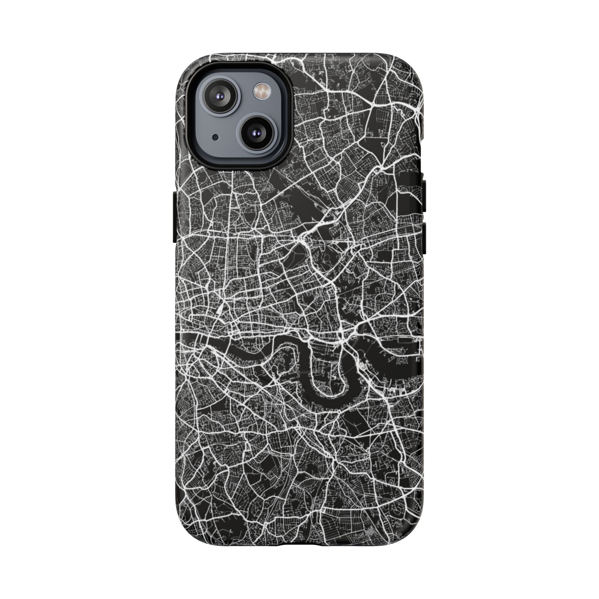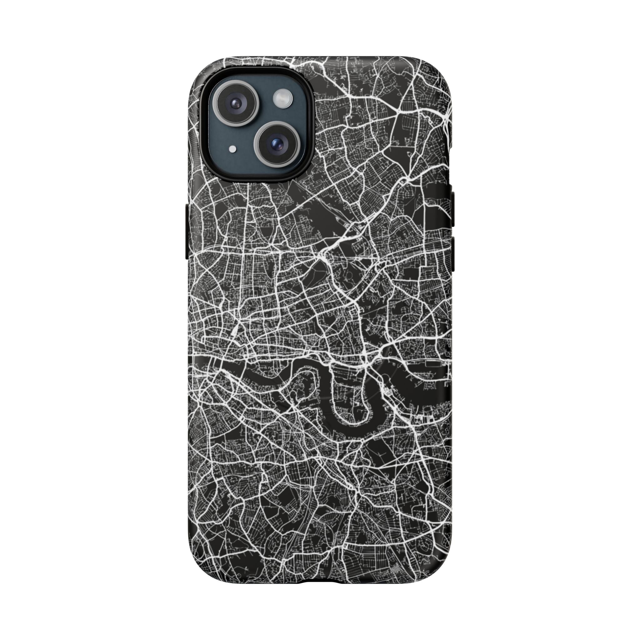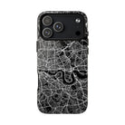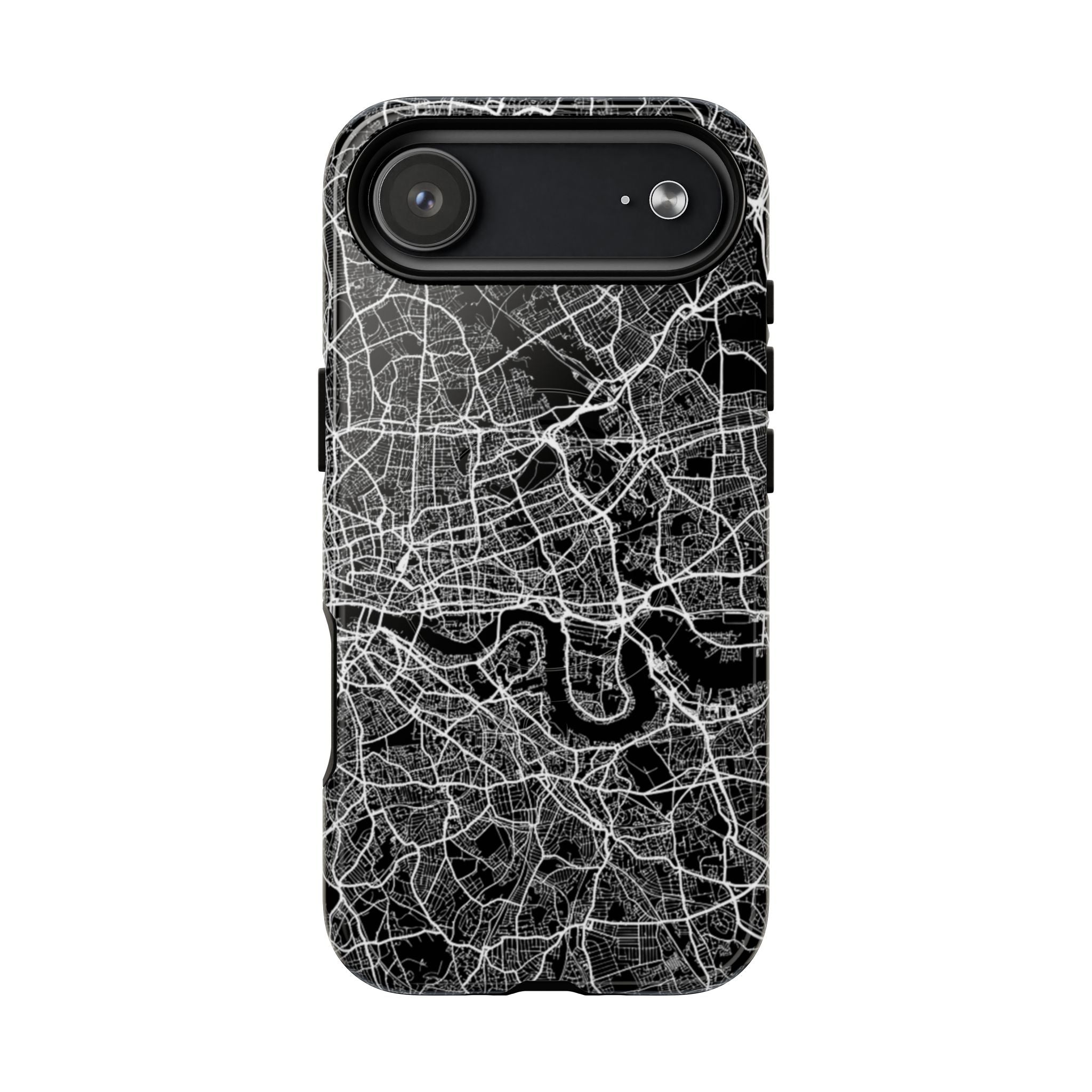 The London Street Map Phone Case – River Edition places the River Thames at the heart of the design. Rendered in striking black and white, this version highlights the sweeping curves of the Thames as it winds through London’s layered streets, bridges, and boroughs. The river cuts boldly through the dense urban network, transforming the city’s geography into a dramatic, architectural composition.