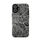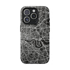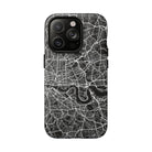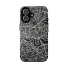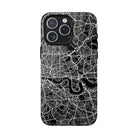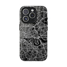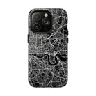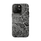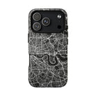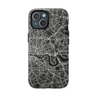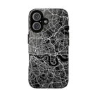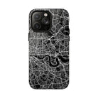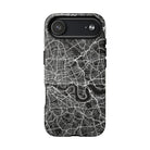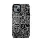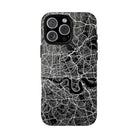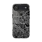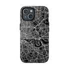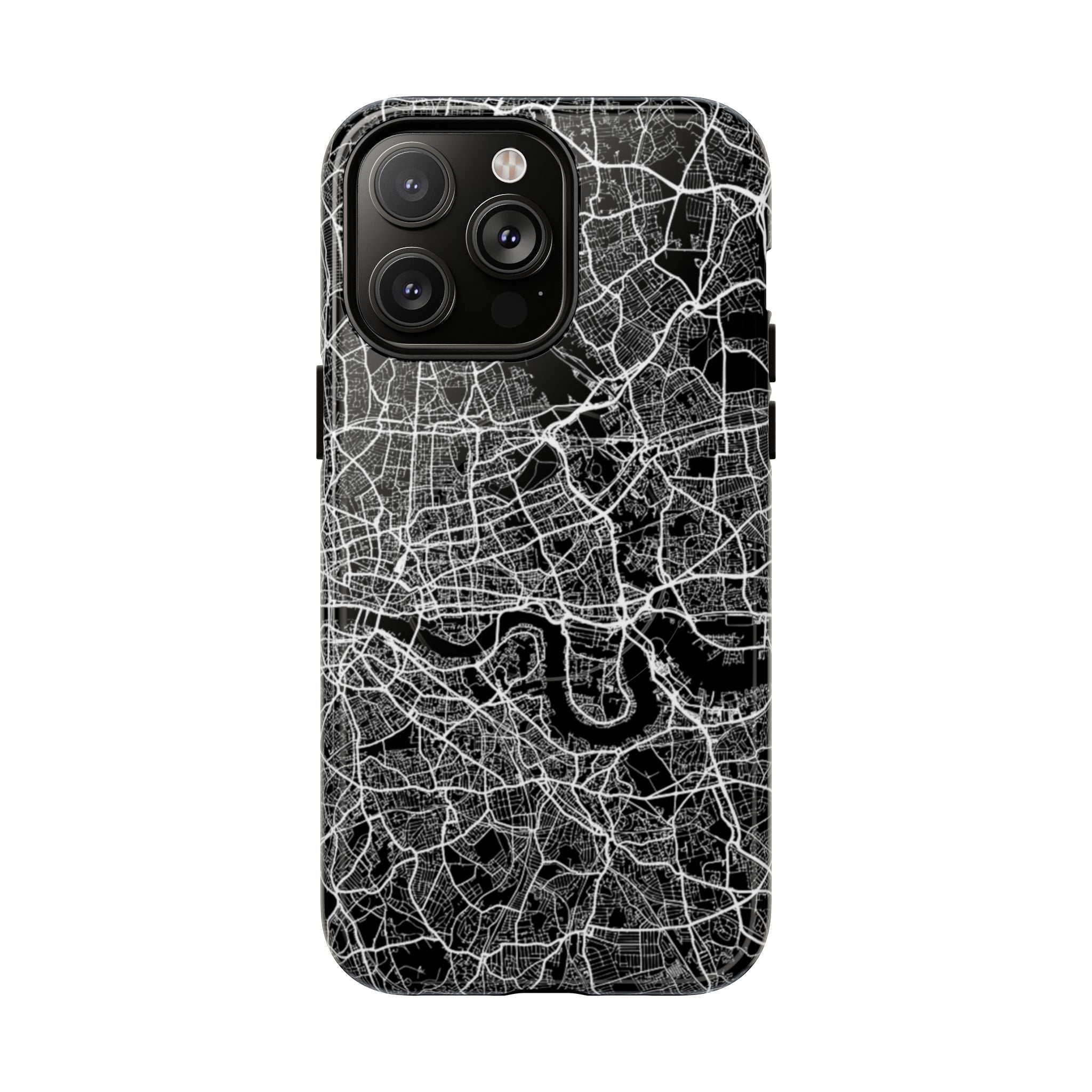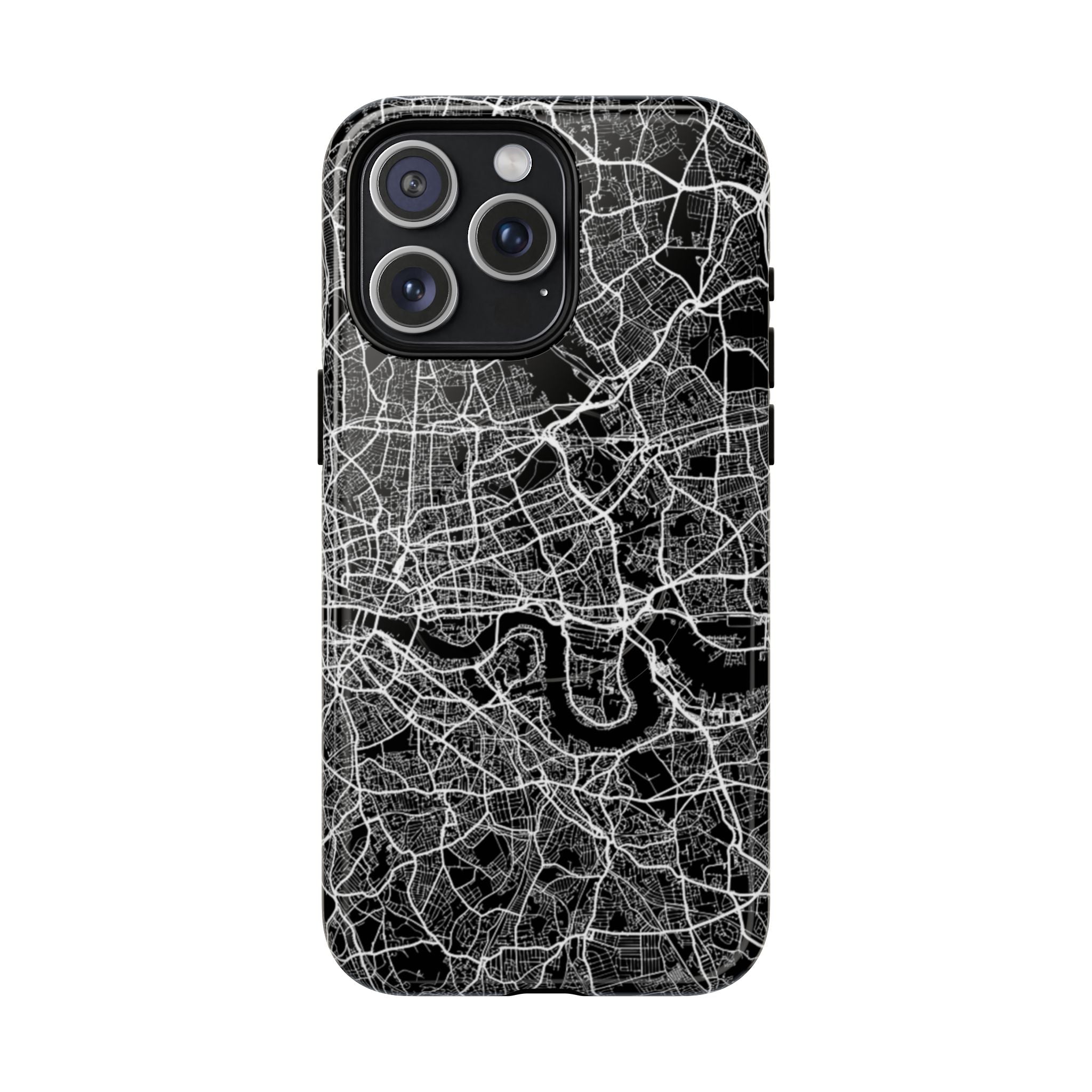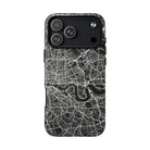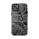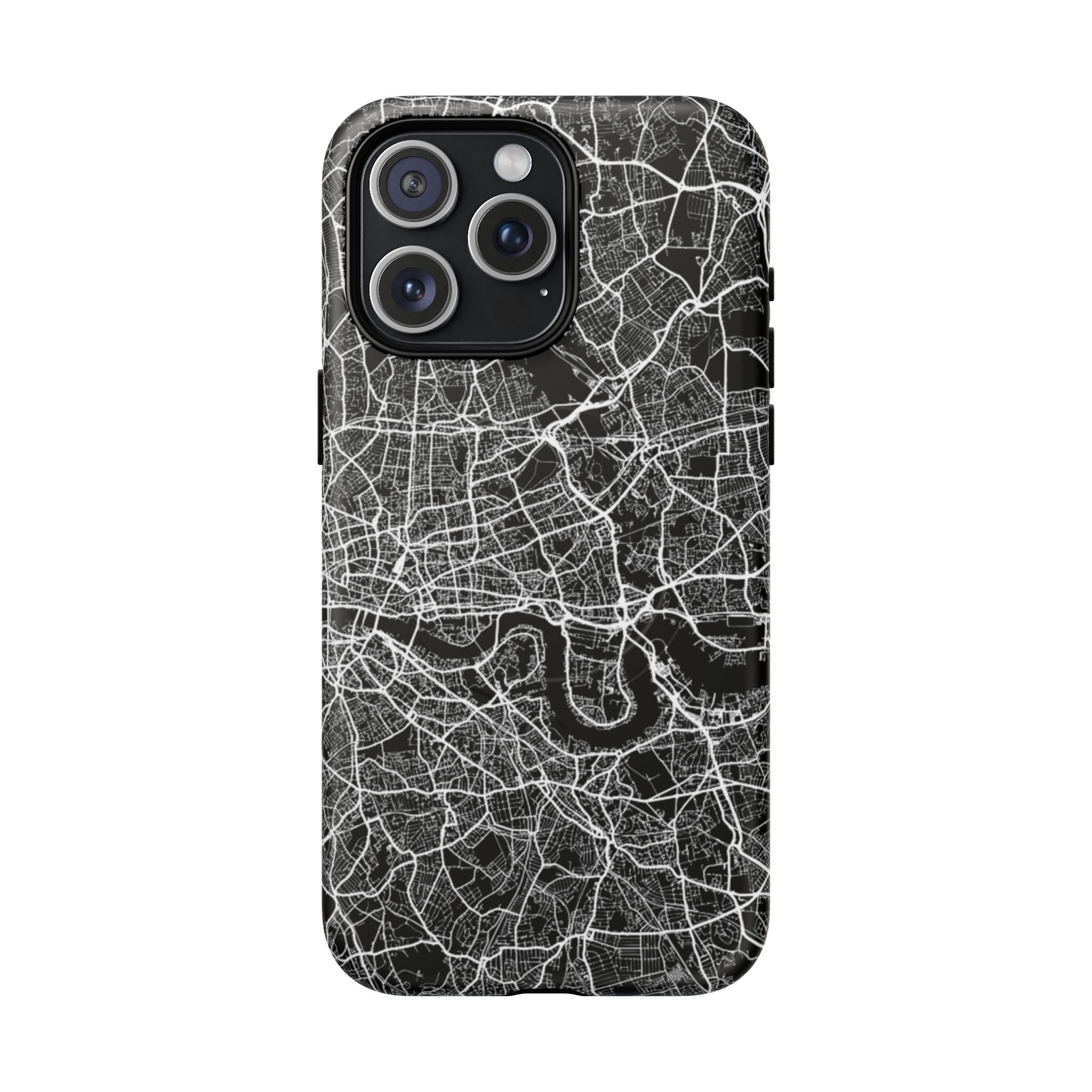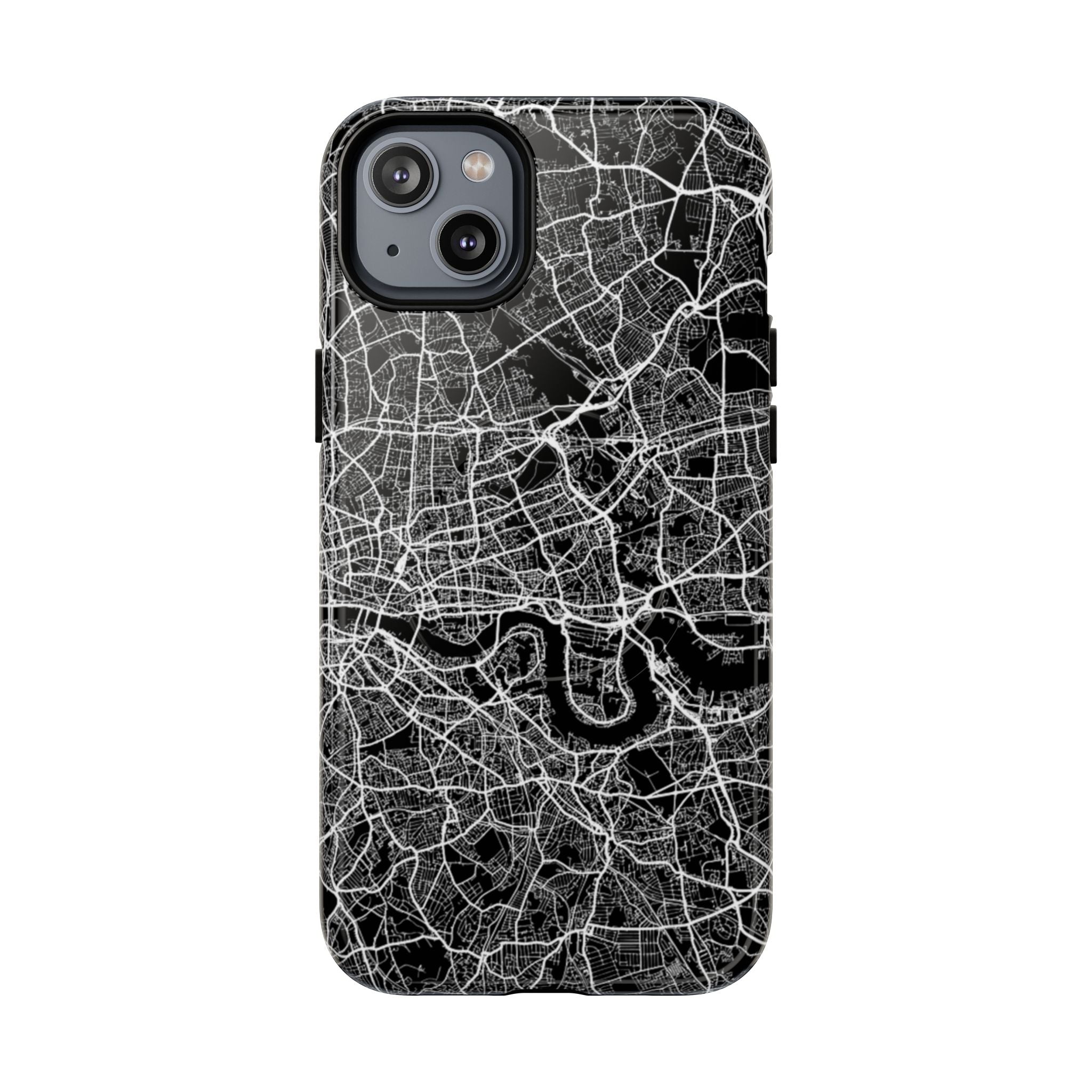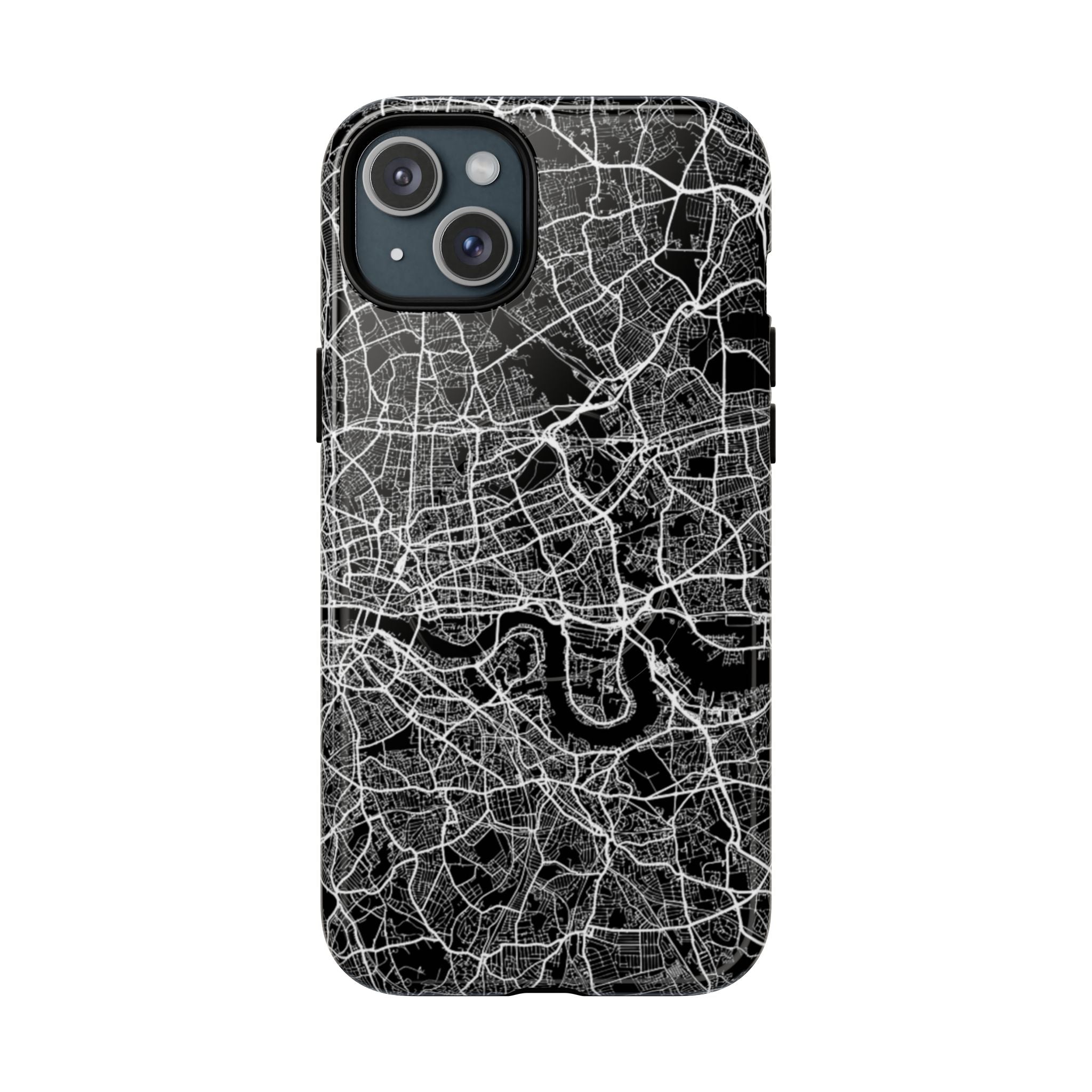 The London Street Map Phone Case – River Edition places the River Thames at the heart of the design. Rendered in striking black and white, this version highlights the sweeping curves of the Thames as it winds through London’s layered streets, bridges, and boroughs. The river cuts boldly through the dense urban network, transforming the city’s geography into a dramatic, architectural composition.