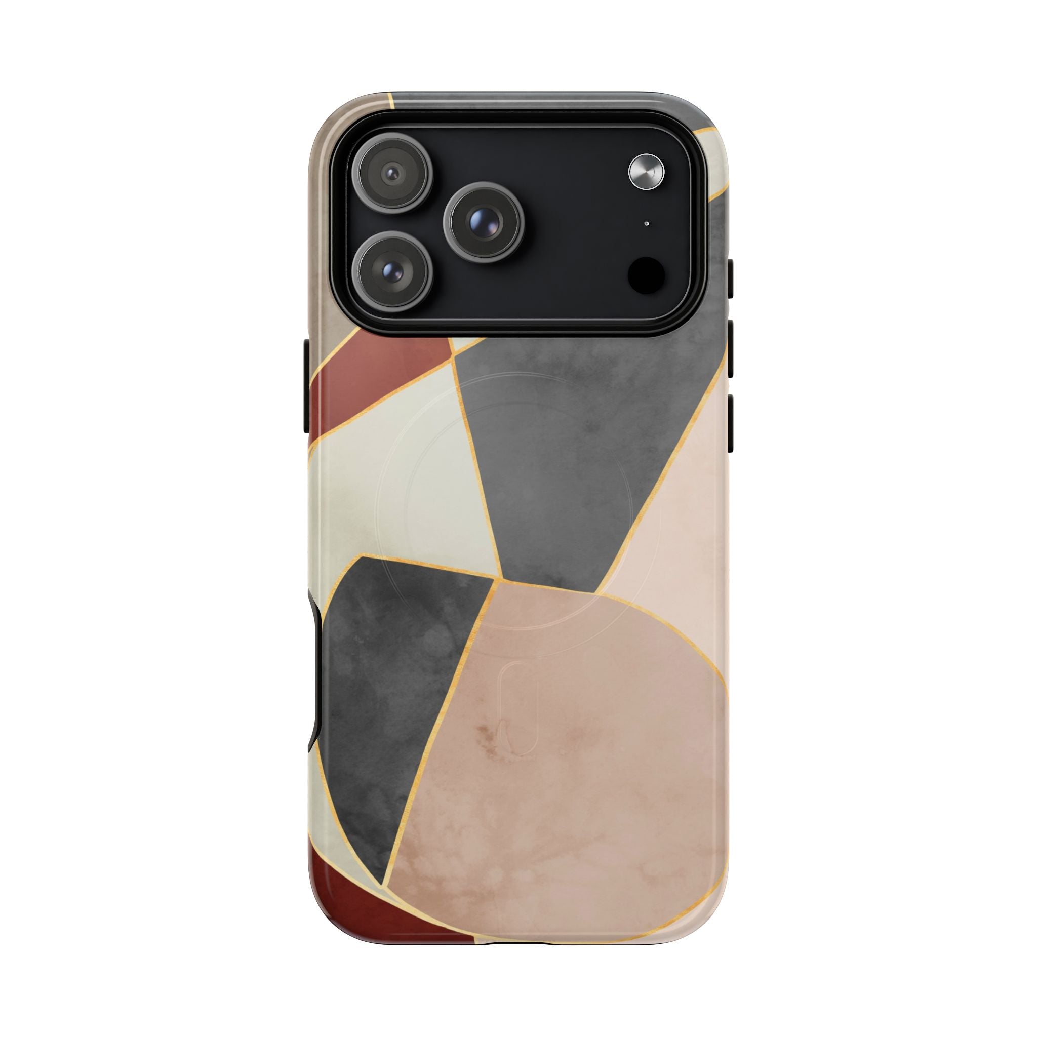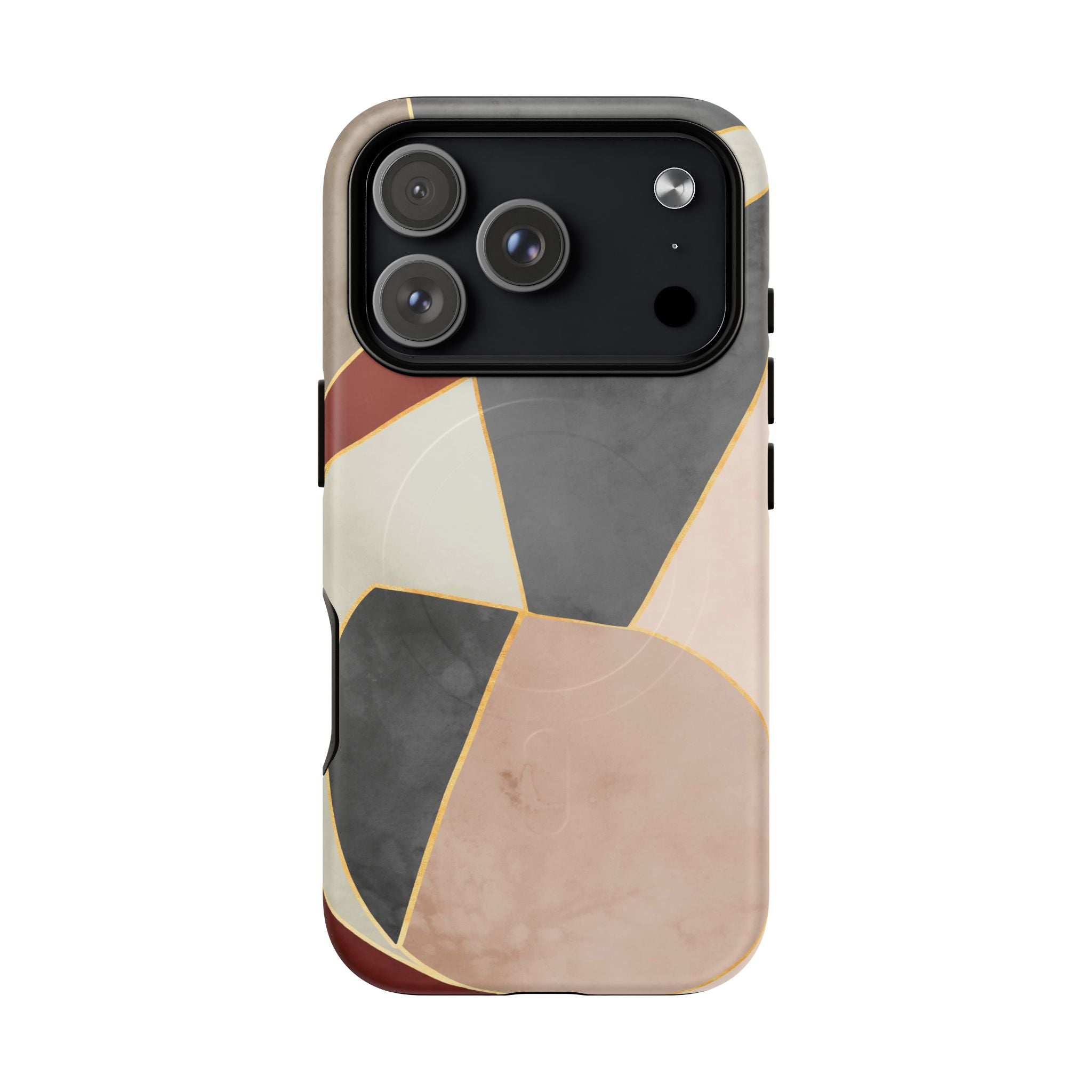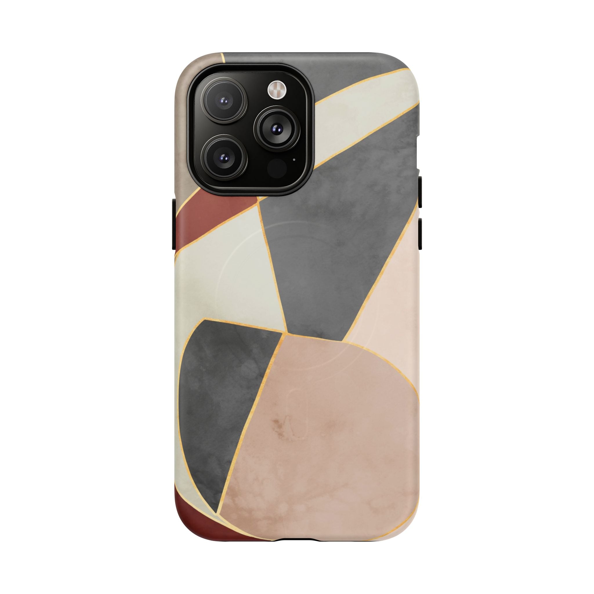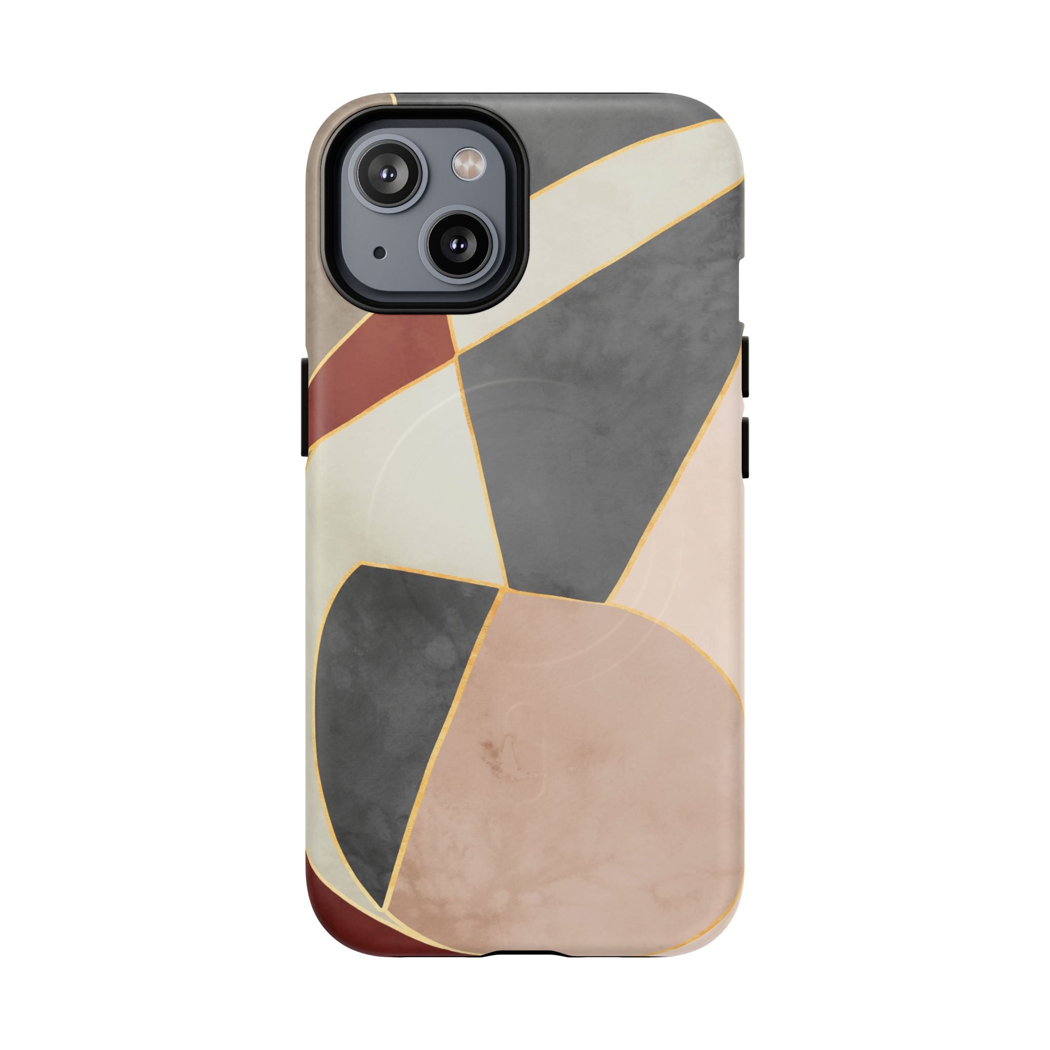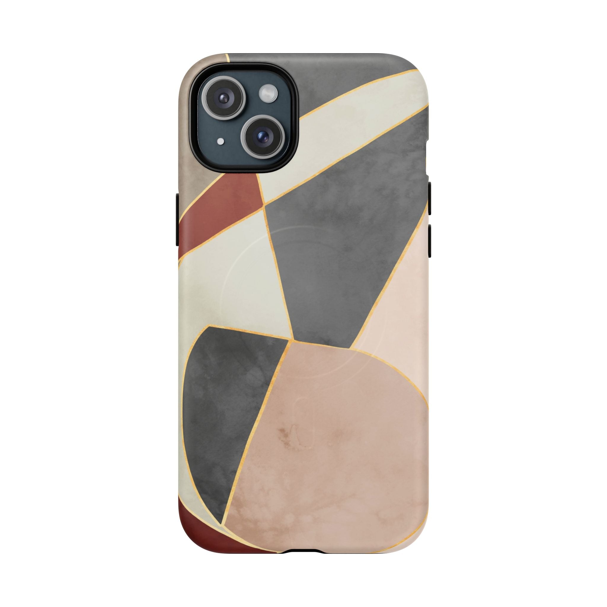 This ANTIPODE Abstract Phone Case from the Modern Art Edition features intersecting shapes in warm blush, charcoal grey, muted clay, and soft cream — all outlined with delicate golden accents that feel quietly luxurious. The painterly textures and softened angular forms create a calm, sculptural rhythm, blending modernist geometry with a warm, contemporary aesthetic. The result is a balanced, elegant composition that feels like a piece of gallery art in motion.