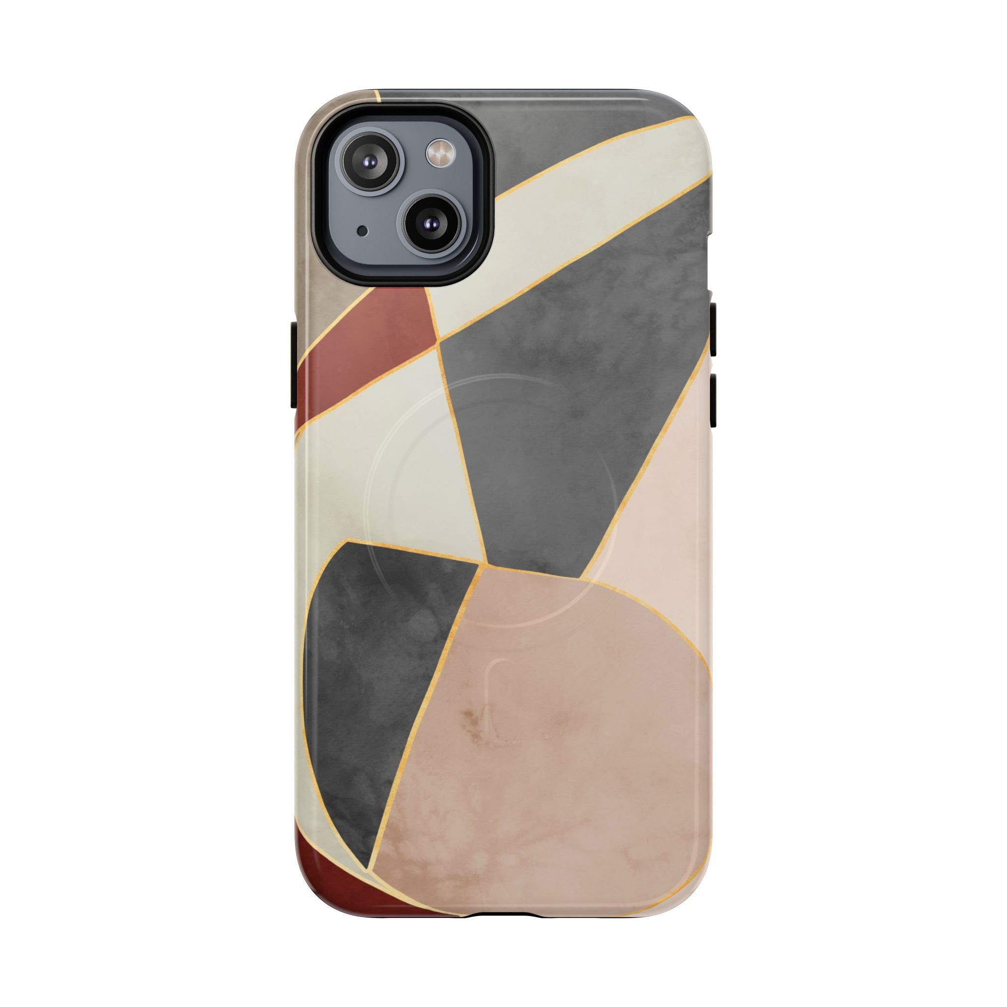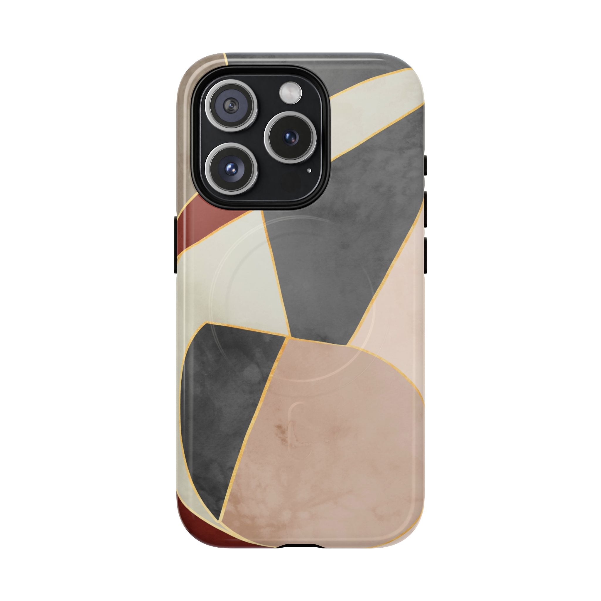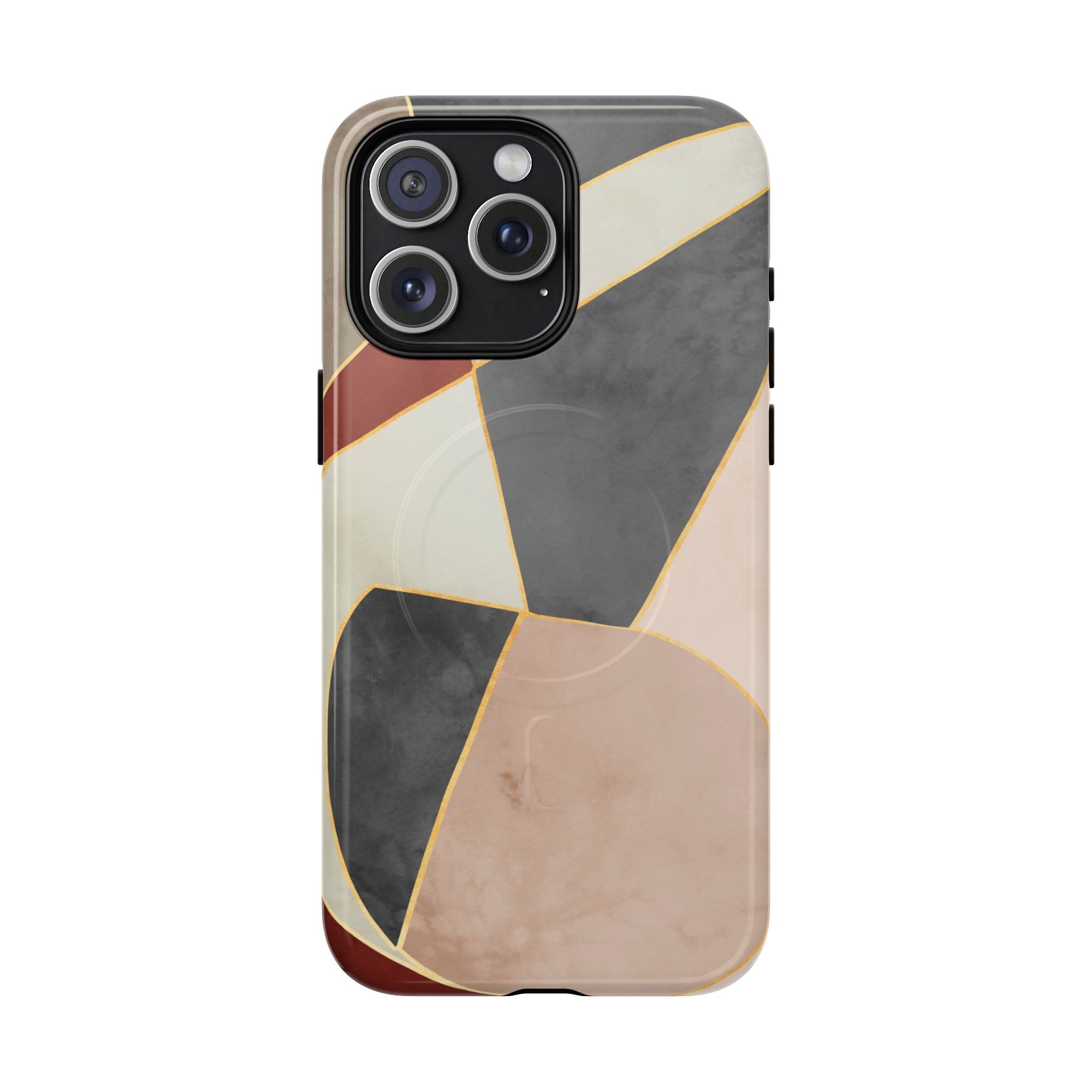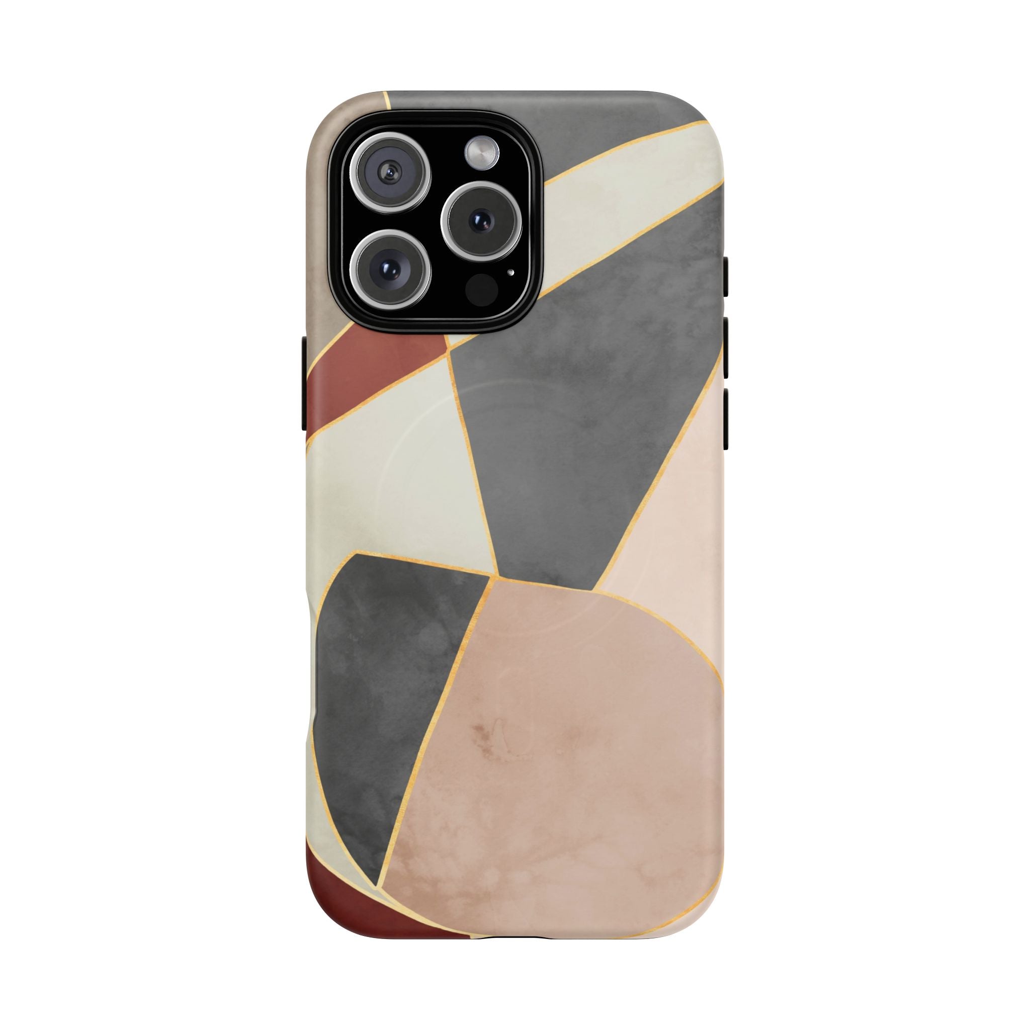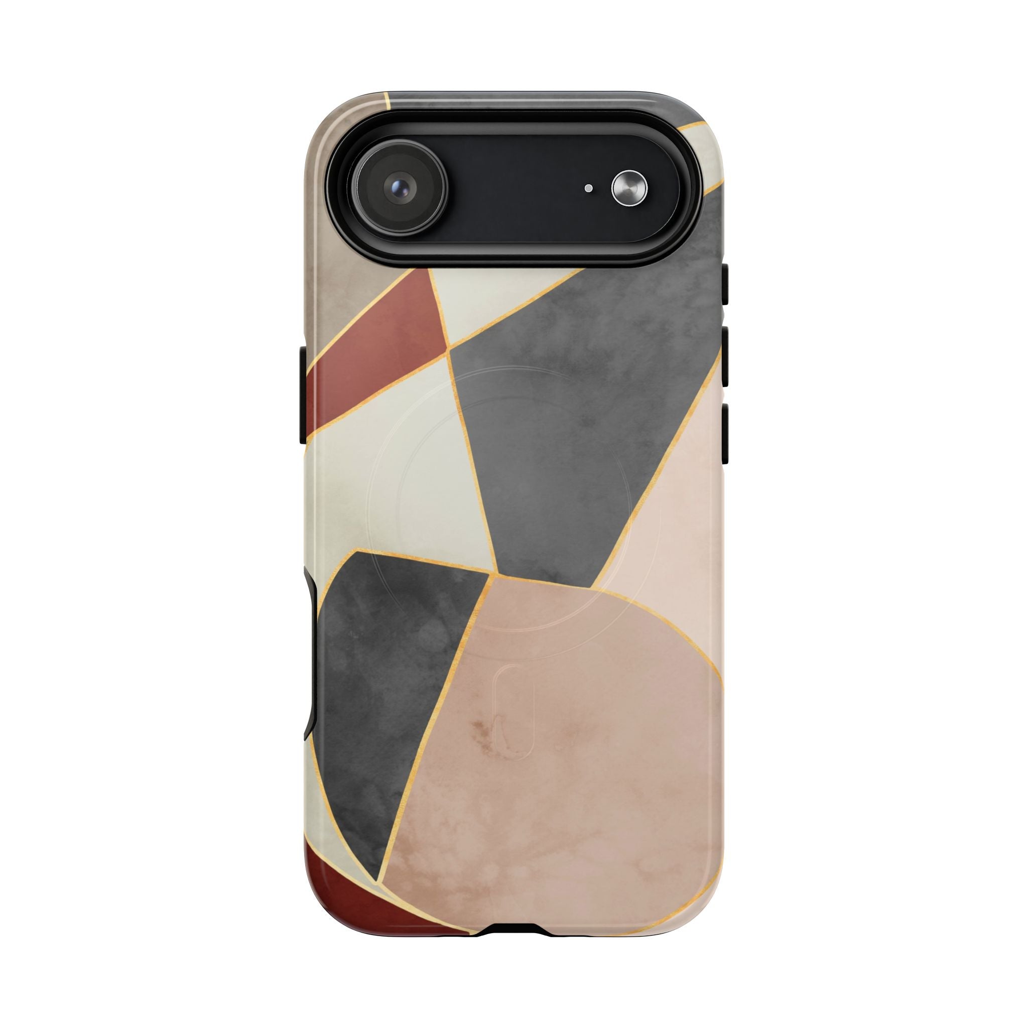 This ANTIPODE Abstract Phone Case from the Modern Art Edition features intersecting shapes in warm blush, charcoal grey, muted clay, and soft cream — all outlined with delicate golden accents that feel quietly luxurious. The painterly textures and softened angular forms create a calm, sculptural rhythm, blending modernist geometry with a warm, contemporary aesthetic. The result is a balanced, elegant composition that feels like a piece of gallery art in motion.
