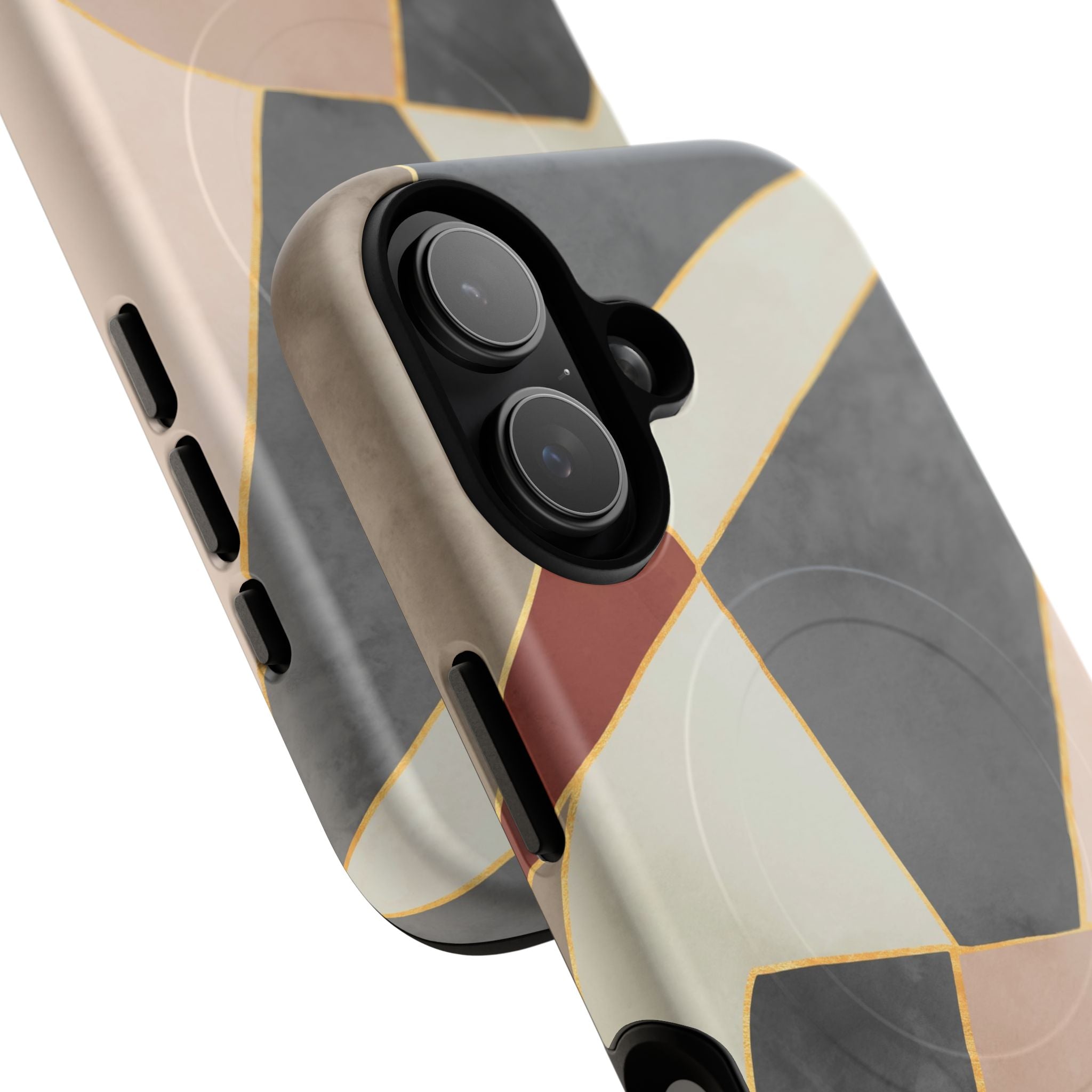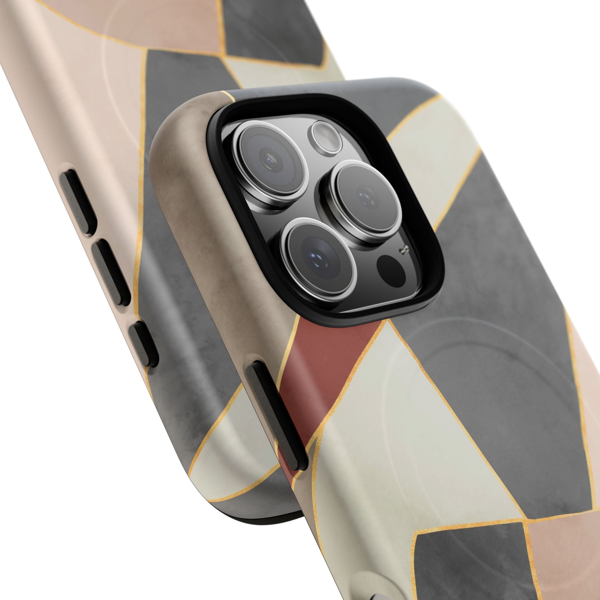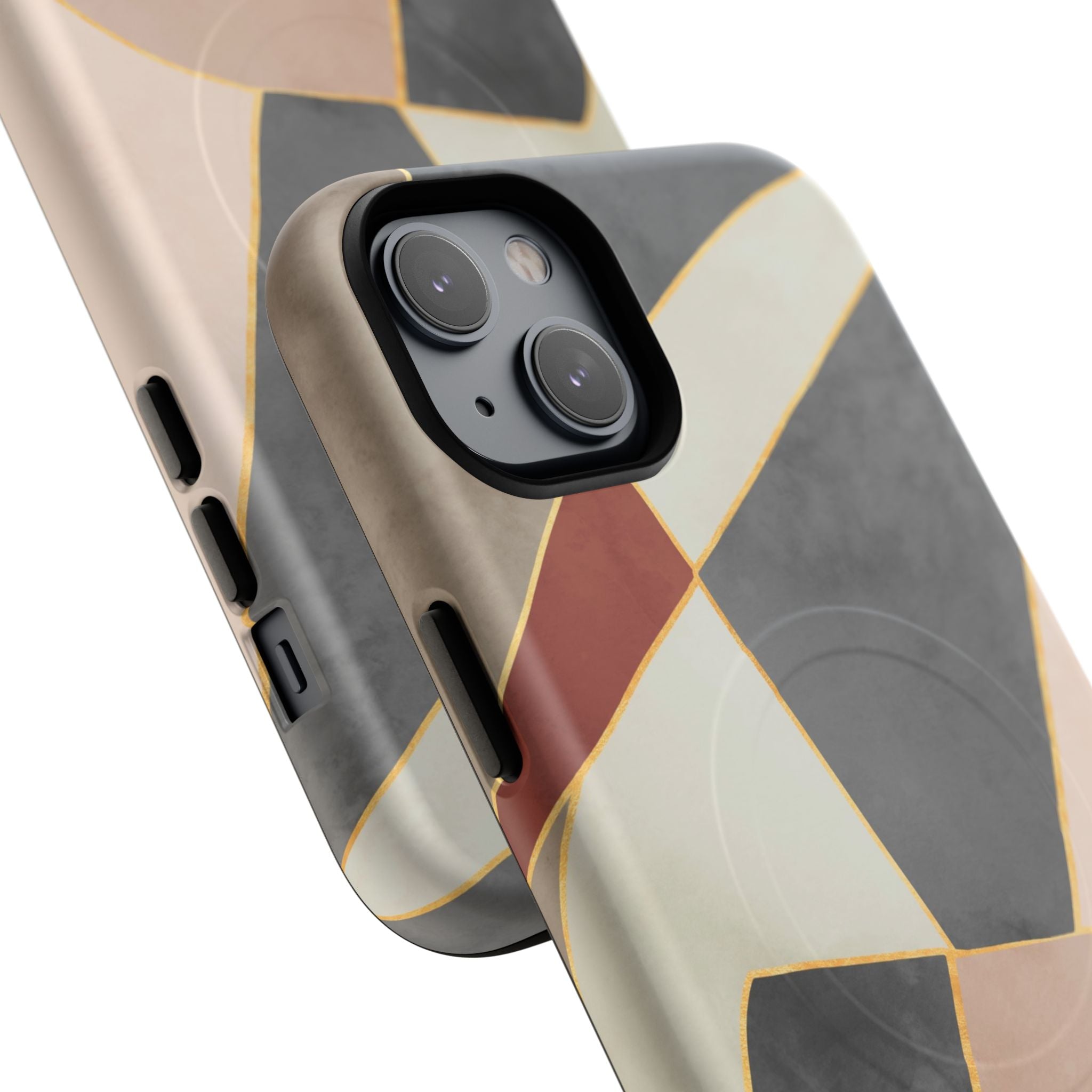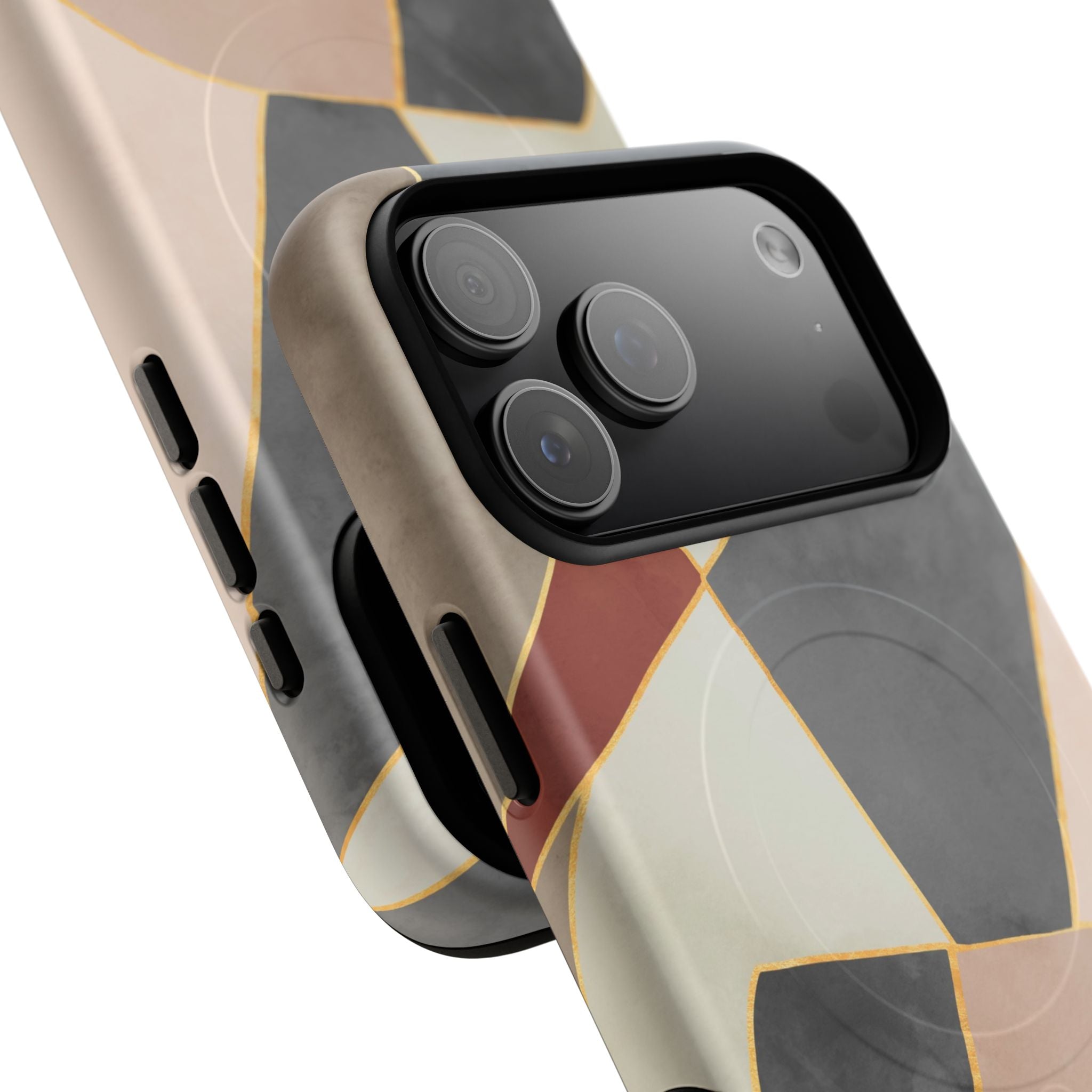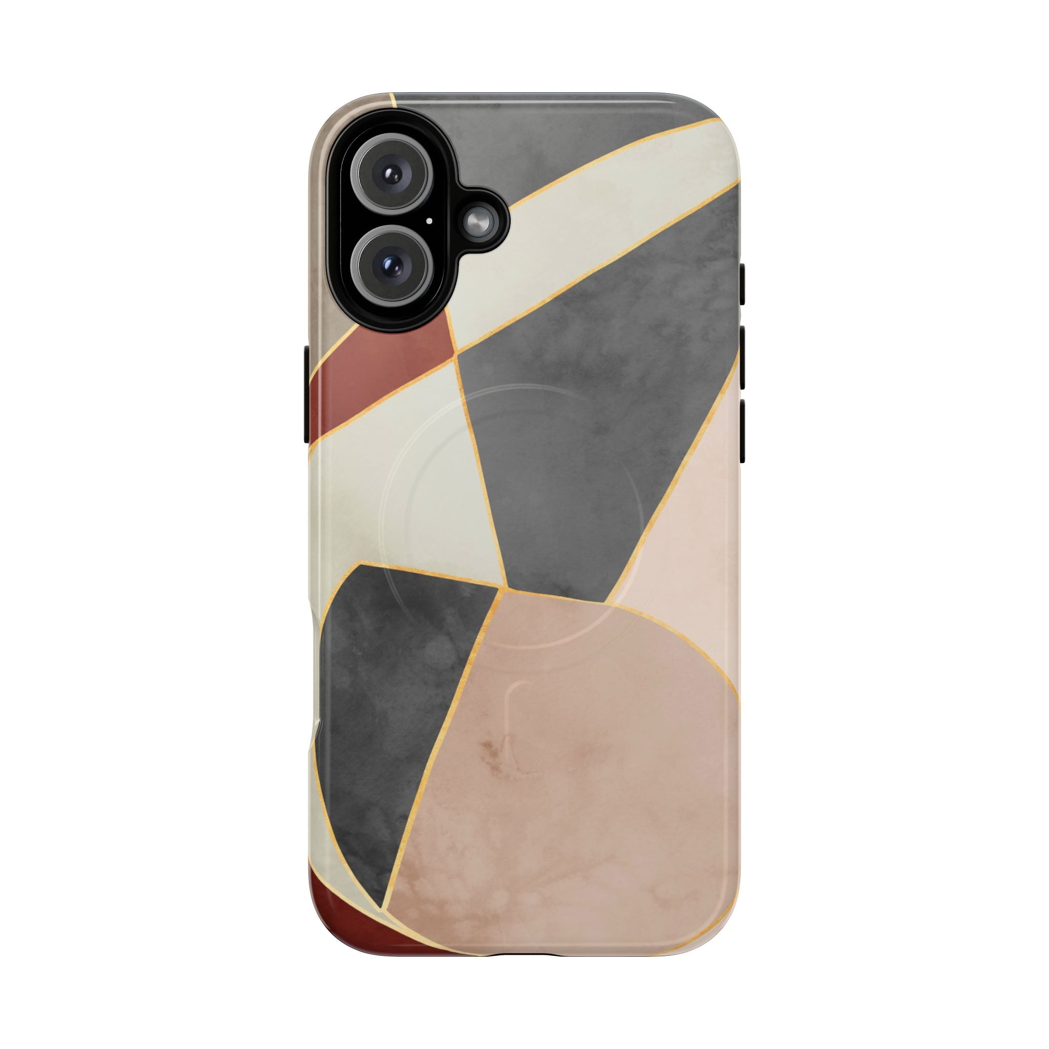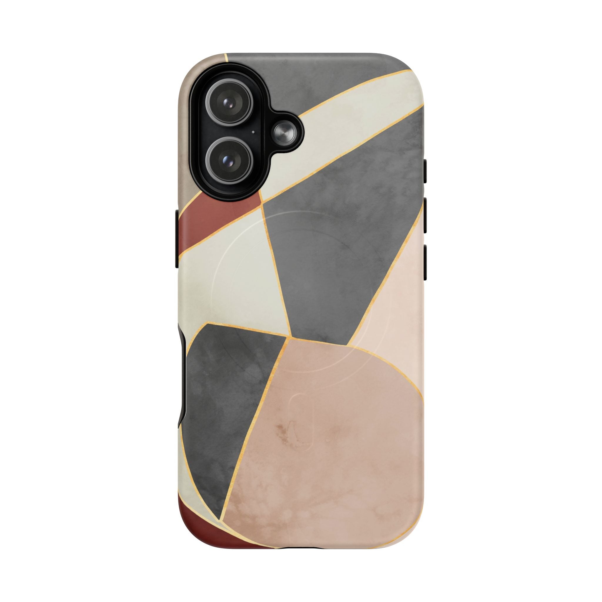 This ANTIPODE Abstract Phone Case from the Modern Art Edition features intersecting shapes in warm blush, charcoal grey, muted clay, and soft cream — all outlined with delicate golden accents that feel quietly luxurious. The painterly textures and softened angular forms create a calm, sculptural rhythm, blending modernist geometry with a warm, contemporary aesthetic. The result is a balanced, elegant composition that feels like a piece of gallery art in motion.