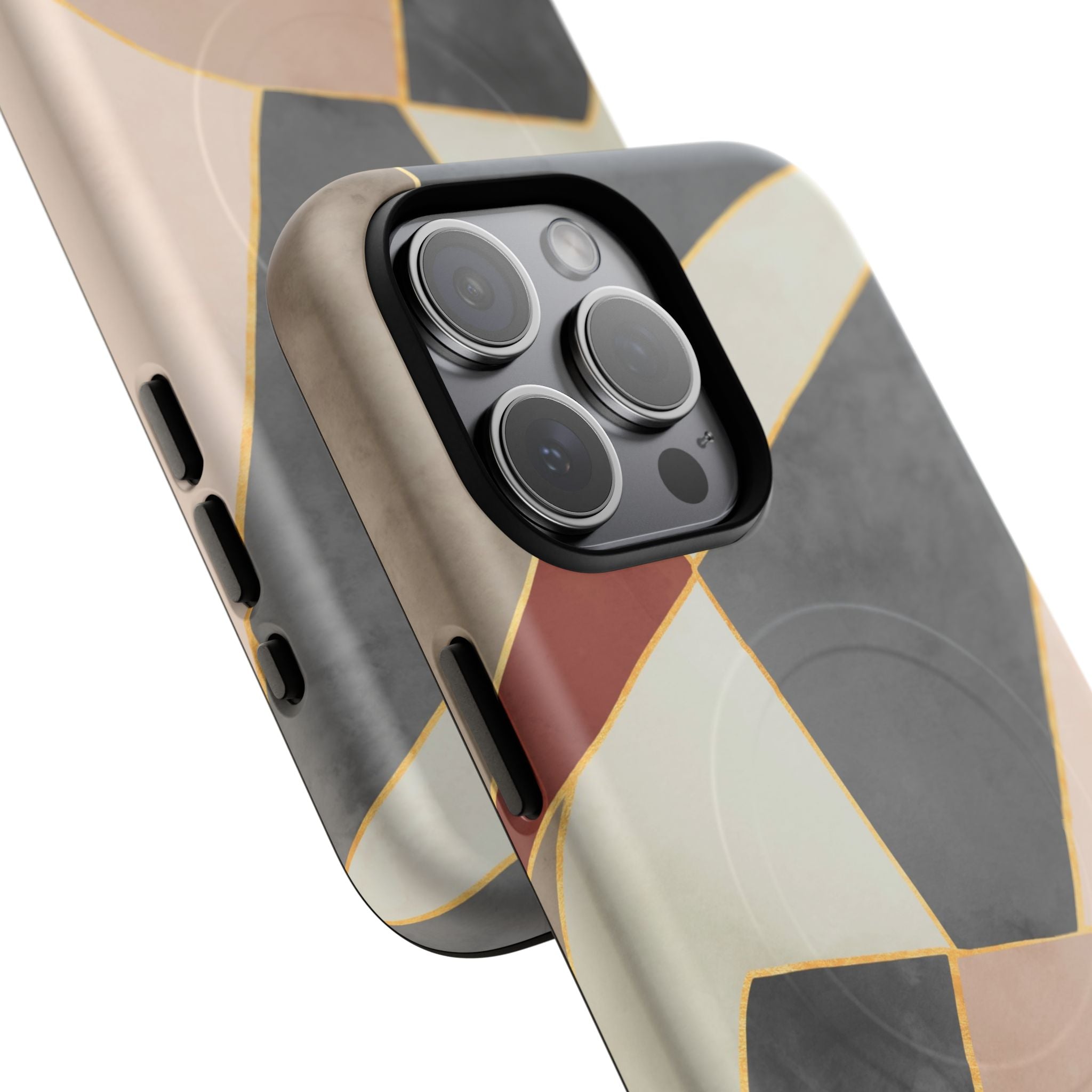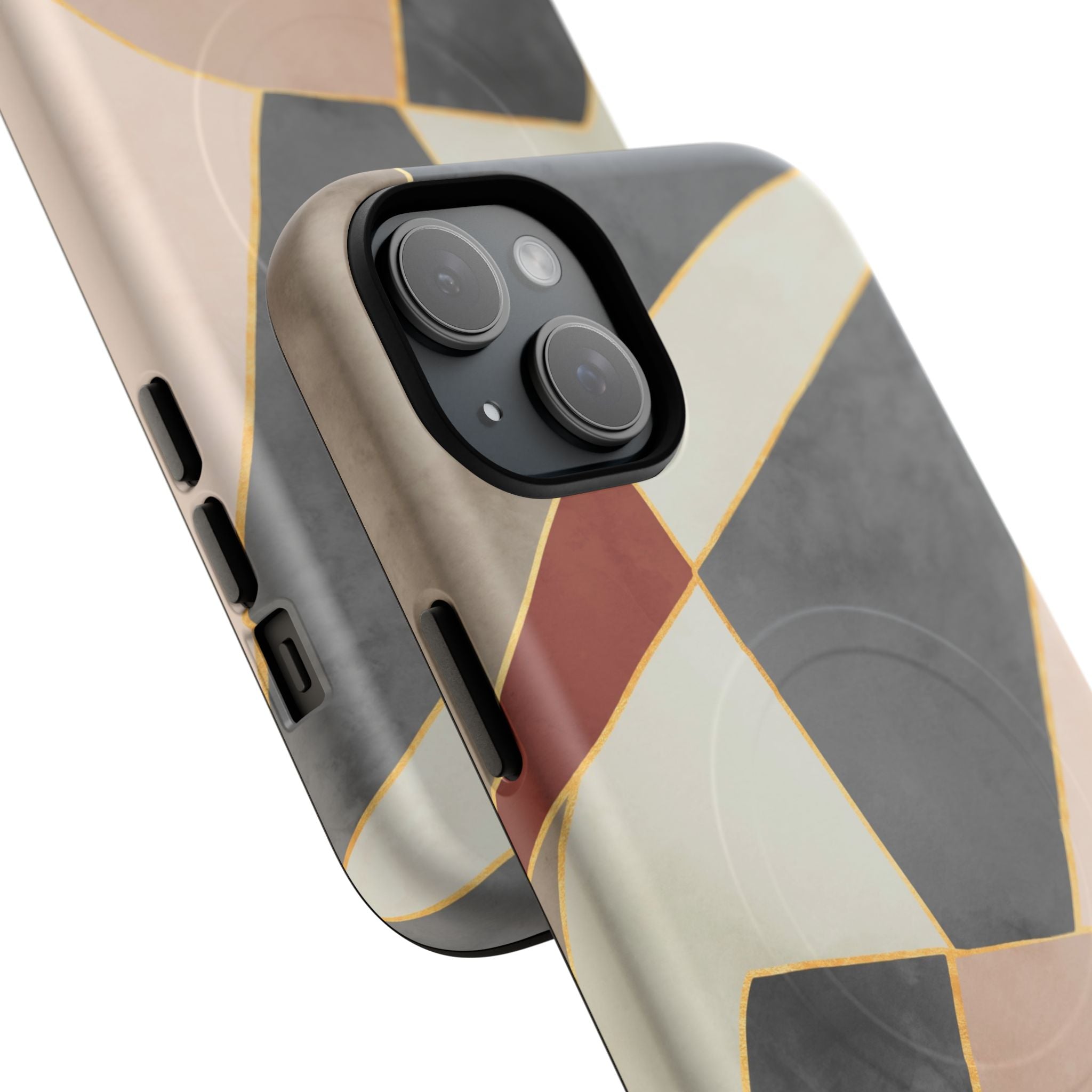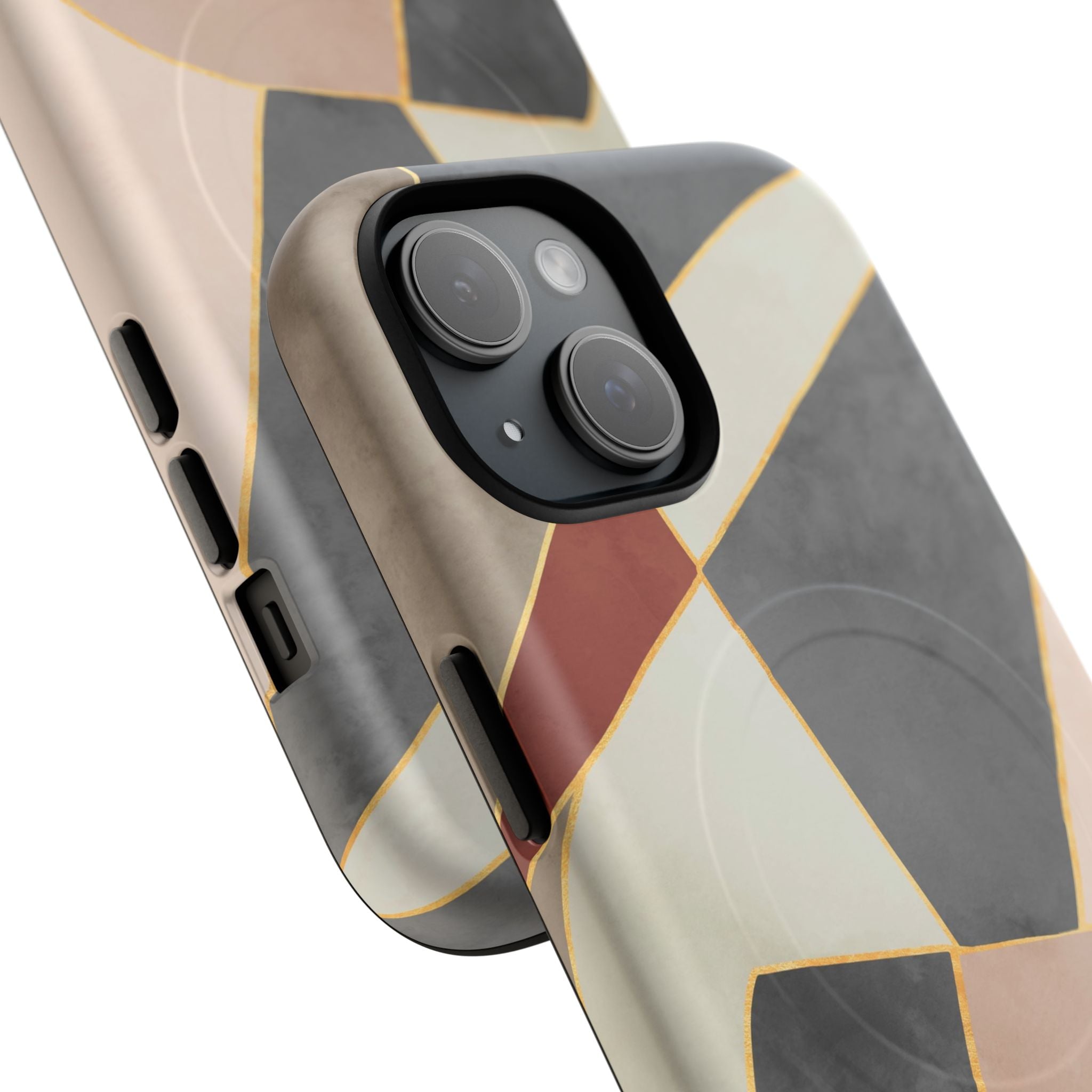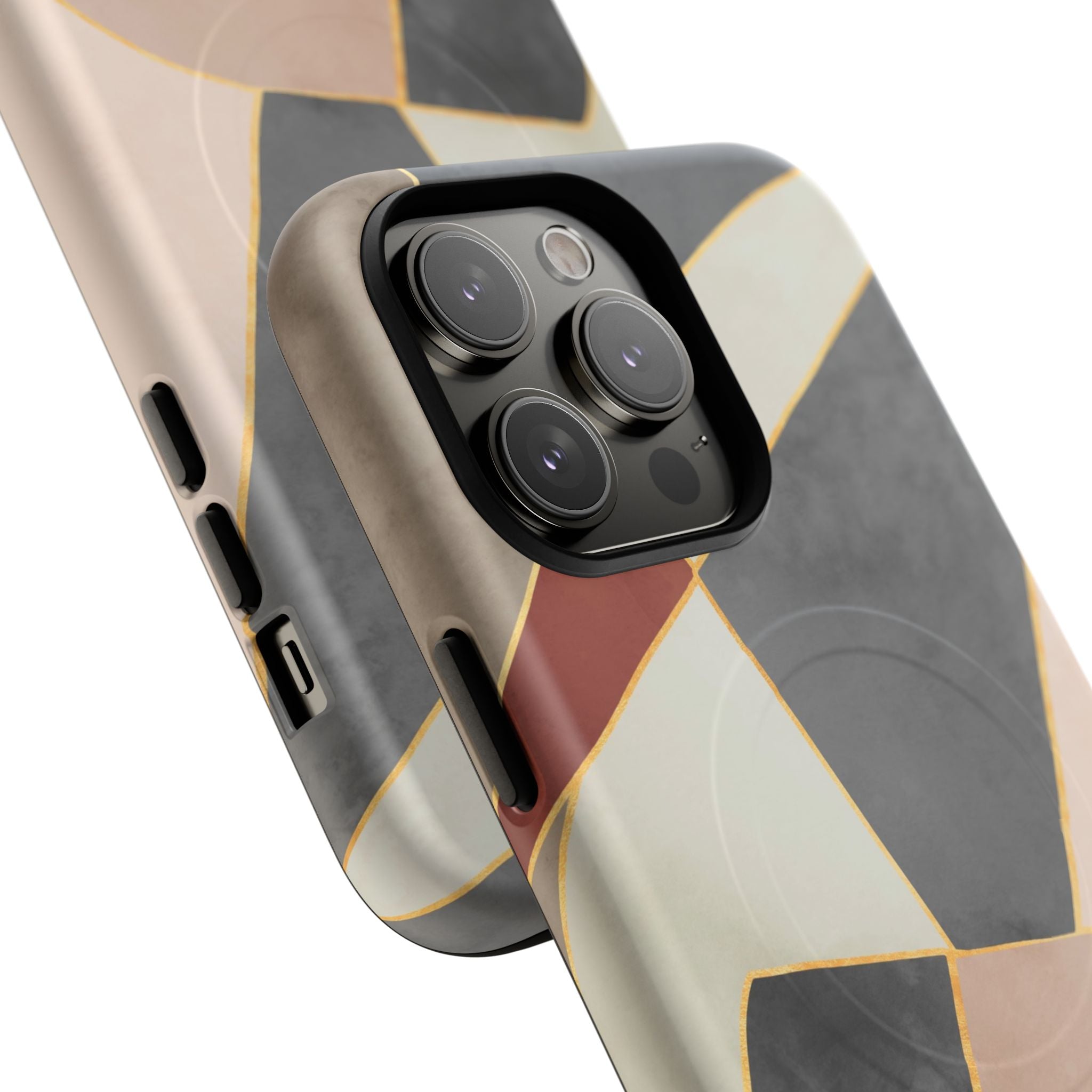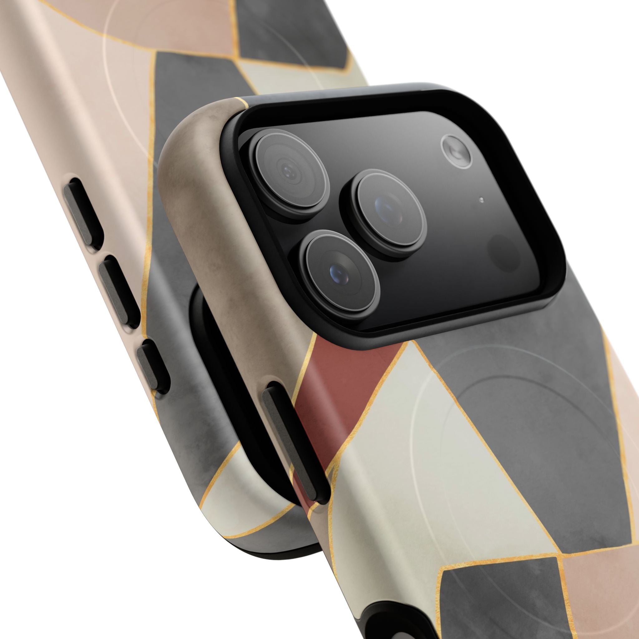 This ANTIPODE Abstract Phone Case from the Modern Art Edition features intersecting shapes in warm blush, charcoal grey, muted clay, and soft cream — all outlined with delicate golden accents that feel quietly luxurious. The painterly textures and softened angular forms create a calm, sculptural rhythm, blending modernist geometry with a warm, contemporary aesthetic. The result is a balanced, elegant composition that feels like a piece of gallery art in motion.