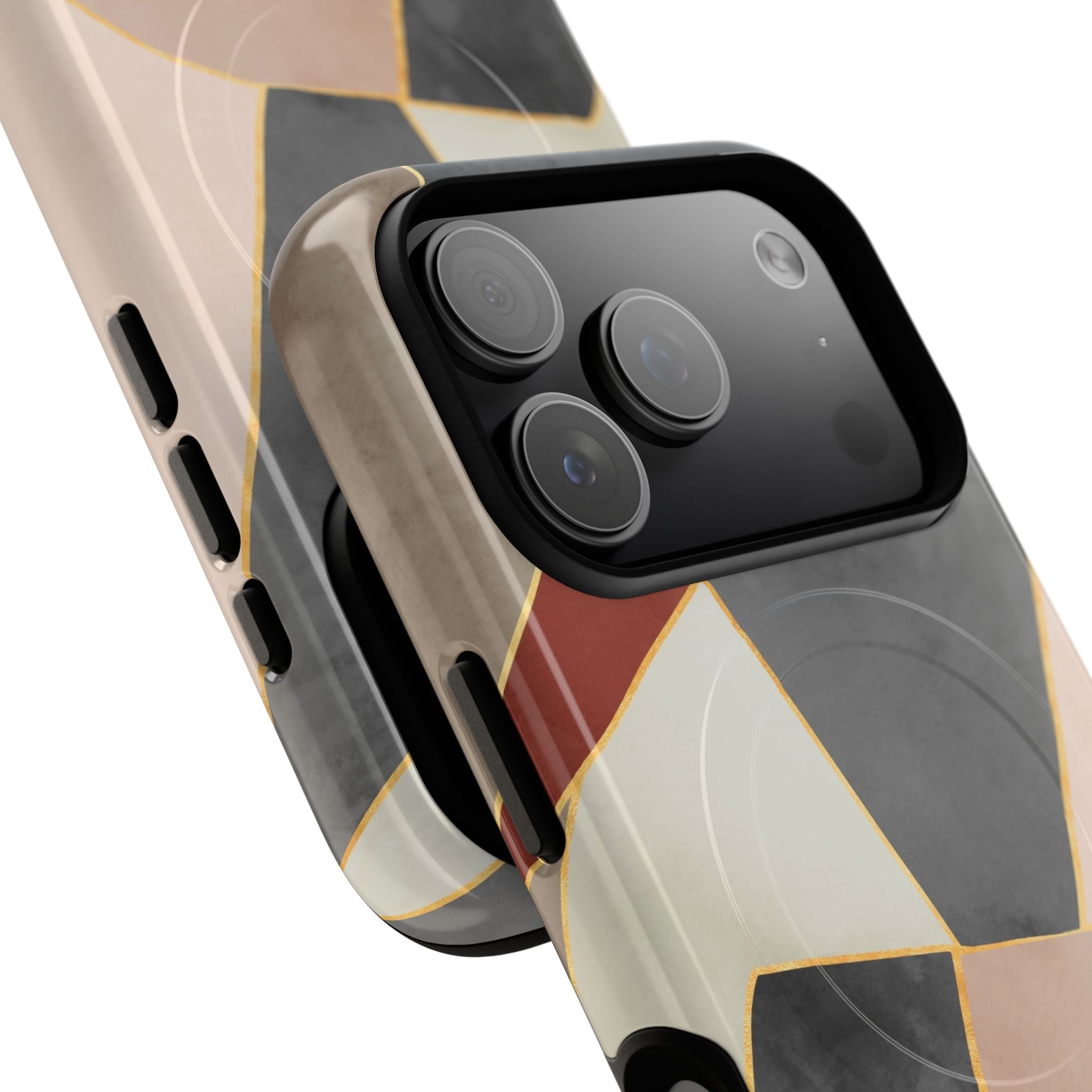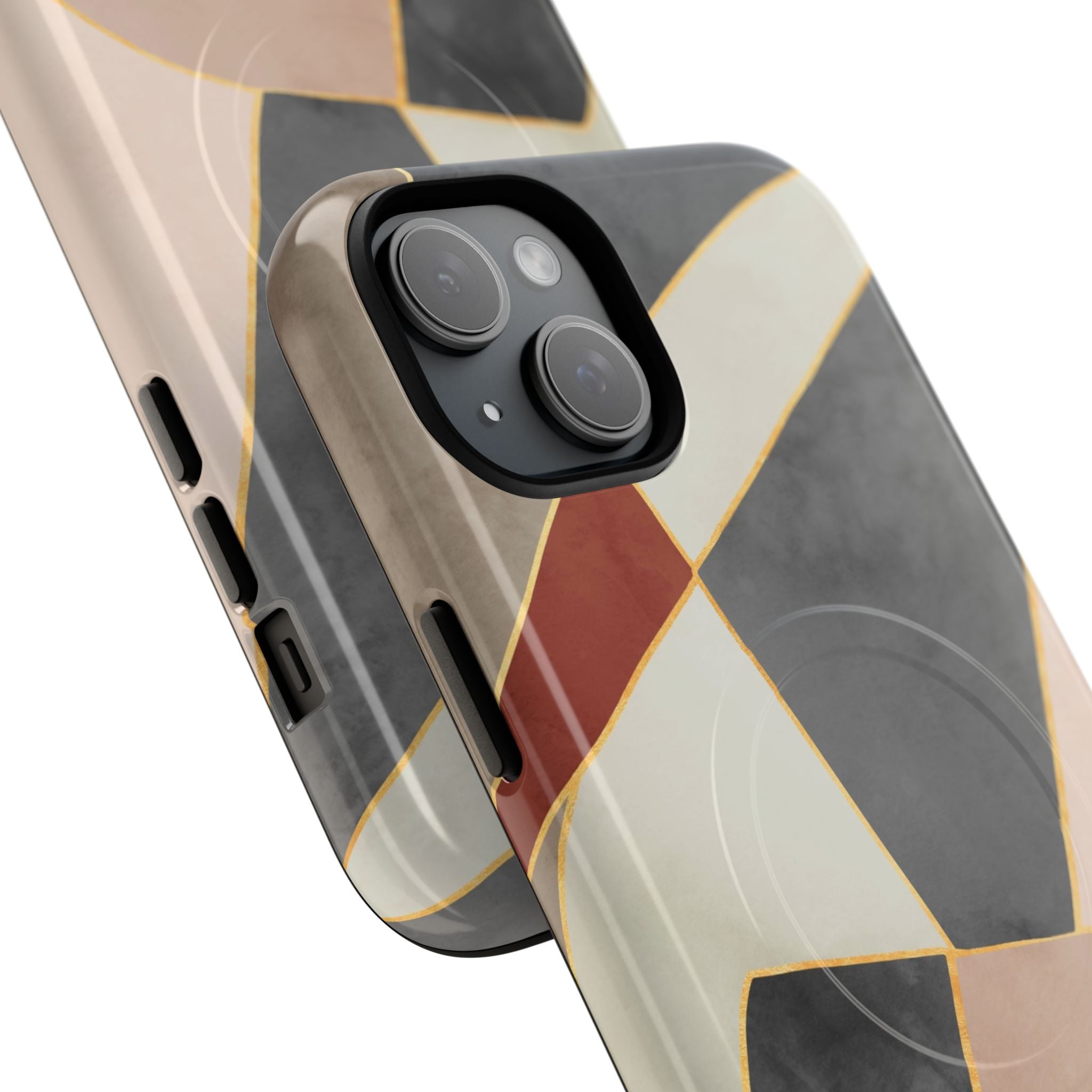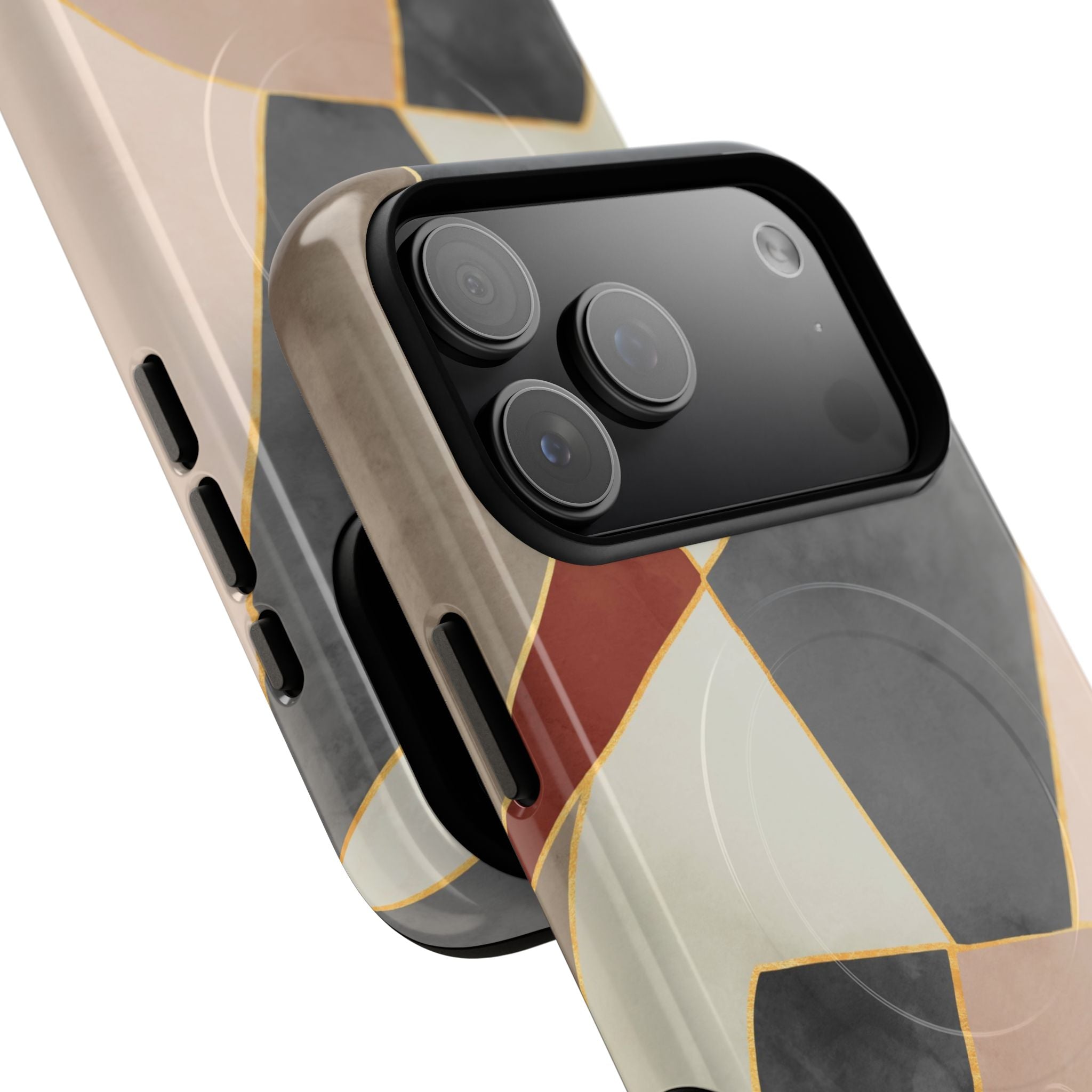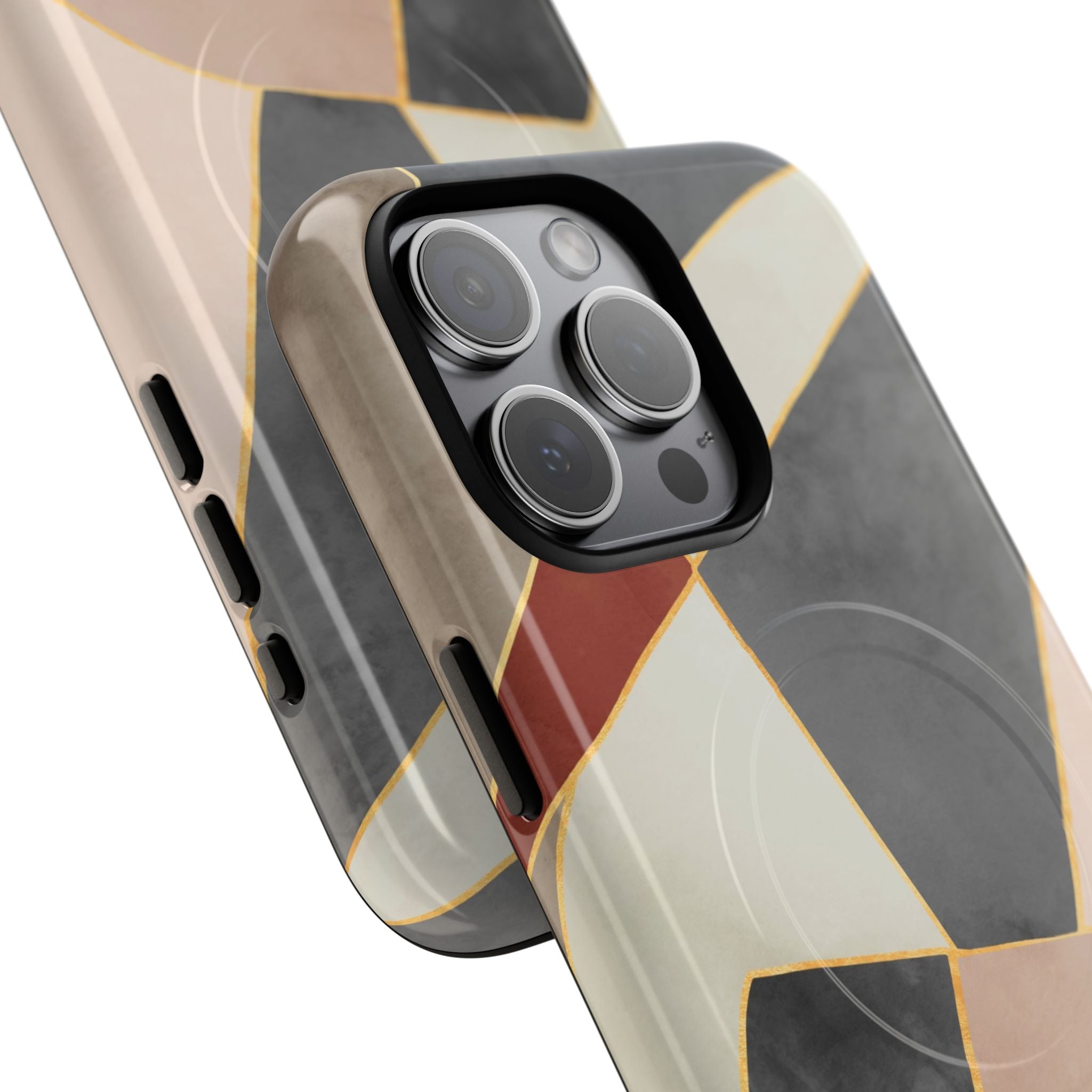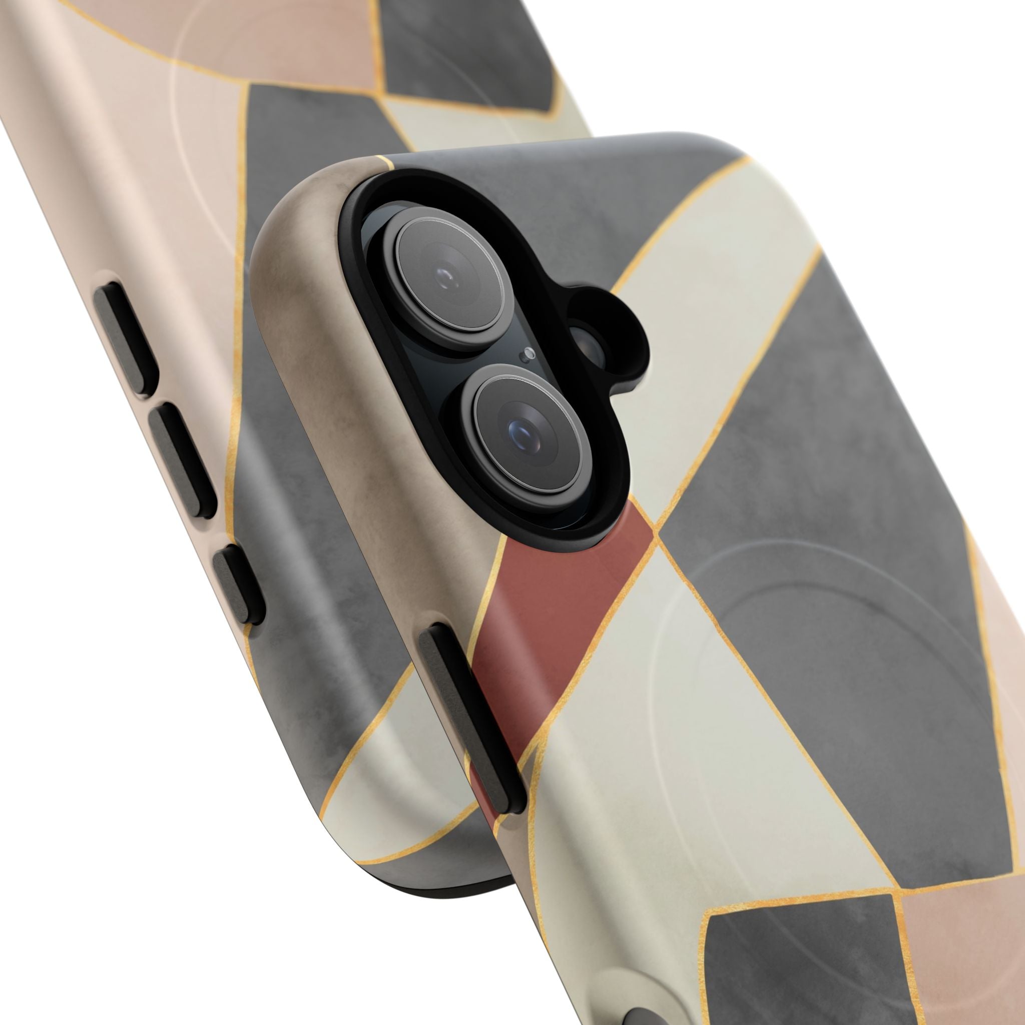 This ANTIPODE Abstract Phone Case from the Modern Art Edition features intersecting shapes in warm blush, charcoal grey, muted clay, and soft cream — all outlined with delicate golden accents that feel quietly luxurious. The painterly textures and softened angular forms create a calm, sculptural rhythm, blending modernist geometry with a warm, contemporary aesthetic. The result is a balanced, elegant composition that feels like a piece of gallery art in motion.