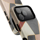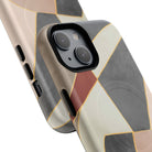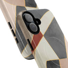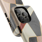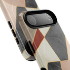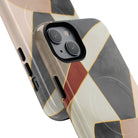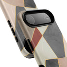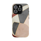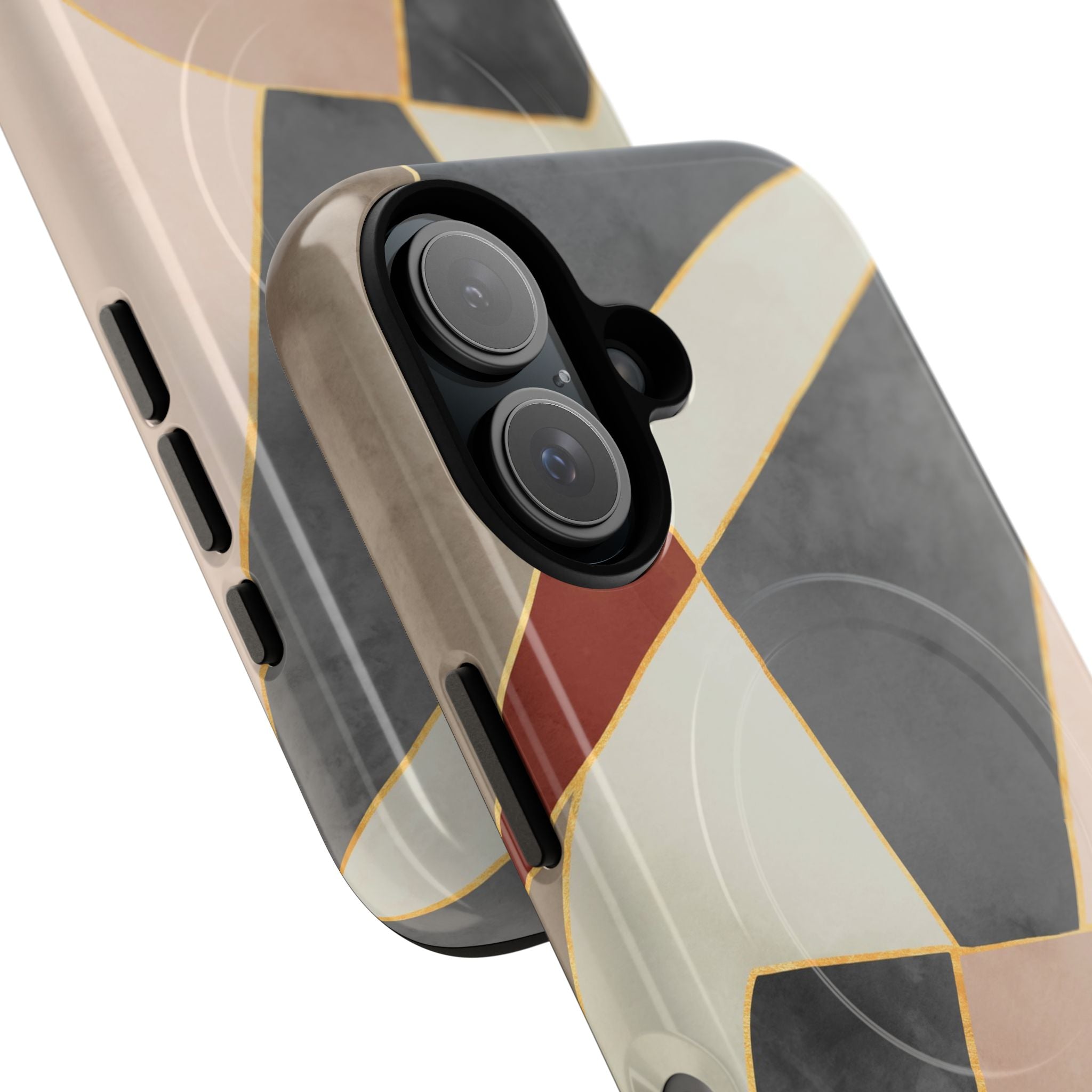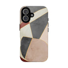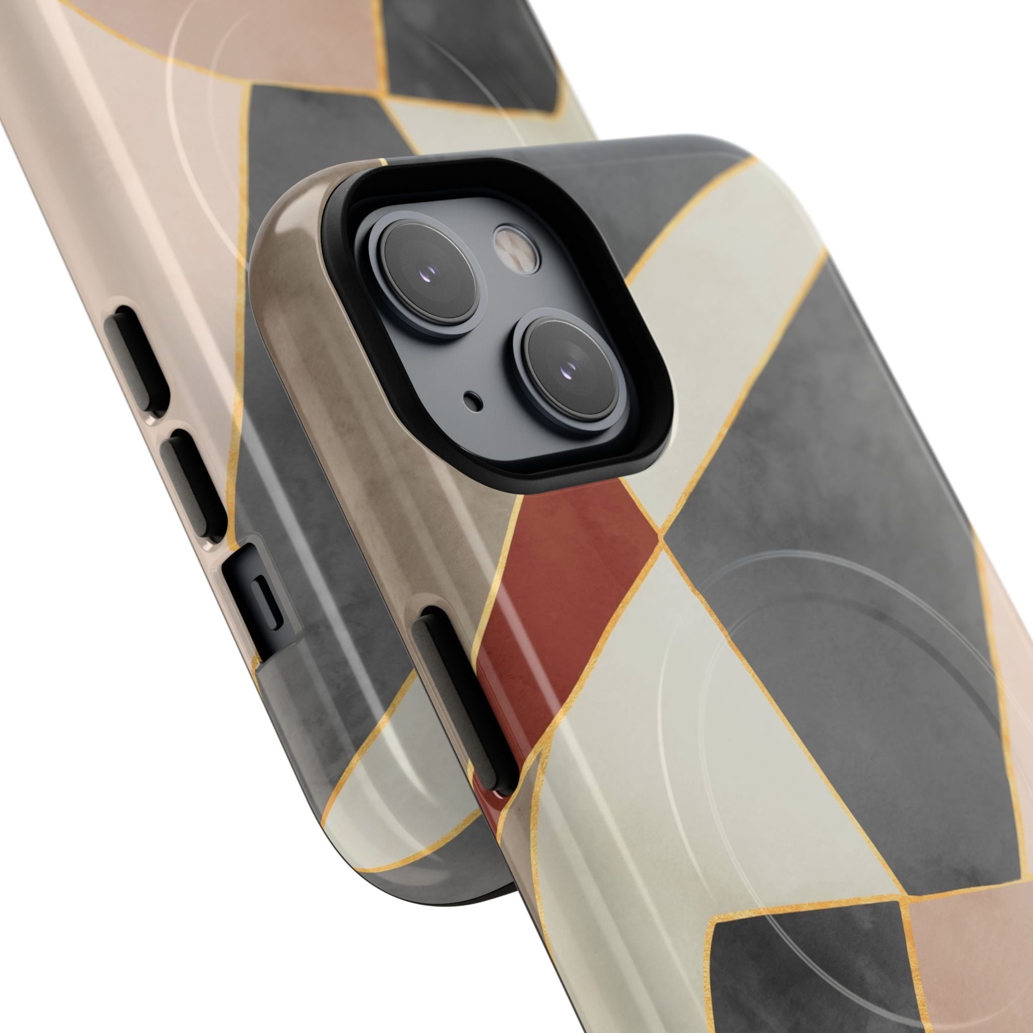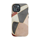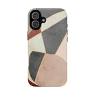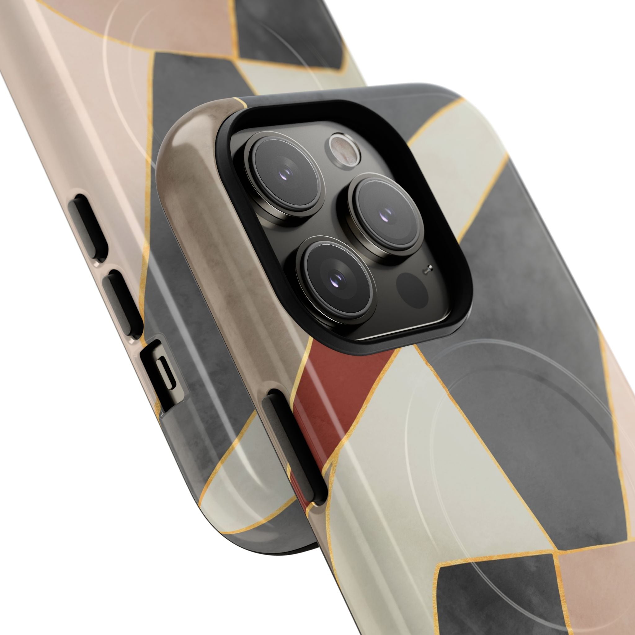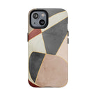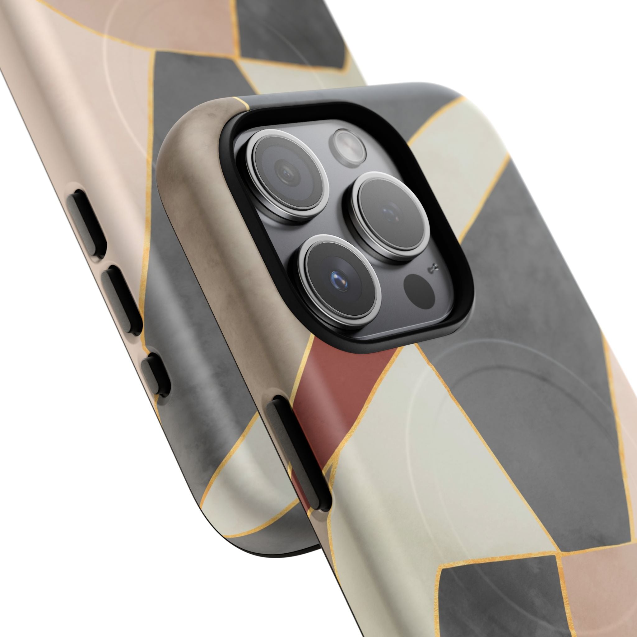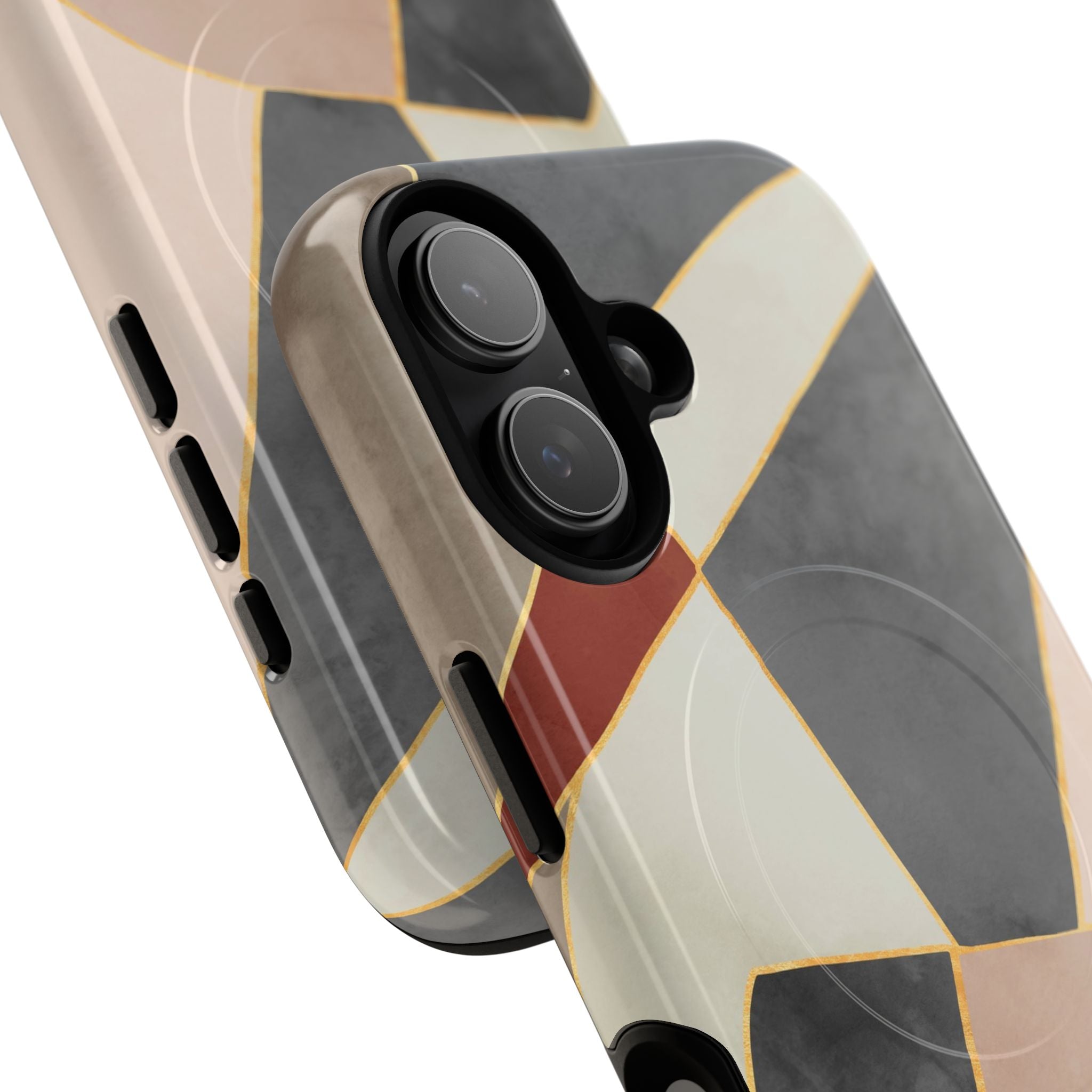 This ANTIPODE Abstract Phone Case from the Modern Art Edition features intersecting shapes in warm blush, charcoal grey, muted clay, and soft cream — all outlined with delicate golden accents that feel quietly luxurious. The painterly textures and softened angular forms create a calm, sculptural rhythm, blending modernist geometry with a warm, contemporary aesthetic. The result is a balanced, elegant composition that feels like a piece of gallery art in motion.
