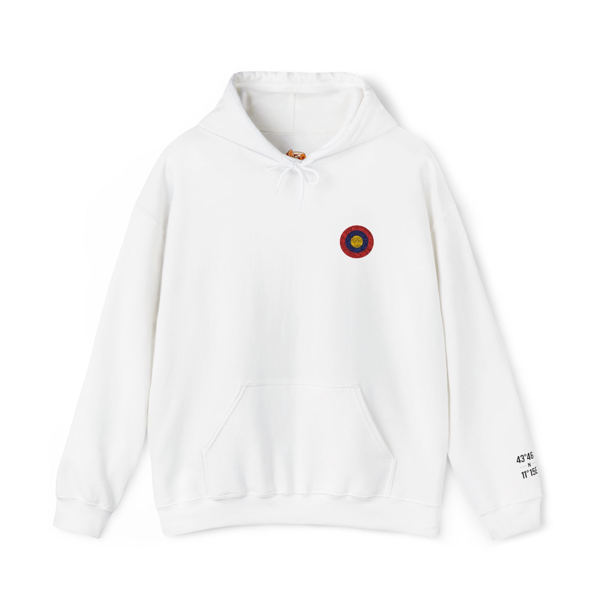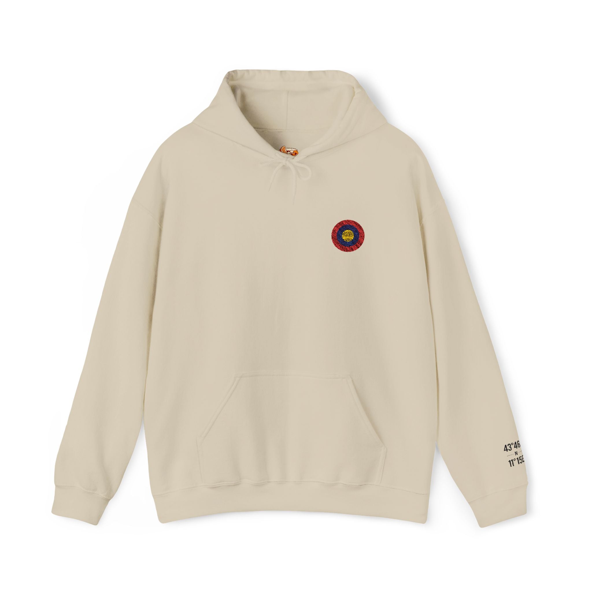 An embroidered Negroni Sphere patch on the chest adds a refined, textured focal point, while the sleeve detailing — featuring the two-circle collaboration mark and Florence coordinates — anchors the piece in Firenze’s historic centre. Ribbed cuffs and waistband maintain structure, and the kangaroo pocket provides practical comfort. A double-lined hood with matching drawcord completes the clean, cohesive design.