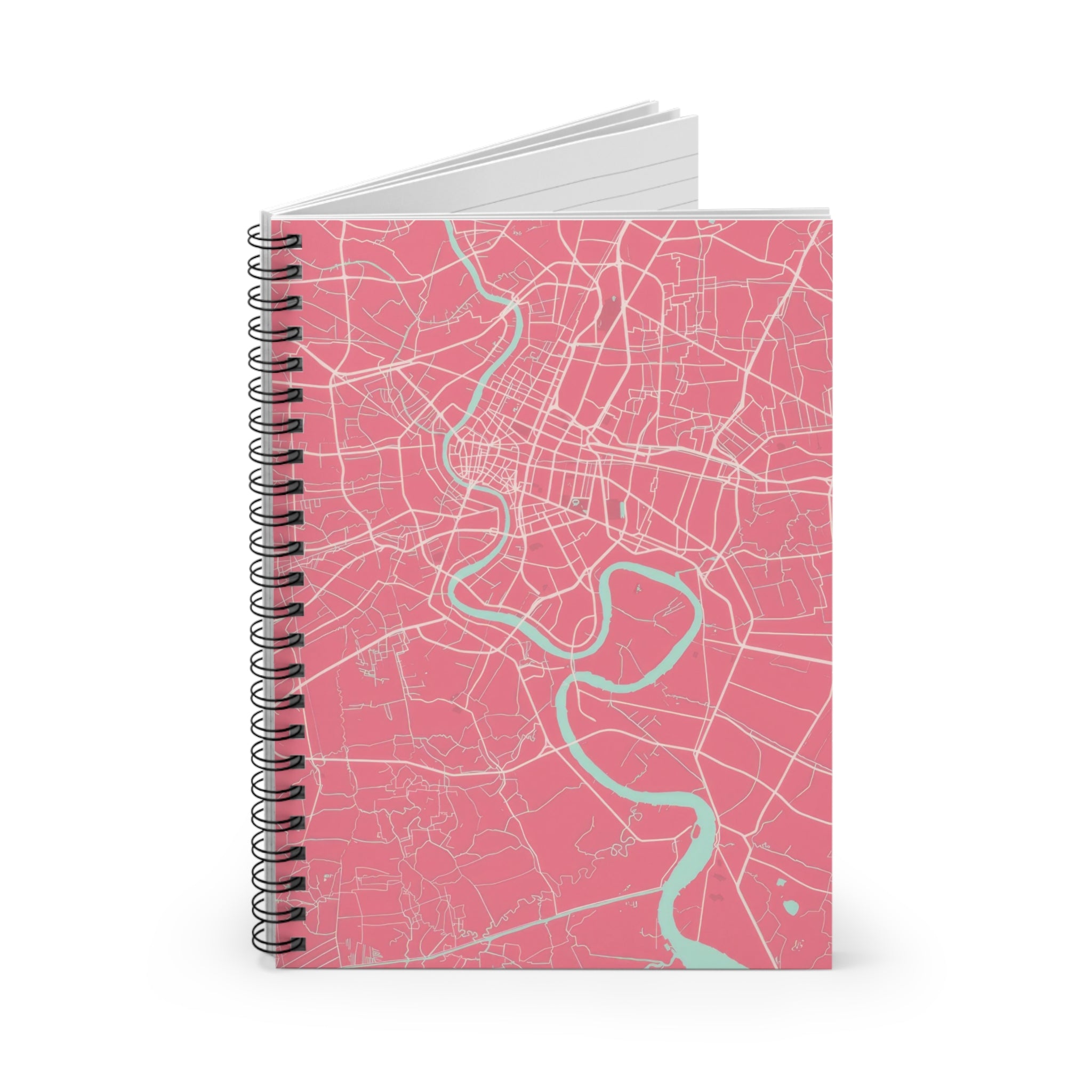 The Bangkok City Map Spiral Notebook – Pink transforms the city’s winding streets and river curves into a bold yet refined everyday notebook. Featuring a detailed illustrated street map of Bangkok printed on the front cover, the design highlights the Chao Phraya River as it flows through layered neighbourhoods and road networks. Rendered in soft pink tones with contrasting linework, the map feels playful, modern, and unmistakably city-driven.
