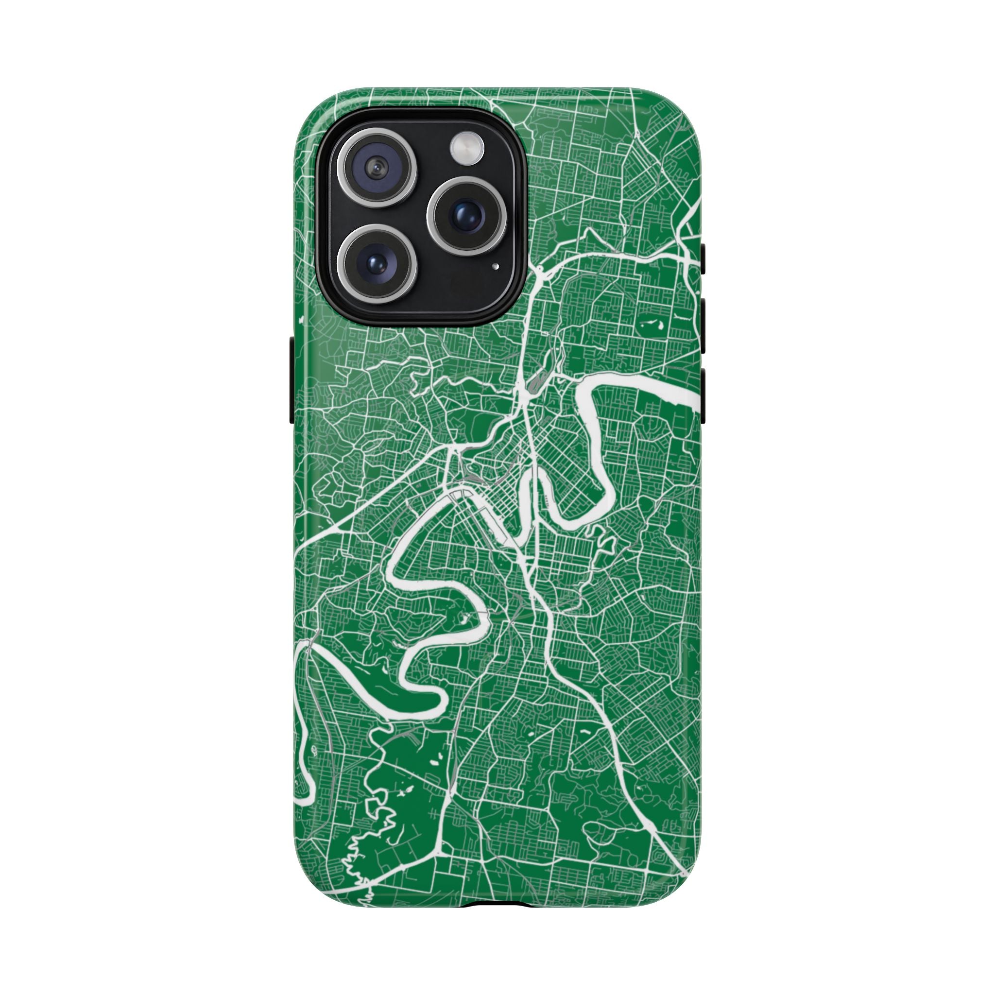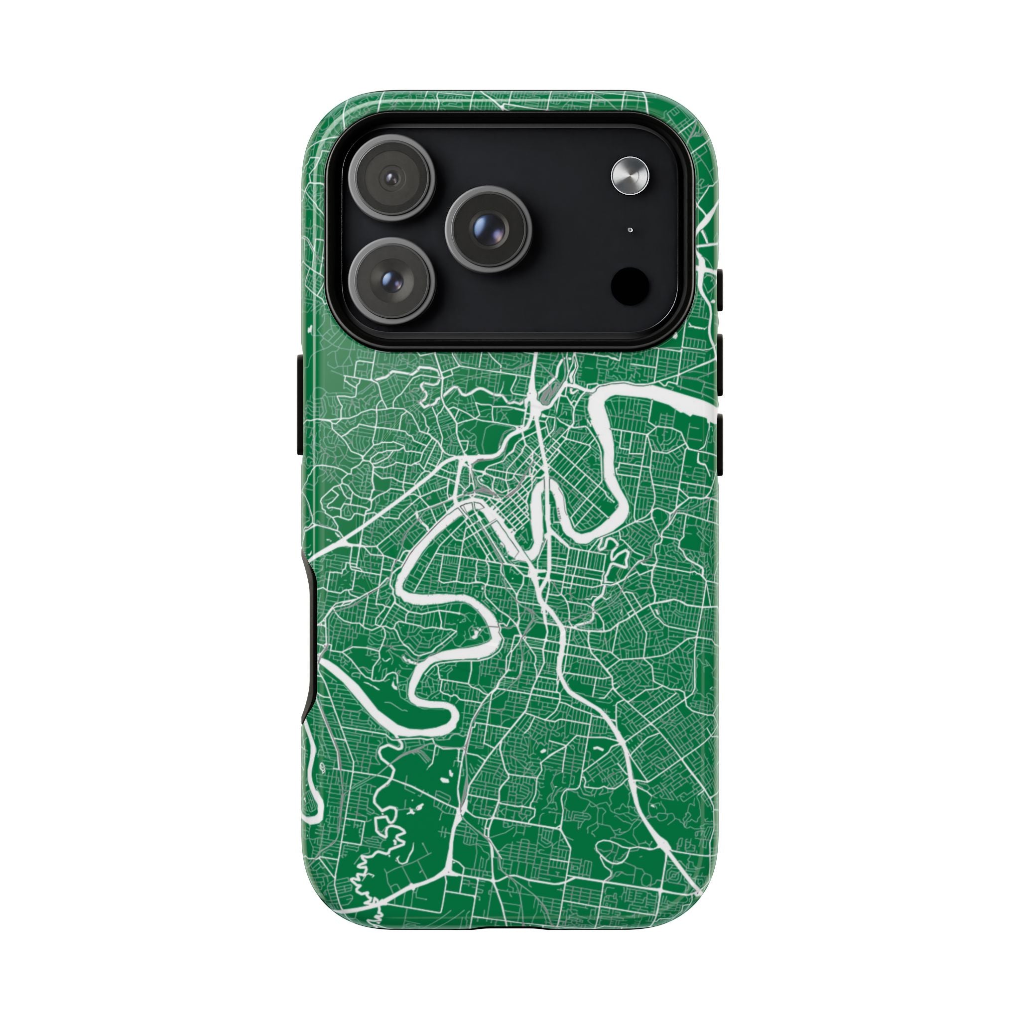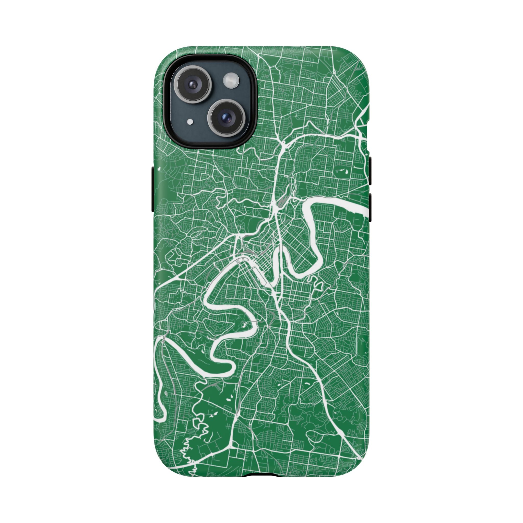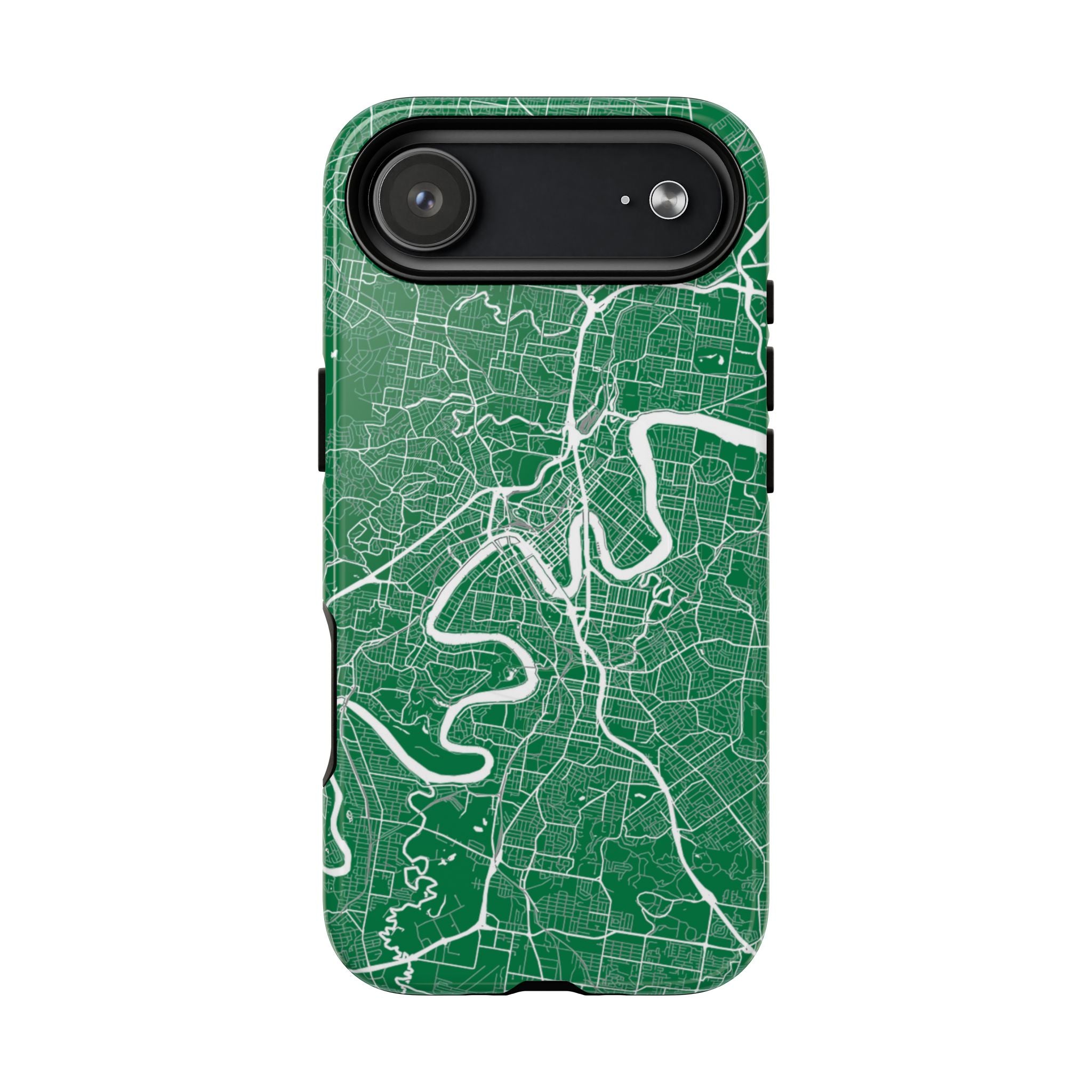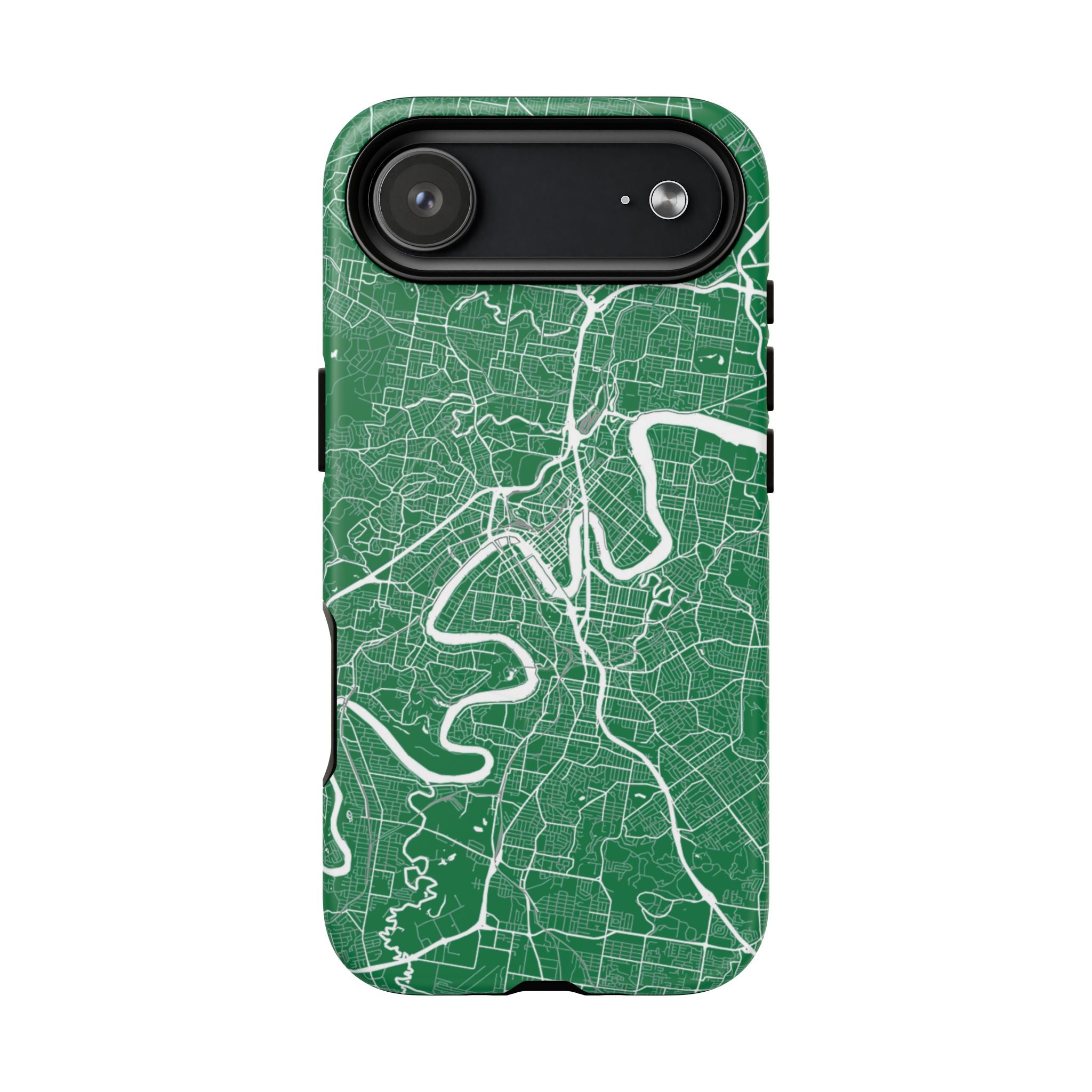 This Brisbane map phone case features a rich green backdrop with crisp white linework tracing the winding Brisbane River and surrounding street grid. The flowing curves of the river cut through the city’s neighbourhoods, turning Brisbane’s distinctive layout into a clean, graphic design that feels both modern and instantly recognisable.