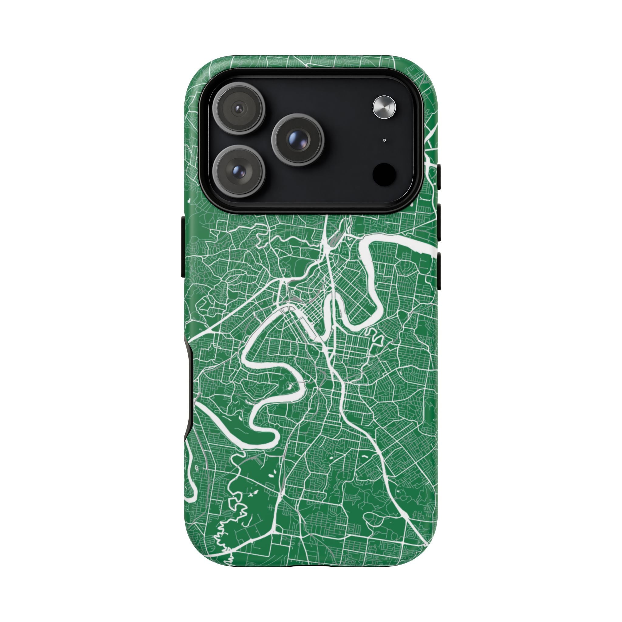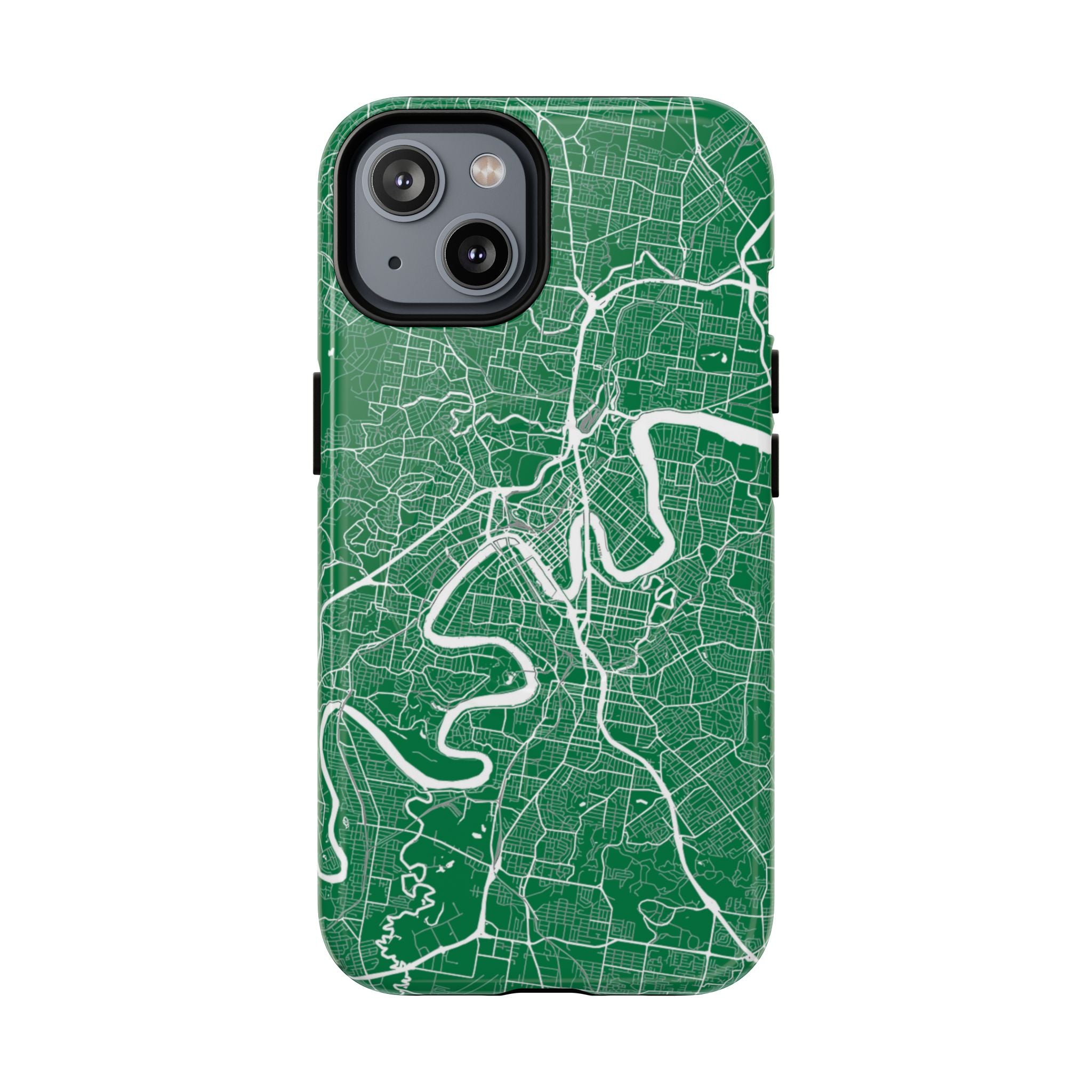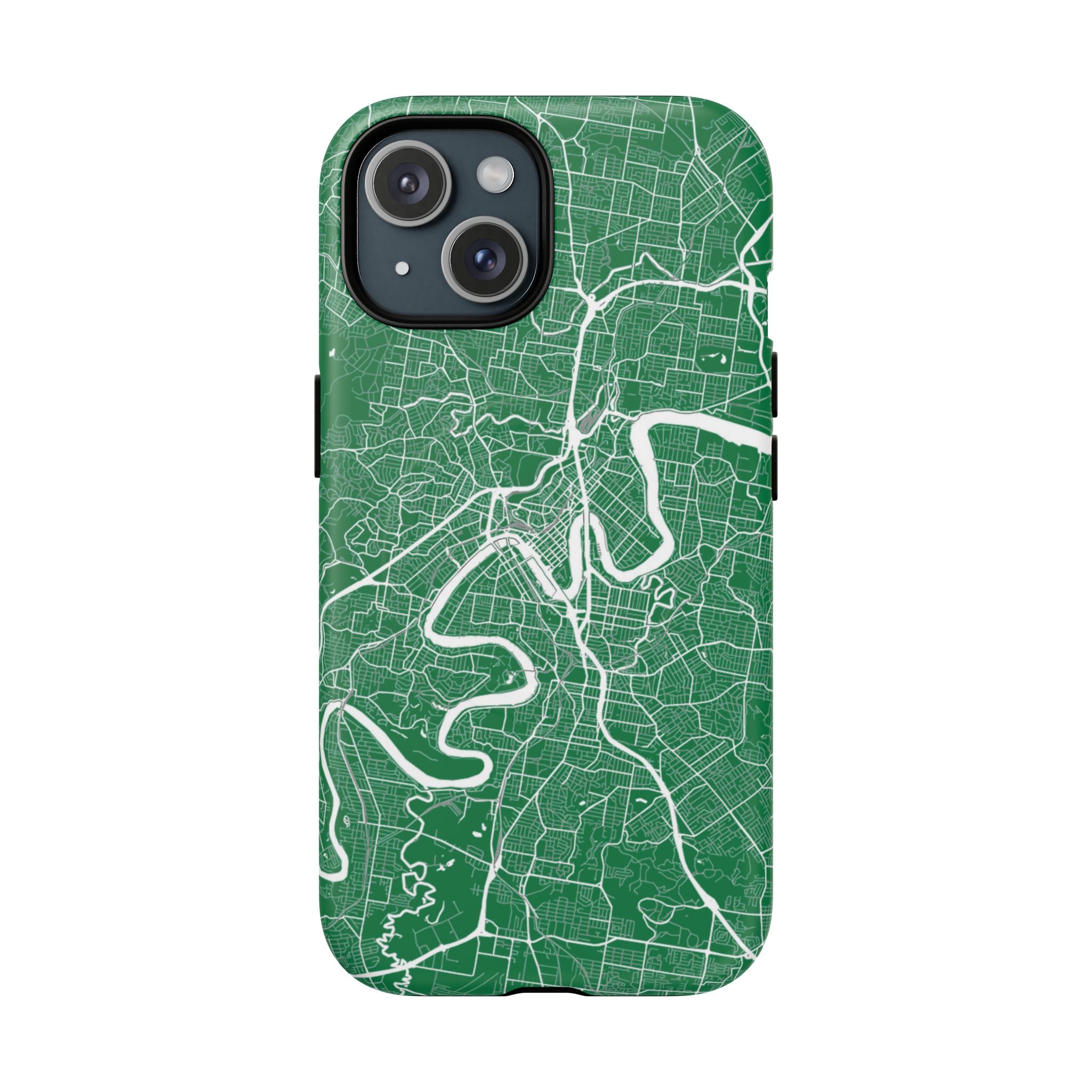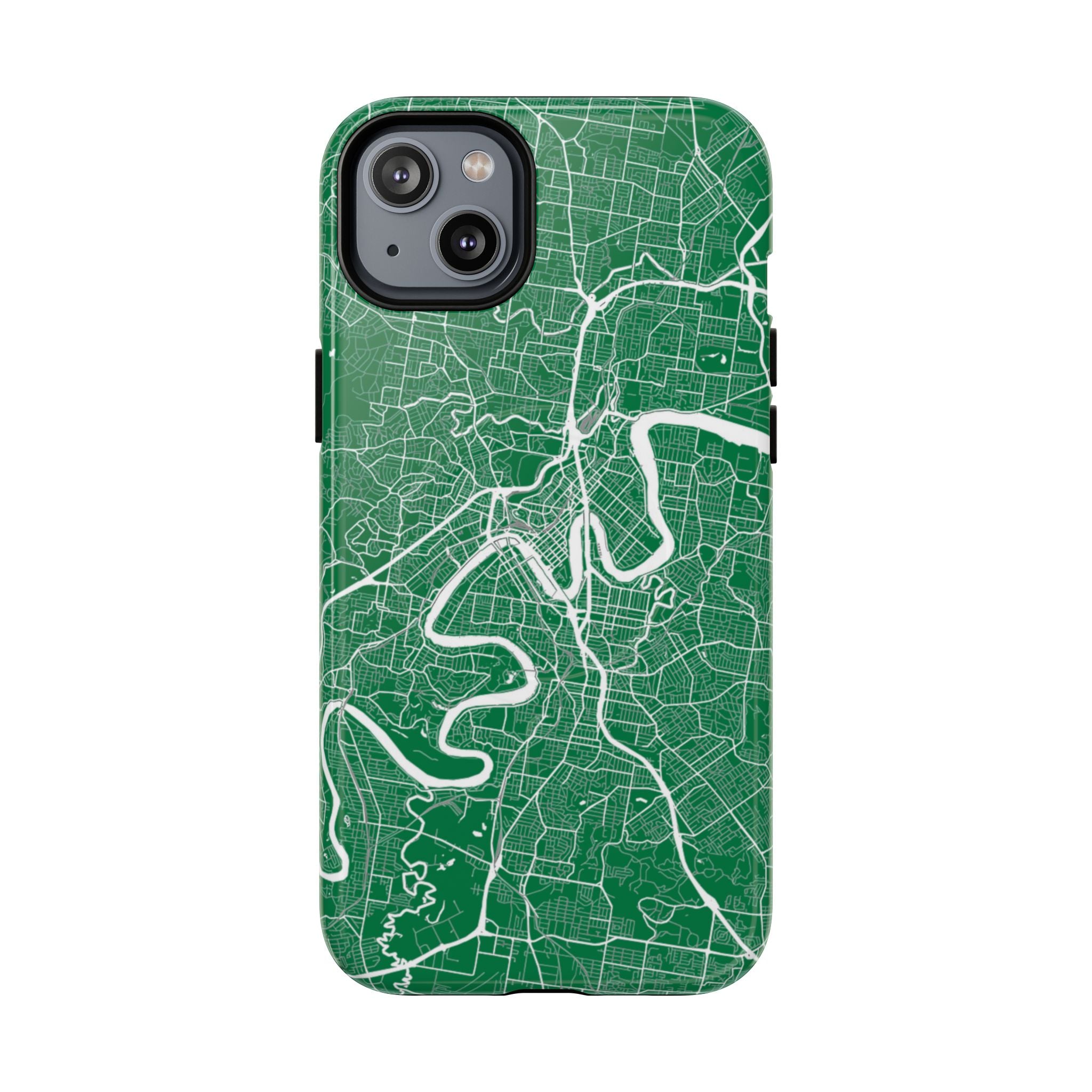 This Brisbane map phone case features a rich green backdrop with crisp white linework tracing the winding Brisbane River and surrounding street grid. The flowing curves of the river cut through the city’s neighbourhoods, turning Brisbane’s distinctive layout into a clean, graphic design that feels both modern and instantly recognisable.