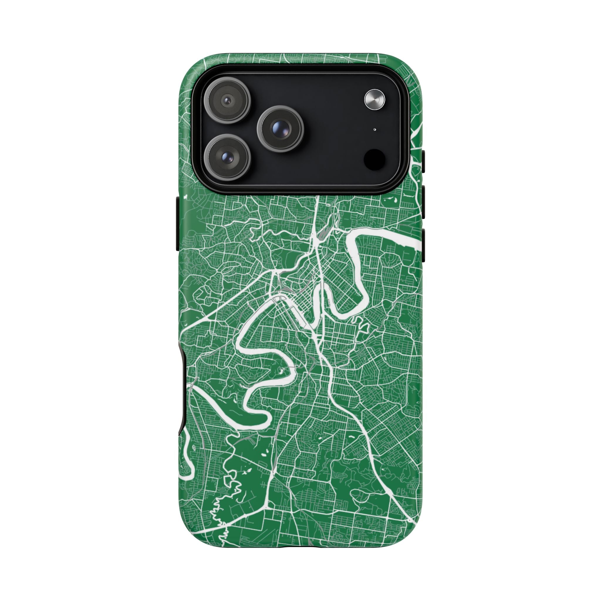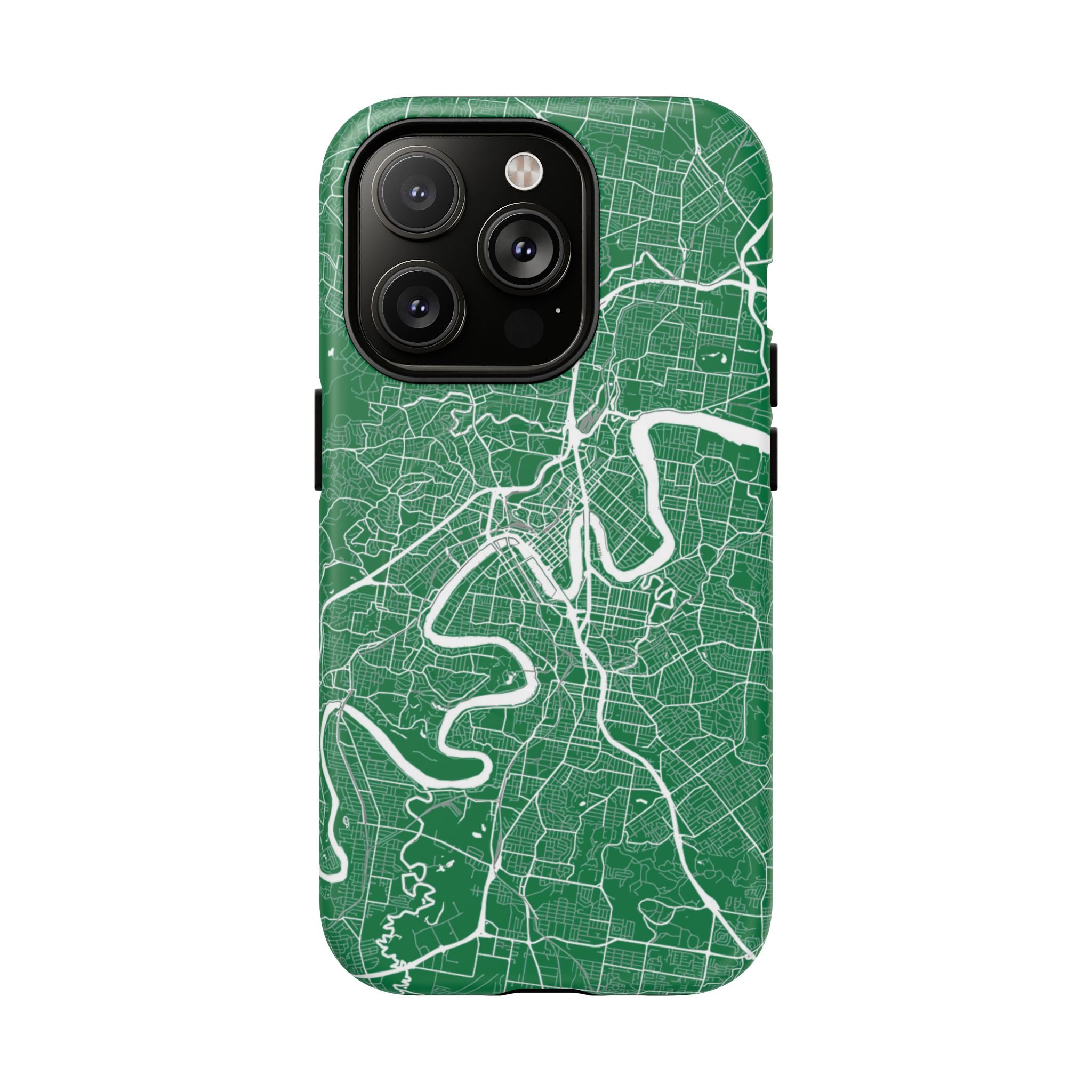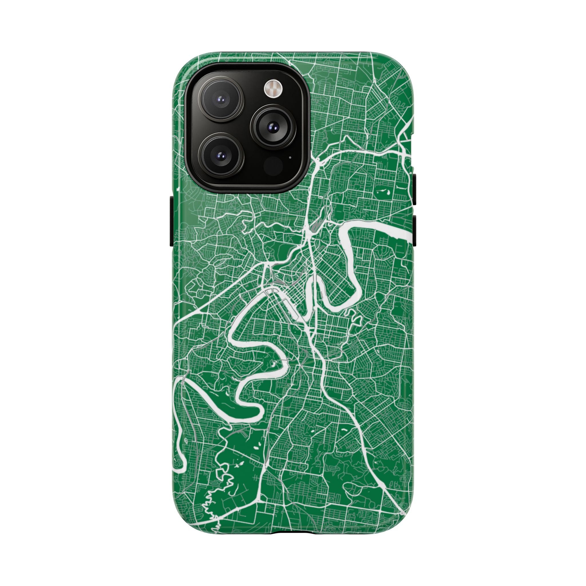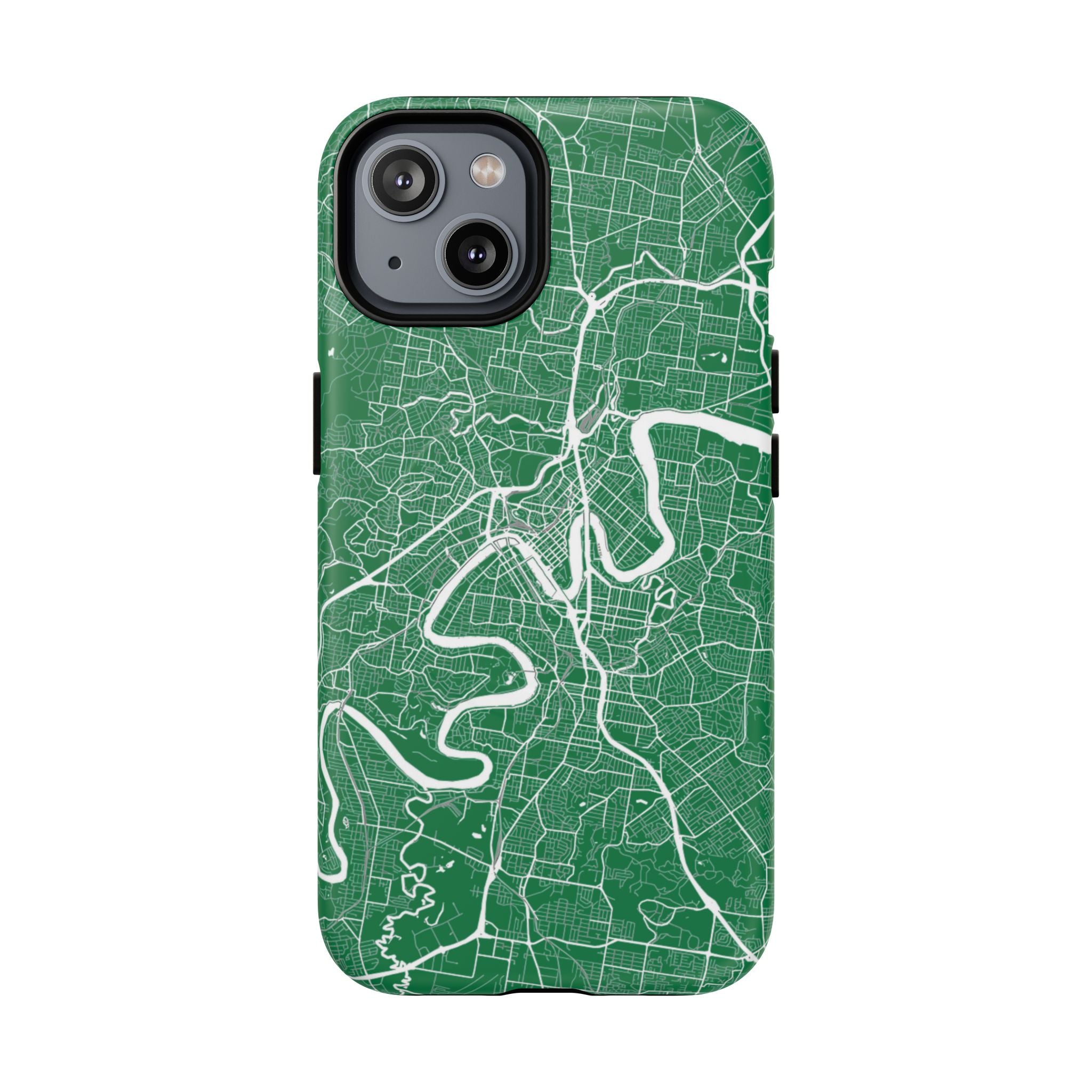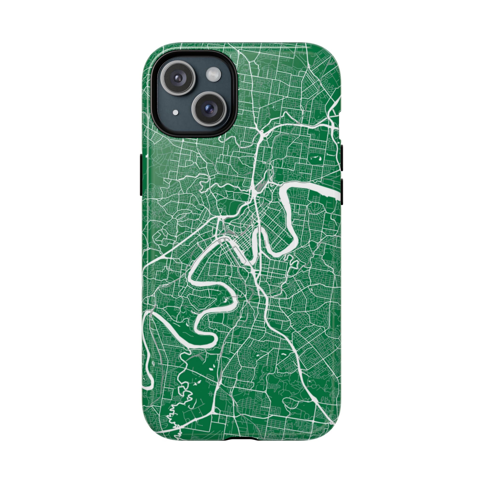 This Brisbane map phone case features a rich green backdrop with crisp white linework tracing the winding Brisbane River and surrounding street grid. The flowing curves of the river cut through the city’s neighbourhoods, turning Brisbane’s distinctive layout into a clean, graphic design that feels both modern and instantly recognisable.