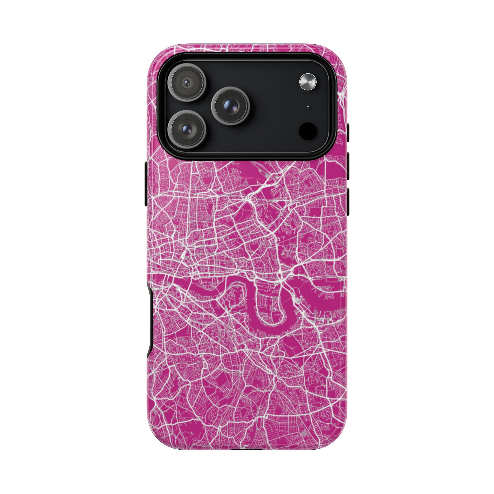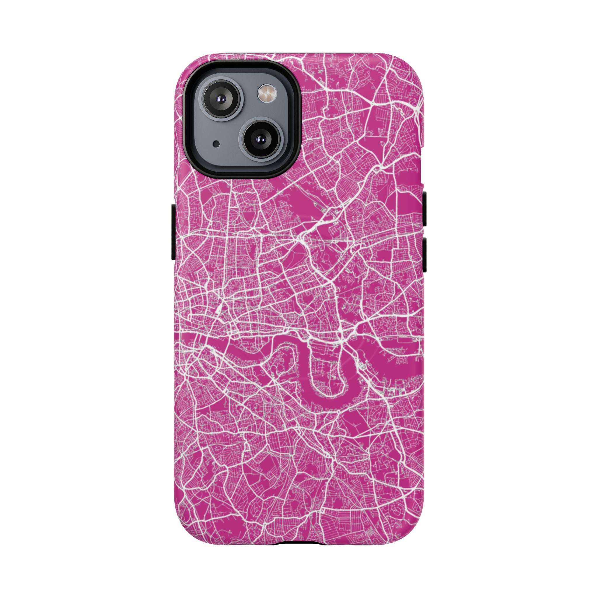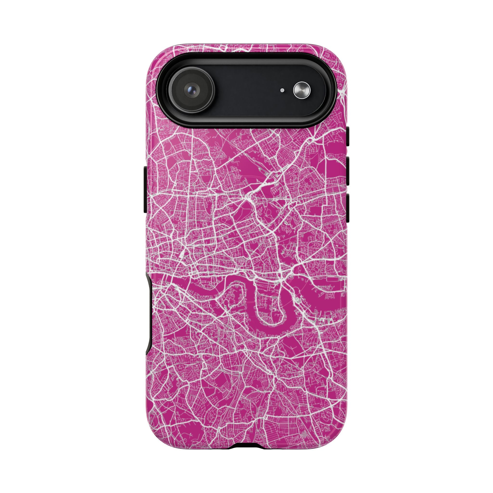 The London Street Map Phone Case – Pink Edition reimagines the city in a vibrant, contemporary palette that feels bold yet refined. Set against a rich pink backdrop, crisp white street lines trace London’s intricate road network and the winding River Thames, transforming the city’s layered geography into a dynamic graphic statement.