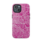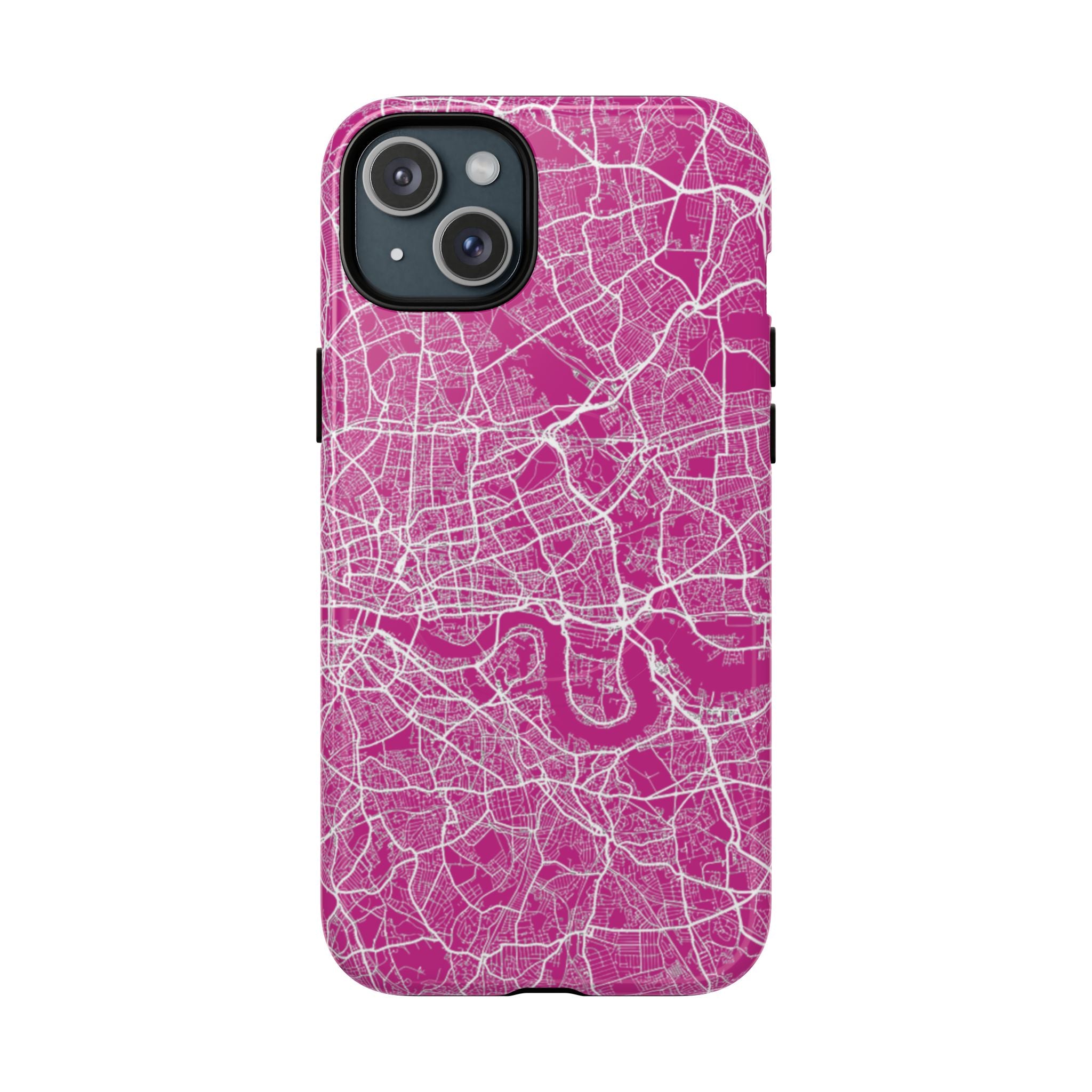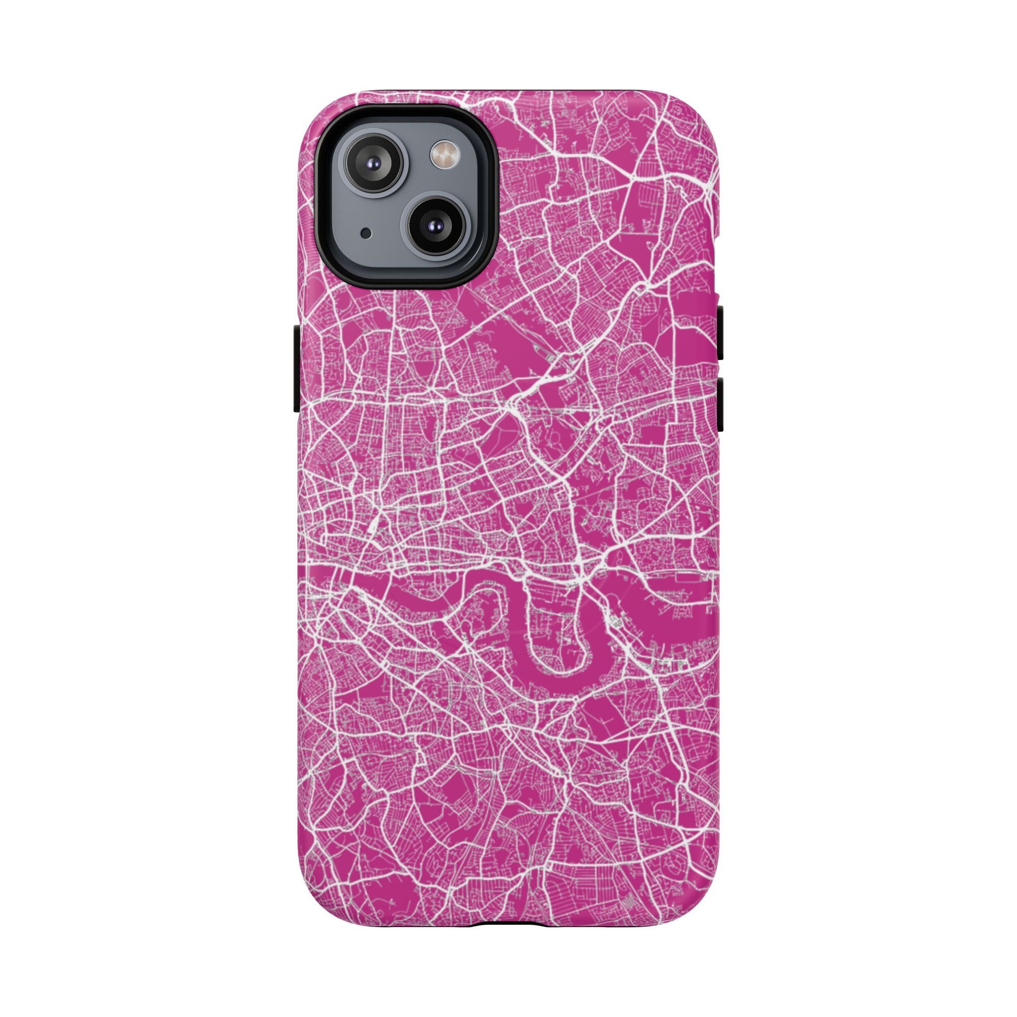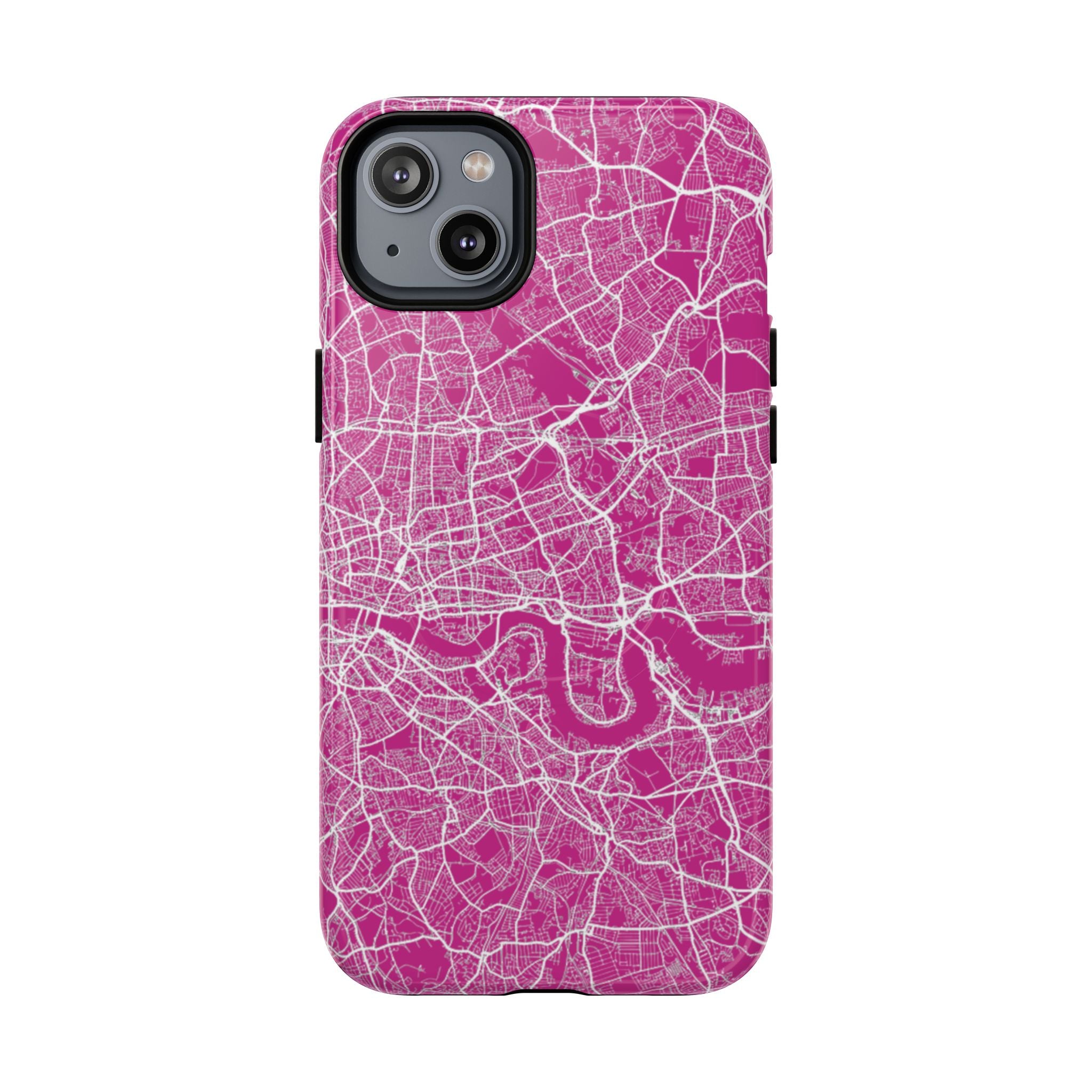 The London Street Map Phone Case – Pink Edition reimagines the city in a vibrant, contemporary palette that feels bold yet refined. Set against a rich pink backdrop, crisp white street lines trace London’s intricate road network and the winding River Thames, transforming the city’s layered geography into a dynamic graphic statement.