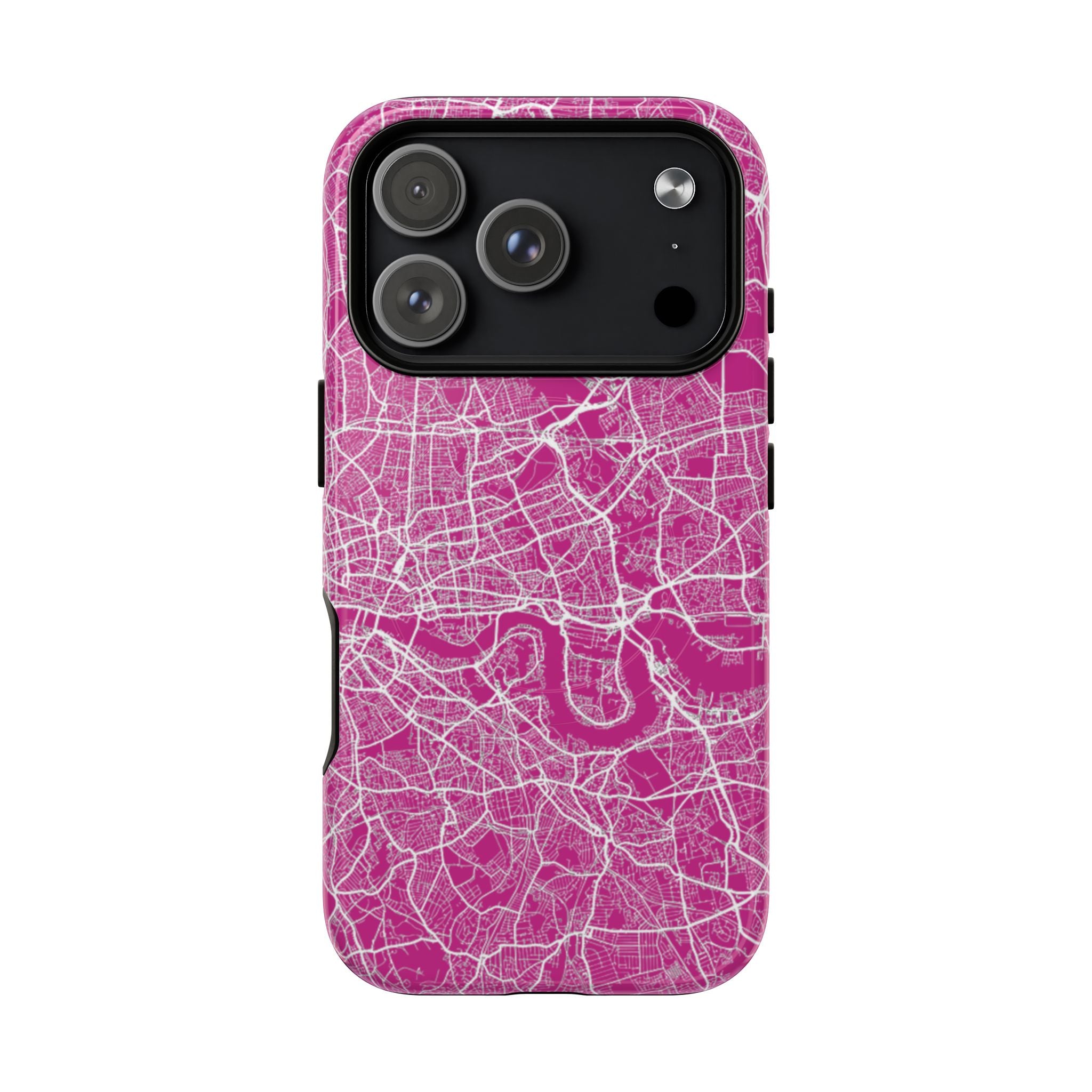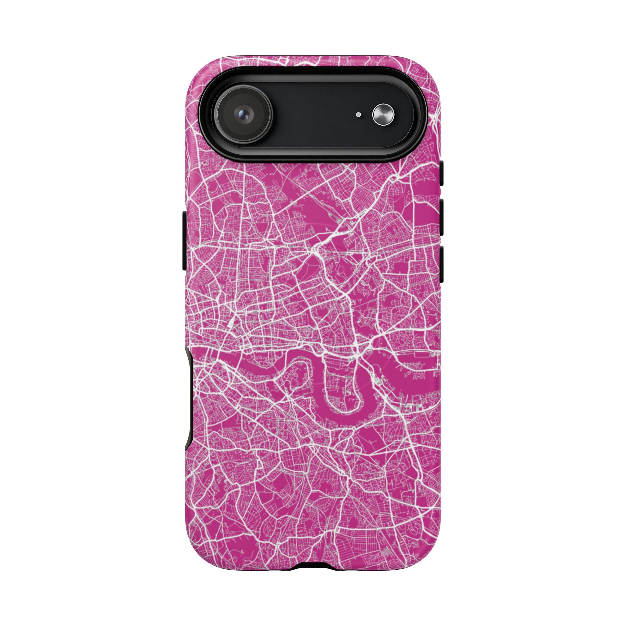 An embedded magnetic ring supports MagSafe® compatibility, allowing seamless attachment of chargers and magnetic accessories. Available in matte or glossy premium finishes, the London Street Map Phone Case – Pink Edition blends dependable protection with a bold, city-led aesthetic designed for everyday carry.
