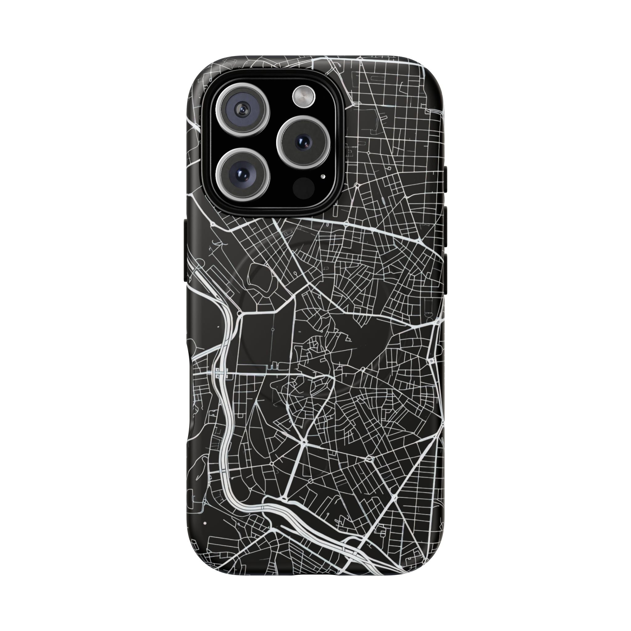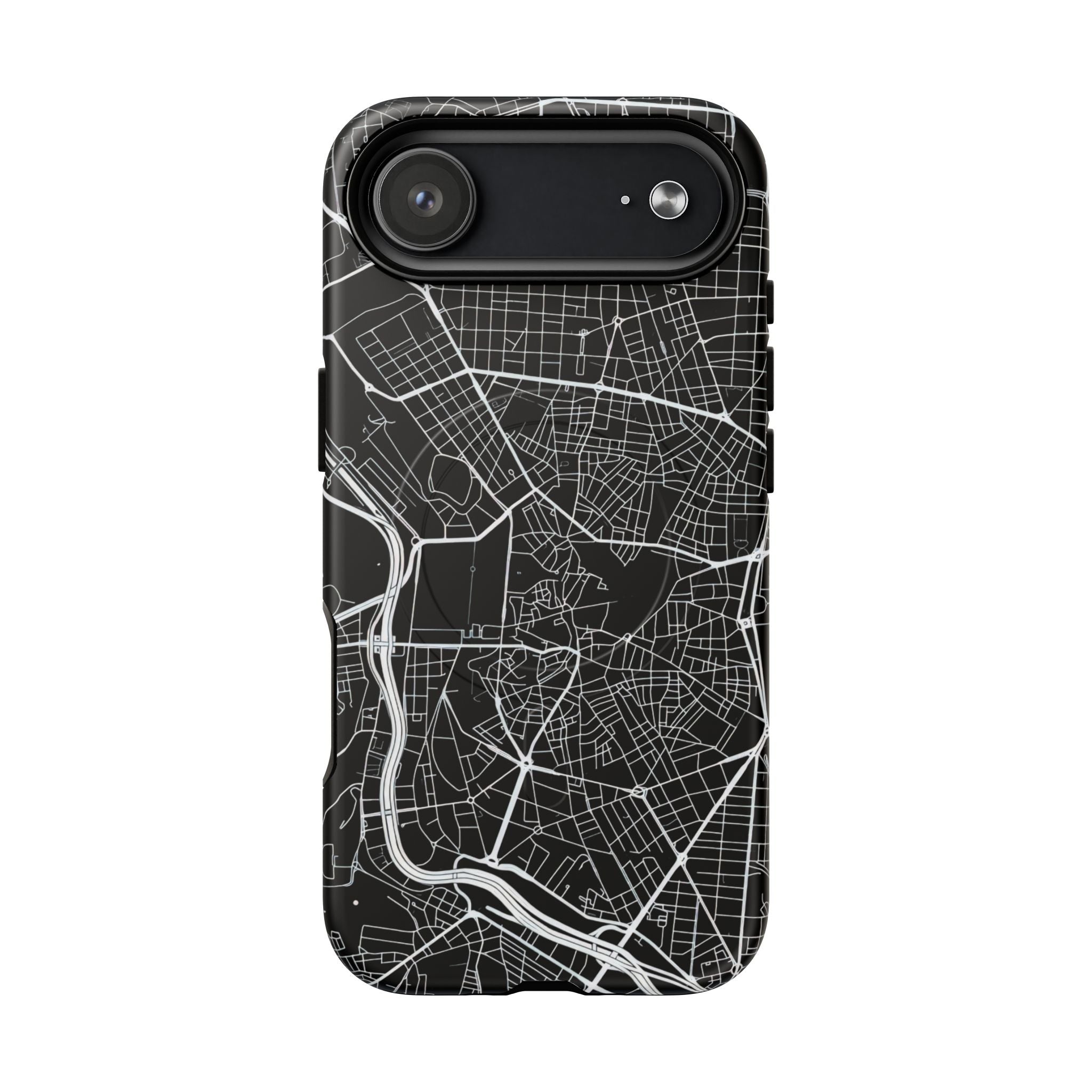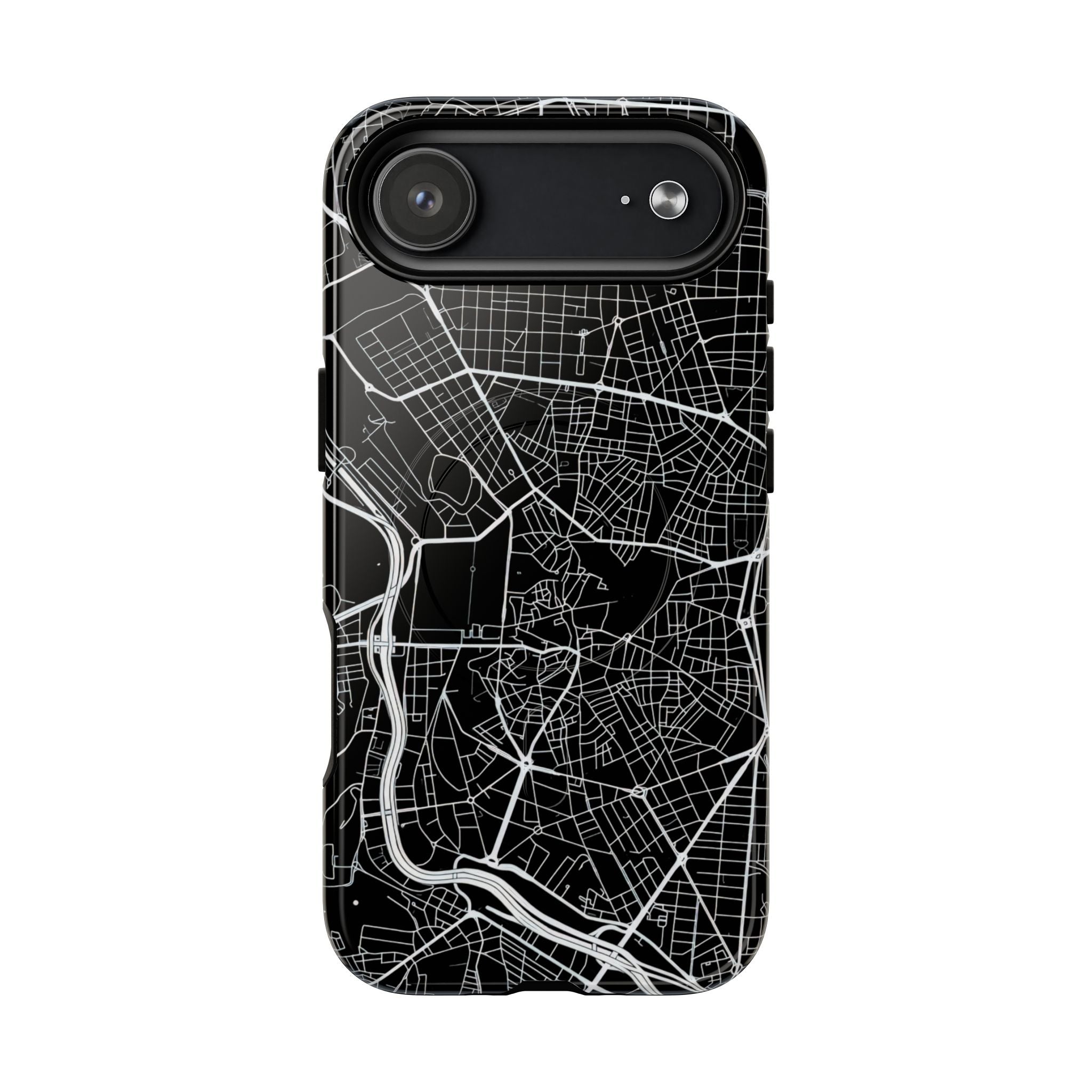 An embedded magnetic ring supports MagSafe® compatibility, allowing effortless attachment of chargers and magnetic accessories. Available in matte or glossy premium finishes, the Madrid Street Map Phone Case – Black Edition combines dependable protection with a modern, city-driven aesthetic designed for everyday carry.