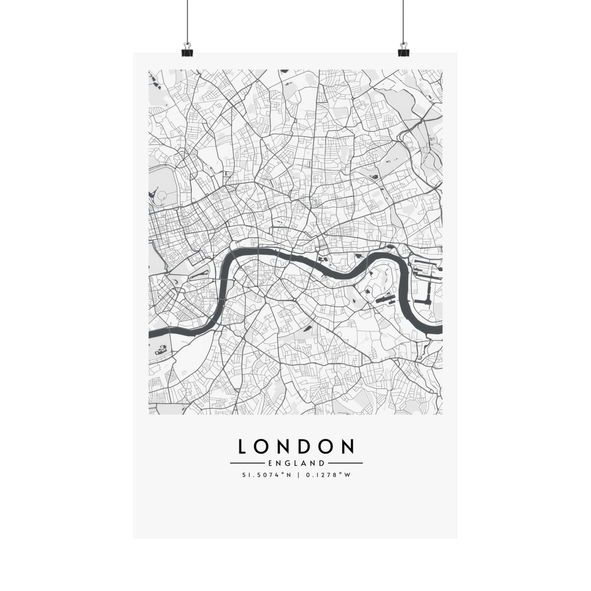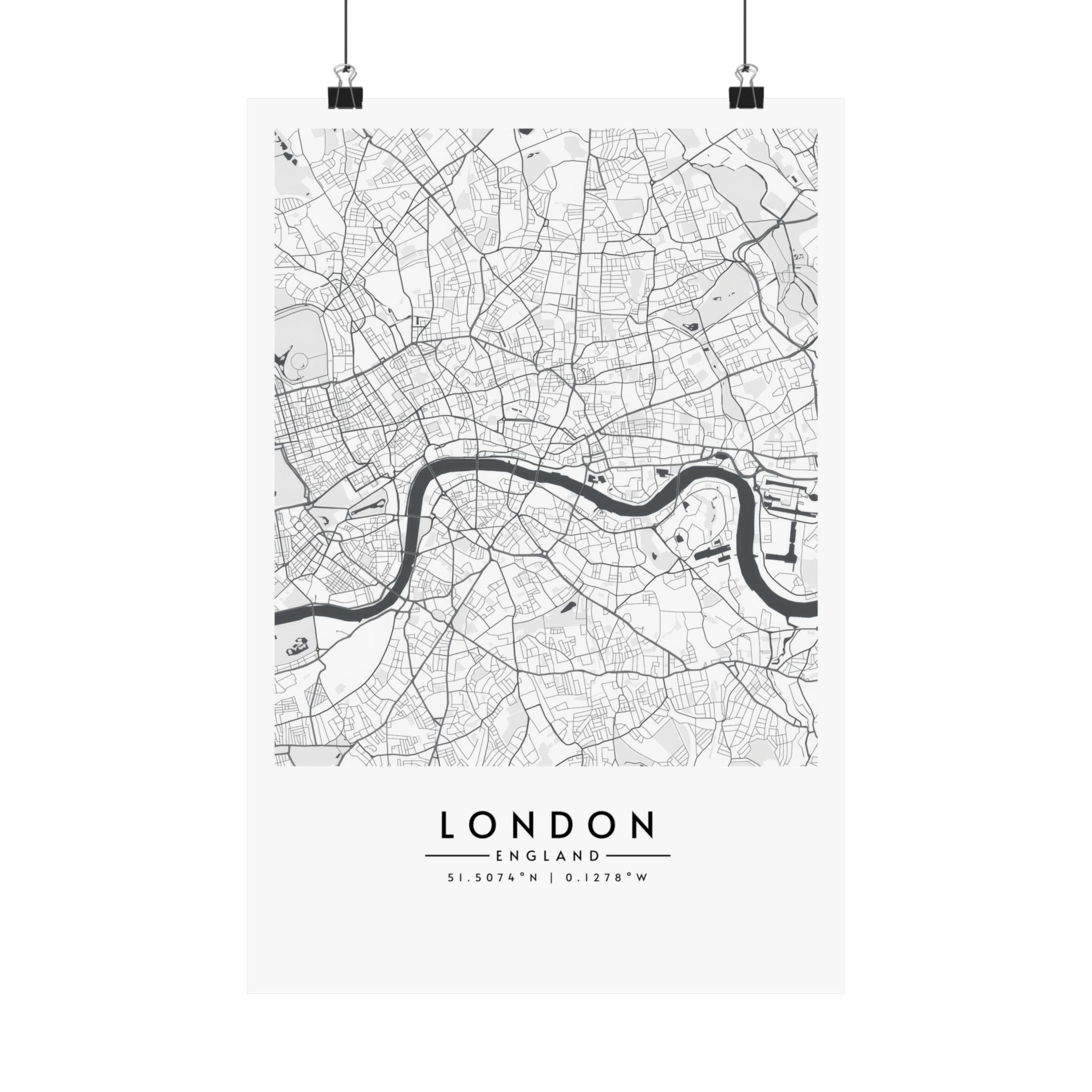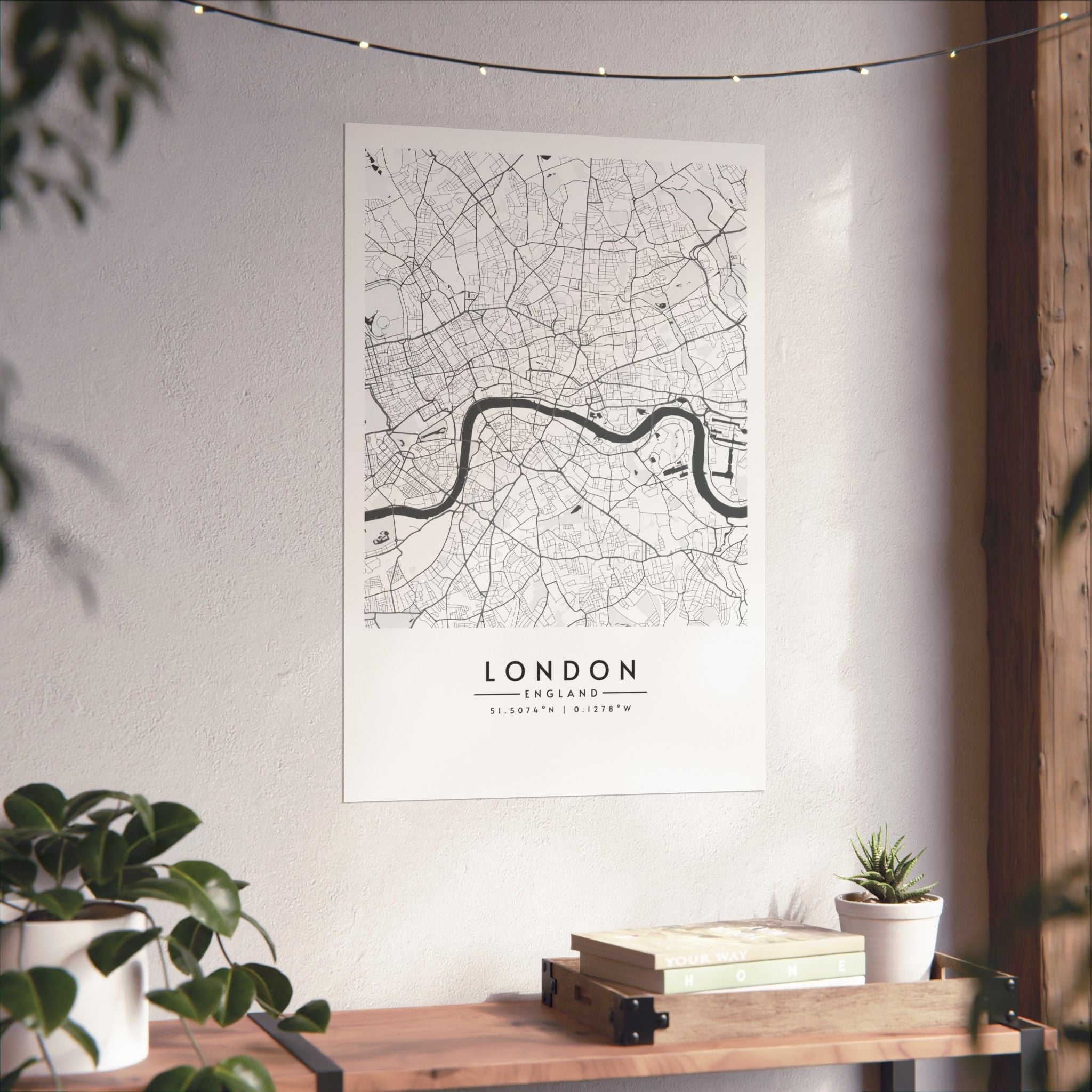A matte London map print designed to bring a clean, contemporary edge to any interior. This London City Map Poster features a detailed black-and-white street grid of the British capital, highlighting the curves of the Thames as it winds through the city. The matte surface keeps reflections low and preserves crisp linework, giving the artwork a calm, minimalist finish suited for living rooms, offices, studios, and modern interiors.