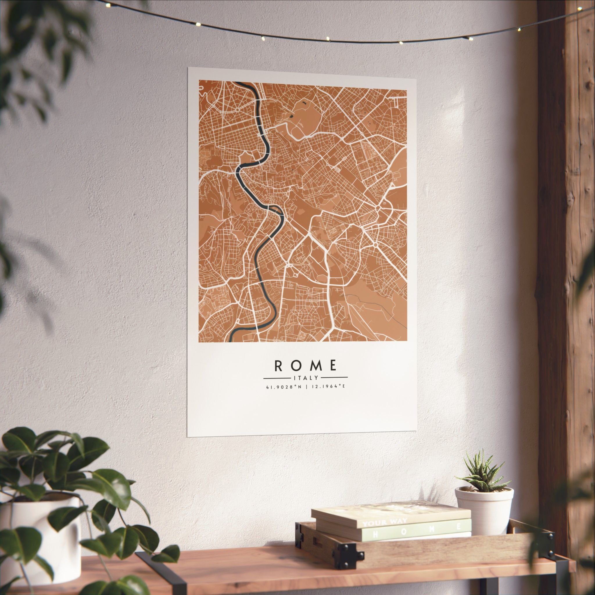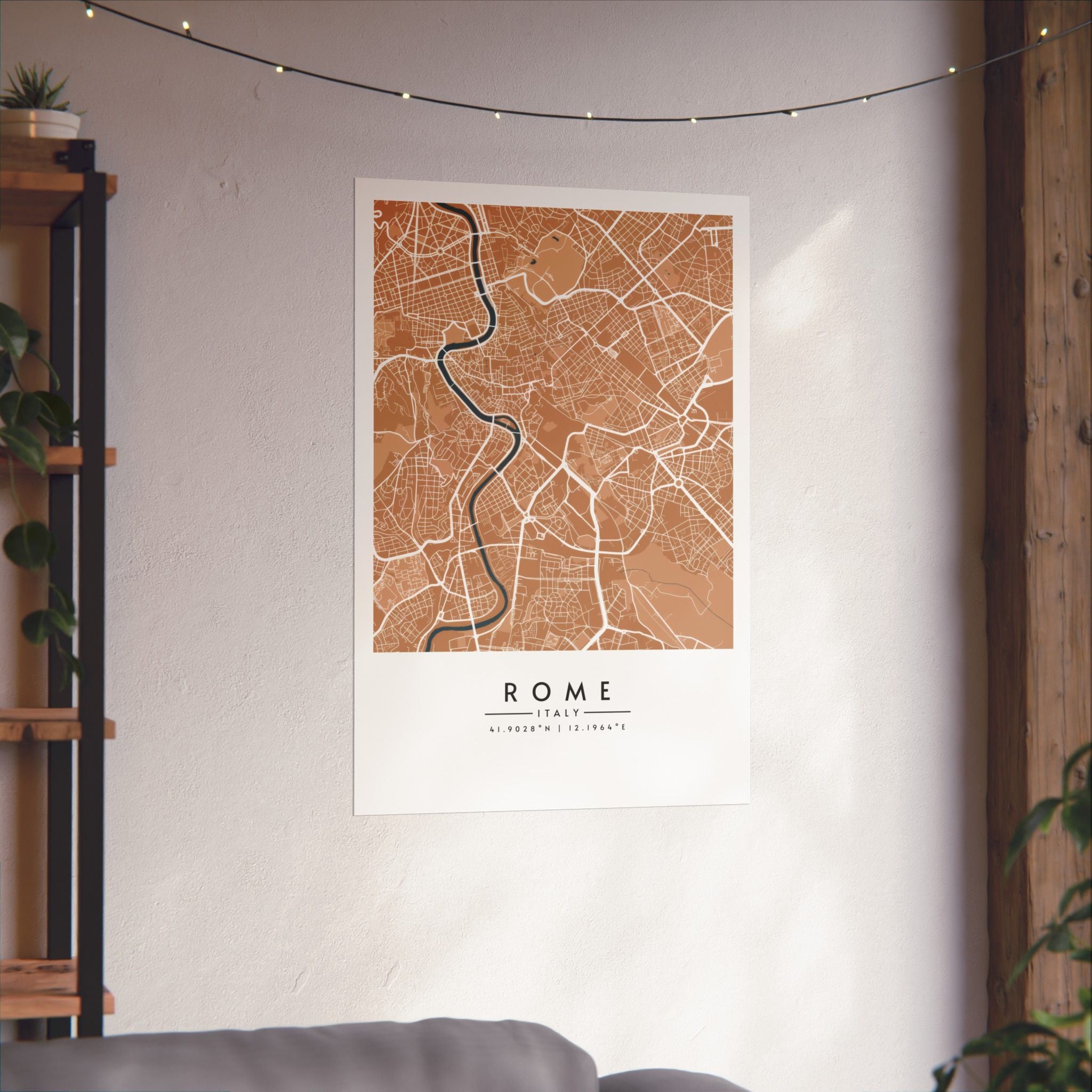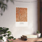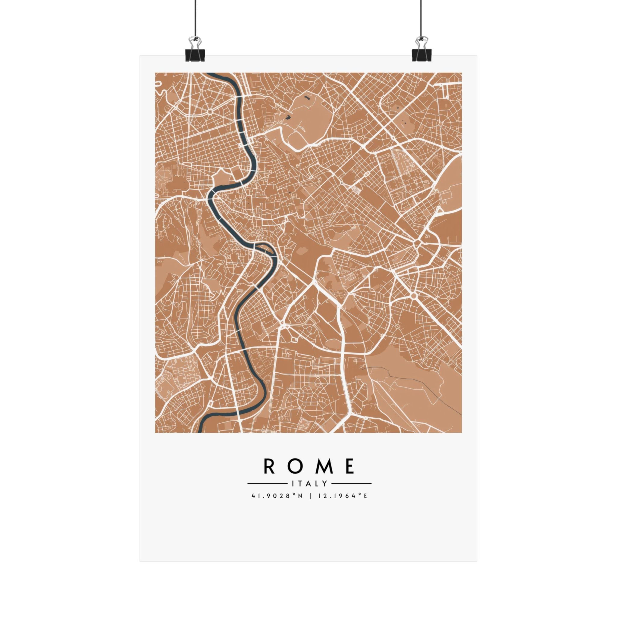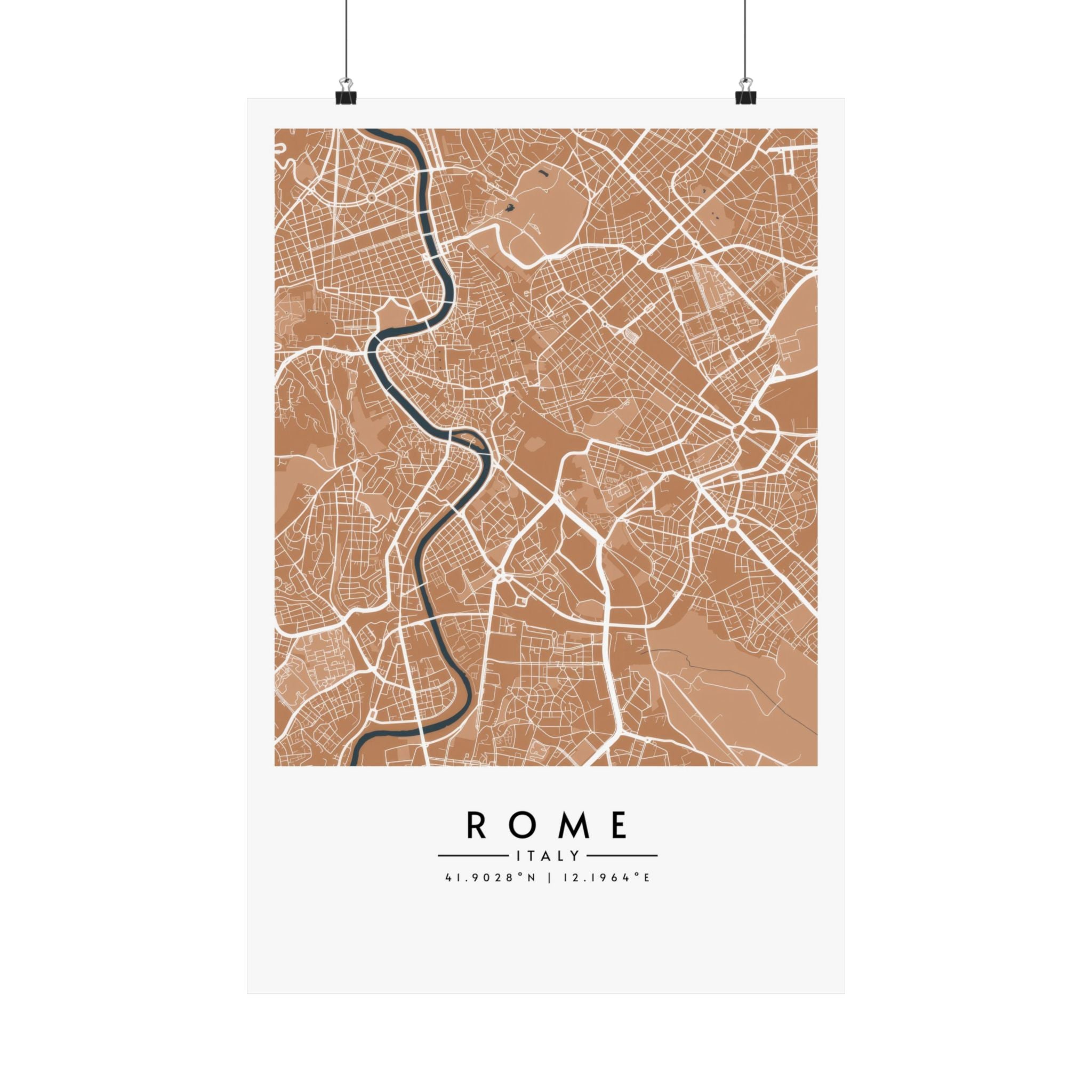 A matte Rome map print designed to bring a warm, modern edge to any interior. This Rome City Map Poster features a detailed street grid of the Italian capital, presented in earthy tan tones with soft contrasting waterways for a calm and contemporary look. The matte surface keeps reflections low and preserves crisp linework, giving the artwork a refined, design-forward finish suited for living rooms, studies, offices, and creative spaces.