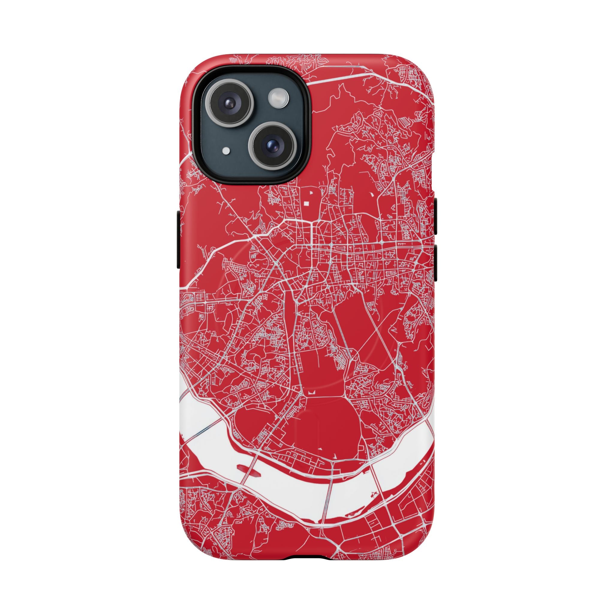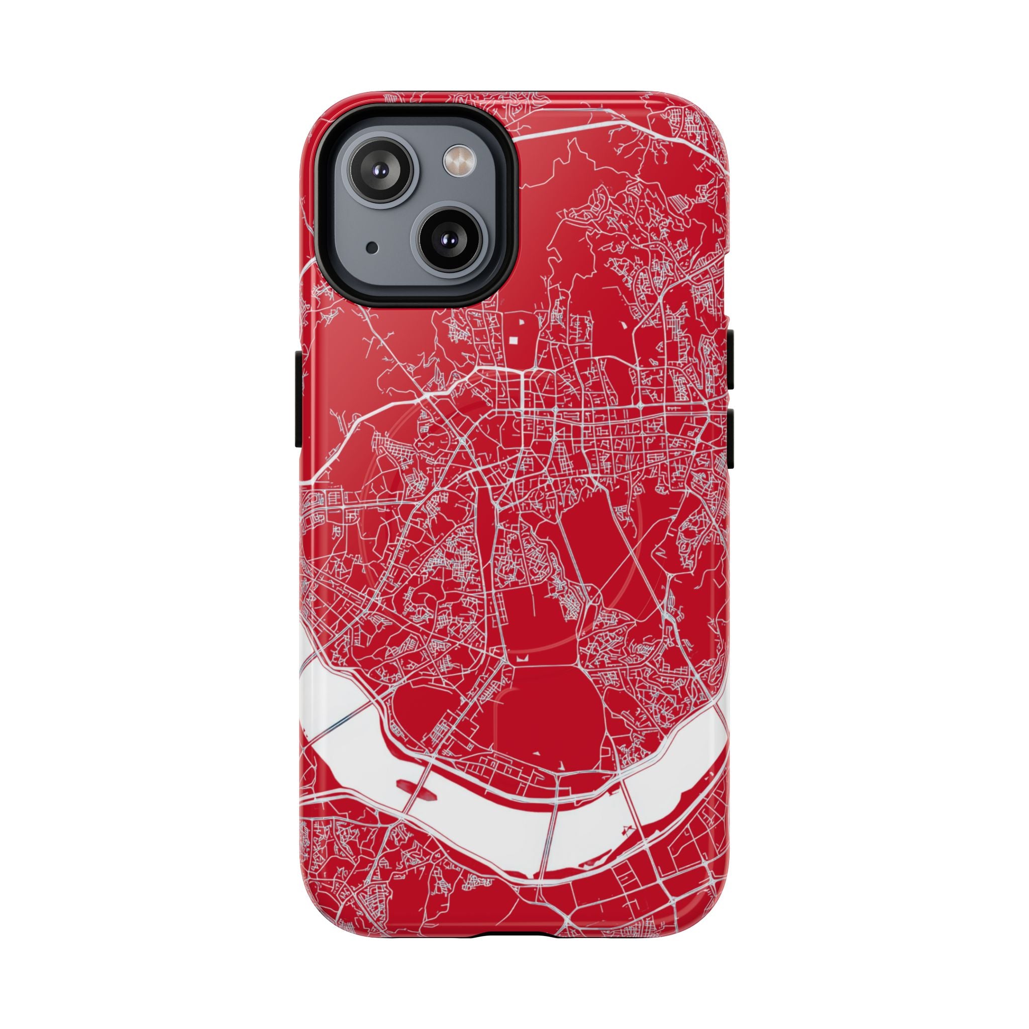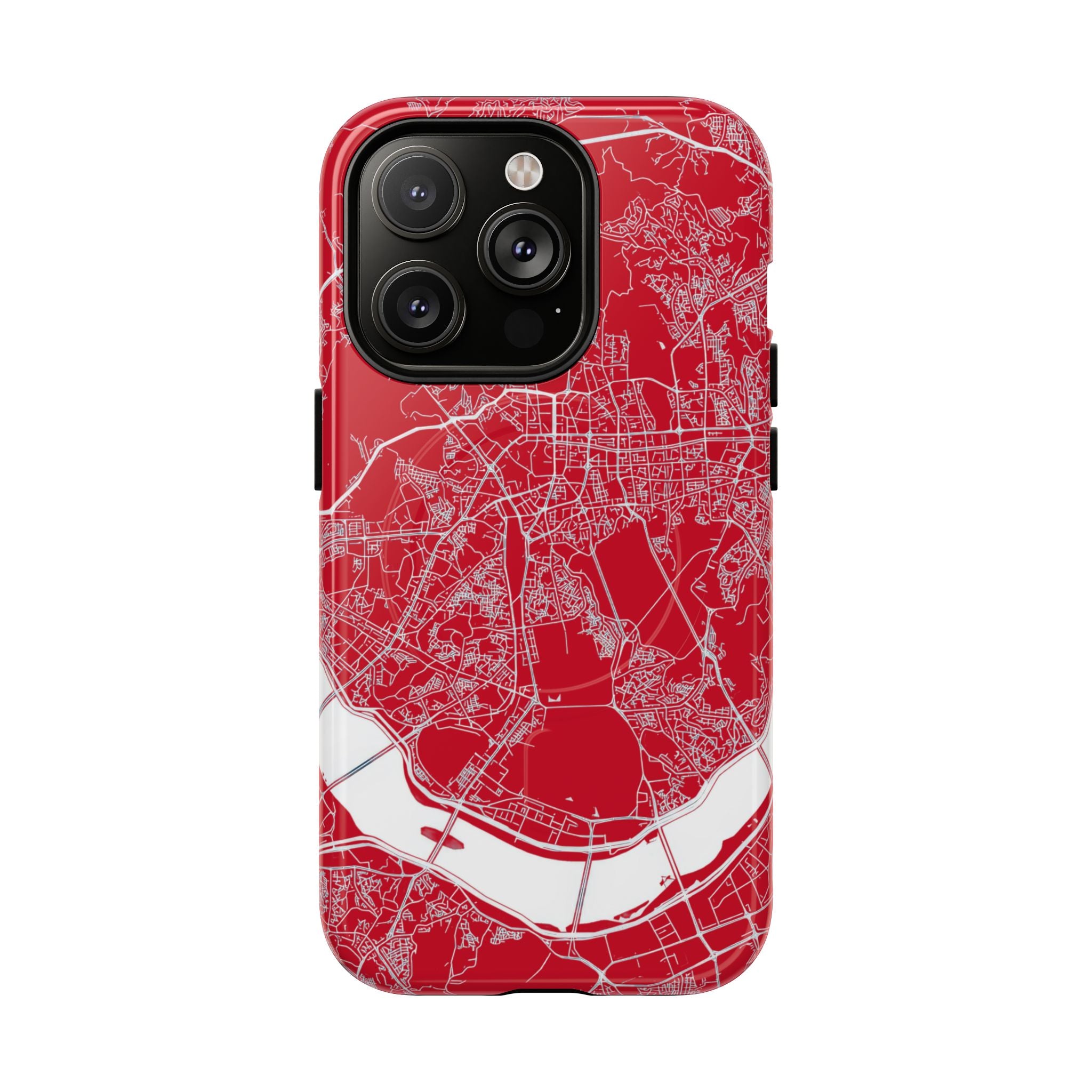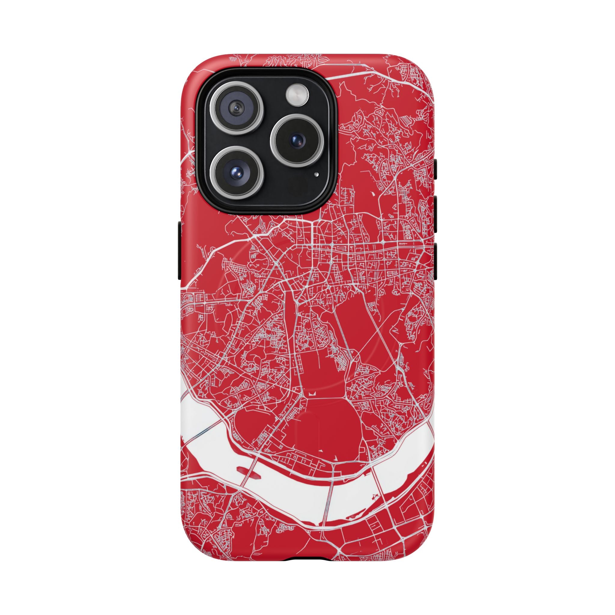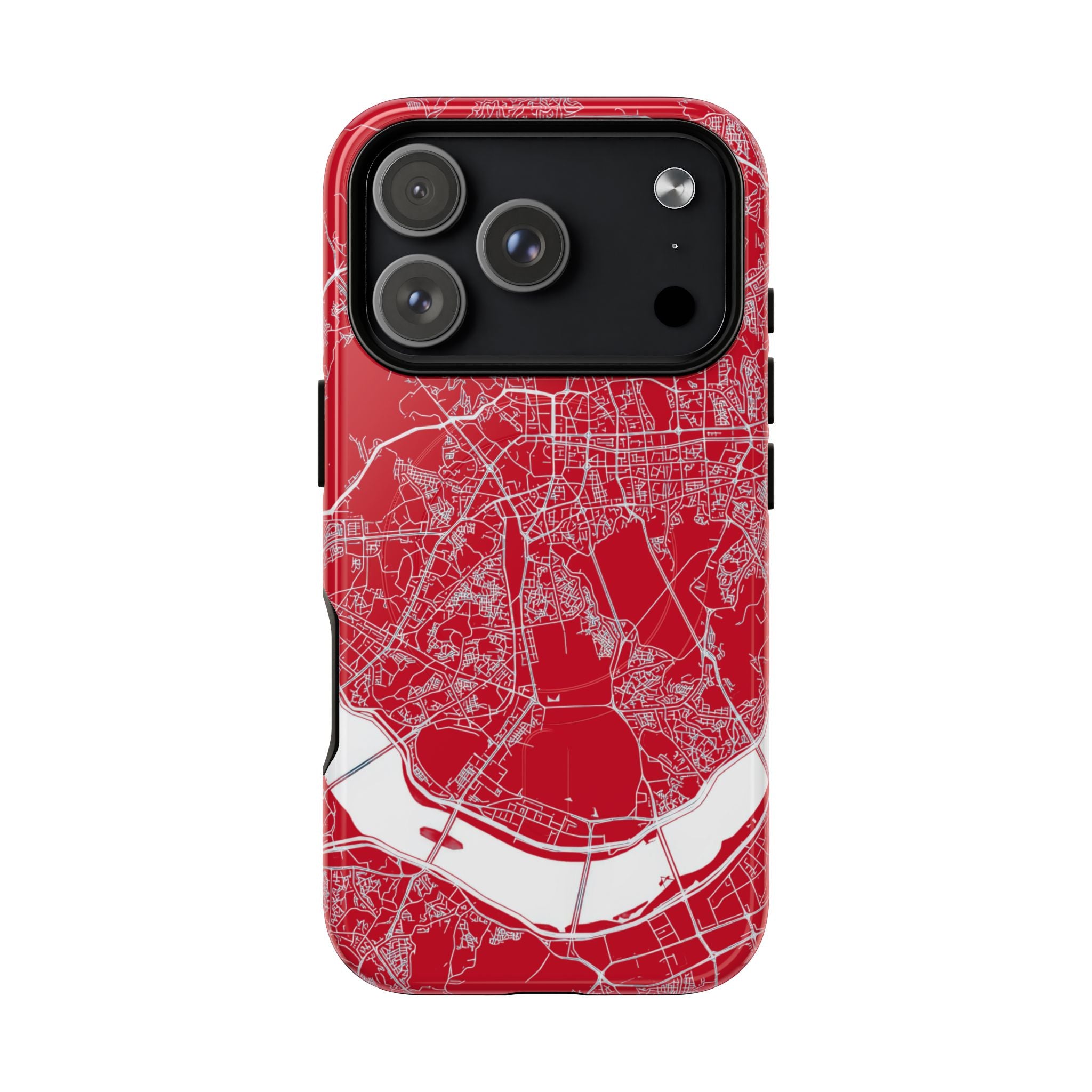 The Seoul Street Map Phone Case – River Edition (Red) transforms the city’s layered street network into a bold, high-impact graphic statement. Set against a vivid red backdrop, crisp white linework traces Seoul’s intricate roads, bridges, and the sweeping course of the Han River, placing the river at the heart of the design.