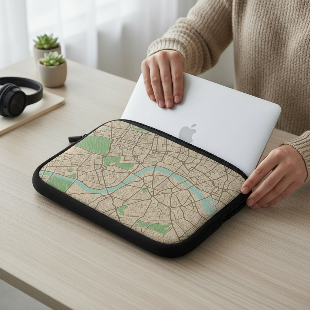 Protect your laptop with a design that tells a story. Our custom map laptop sleeves feature personalised city maps, combining practical protection with clean, modern cartography for work, travel, or creative spaces.