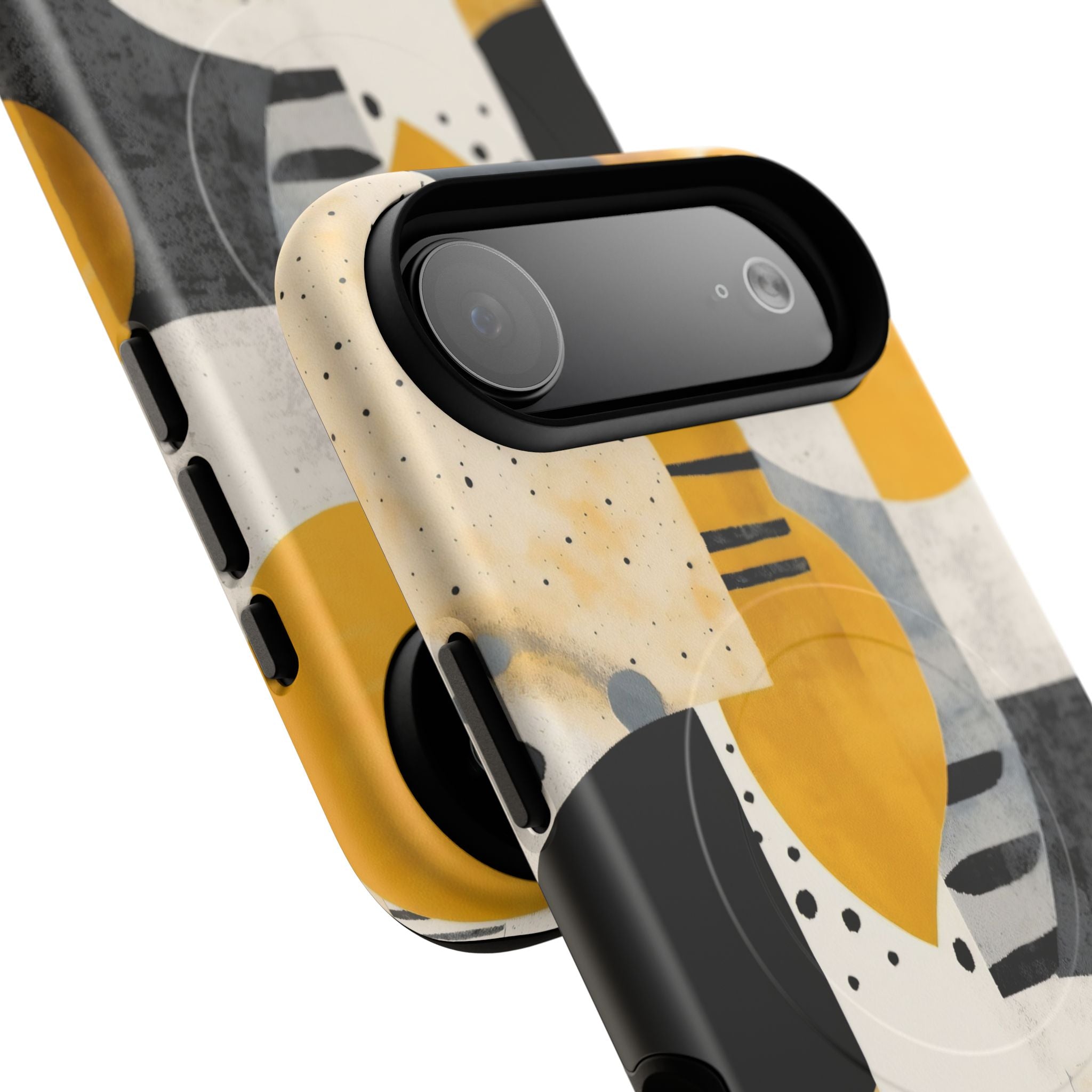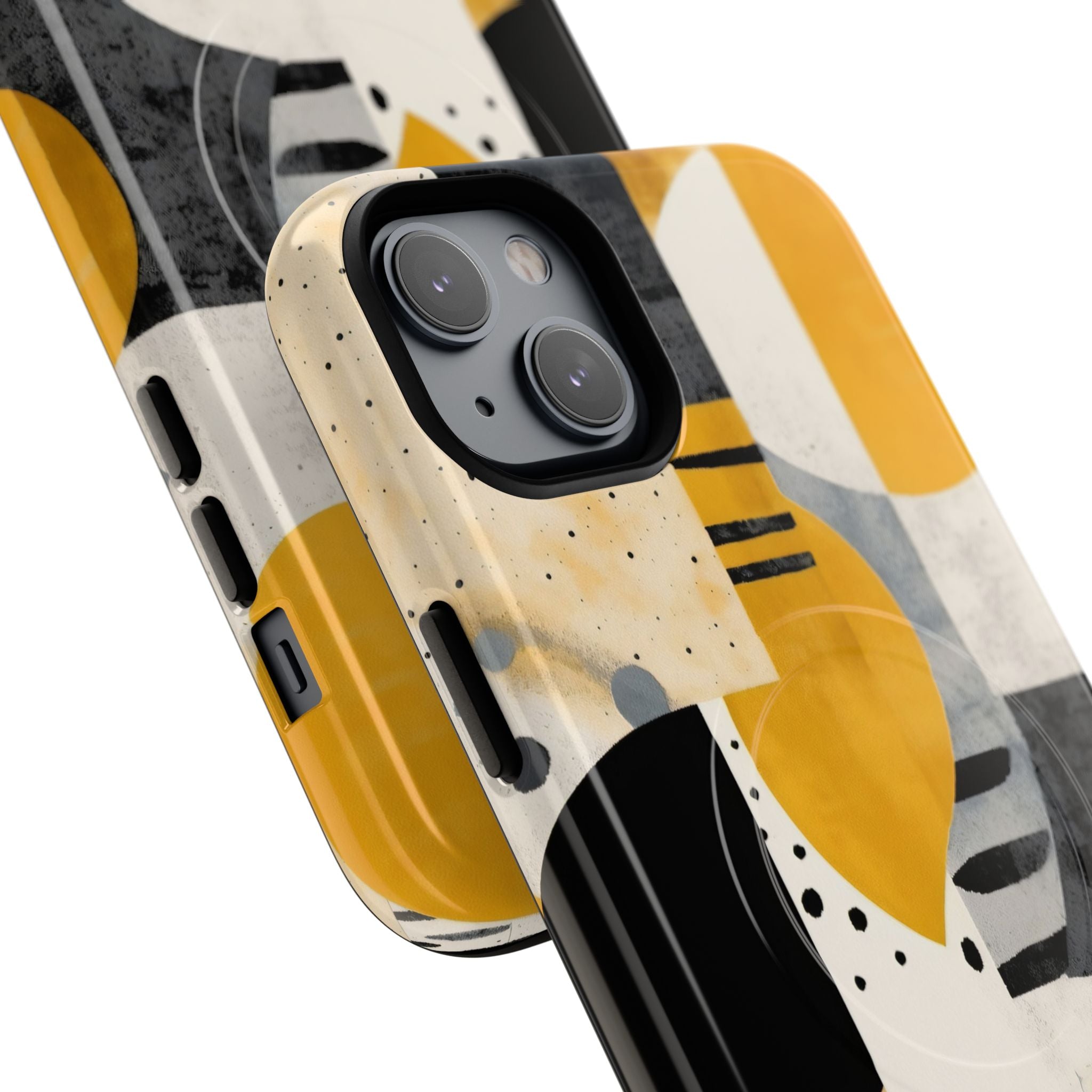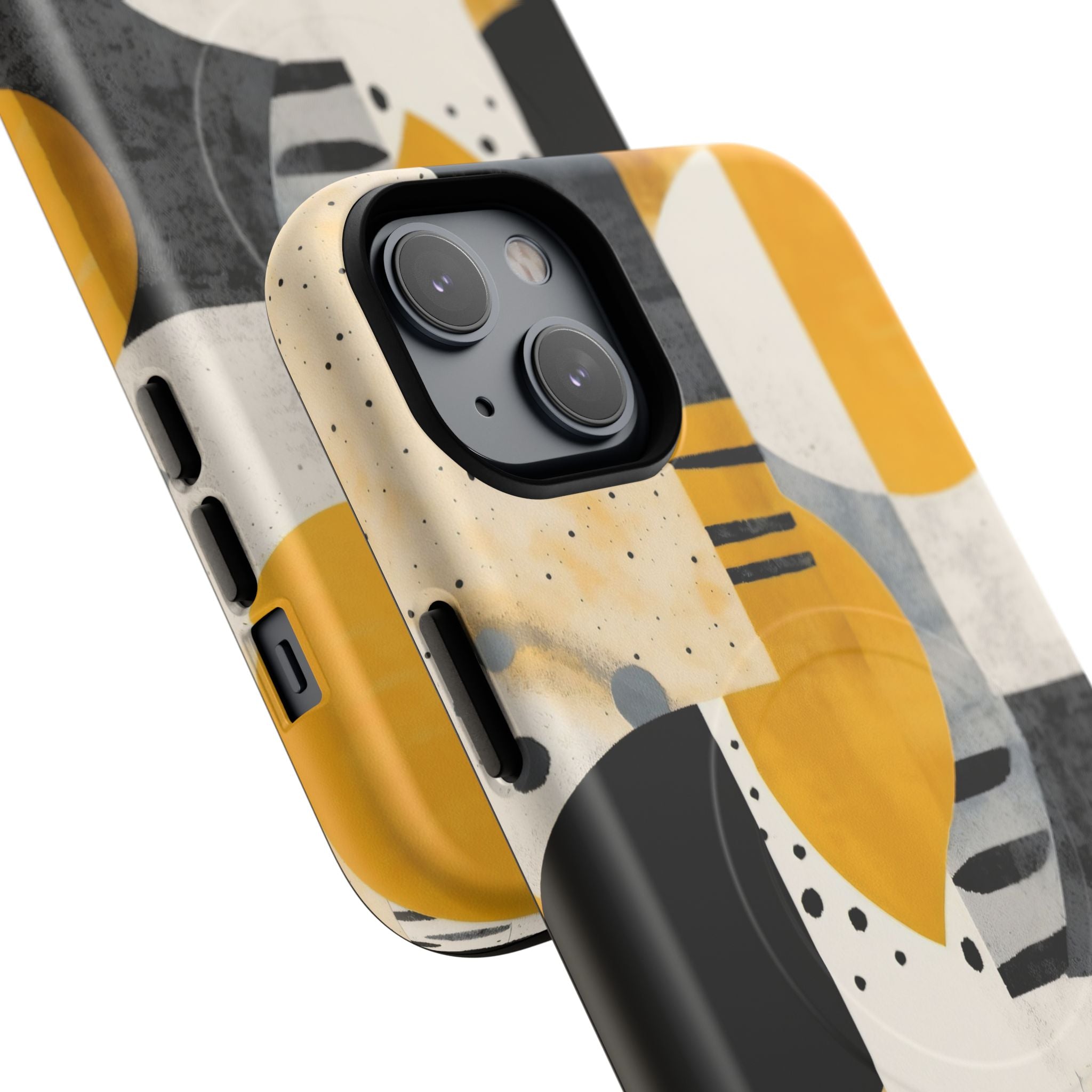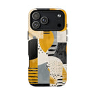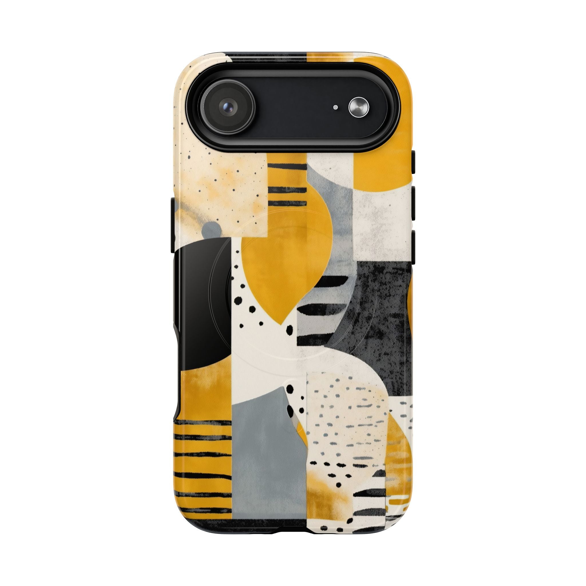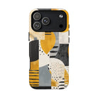This ANTIPODE Abstract Phone Case from the Modern Art Edition features a lively composition of arcs, stripes, dots, and colour blocks in tones of saffron yellow, slate grey, charcoal, cream, and soft white. The interplay of painted textures and graphic marks gives the artwork the vibrancy of a modern mural — energetic yet balanced, expressive yet refined.