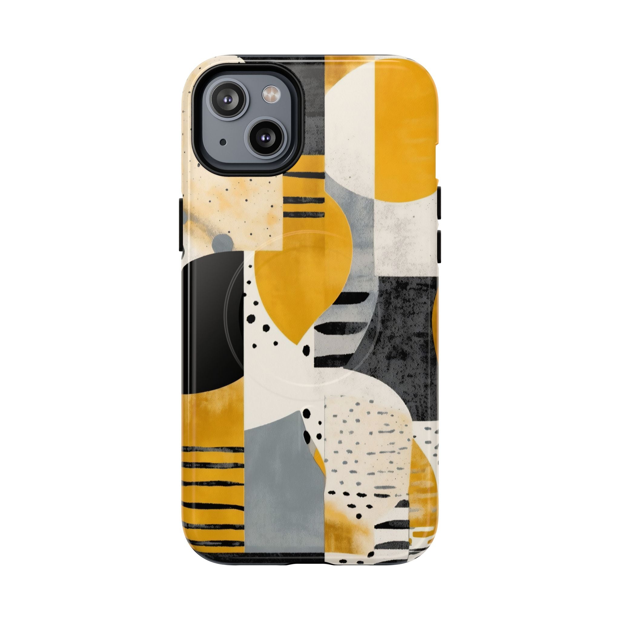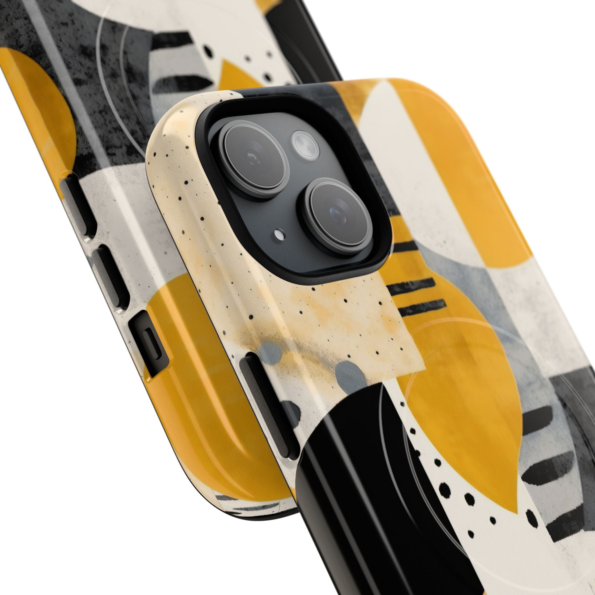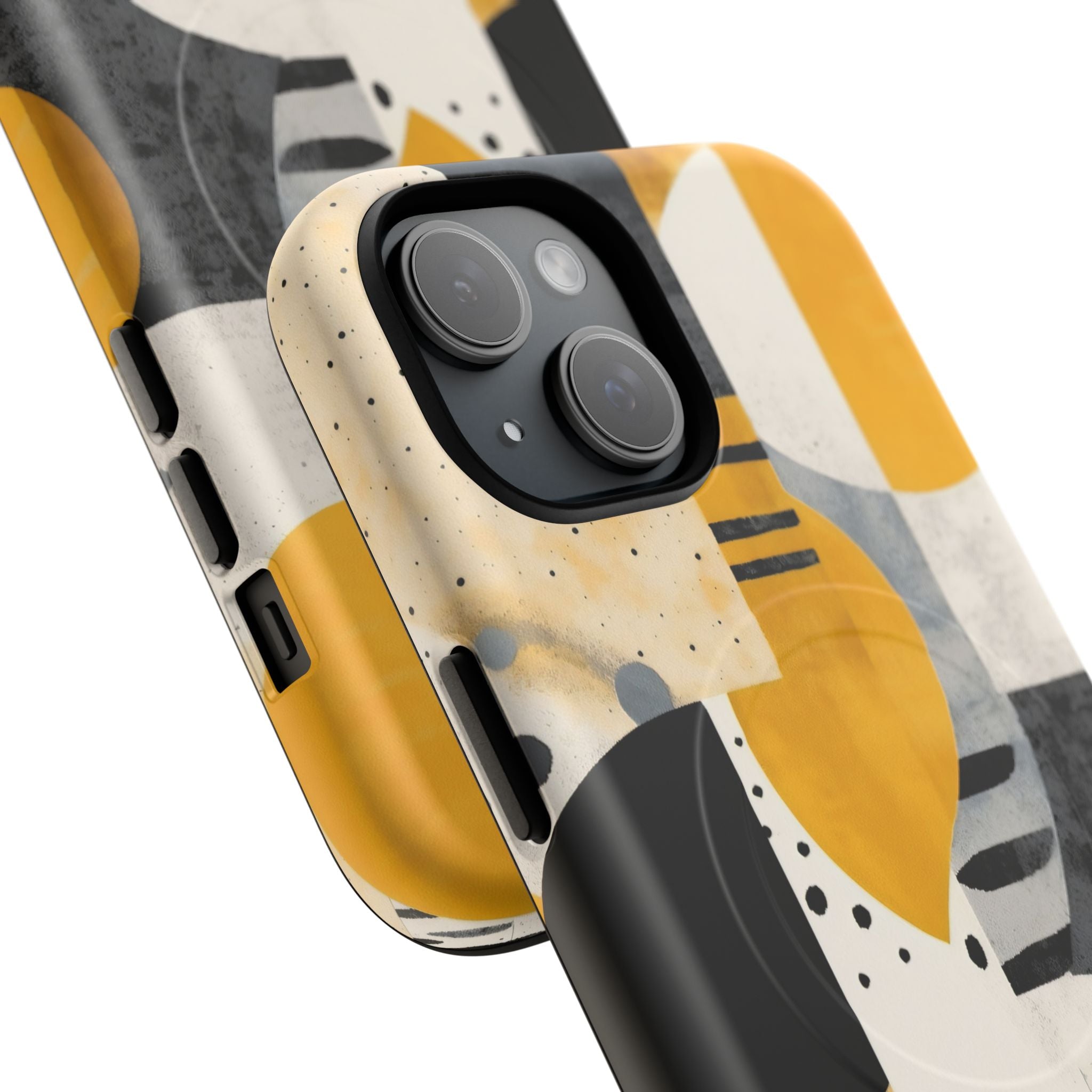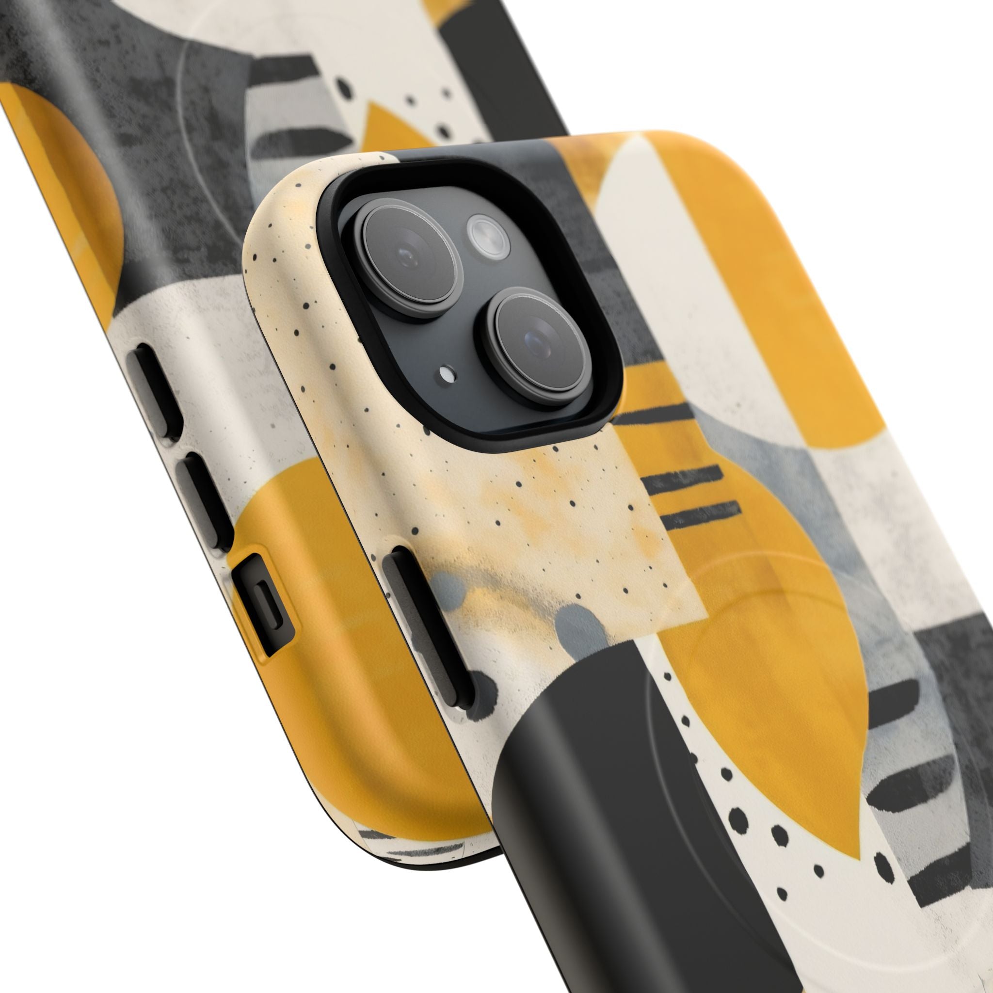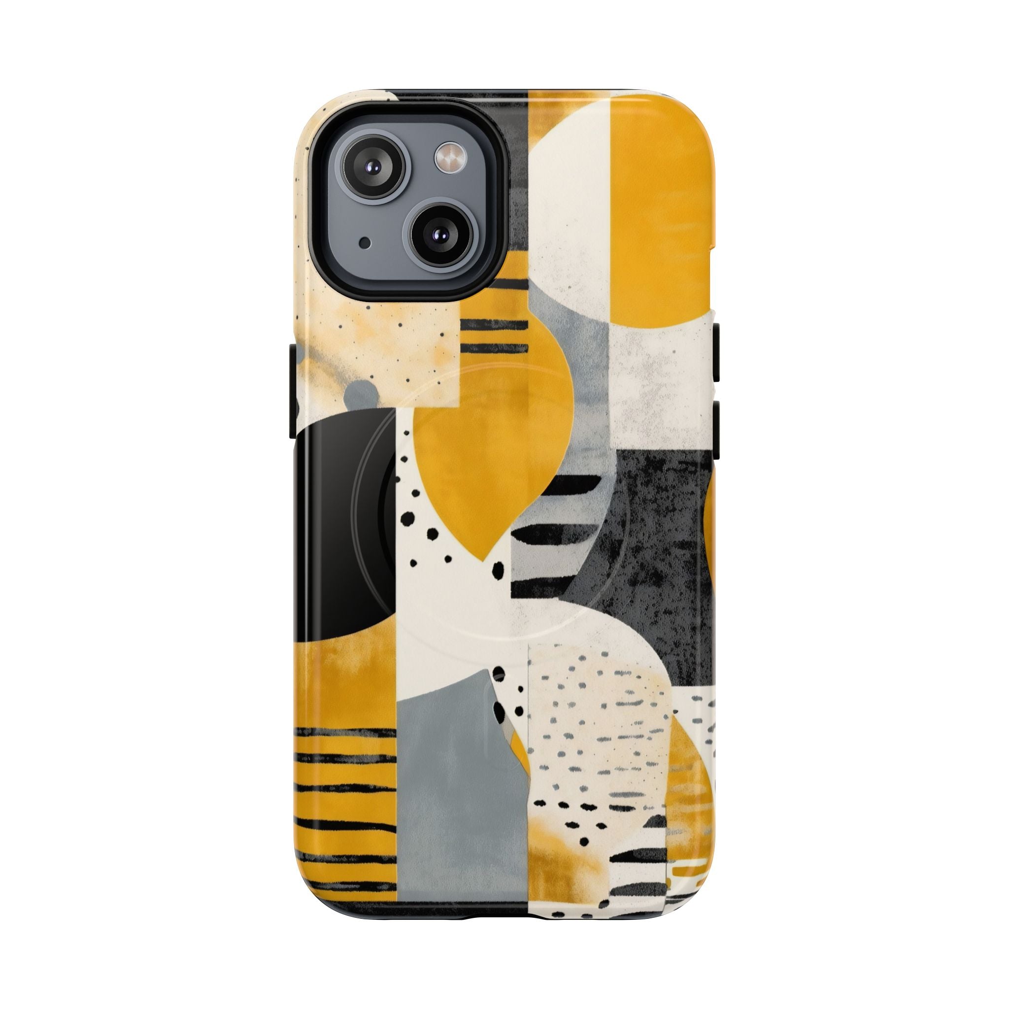 This ANTIPODE Abstract Phone Case from the Modern Art Edition features a lively composition of arcs, stripes, dots, and colour blocks in tones of saffron yellow, slate grey, charcoal, cream, and soft white. The interplay of painted textures and graphic marks gives the artwork the vibrancy of a modern mural — energetic yet balanced, expressive yet refined.