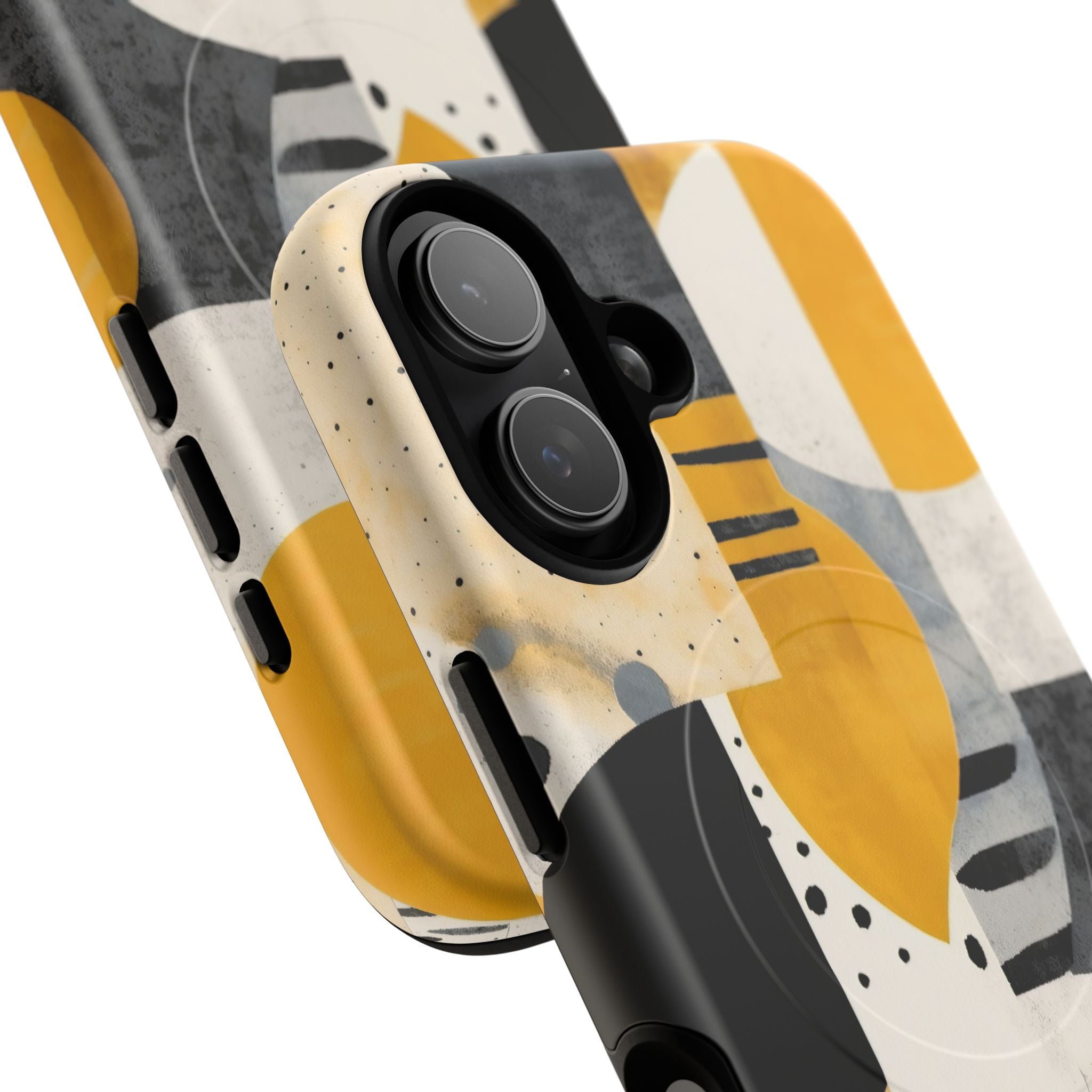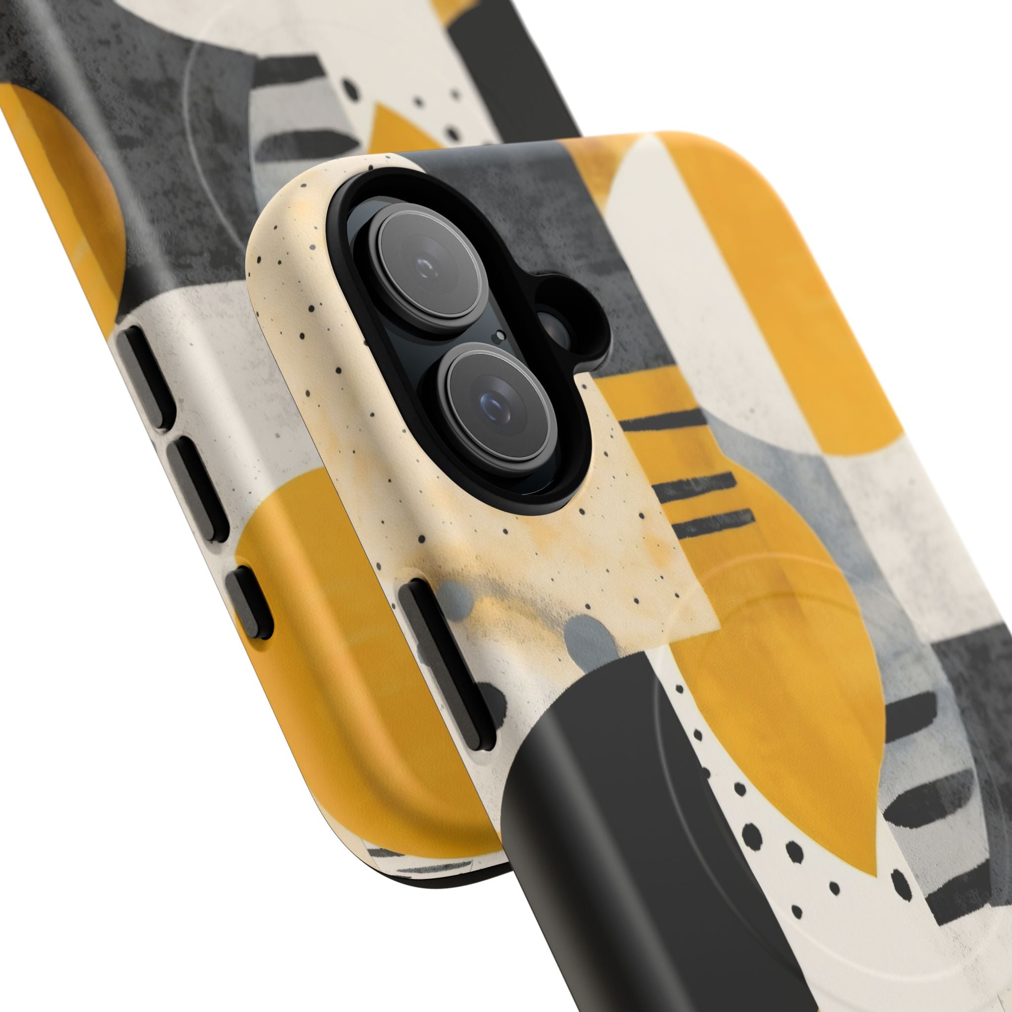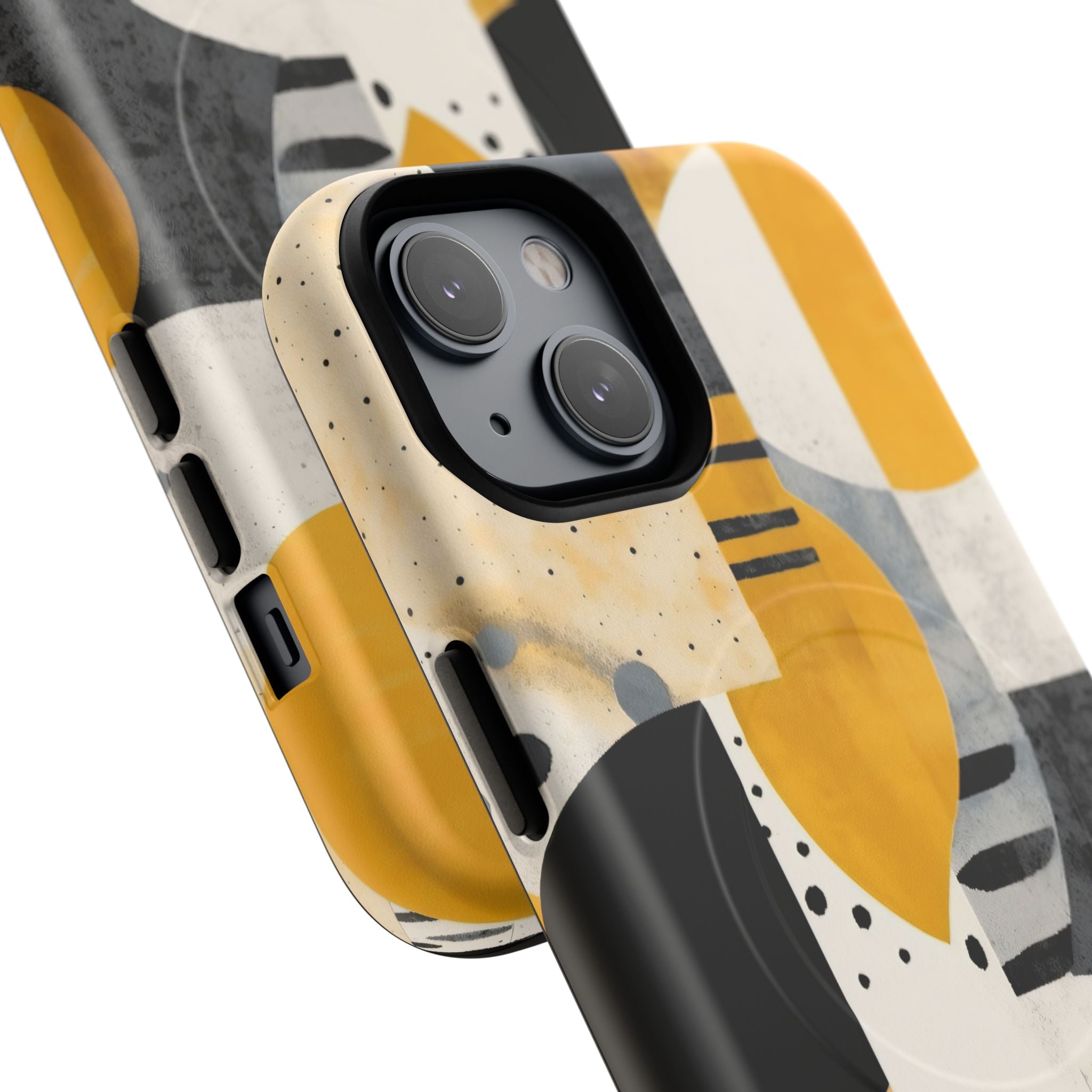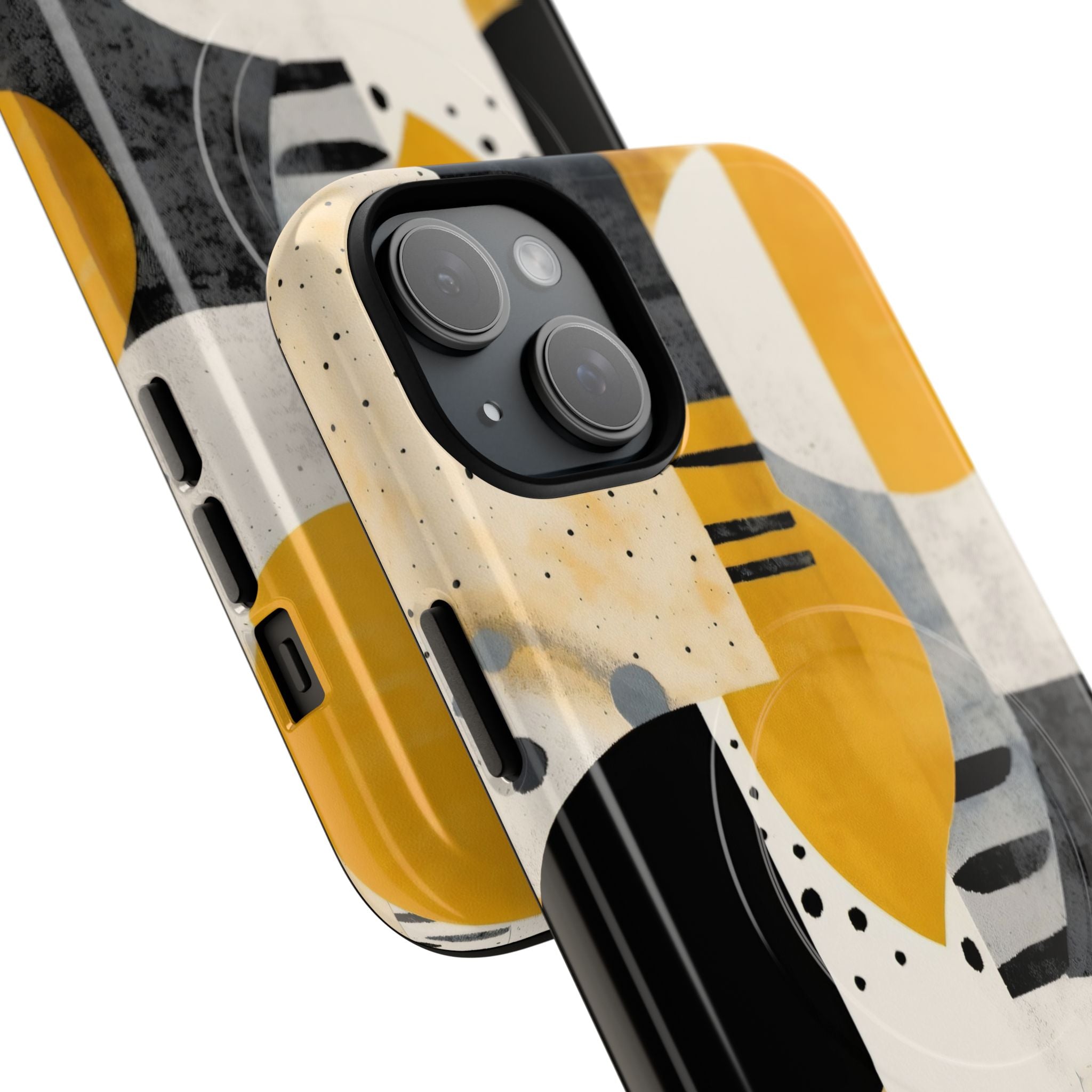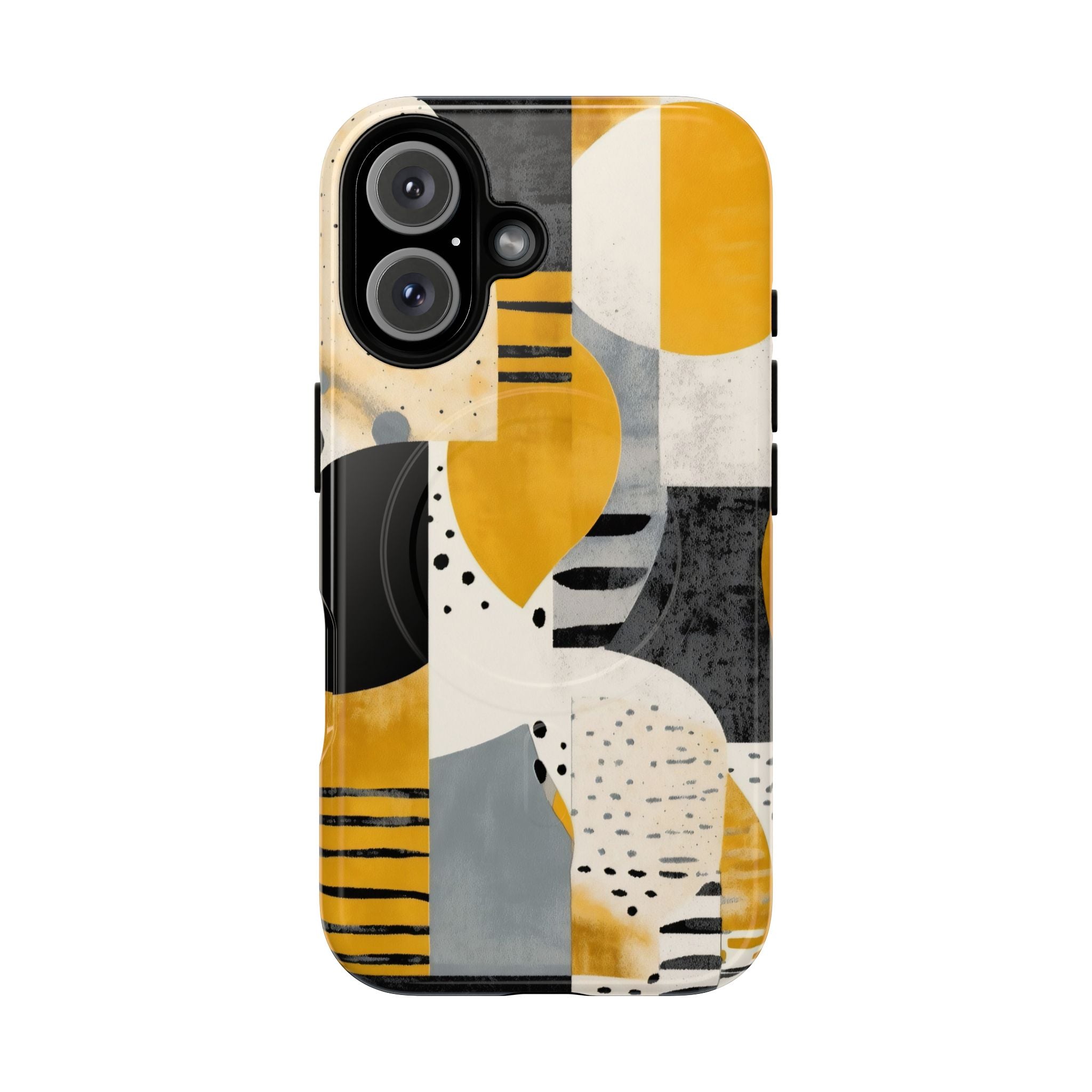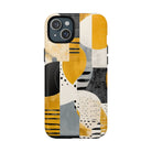 This ANTIPODE Abstract Phone Case from the Modern Art Edition features a lively composition of arcs, stripes, dots, and colour blocks in tones of saffron yellow, slate grey, charcoal, cream, and soft white. The interplay of painted textures and graphic marks gives the artwork the vibrancy of a modern mural — energetic yet balanced, expressive yet refined.