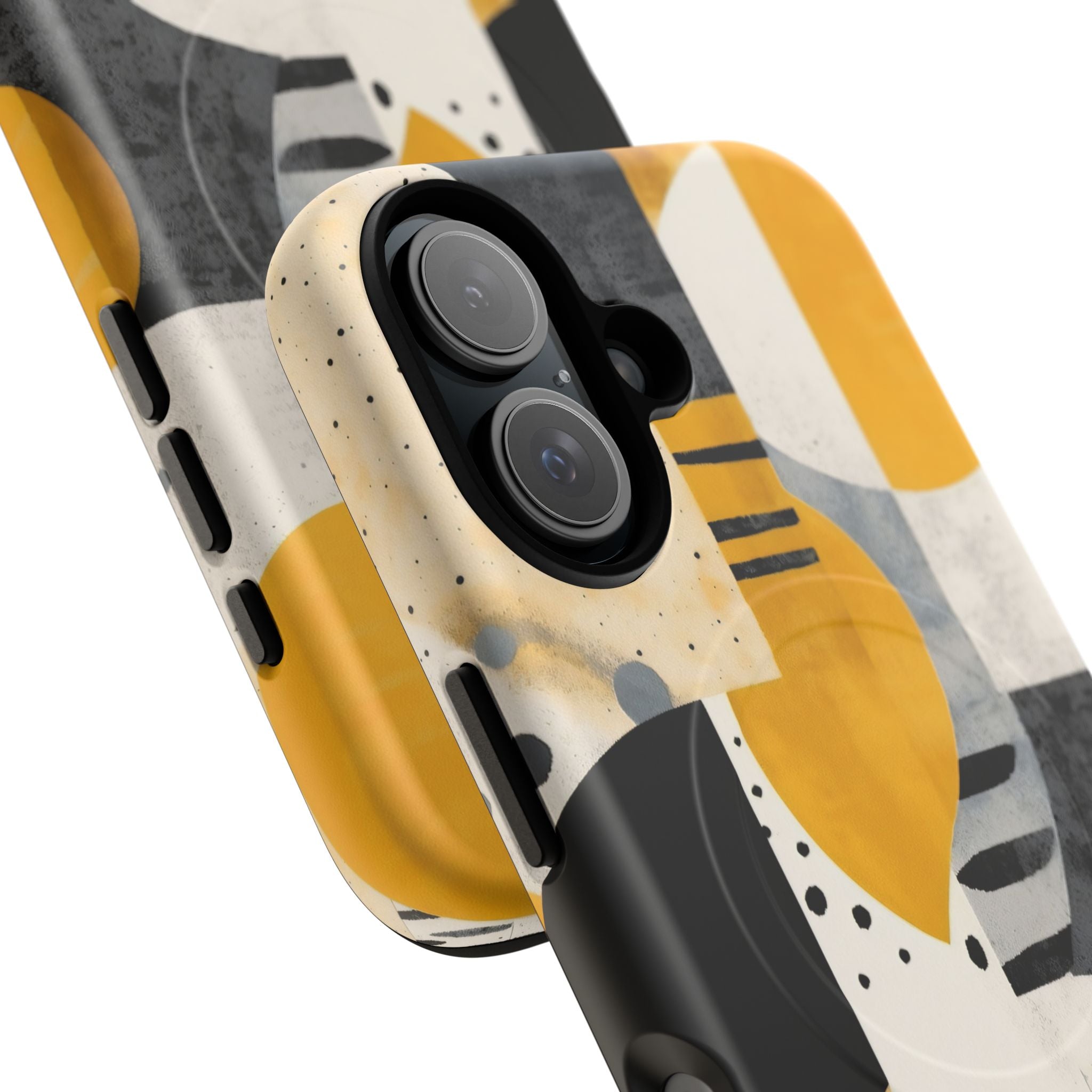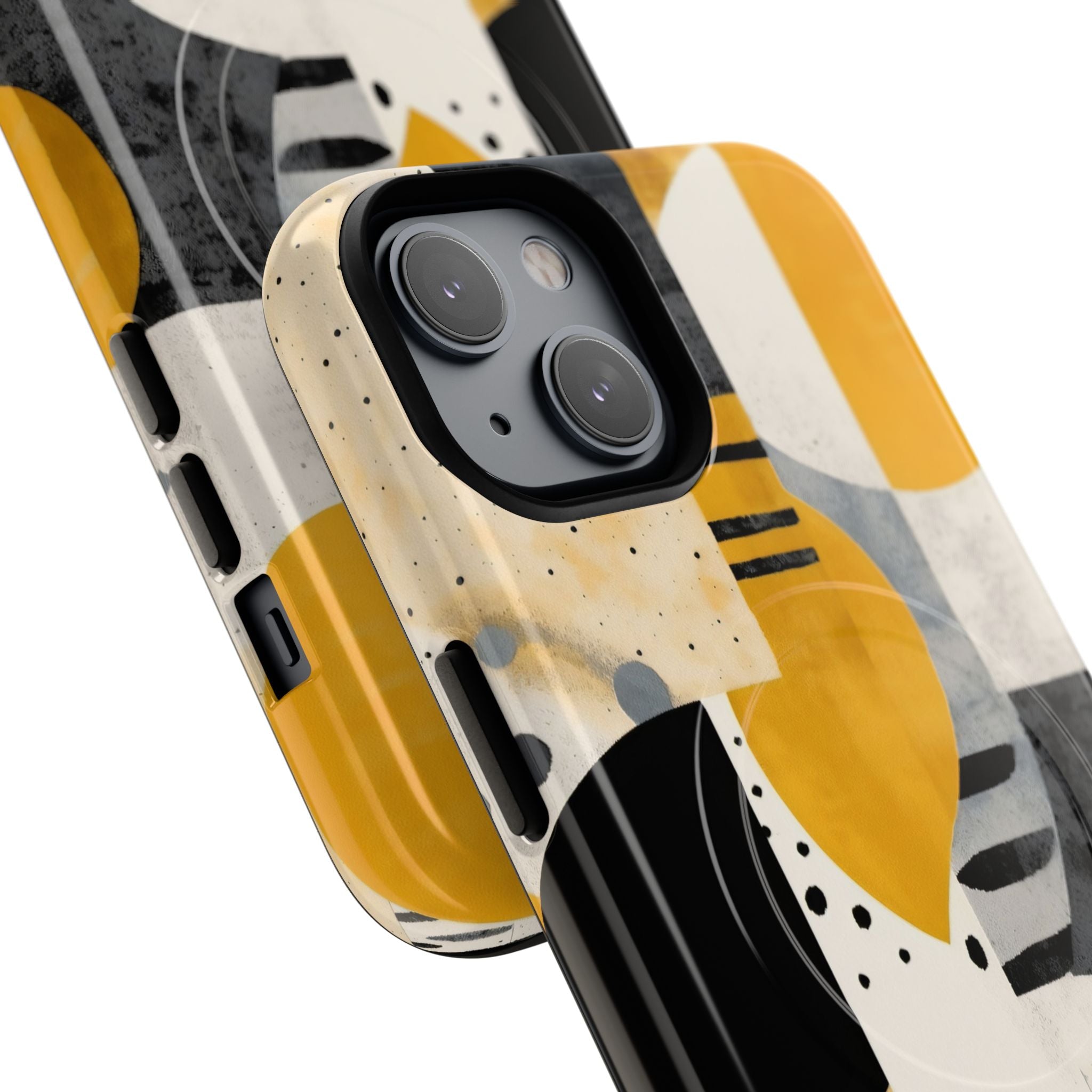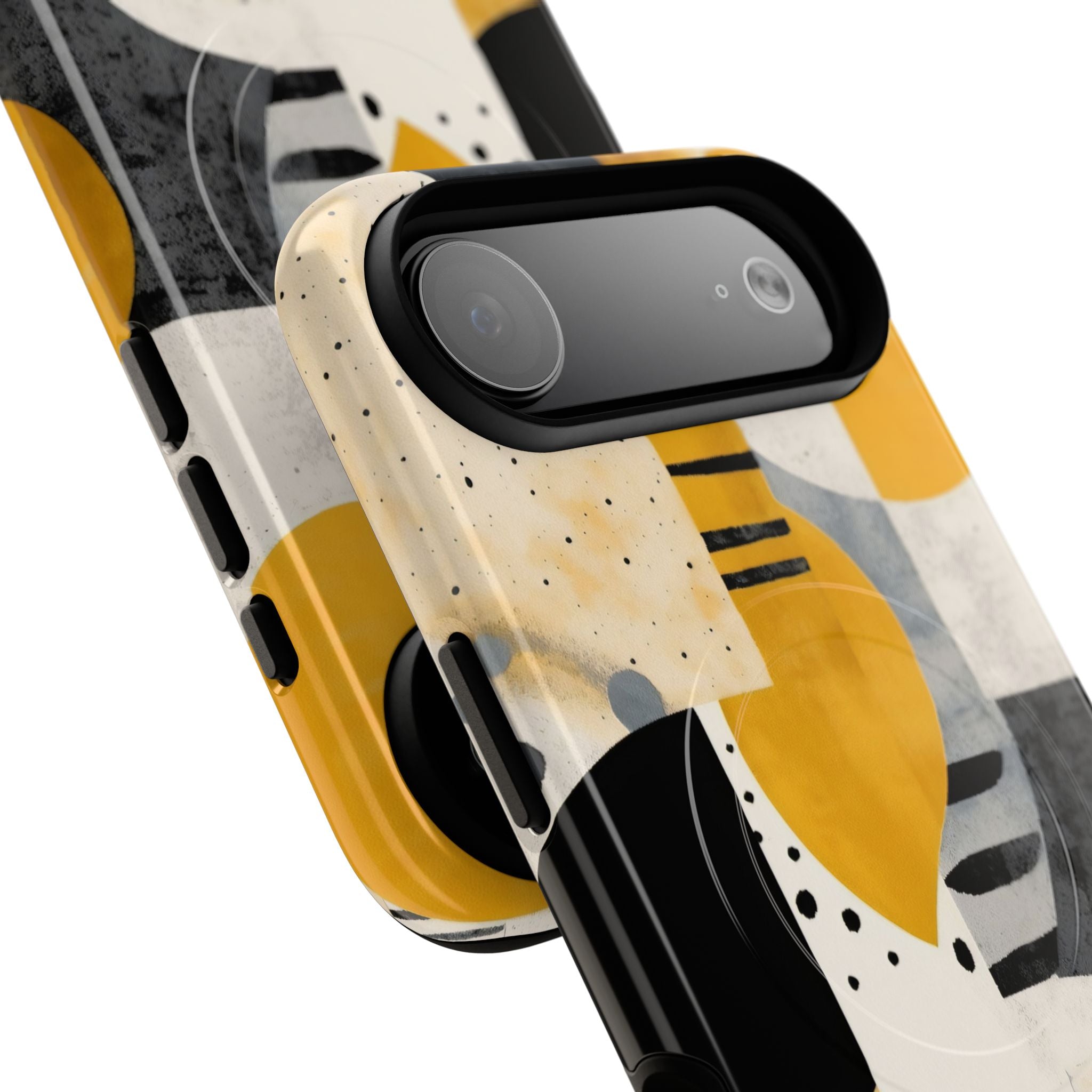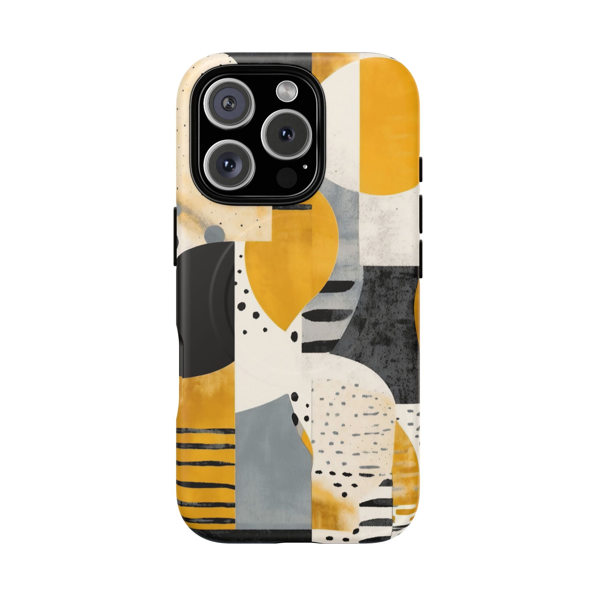 This ANTIPODE Abstract Phone Case from the Modern Art Edition features a lively composition of arcs, stripes, dots, and colour blocks in tones of saffron yellow, slate grey, charcoal, cream, and soft white. The interplay of painted textures and graphic marks gives the artwork the vibrancy of a modern mural — energetic yet balanced, expressive yet refined.