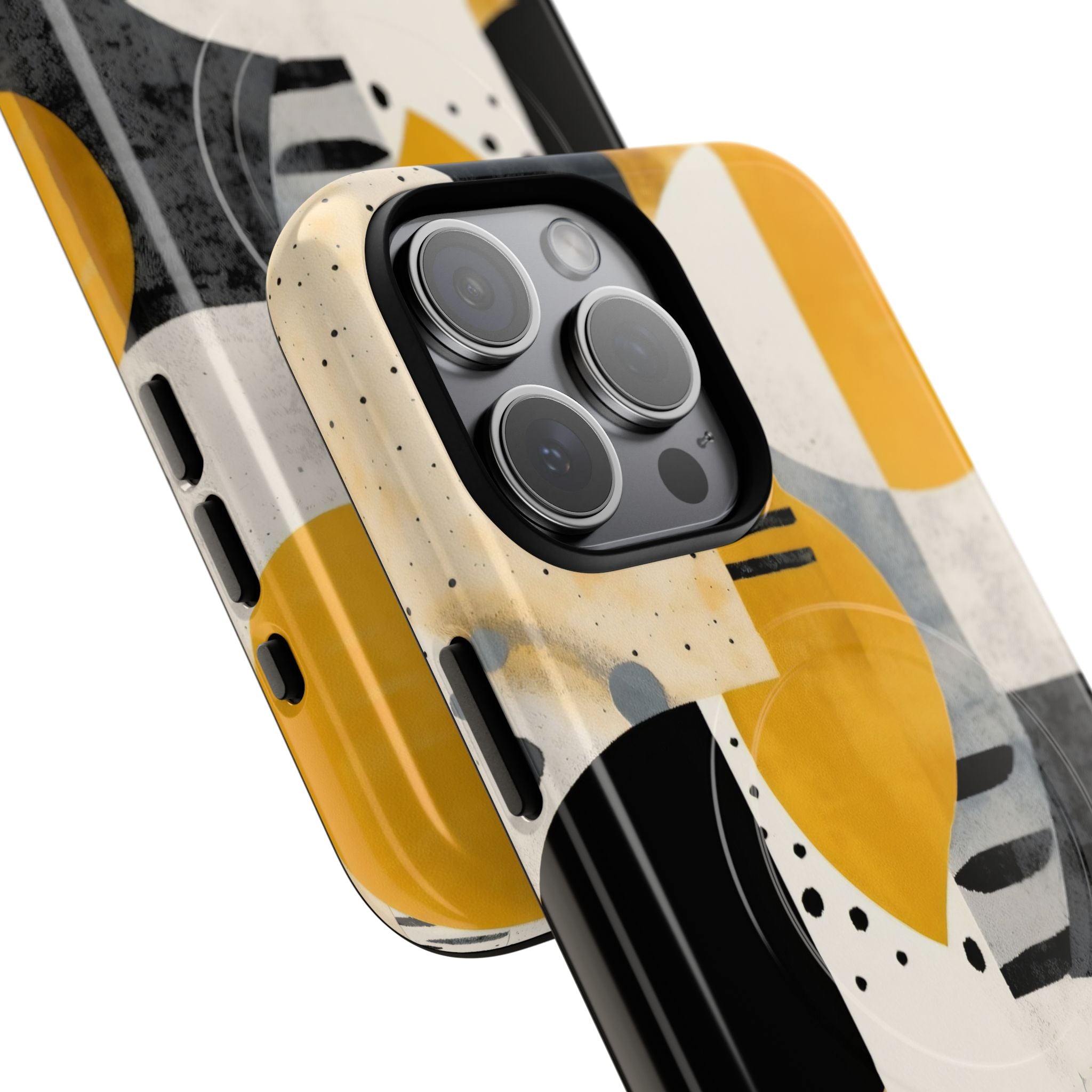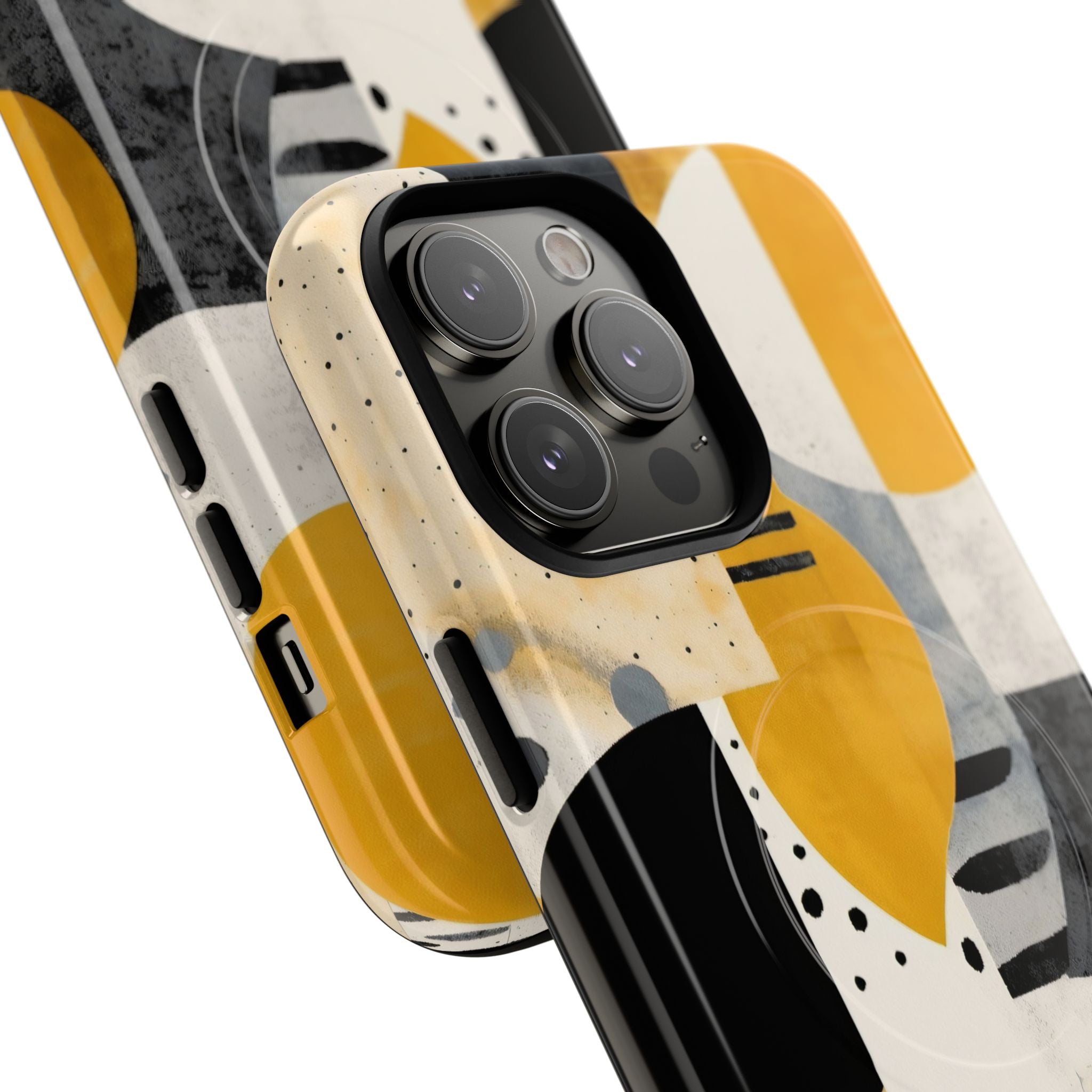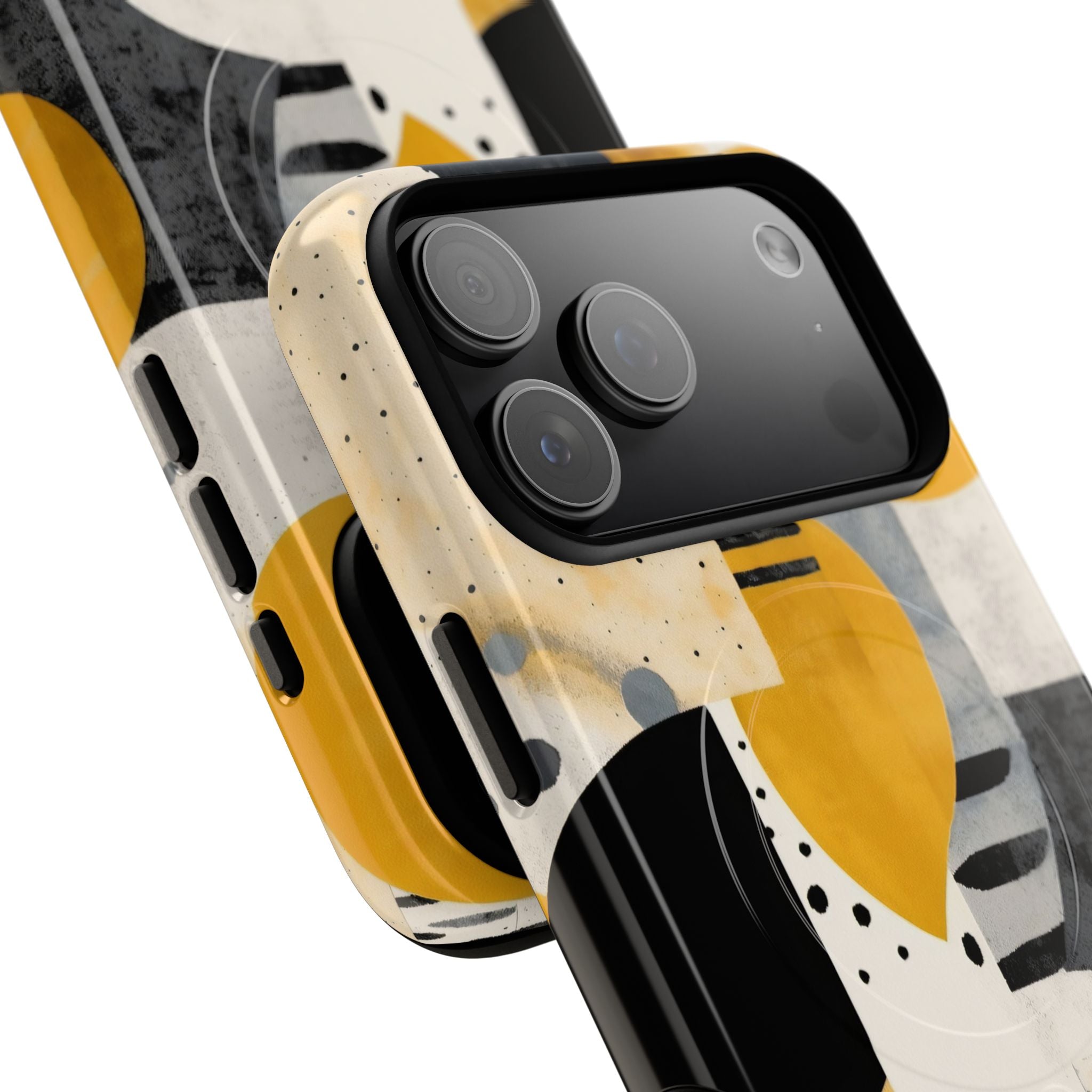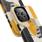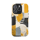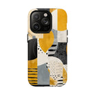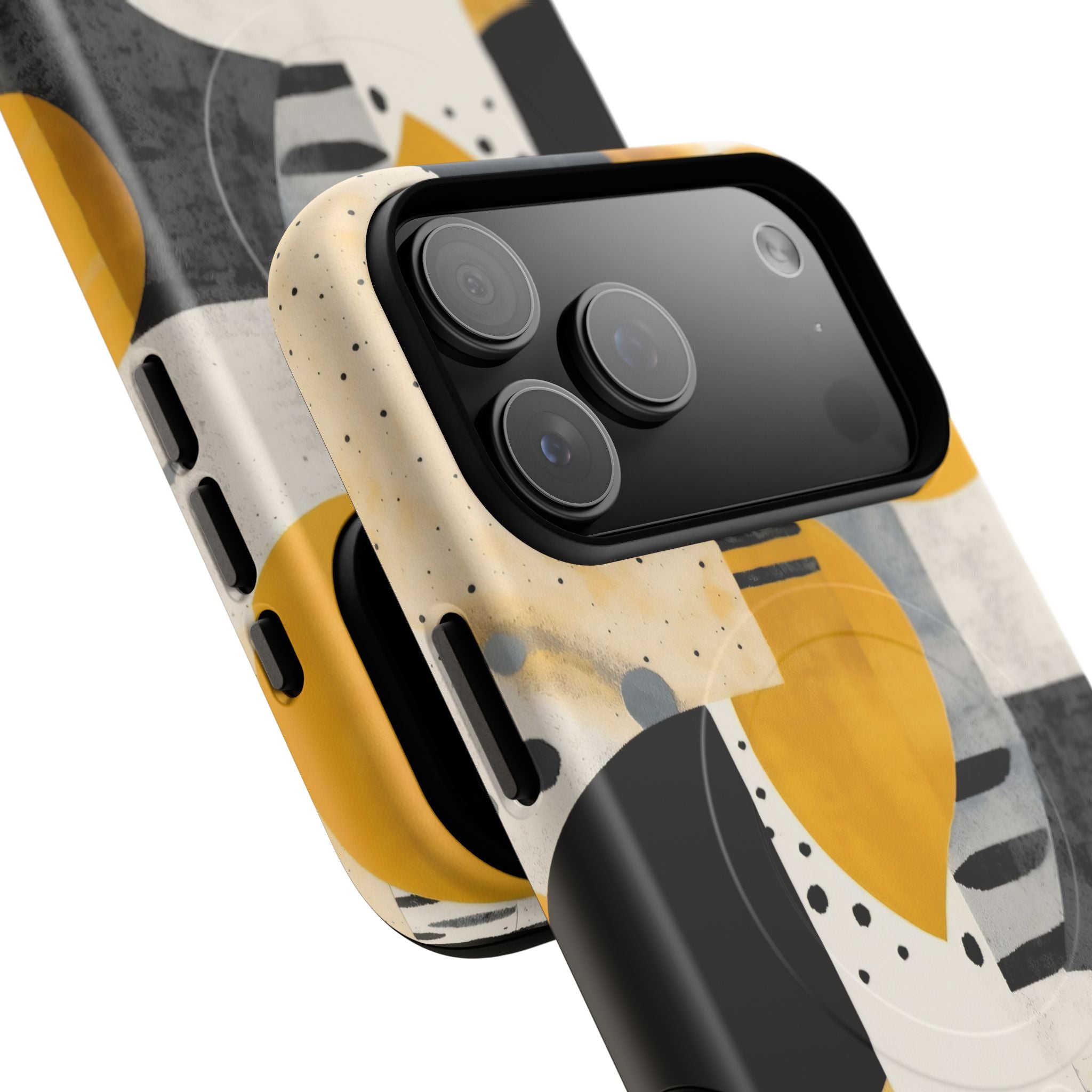 This ANTIPODE Abstract Phone Case from the Modern Art Edition features a lively composition of arcs, stripes, dots, and colour blocks in tones of saffron yellow, slate grey, charcoal, cream, and soft white. The interplay of painted textures and graphic marks gives the artwork the vibrancy of a modern mural — energetic yet balanced, expressive yet refined.