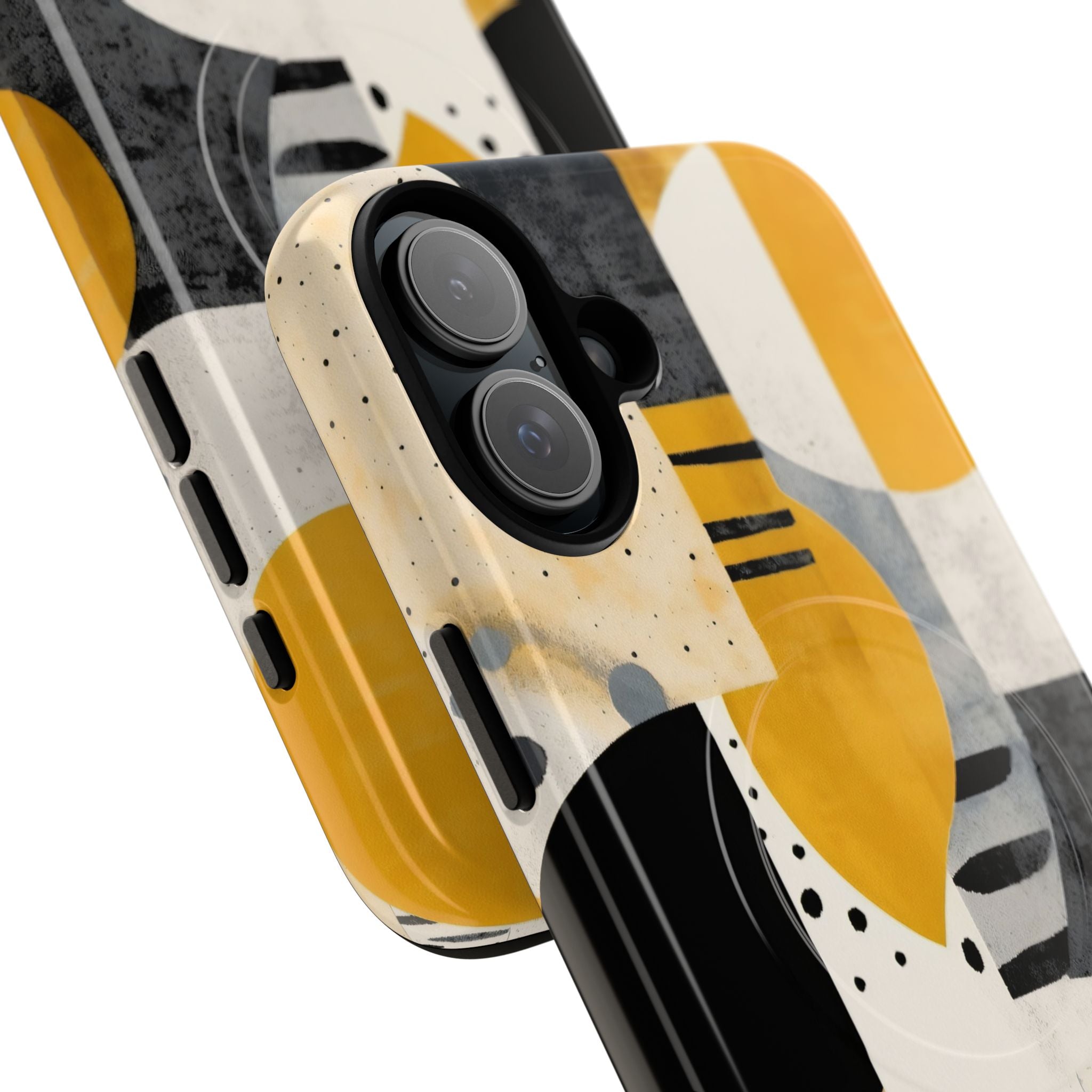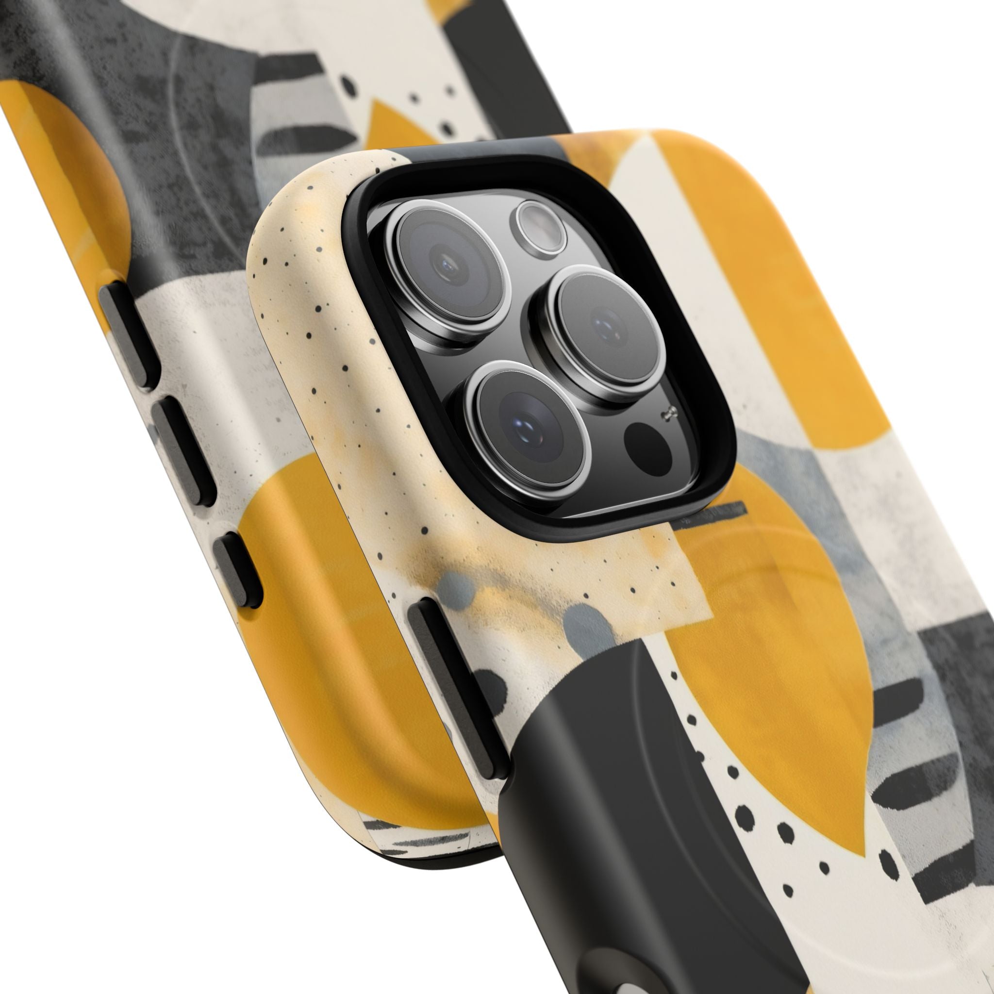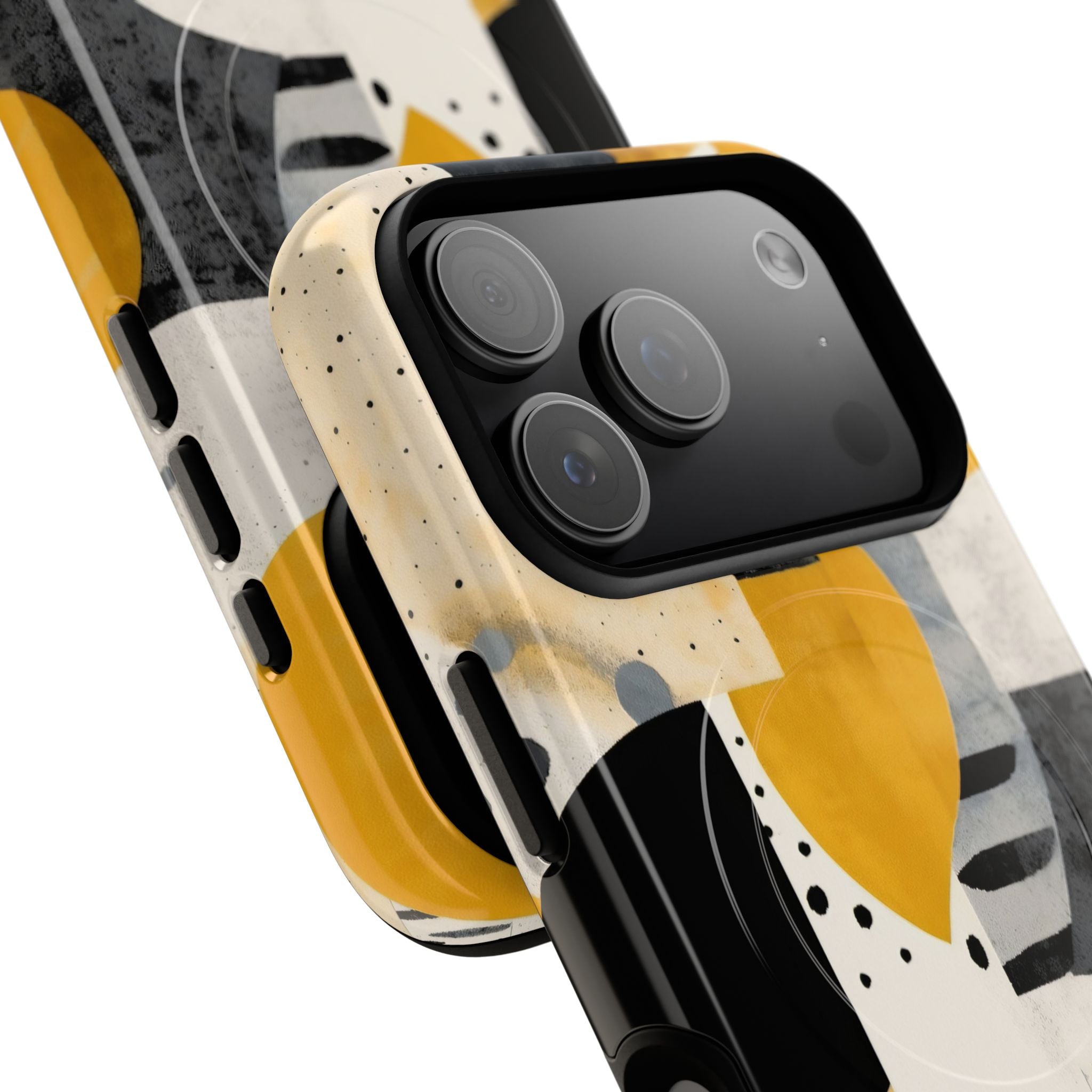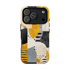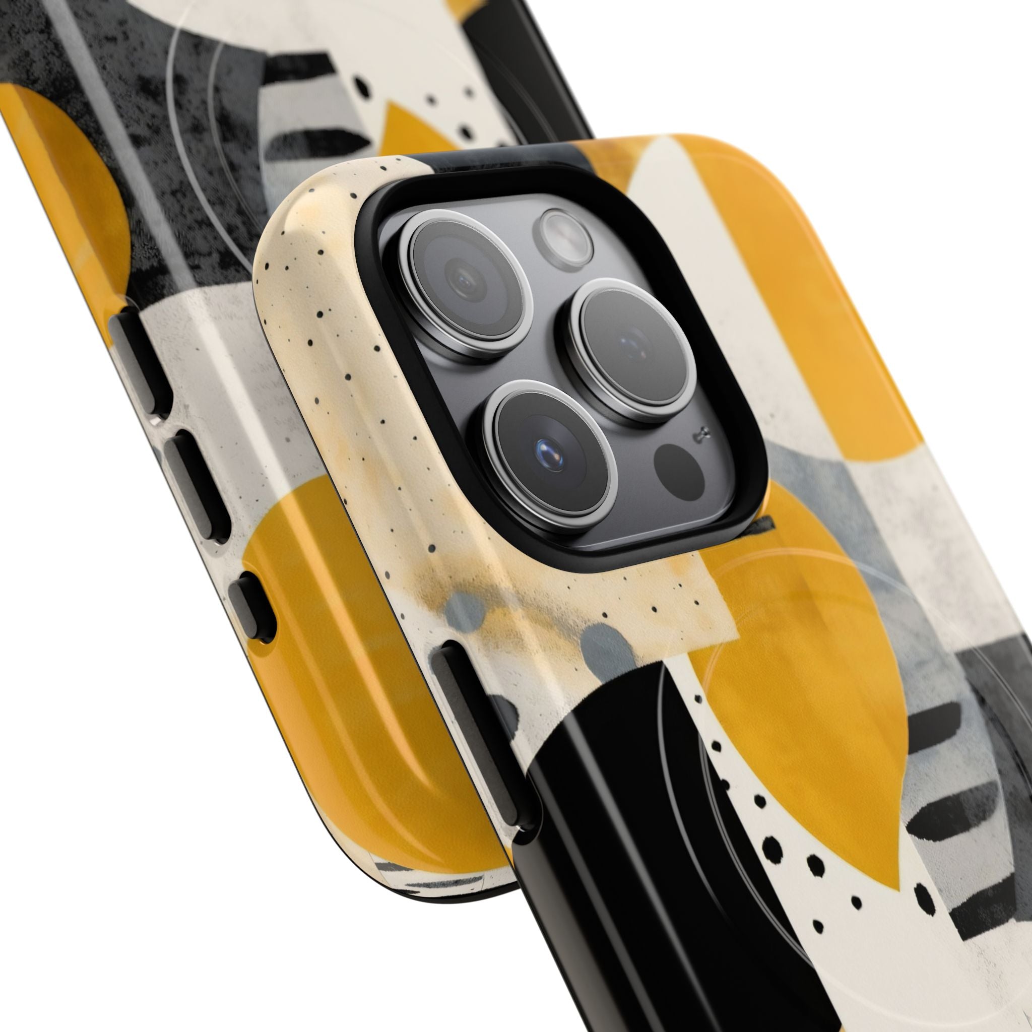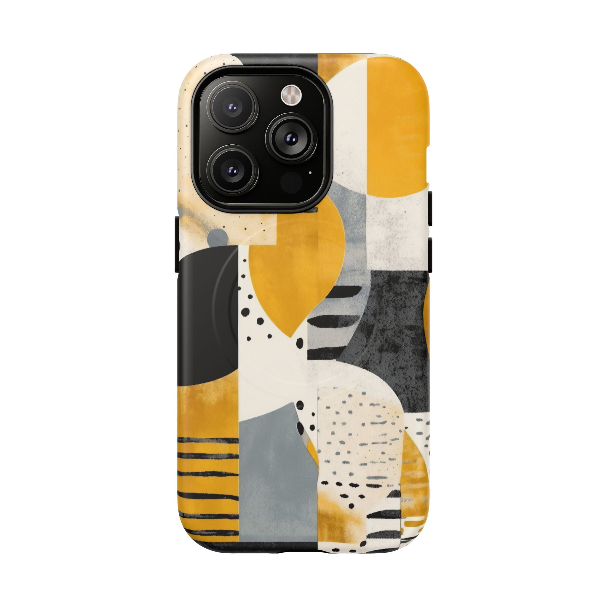 This ANTIPODE Abstract Phone Case from the Modern Art Edition features a lively composition of arcs, stripes, dots, and colour blocks in tones of saffron yellow, slate grey, charcoal, cream, and soft white. The interplay of painted textures and graphic marks gives the artwork the vibrancy of a modern mural — energetic yet balanced, expressive yet refined.