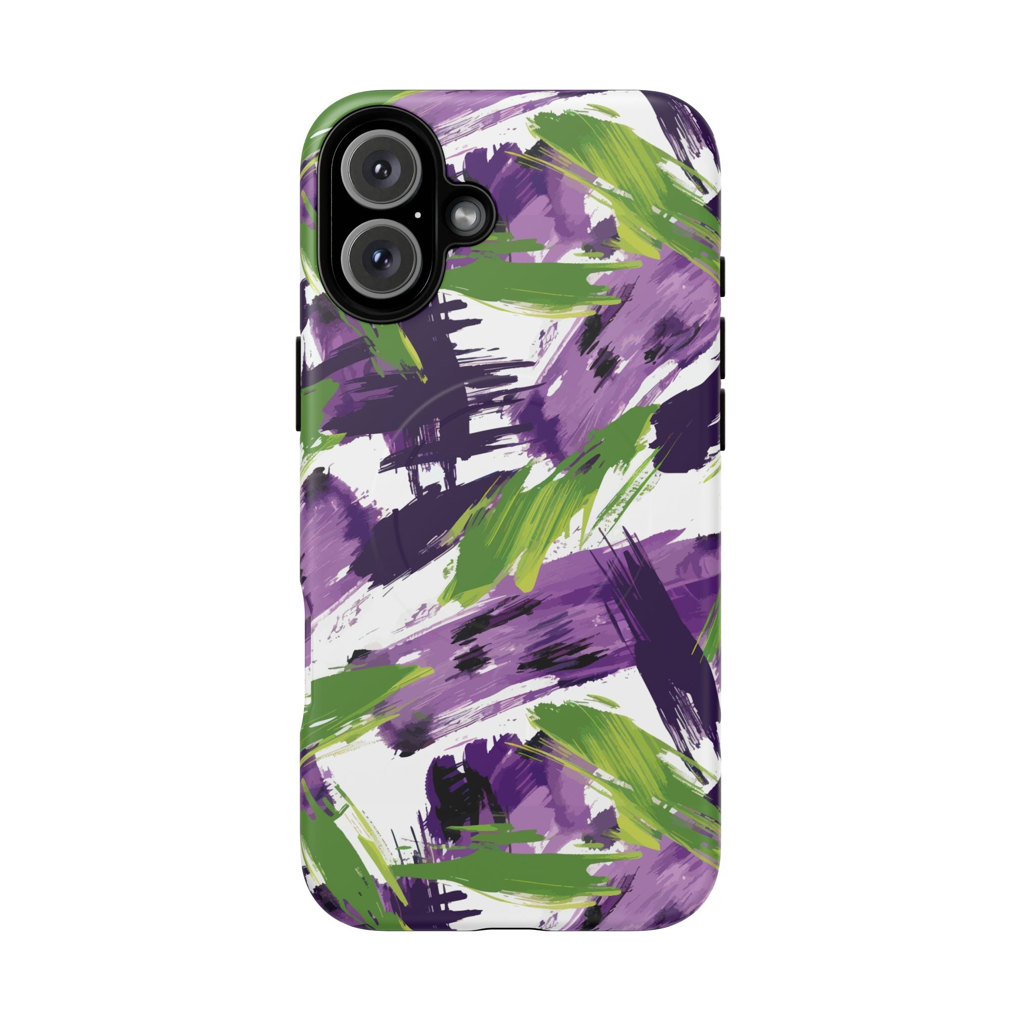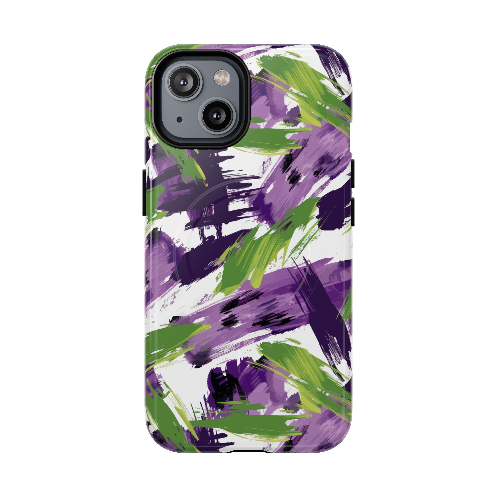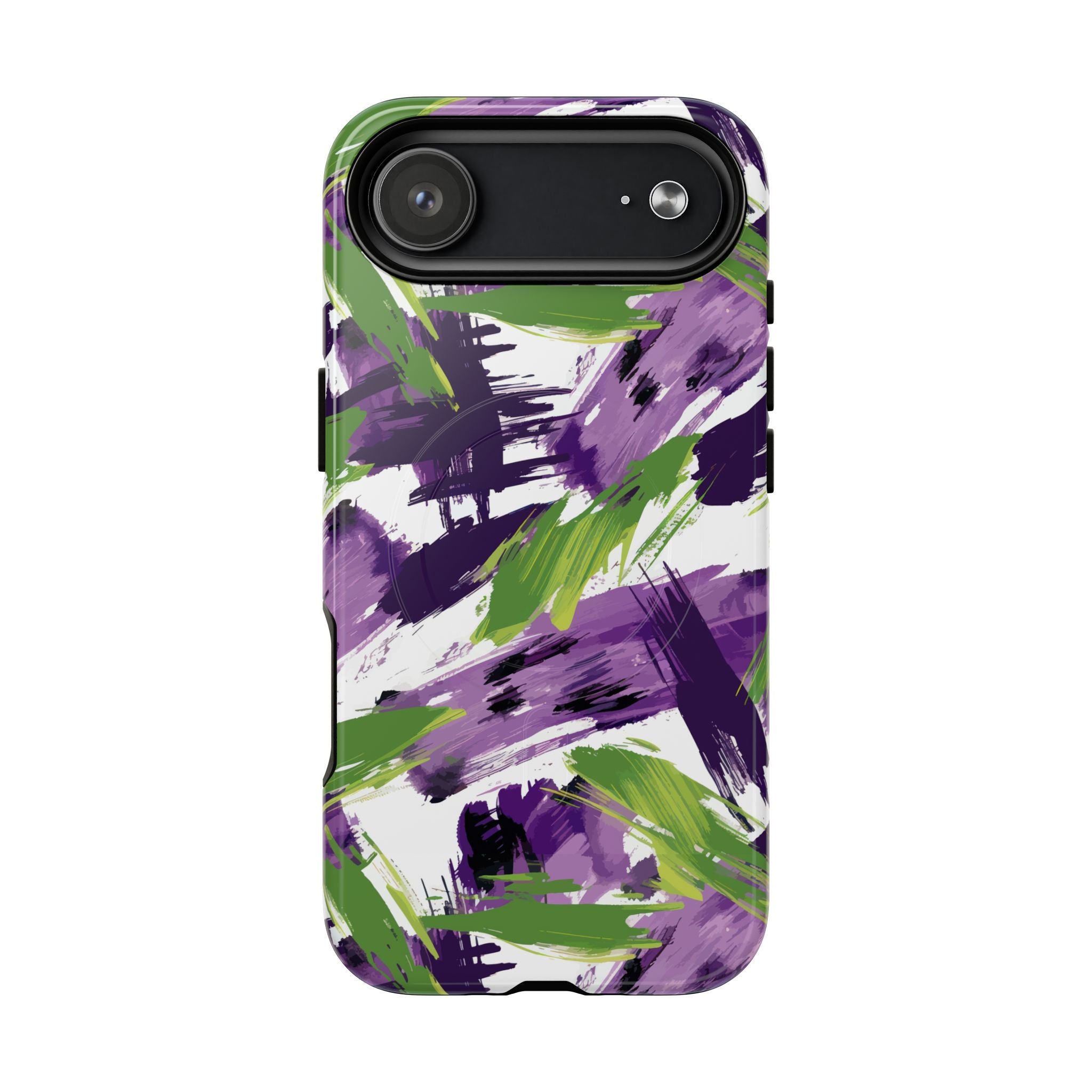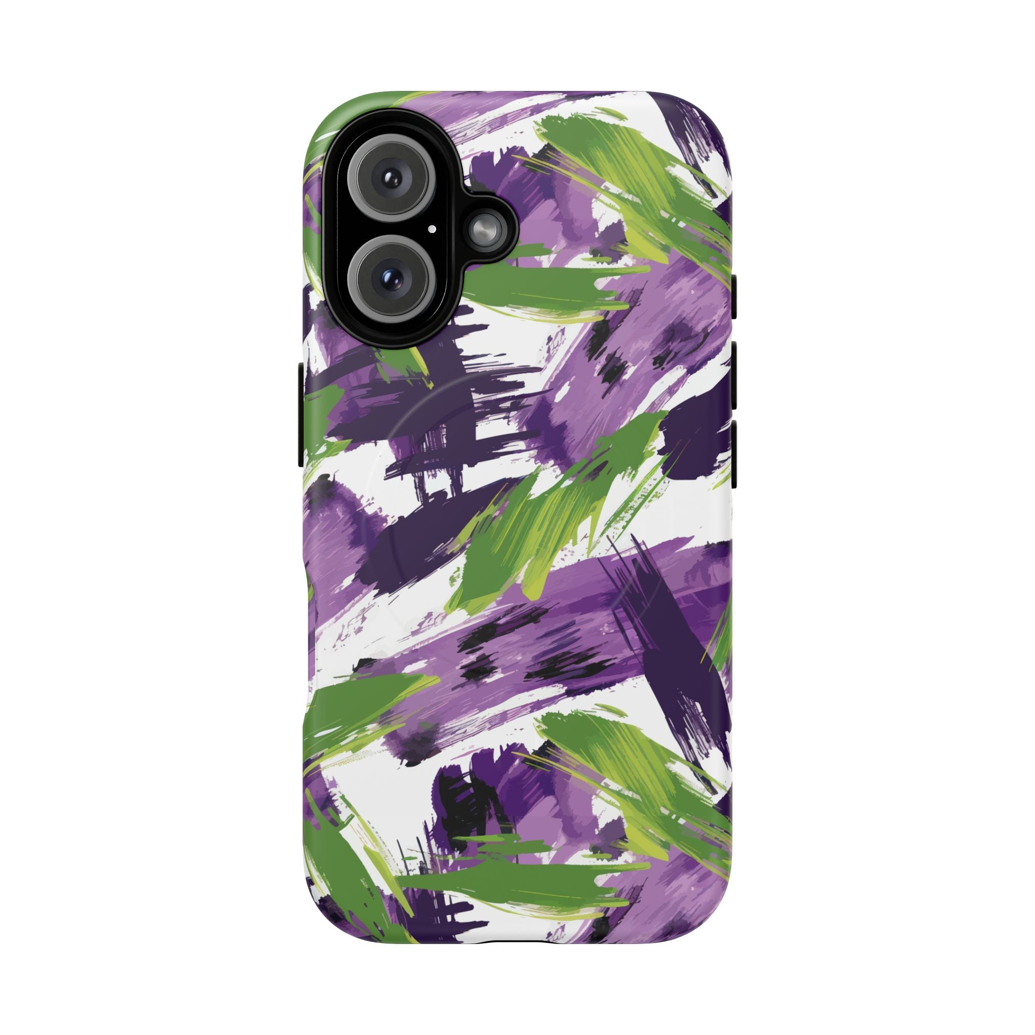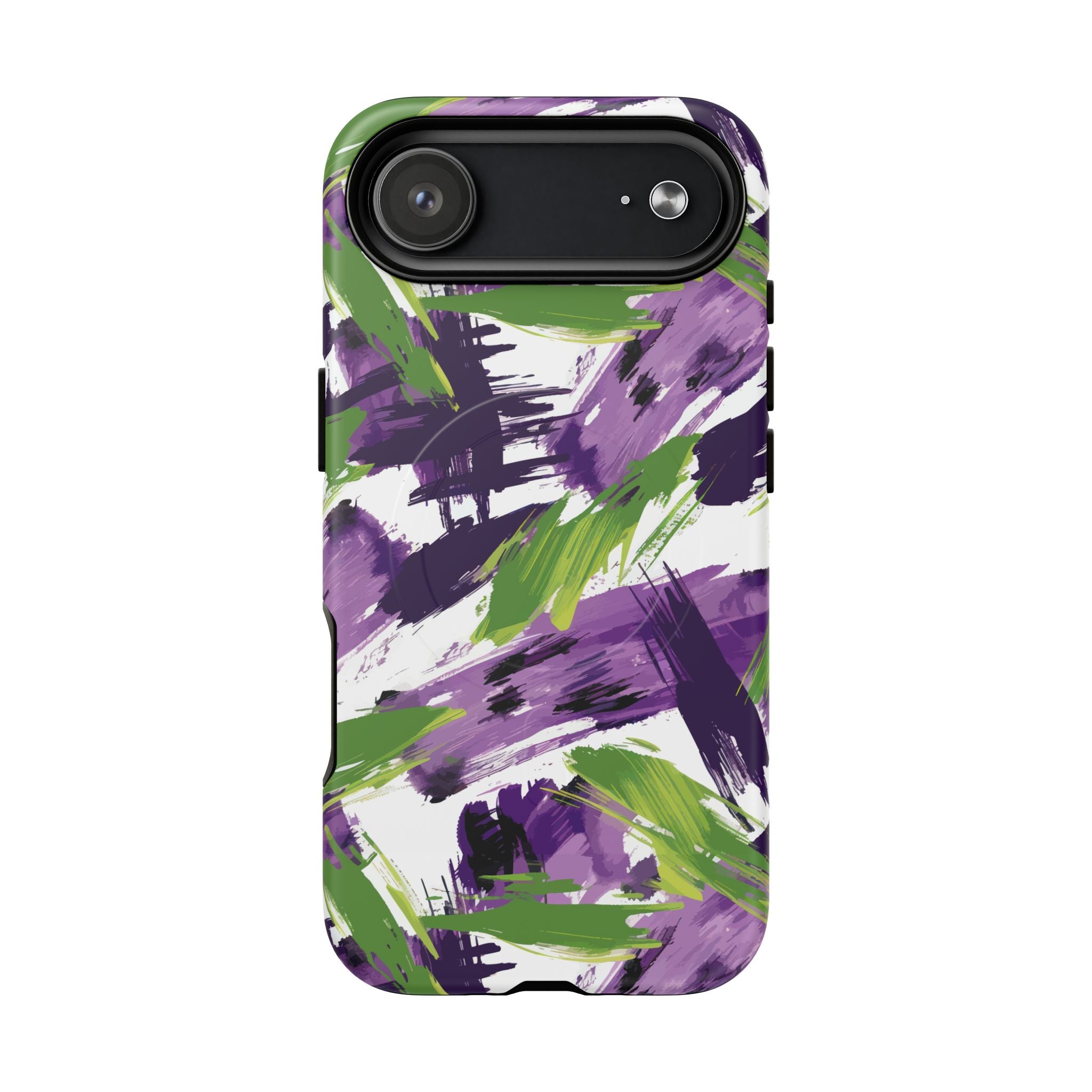 “Violet Moss Motion” brings expressive energy and organic contrast to your device through bold, gestural brushstrokes layered over a clean white ground. Deep violet and plum sweep diagonally across the surface, punctuated by fresh moss green and olive accents. Each stroke shows raw texture and directional movement, creating a dynamic composition that feels spontaneous yet balanced. The interplay of cool purples and earthy greens gives the artwork a modern, nature-inflected intensity.