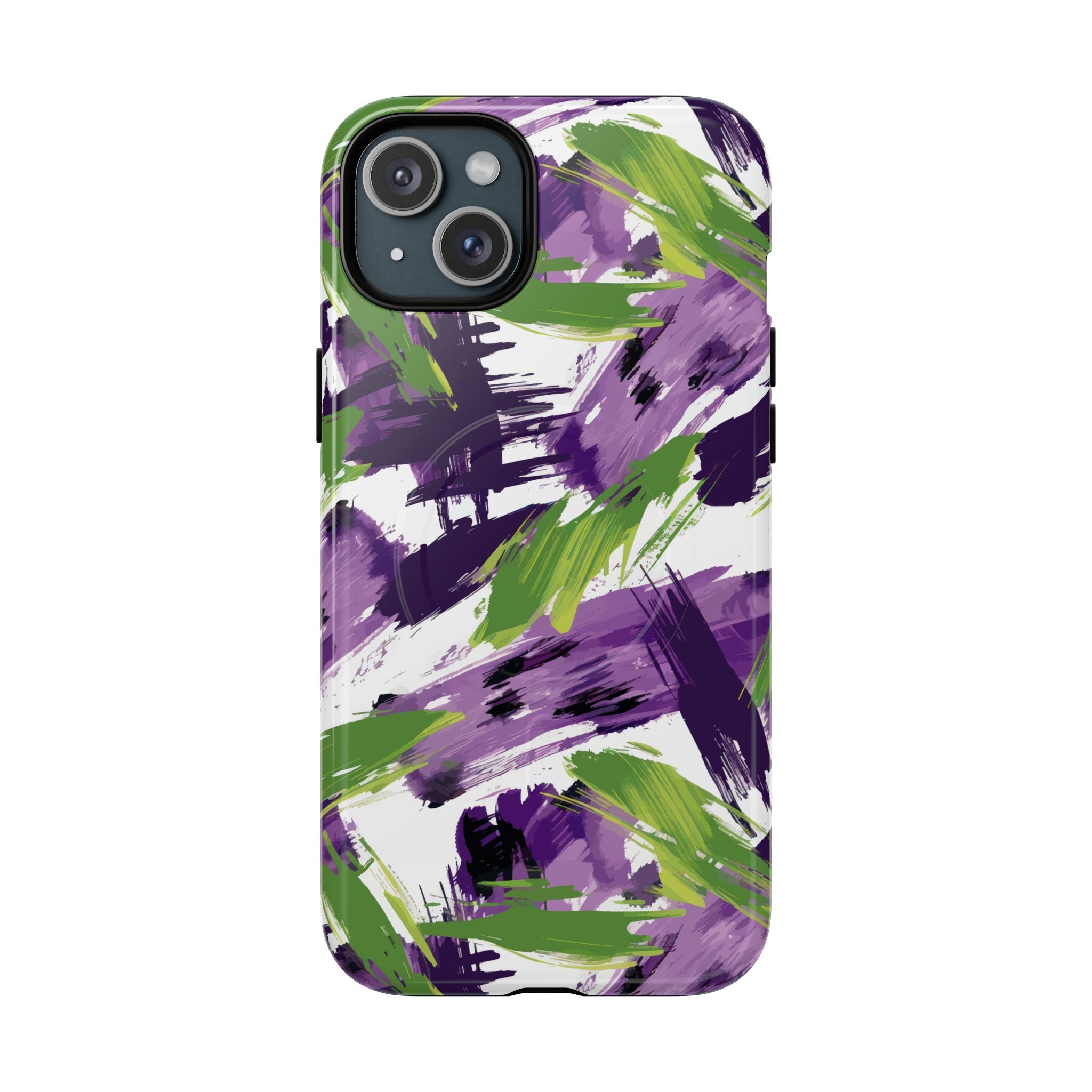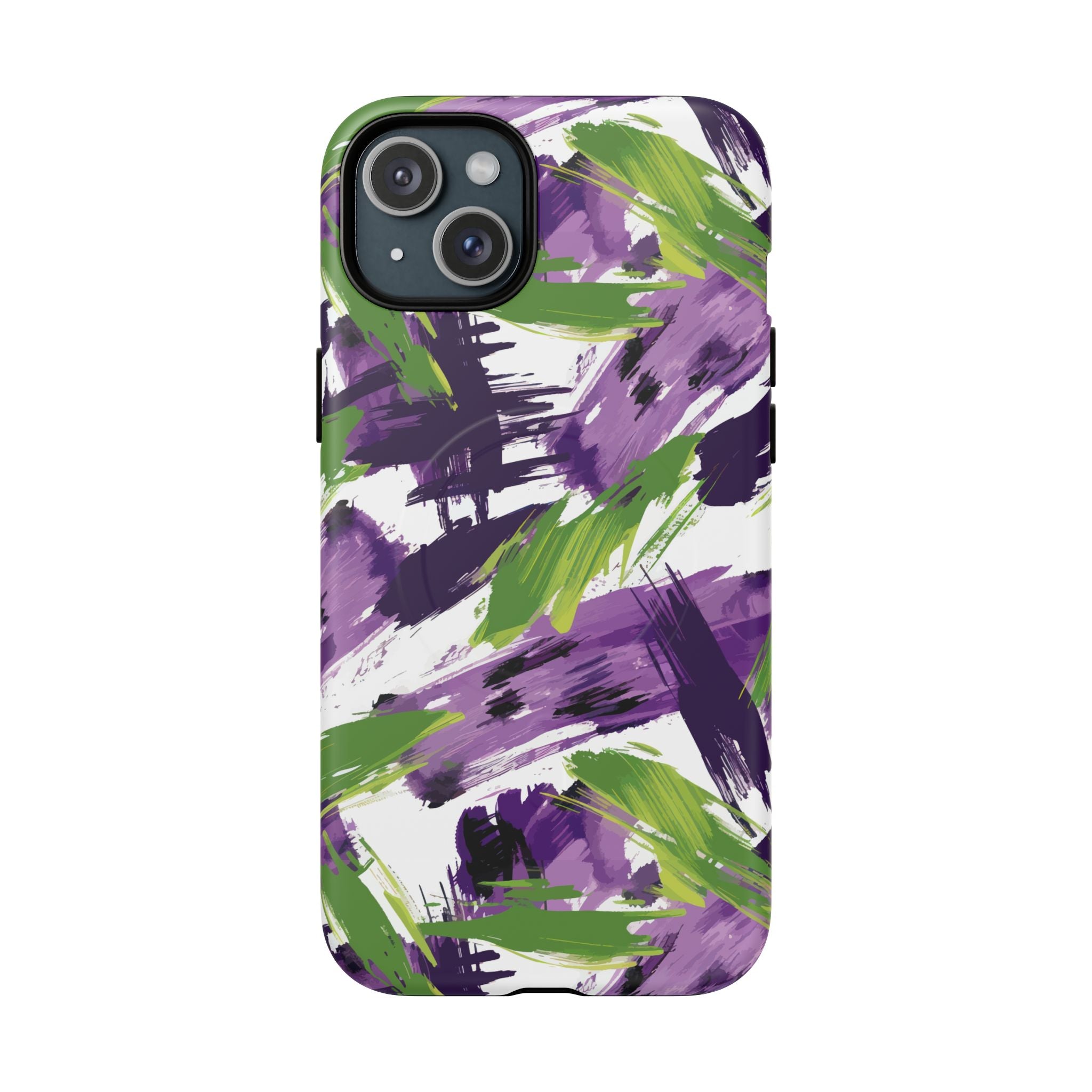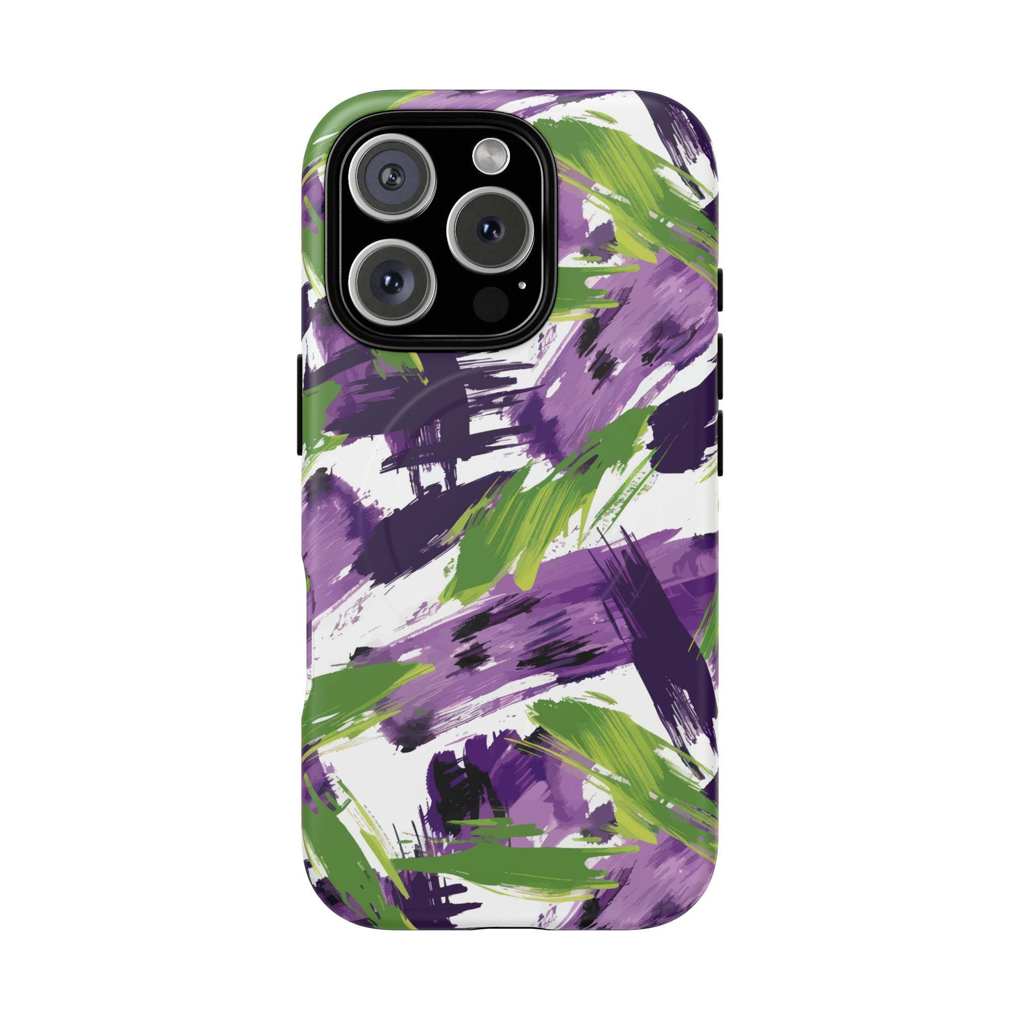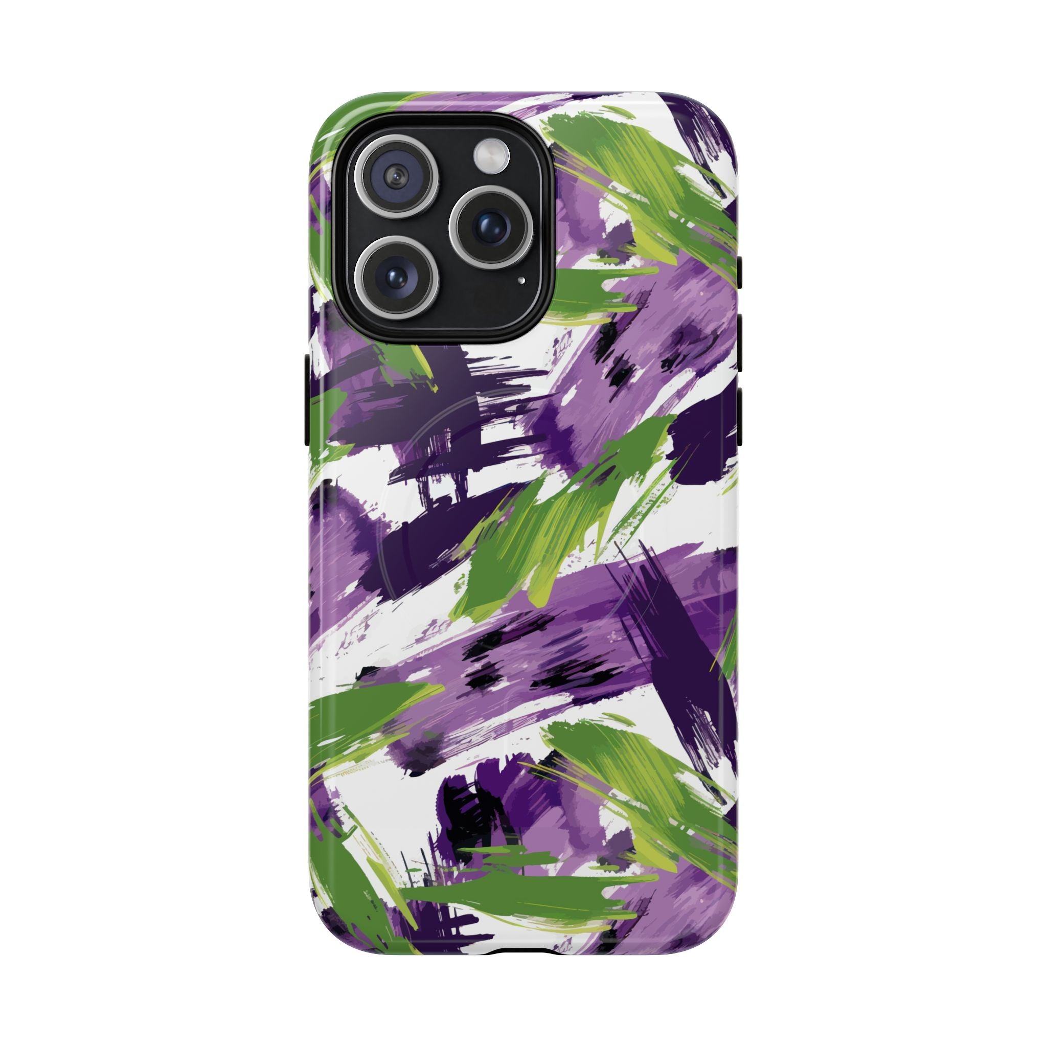 “Violet Moss Motion” brings expressive energy and organic contrast to your device through bold, gestural brushstrokes layered over a clean white ground. Deep violet and plum sweep diagonally across the surface, punctuated by fresh moss green and olive accents. Each stroke shows raw texture and directional movement, creating a dynamic composition that feels spontaneous yet balanced. The interplay of cool purples and earthy greens gives the artwork a modern, nature-inflected intensity.